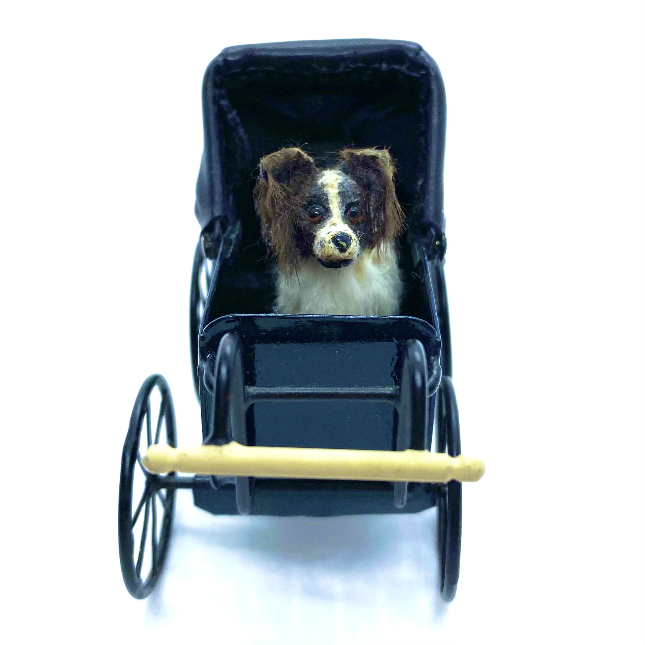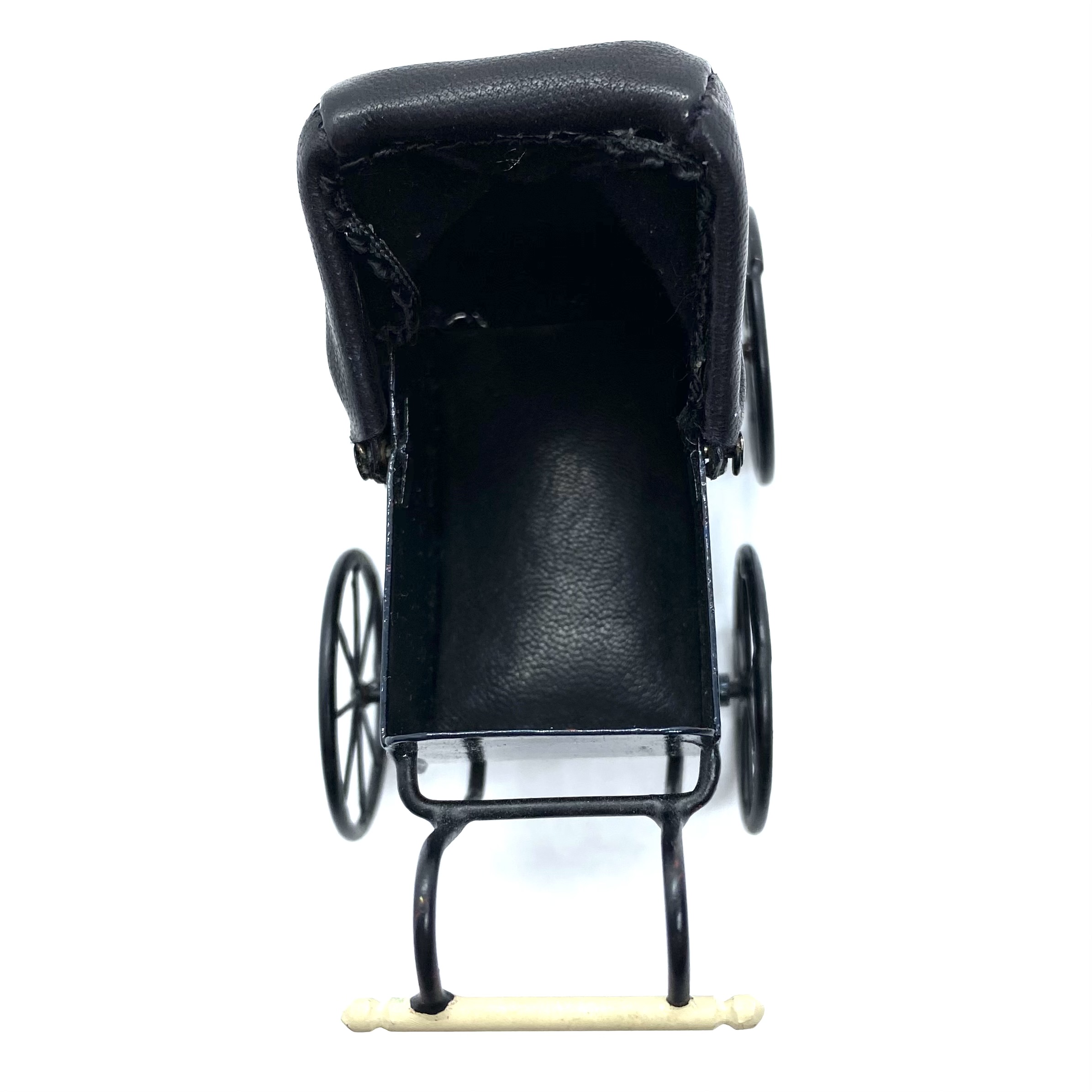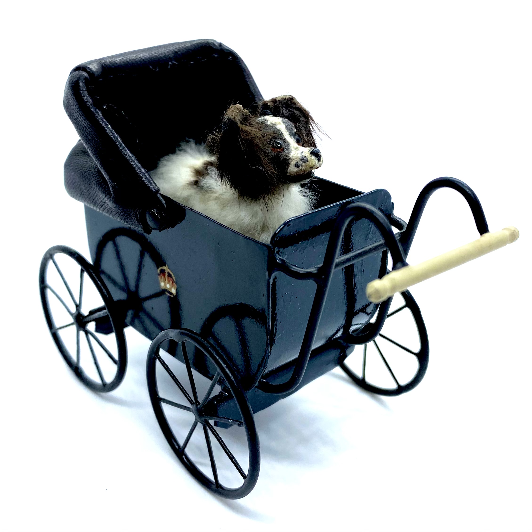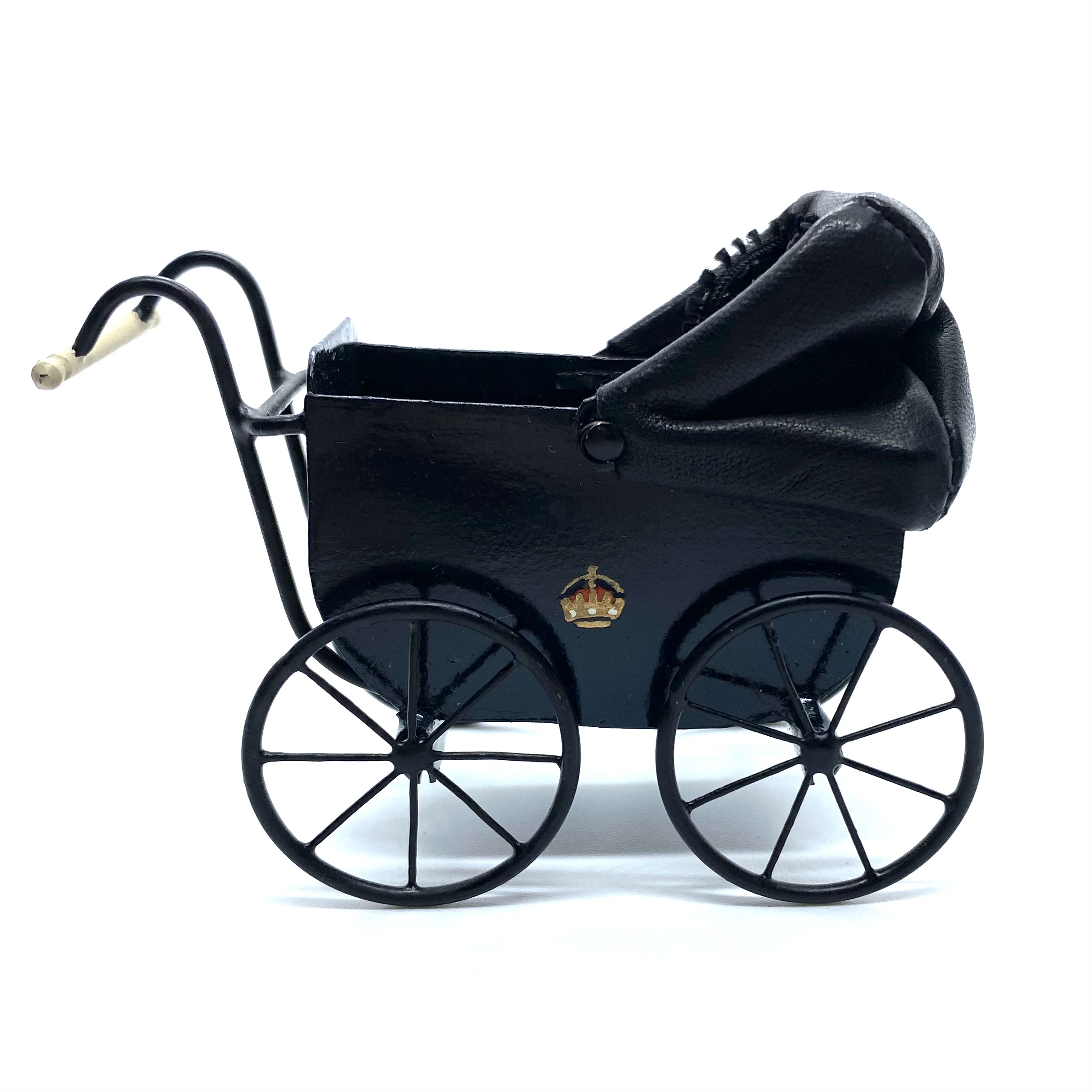 This grand baby carriage is one of the most cherished toys in the nursery, largely because it is so beautifully made, with the royal crest painted on the side. It has a leather hood which can be raised or lowered, a soft black leather cushion inside for comfort, and wheels which really turn. I couldn’t resist the chance to own a piece of work by Colin and Yvonne Roberson, and was thrilled to be able to buy this at auction on eBay.