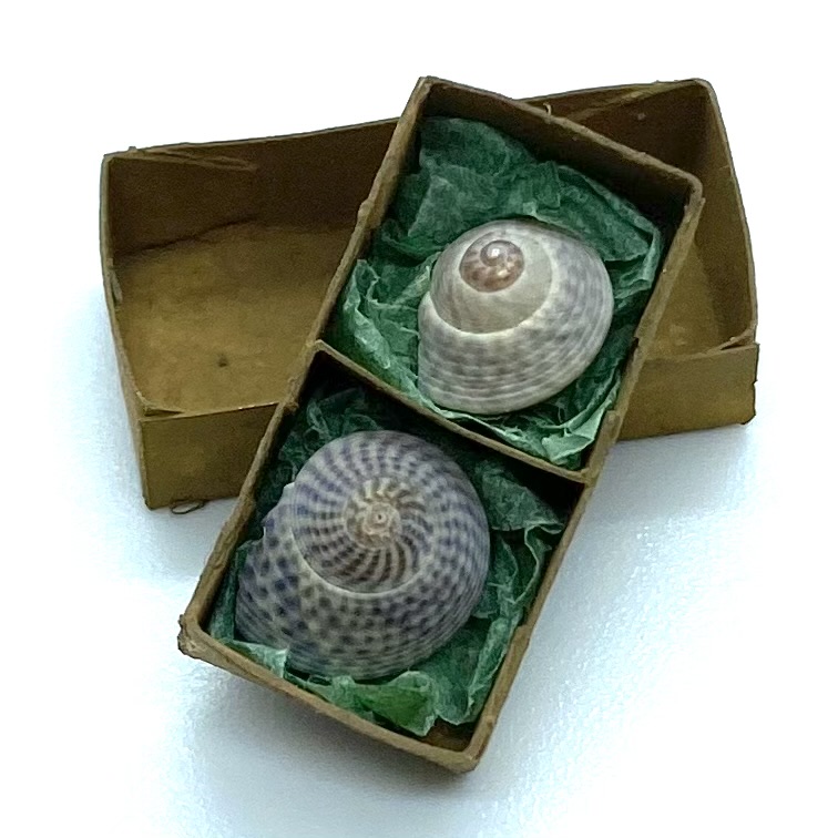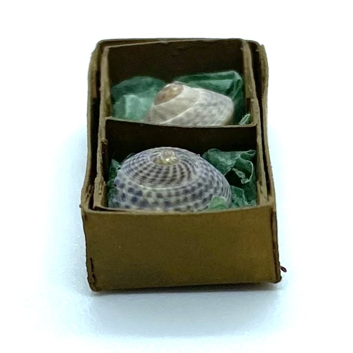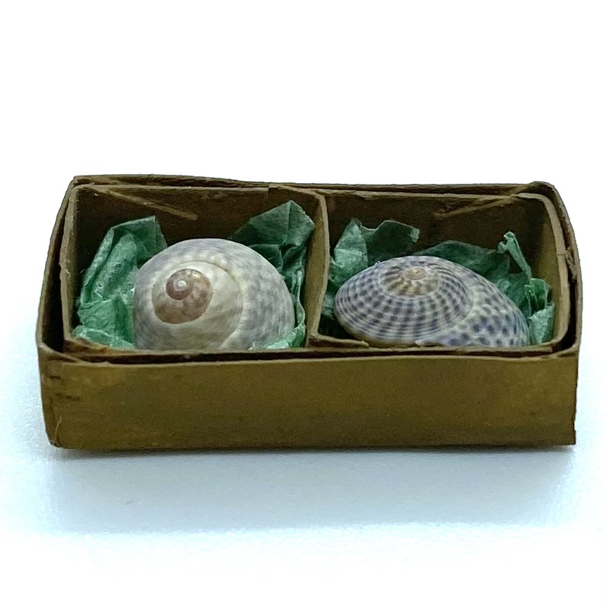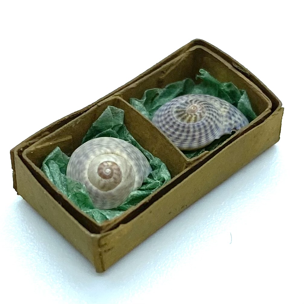 Felix would love to have a proper naturalist’s cabinet, but for the meantime he has to make do with his trays and boxes. Here is a tiny cardboard box containing two real miniature seashells nestled in green tissue paper. It’s presented with the lid tucked underneath, but the lid can be removed and put back on to close the box if desired. Another wonderful little piece by Mini McGregor.