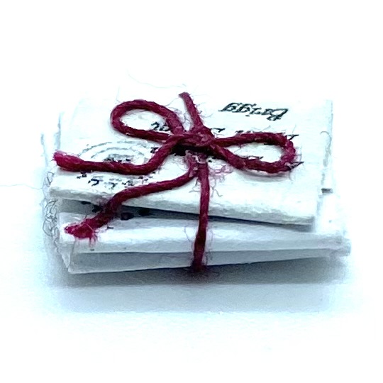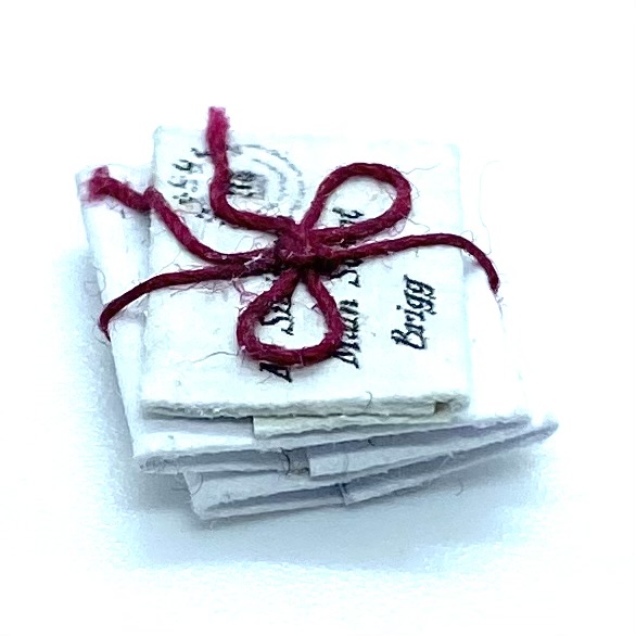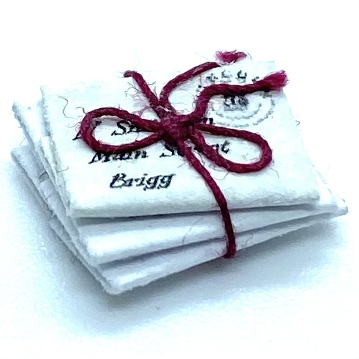 Tied with red string, this bundle of letters will be perfect to tuck away in a bureau drawer or to keep in a box of mementos. For now, I’ll plan to keep them in the Parlour where Elizabeth writes her letters. If you get close enough, you’ll see that the top envelope (and presumably the rest) are addressed to Brigg in North Lincolnshire, but I claim the indulgence of artistic licence. After all, who knows exactly where Quartermaine Hall is?
