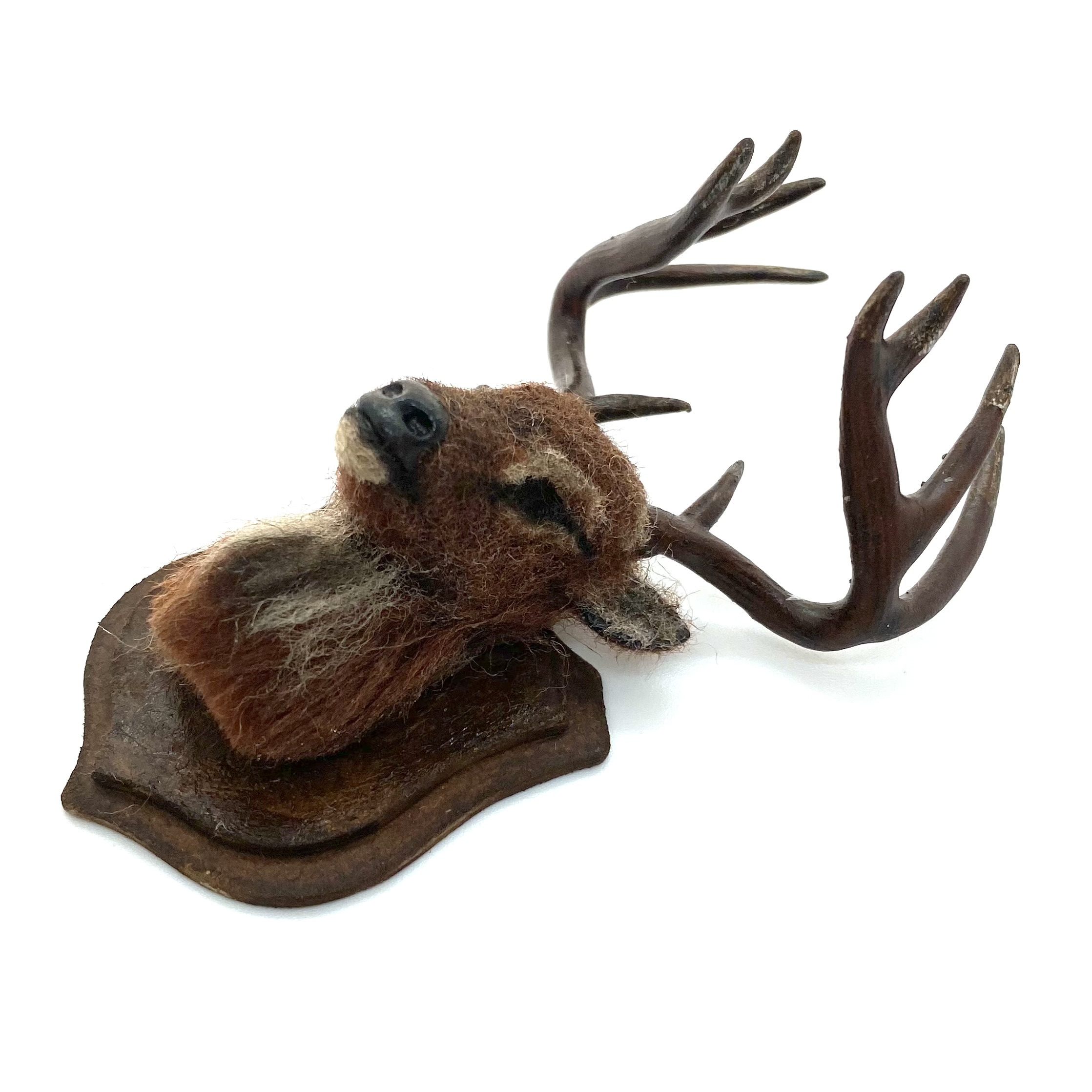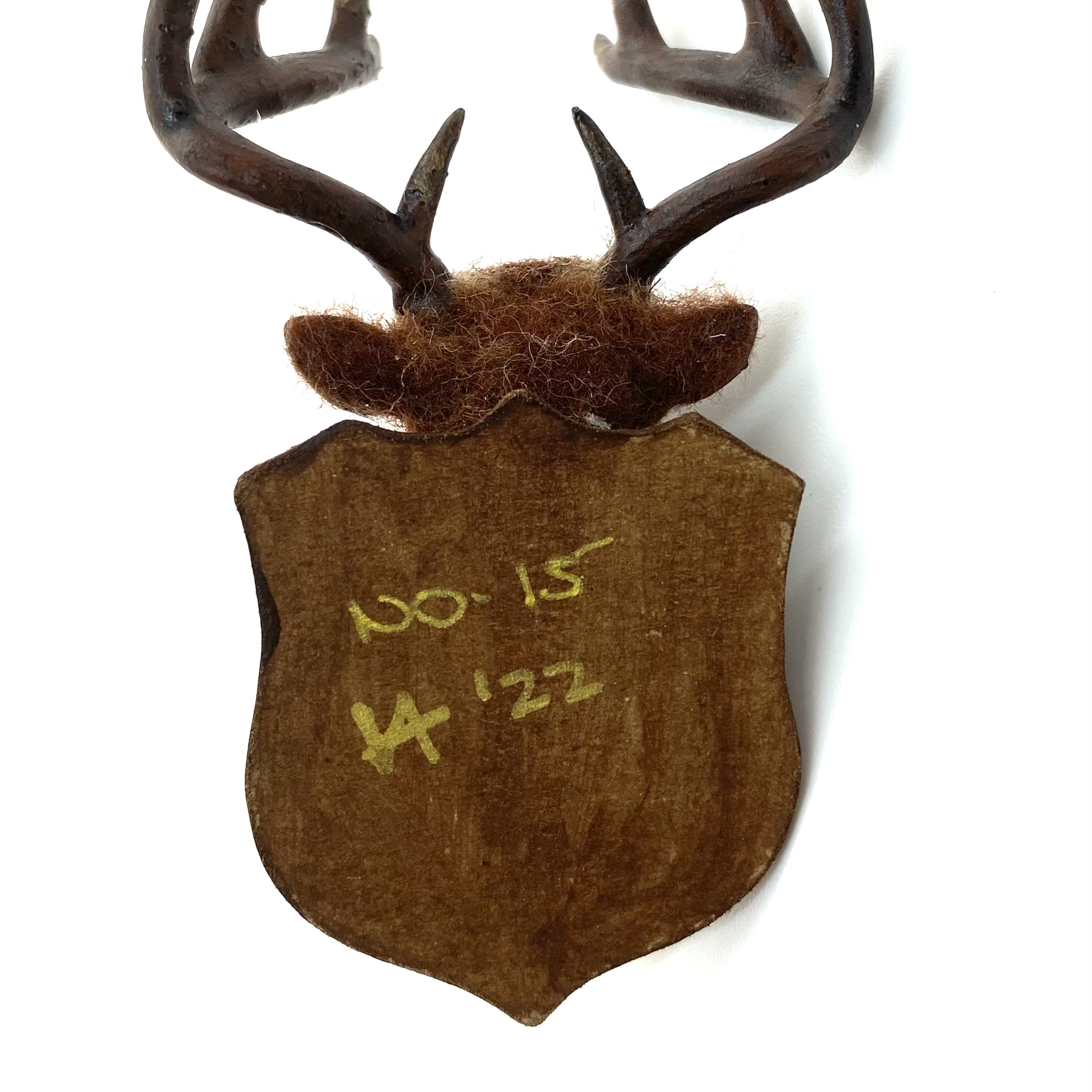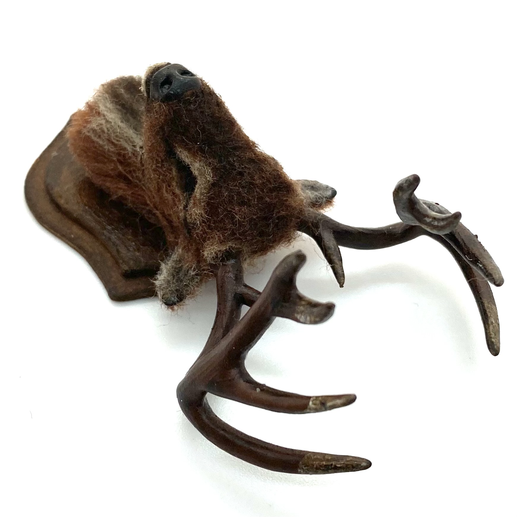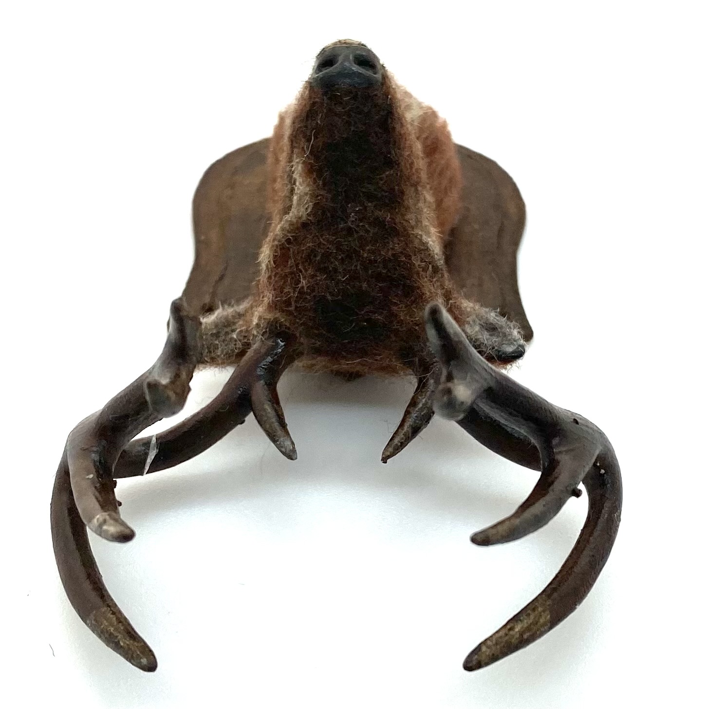 A hand-felted stag or deer head, mounted on a wooden shield for display. Vanessa has produced a number of these, each one subtly different, and I purchased four in one fell swoop at Miniatura. It is signed with initials ‘VA’, dated ’22’ and marked with edition number ’15’ on the back of the shield. I’m using these edition numbers to more easily distinguish between the four heads for the purposes of managing the collection.