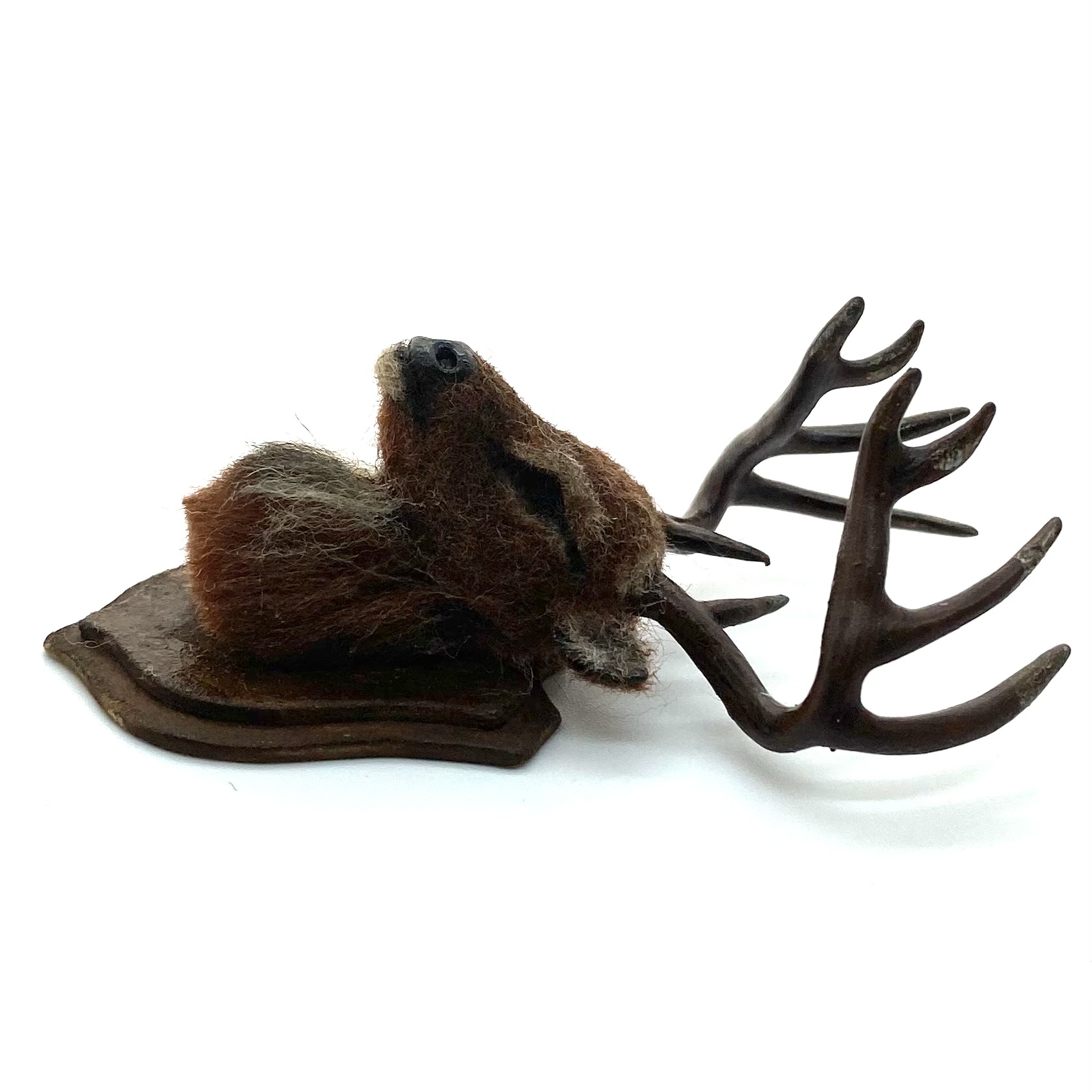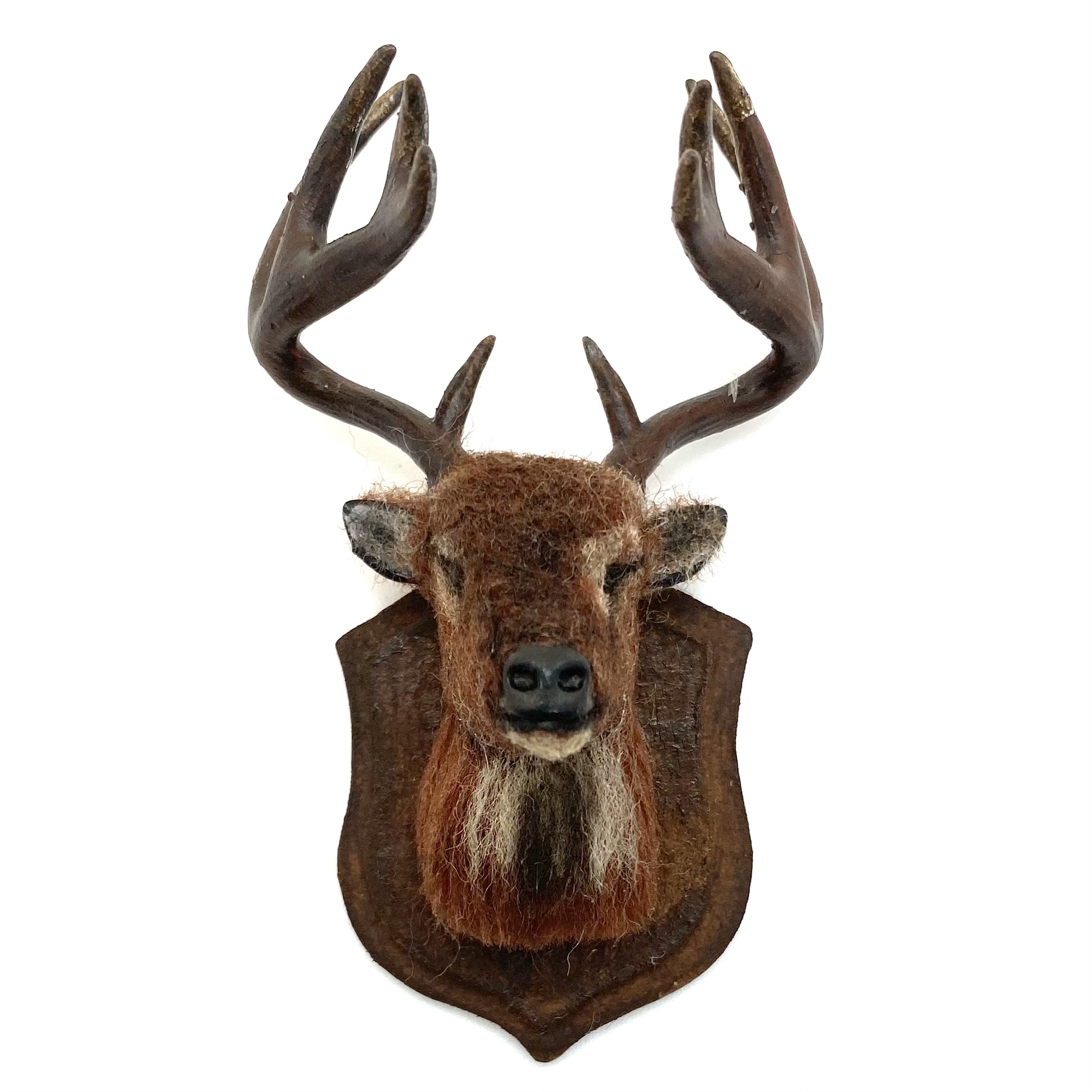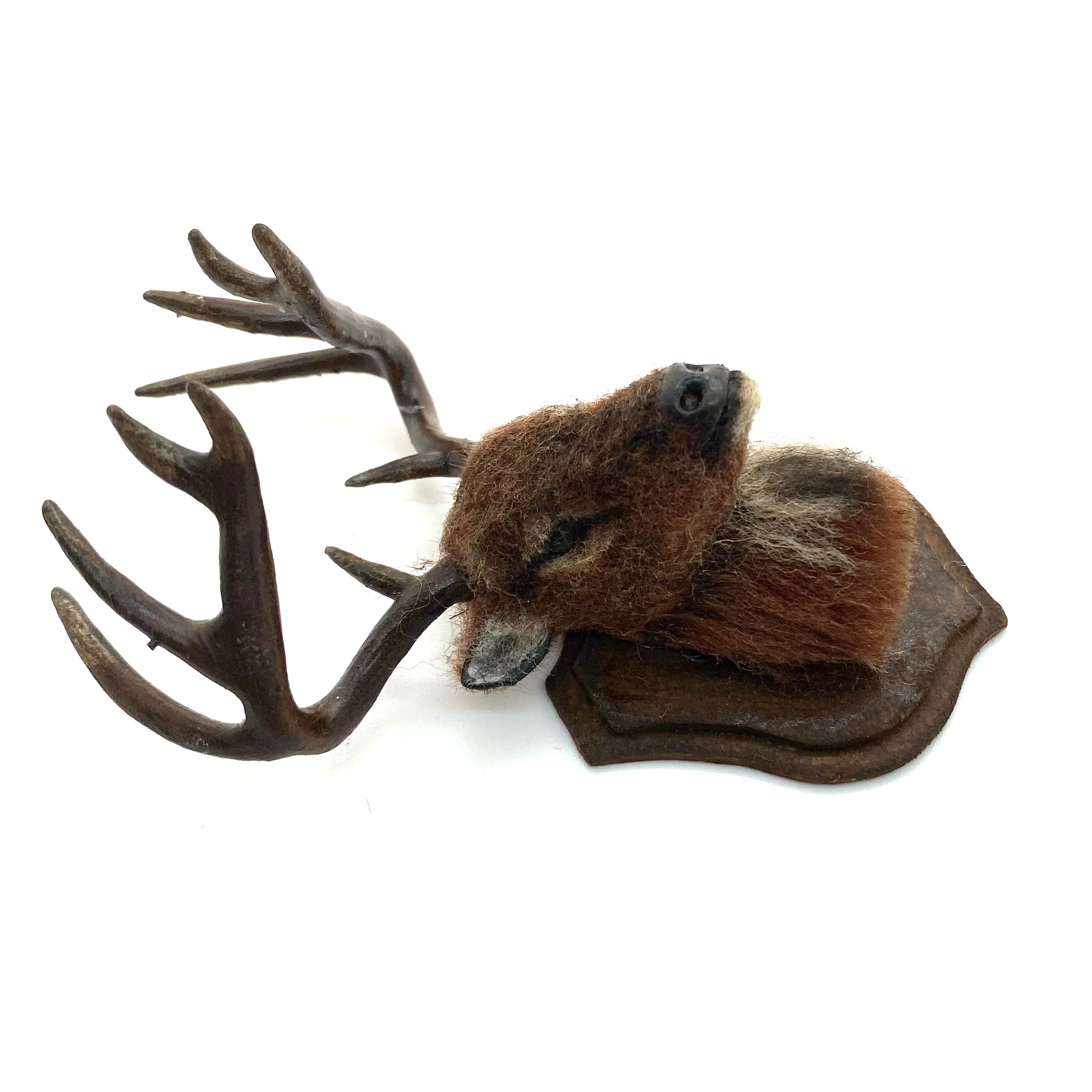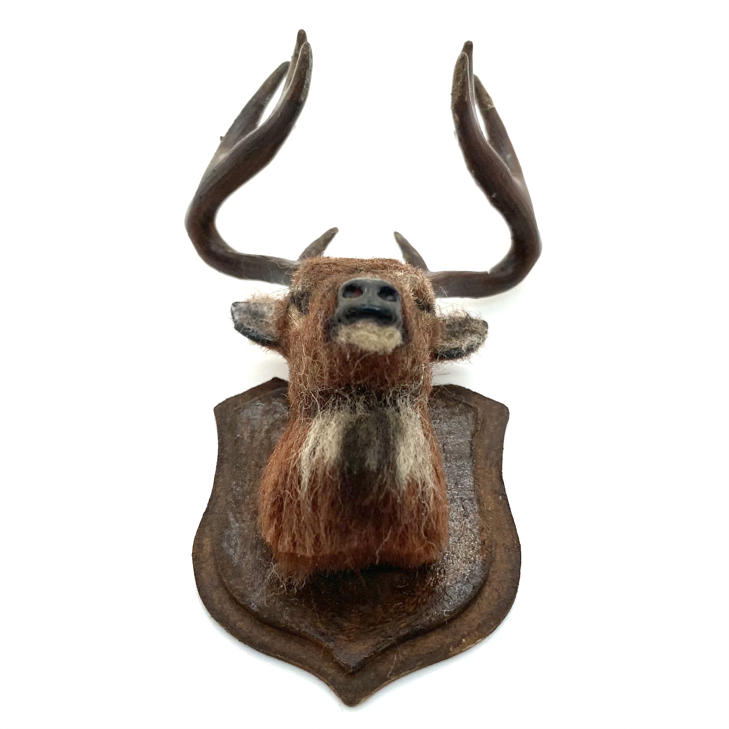 A hand-felted stag or deer head, mounted on a wooden shield for display. Vanessa has produced a number of these, each one subtly different, and I purchased four in one fell swoop at Miniatura. It is signed with initials ‘VA’, dated ’22’ and marked with edition number ’15’ on the back of the shield. I’m using these edition numbers to more easily distinguish between the four heads for the purposes of managing the collection.