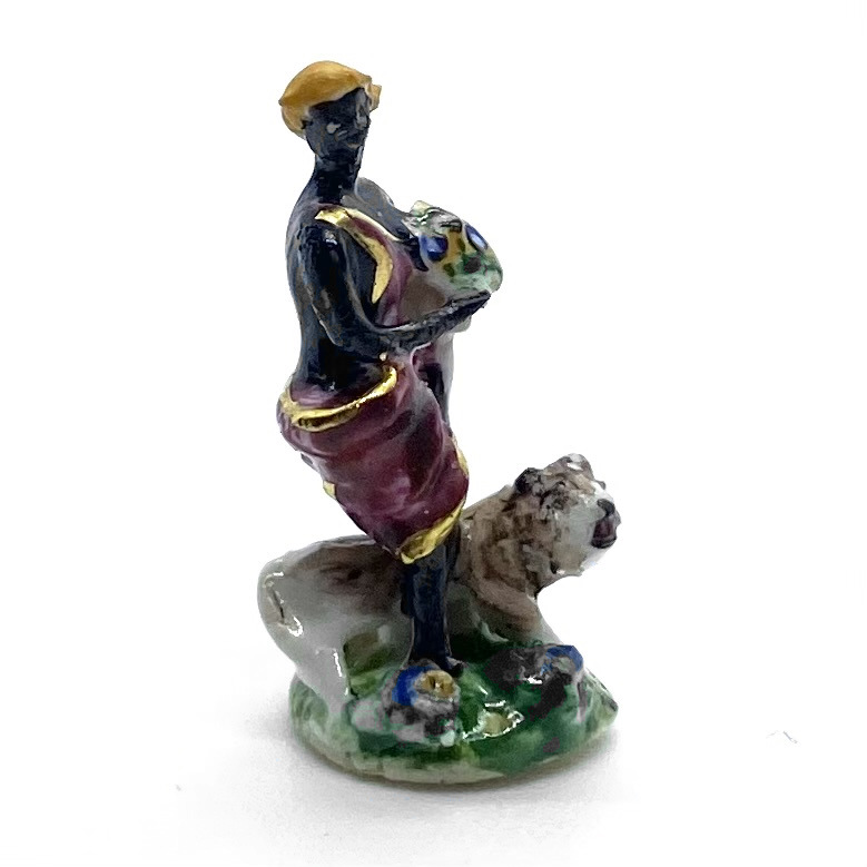 Initially, I thought that this tiny porcelain figure by Tricia Street was supposed to form part of a Four Continents series. I assumed that the man was supposed to represent Africa, but then how do we explain the animal with him, which I’m almost positive is a wolf? And what is the man holding in his arms? It looks almost like a bunch of flowers. These are puzzles which I’ll have to try and work out, as unfortunately I’m not aware of any catalogue of Tricia Street’s work – though please let me know if there is one!