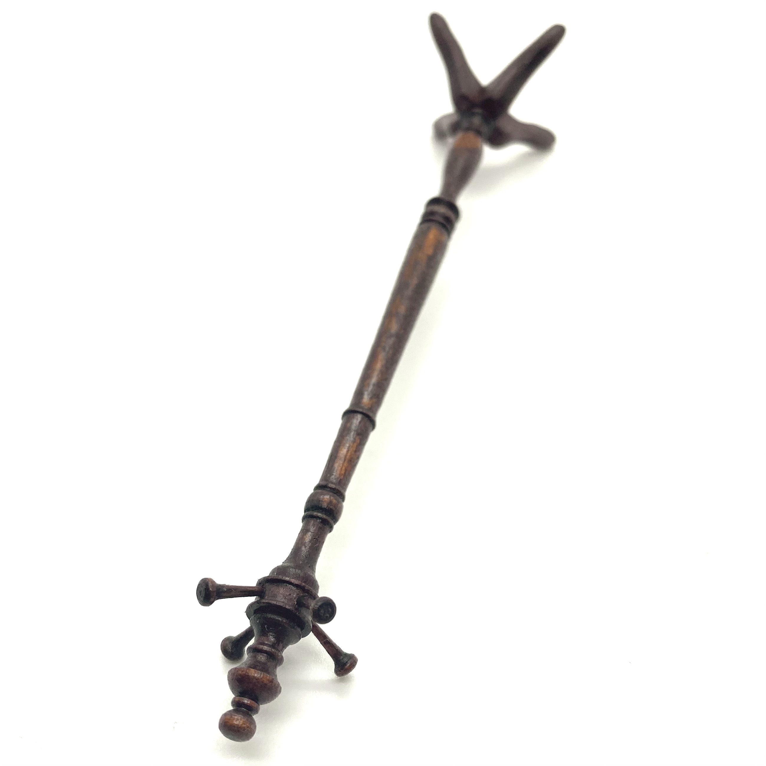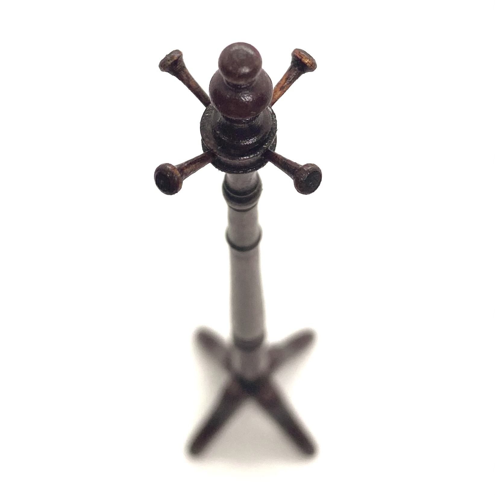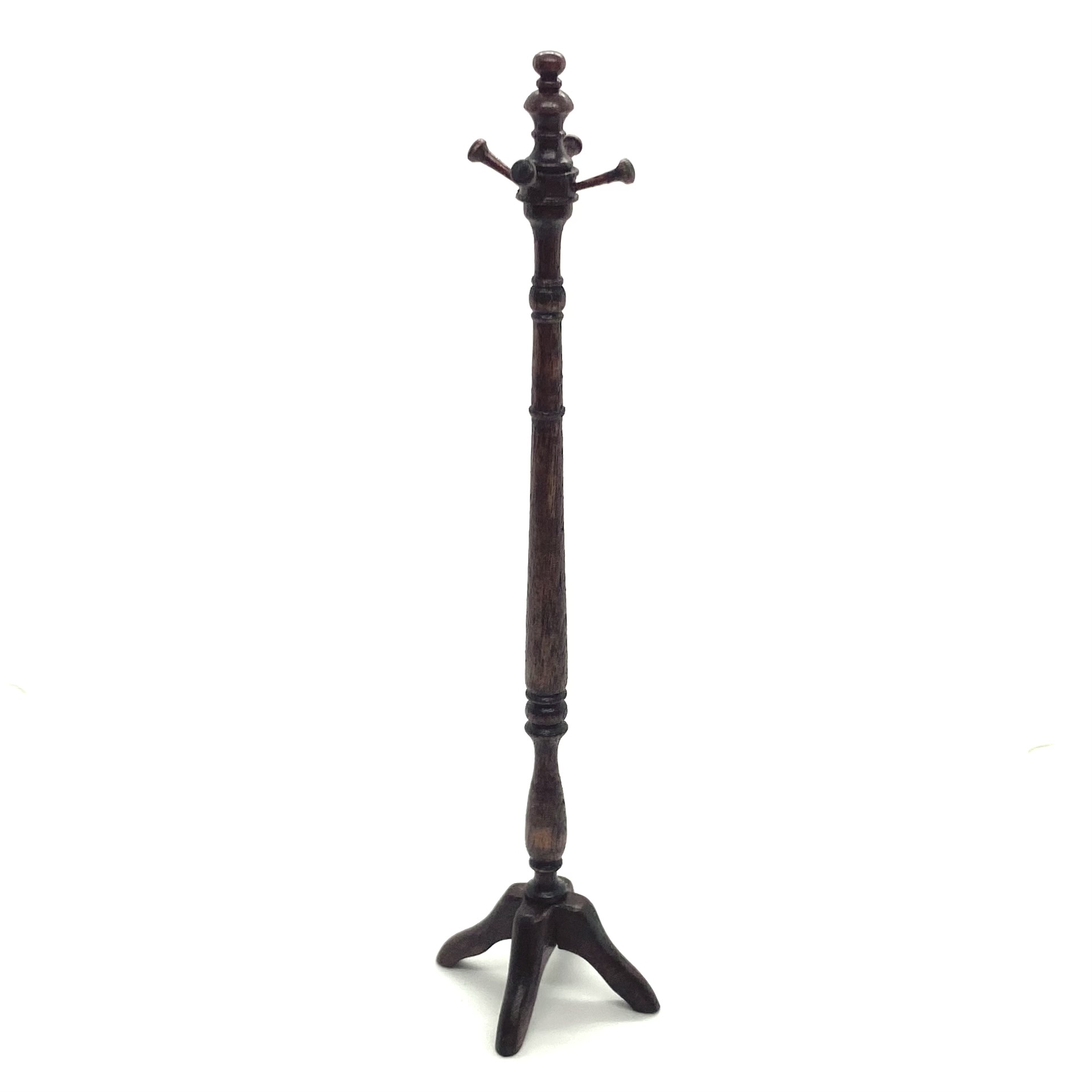 This elegant turned wooden coat stand was sold as an anonymous piece, but I was taken with its shape and its high level of finish. When it arrived, I was delighted to find it packed in a David Krupick box, an attribution confirmed by the ‘DK’ faintly inscribed on one of the feet. David is a highly versatile miniaturist whose pieces range from children’s toys to knife-boxes, and I’m delighted to have one of his works in the Quartermaine Collection – even if it was accidental!