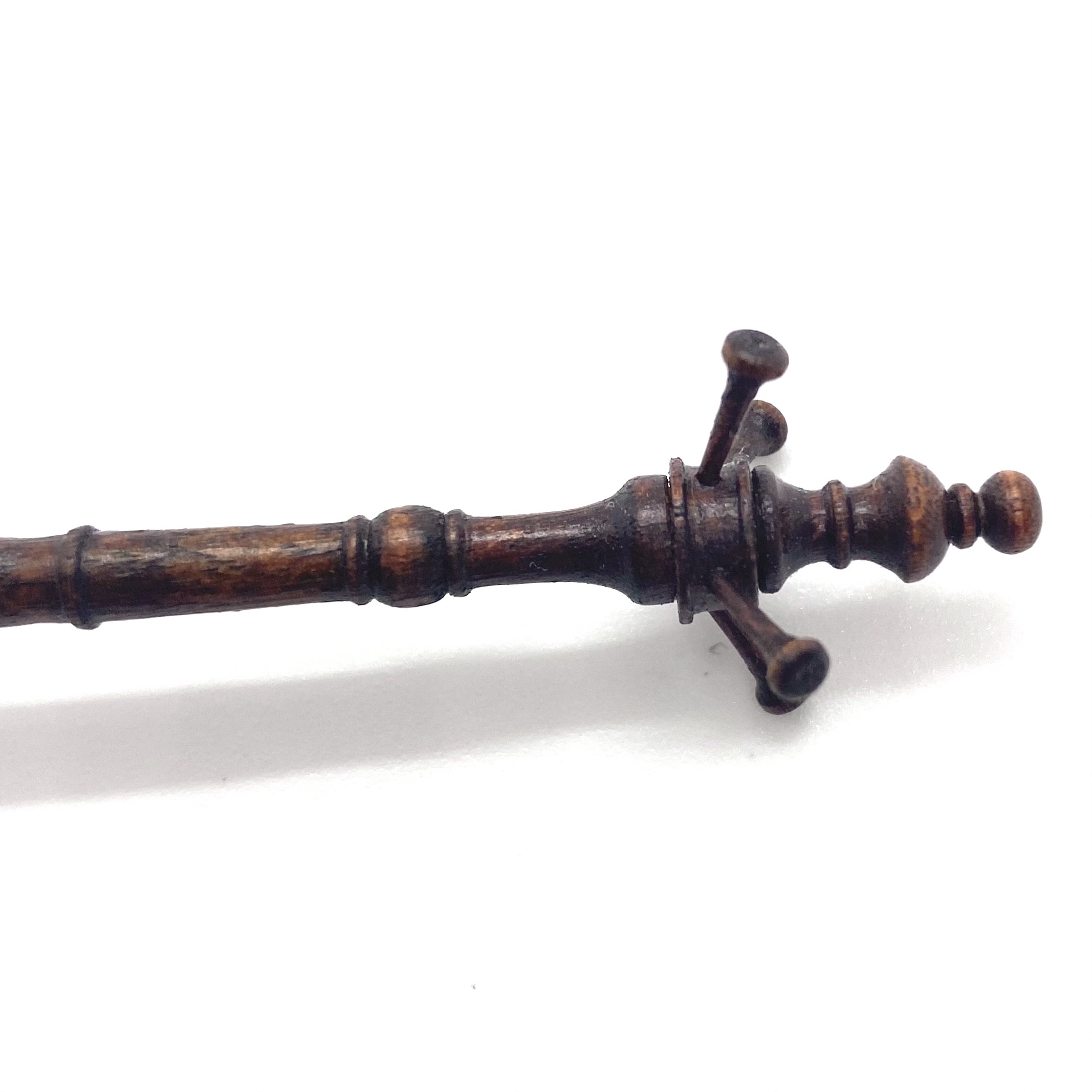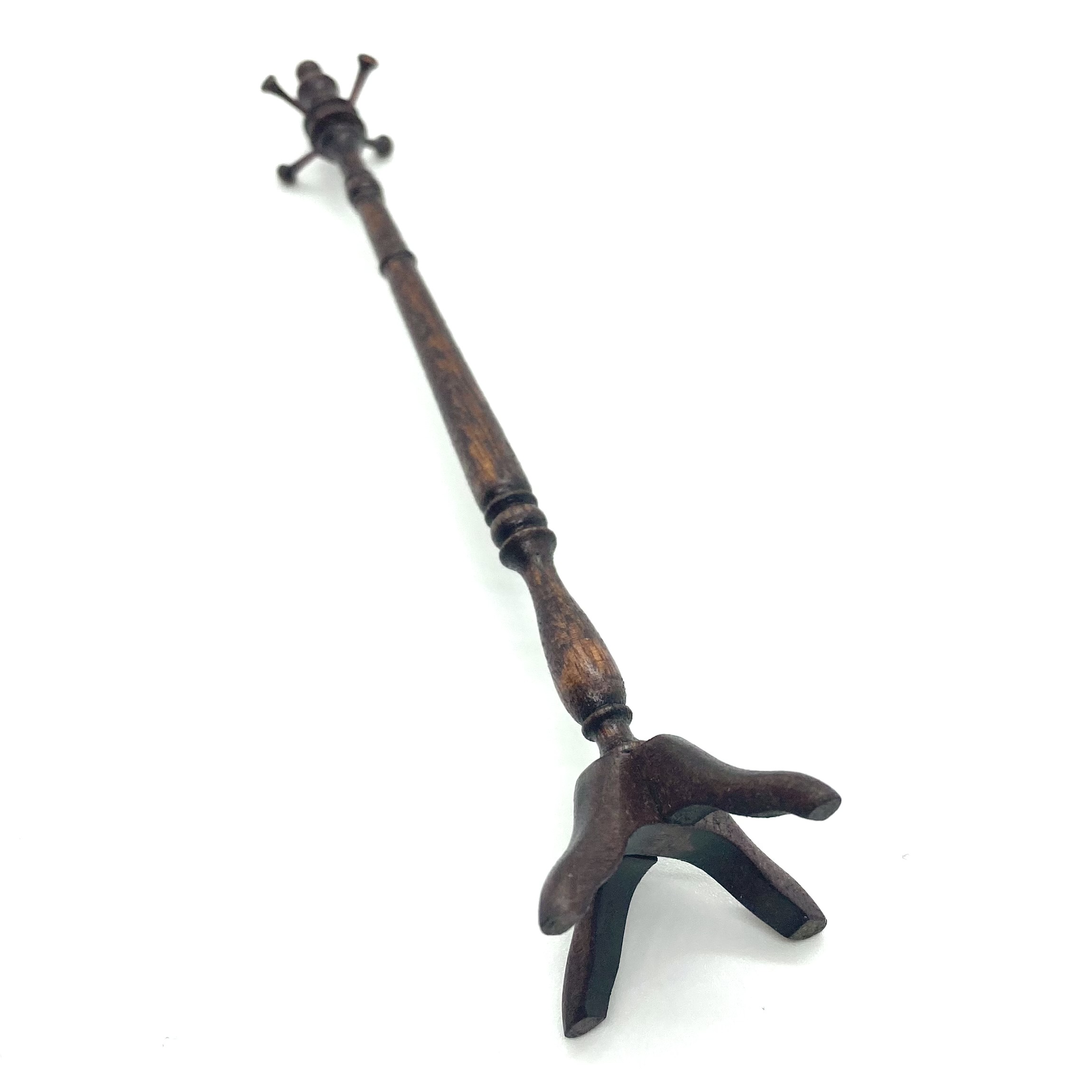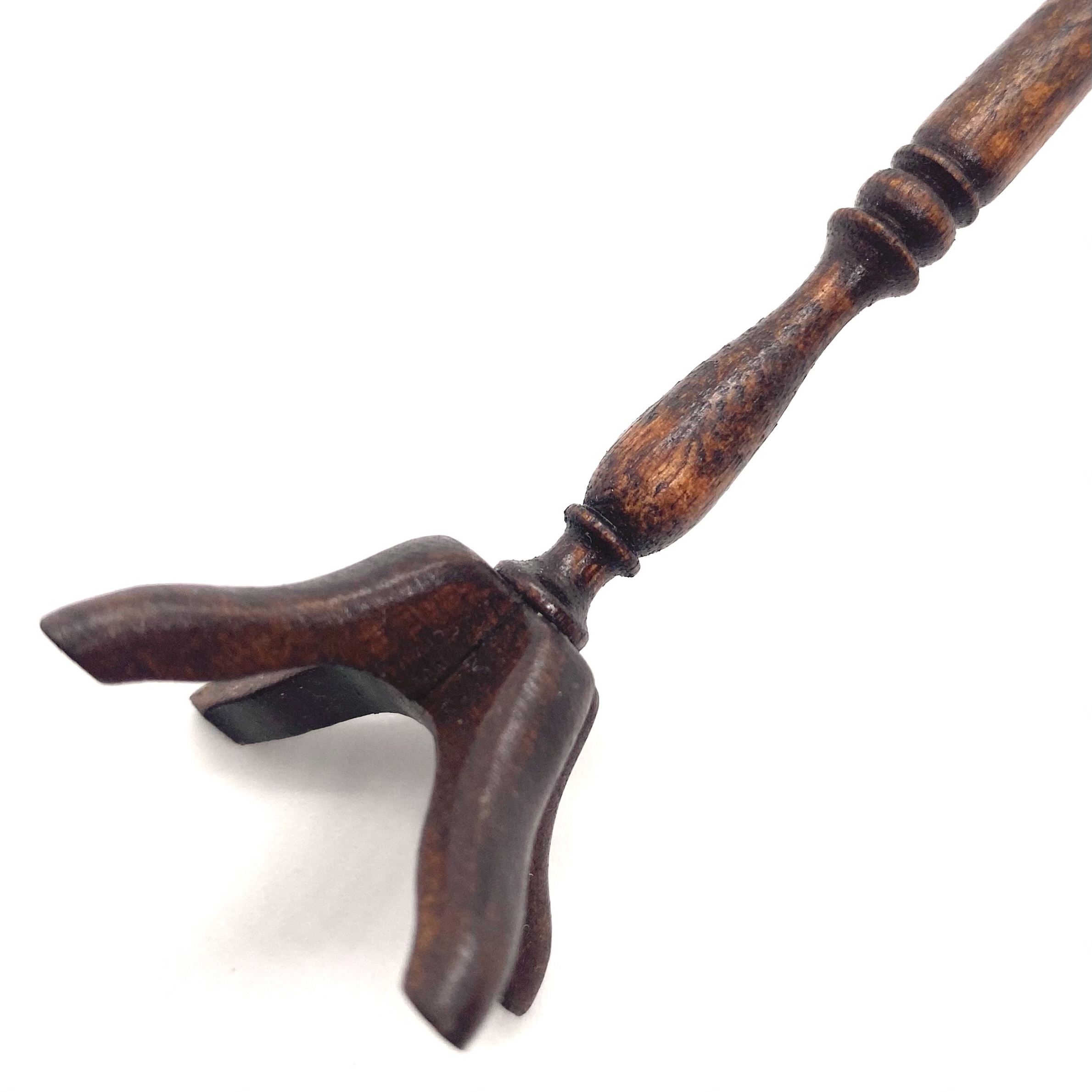 This elegant turned wooden coat stand was sold as an anonymous piece, but I was taken with its shape and its high level of finish. When it arrived, I was delighted to find it packed in a David Krupick box, an attribution confirmed by the ‘DK’ faintly inscribed on one of the feet. David is a highly versatile miniaturist whose pieces range from children’s toys to knife-boxes, and I’m delighted to have one of his works in the Quartermaine Collection – even if it was accidental!