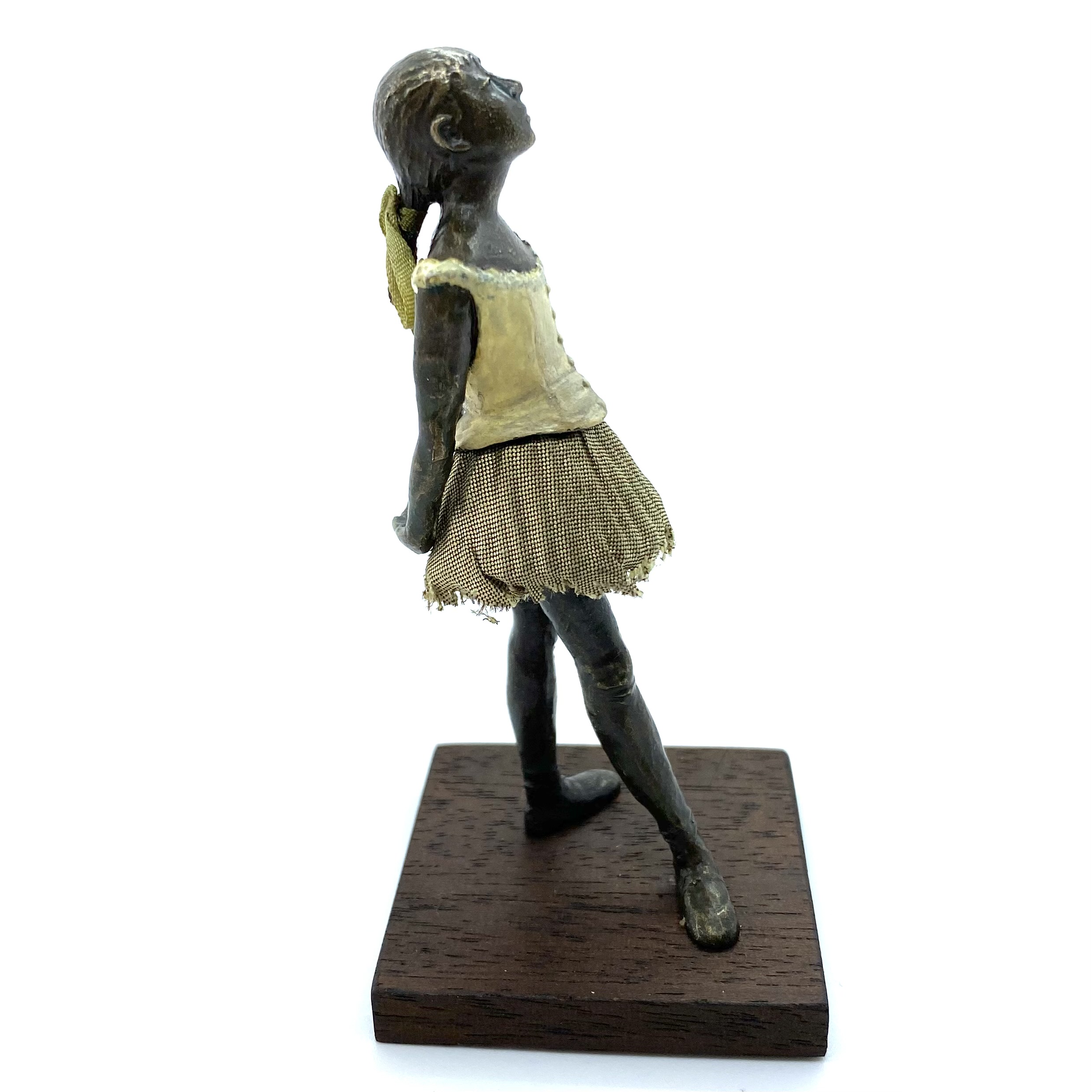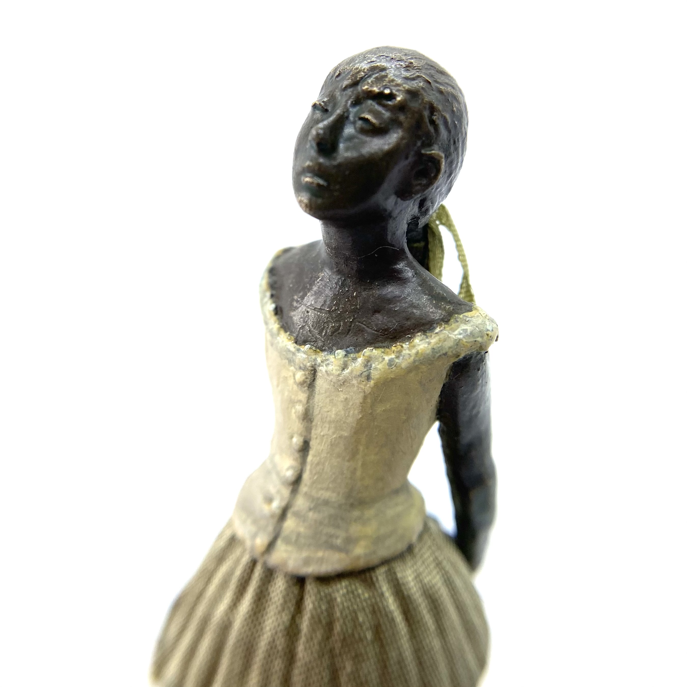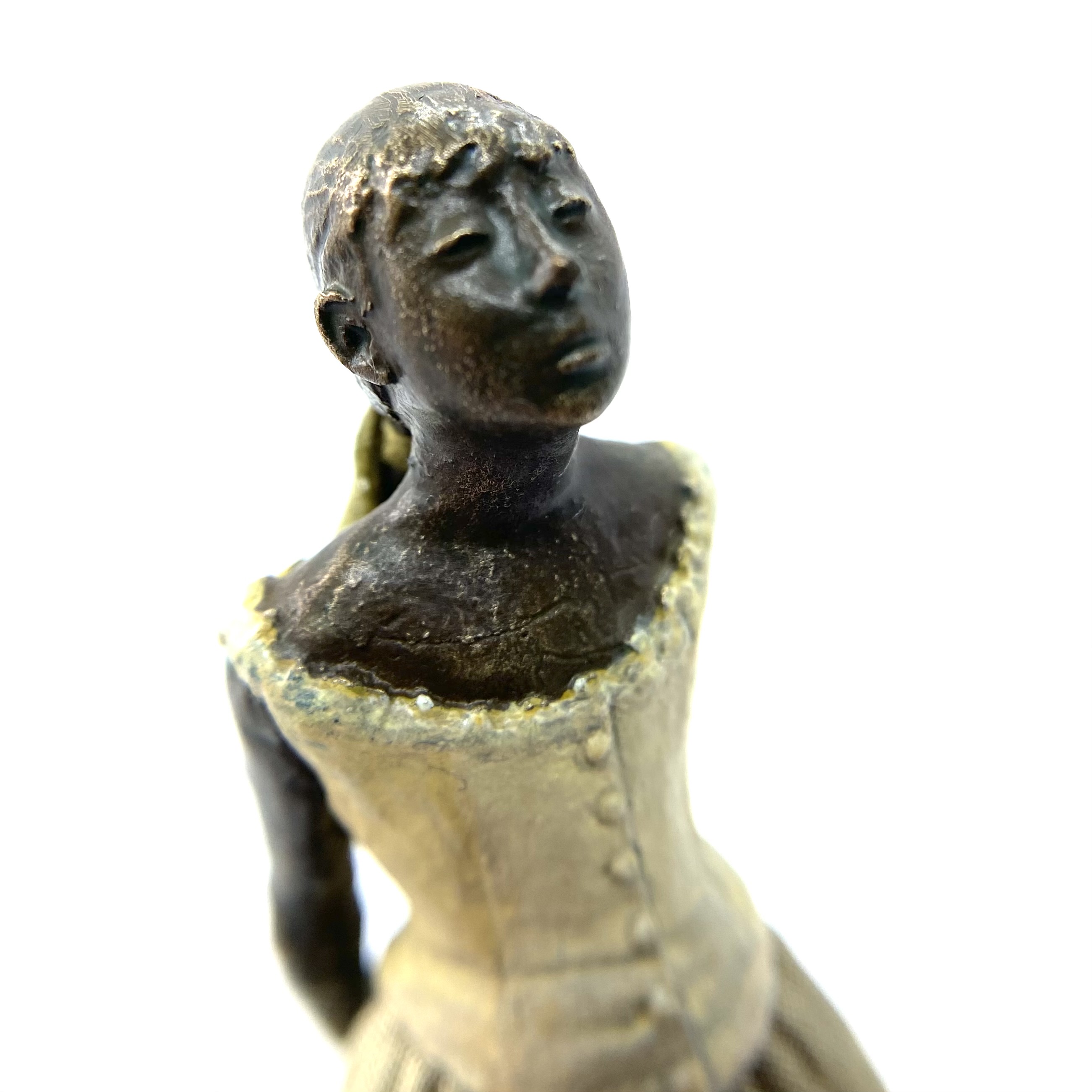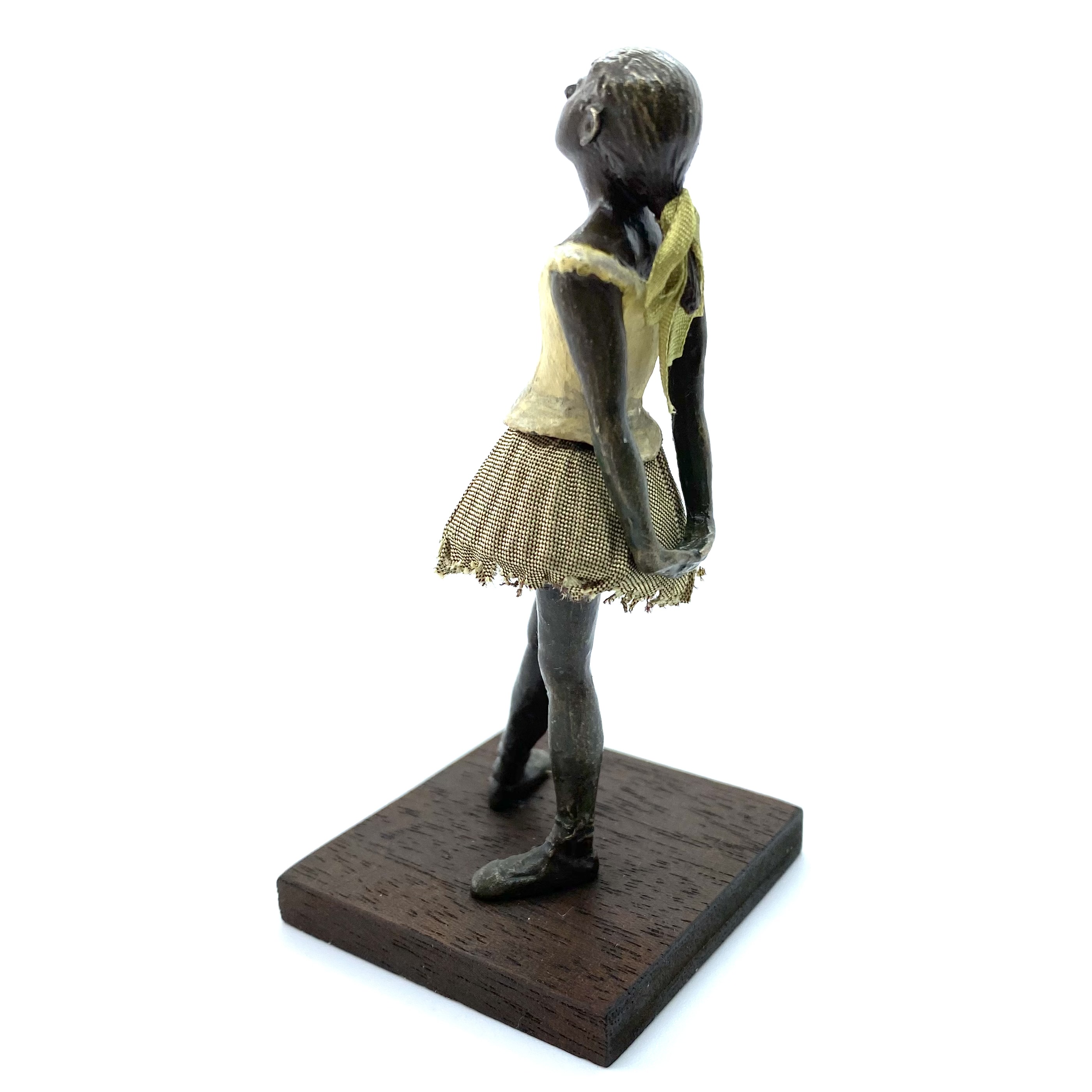 It was only in early 2022 that I learned Neil Carter had produced replicas of Degas’s Little Dancer, the iconic statue showing a fourteen-year-old ballerina poised and waiting for her cue. It is no longer being made, as far as I know, and I was lucky enough to buy this second-hand example from the collection of Barbara and Stan Dickinson, via Barbara’s son Chris. When she arrived, she wasn’t pristine: her then-blue skirt had discoloured through contact with the bronze, and the hem was fragile and had broken in some places, but she was still beautiful. Every detail echoed the Degas originals, down to the fabric ribbon and the creases of her stockings below her knees.