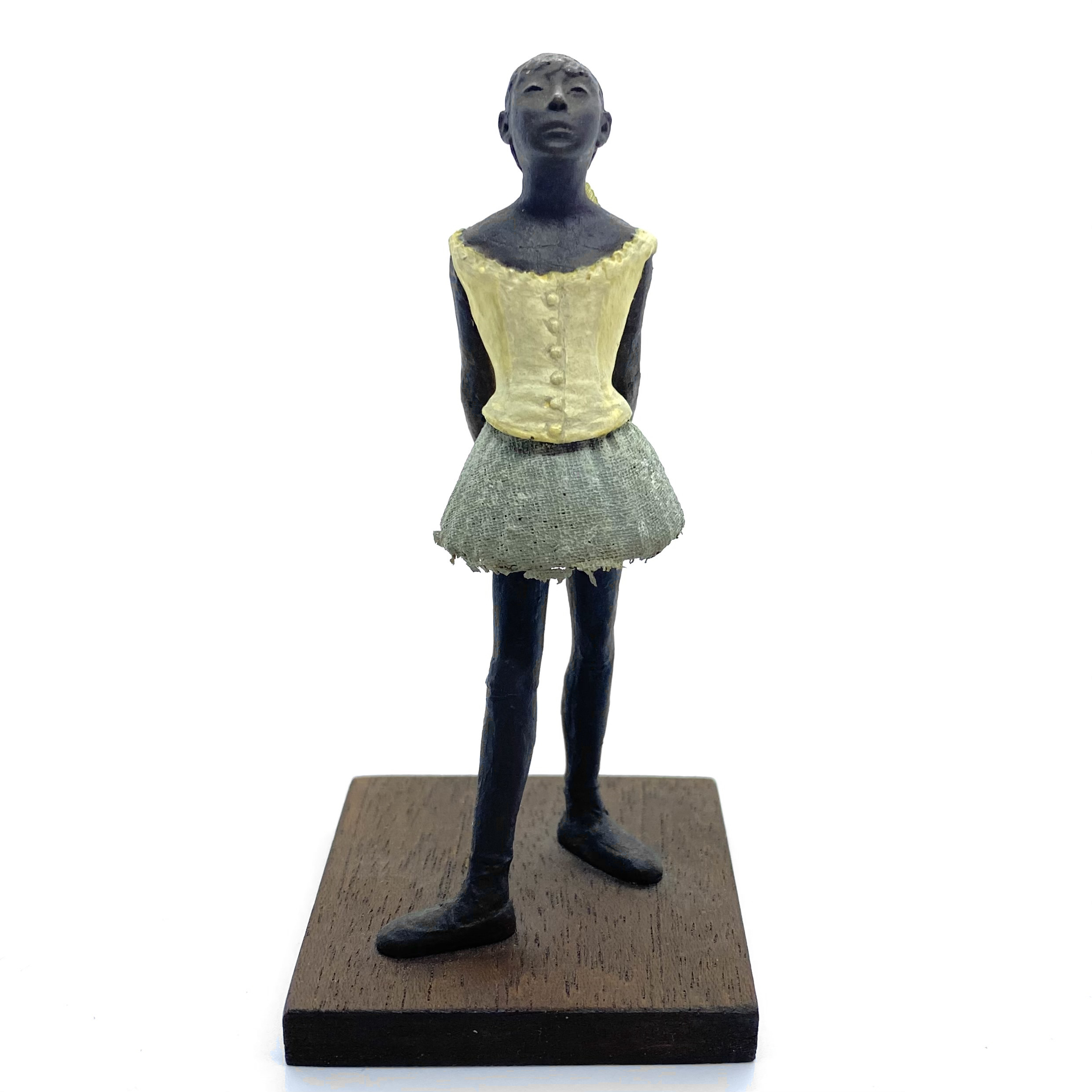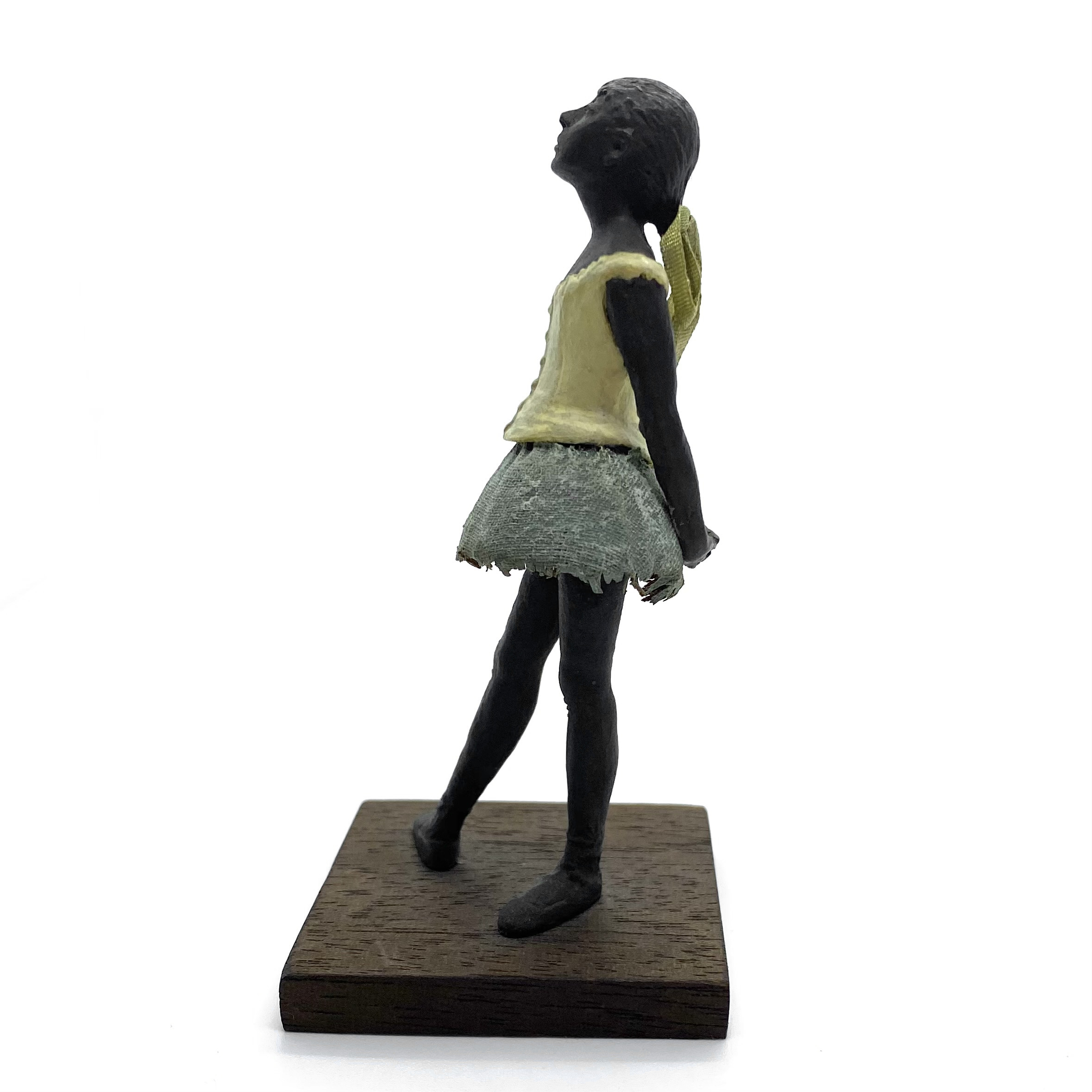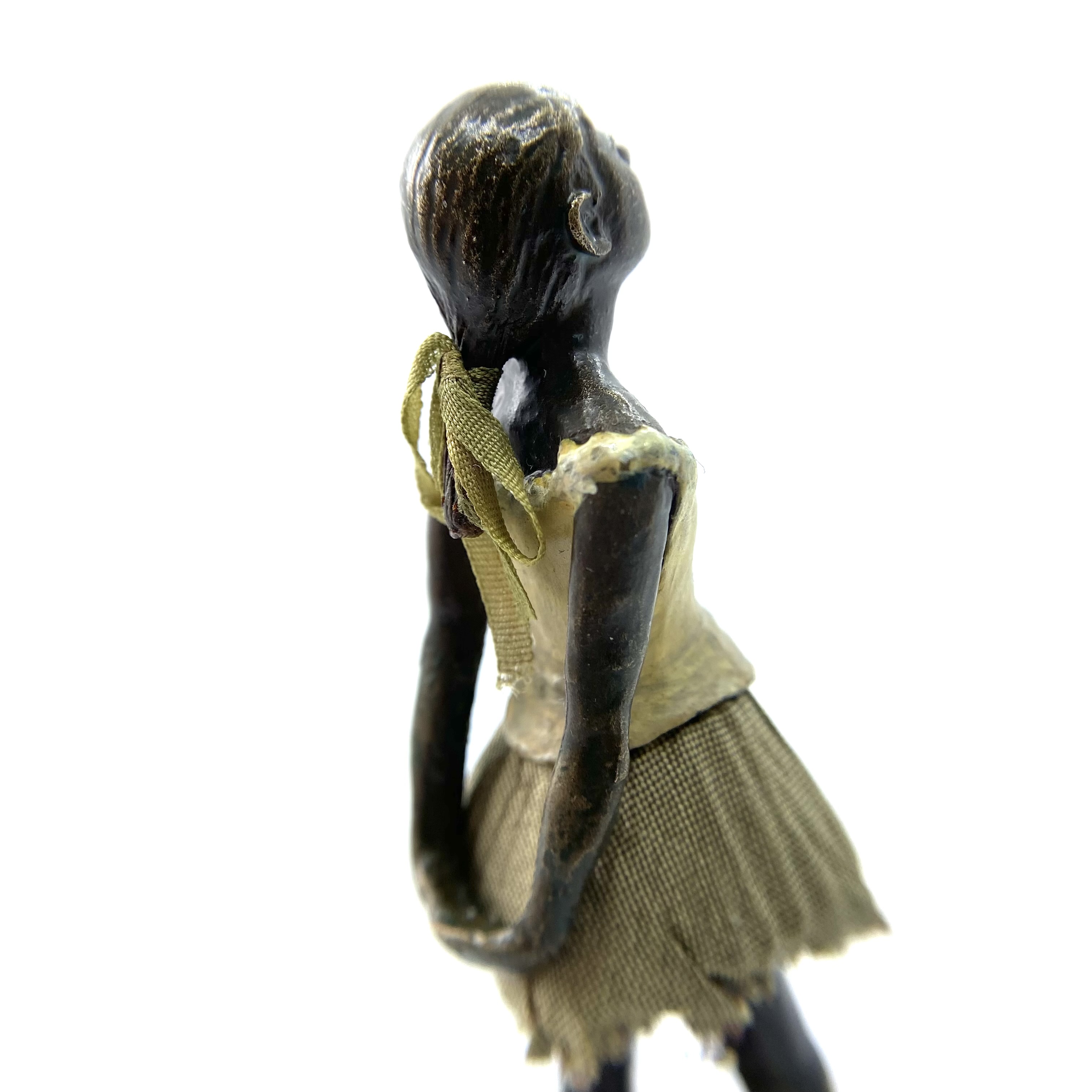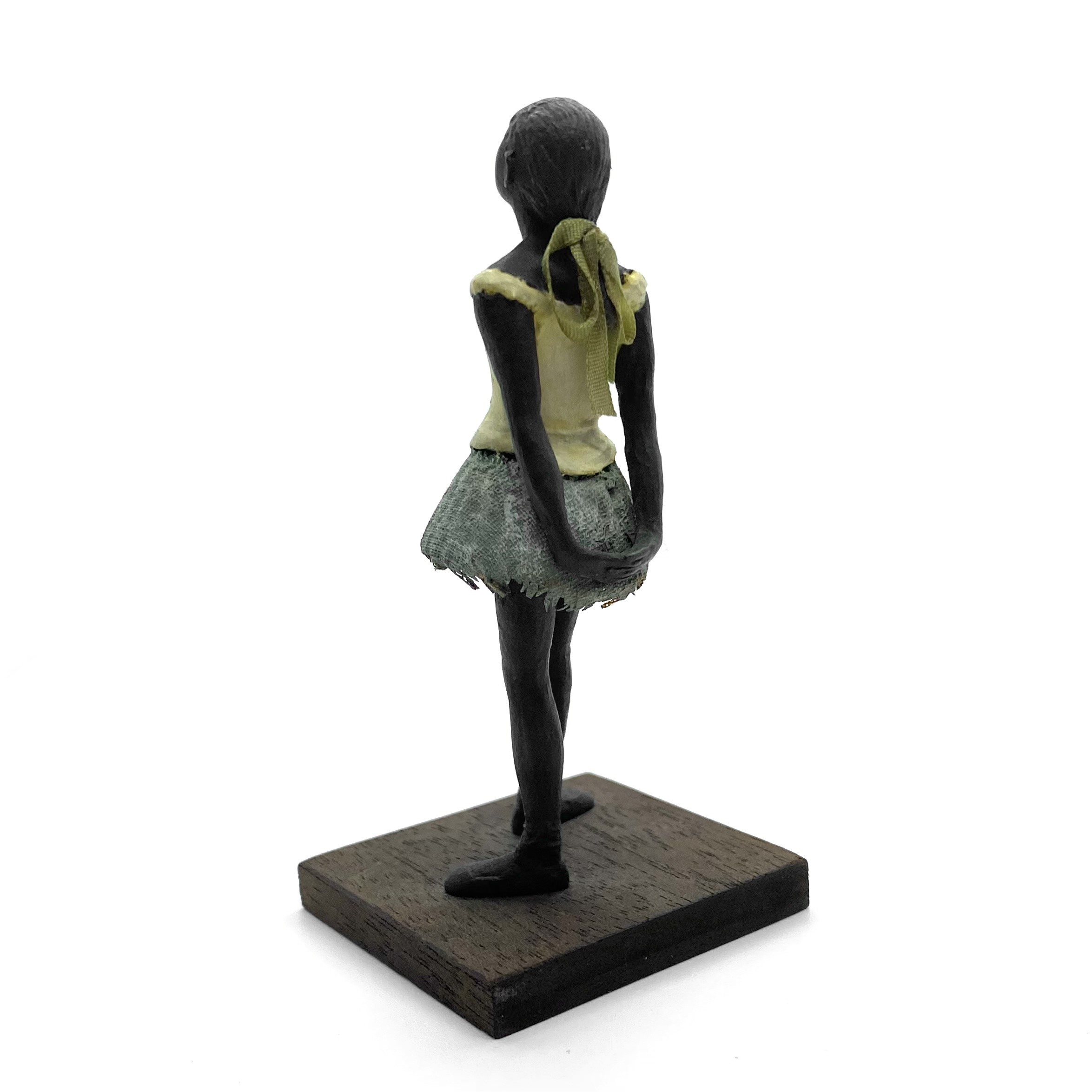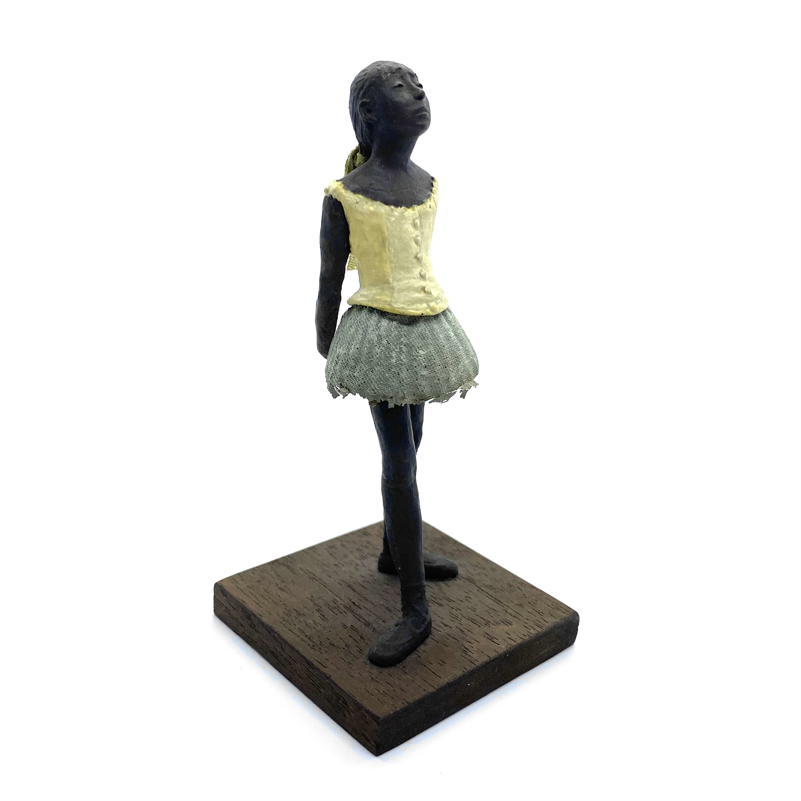 It was only in early 2022 that I learned Neil Carter had produced replicas of Degas’s Little Dancer, the iconic statue showing a fourteen-year-old ballerina poised and waiting for her cue. It is no longer being made, as far as I know, and I was lucky enough to buy this second-hand example from the collection of Barbara and Stan Dickinson, via Barbara’s son Chris. When she arrived, she wasn’t pristine: her then-blue skirt had discoloured through contact with the bronze, and the hem was fragile and had broken in some places, but she was still beautiful. Every detail echoed the Degas originals, down to the fabric ribbon and the creases of her stockings below her knees.