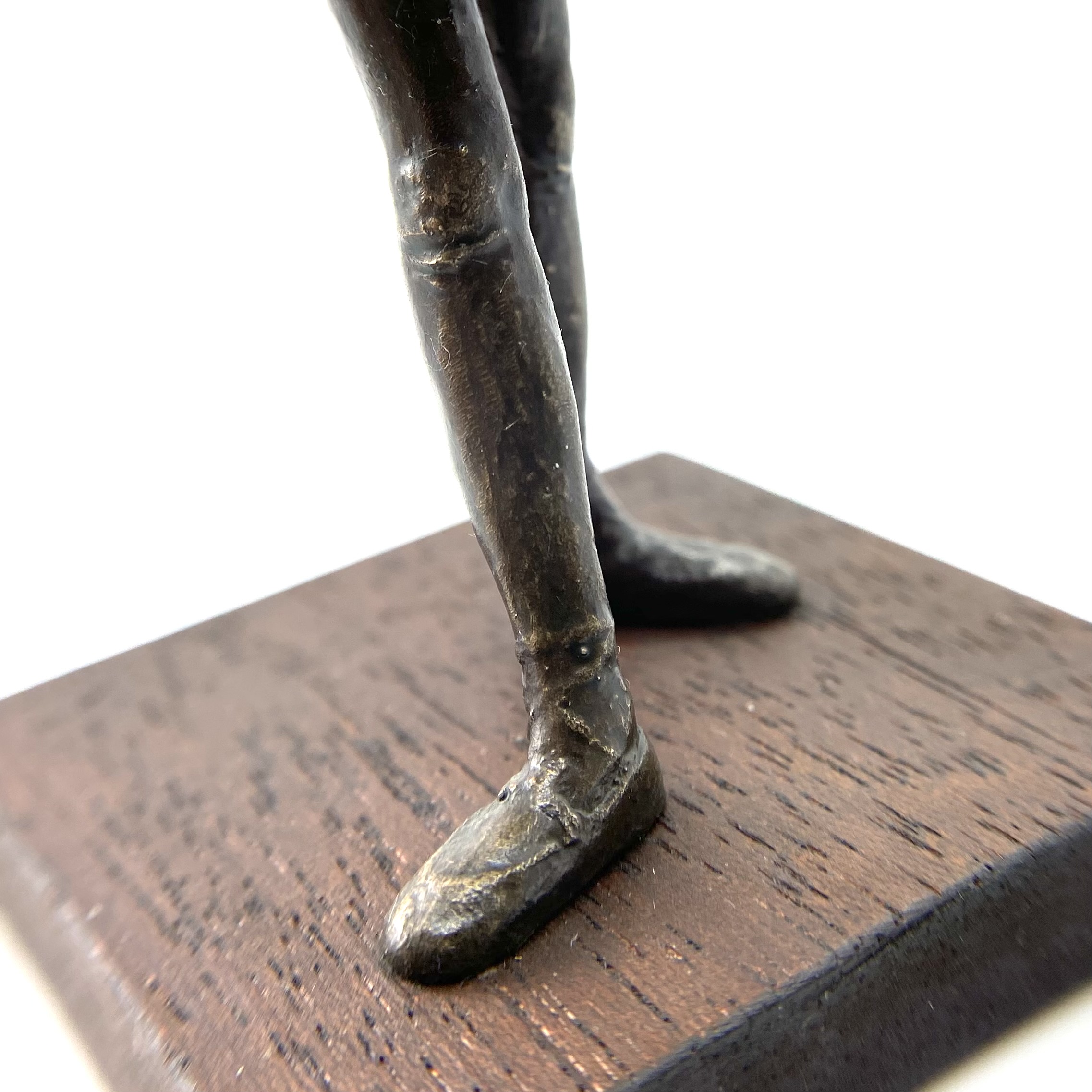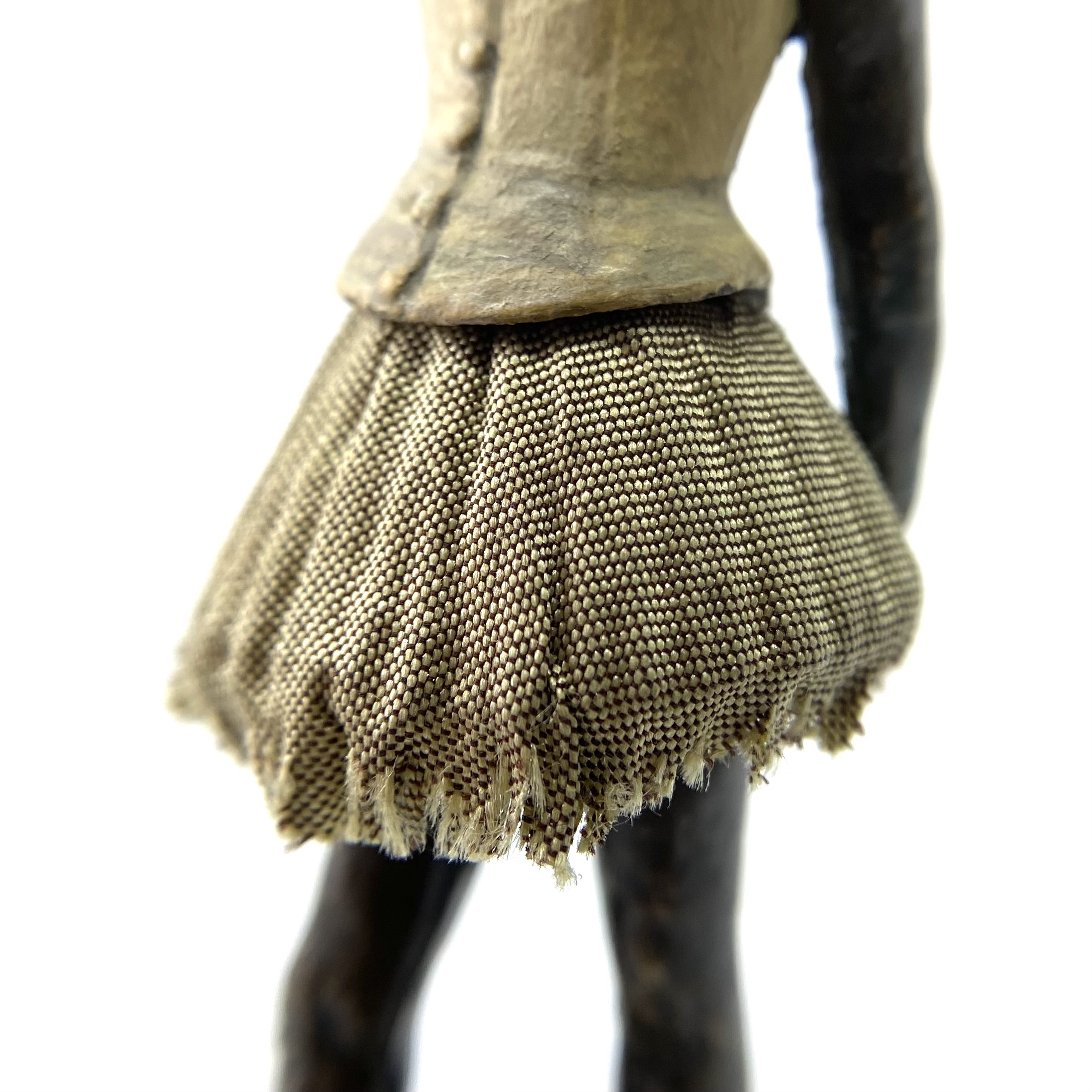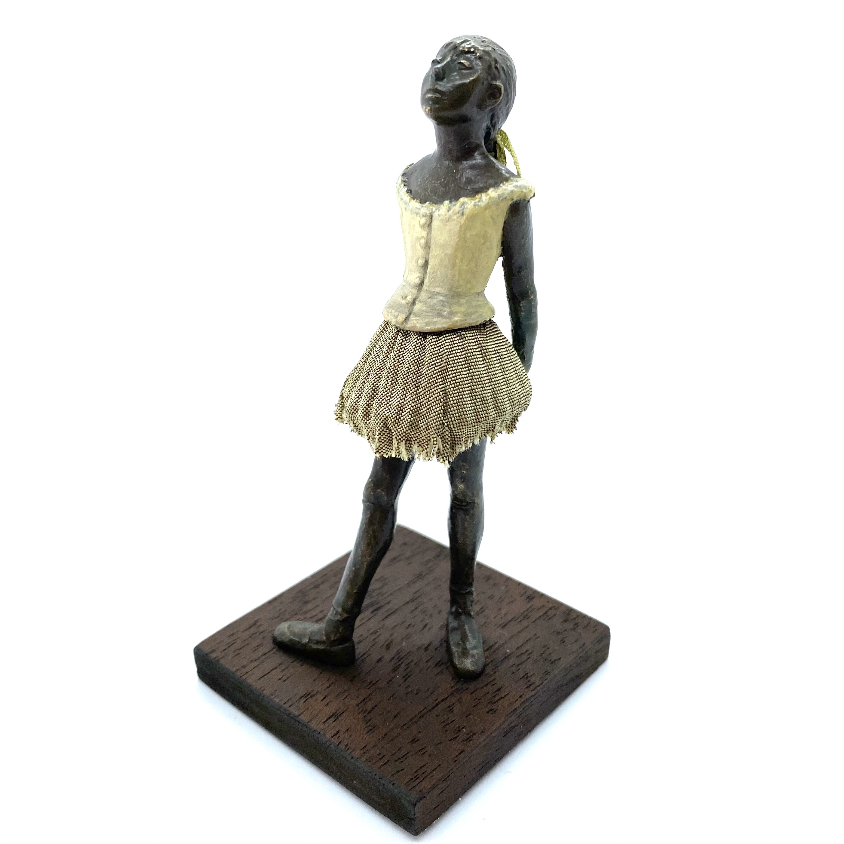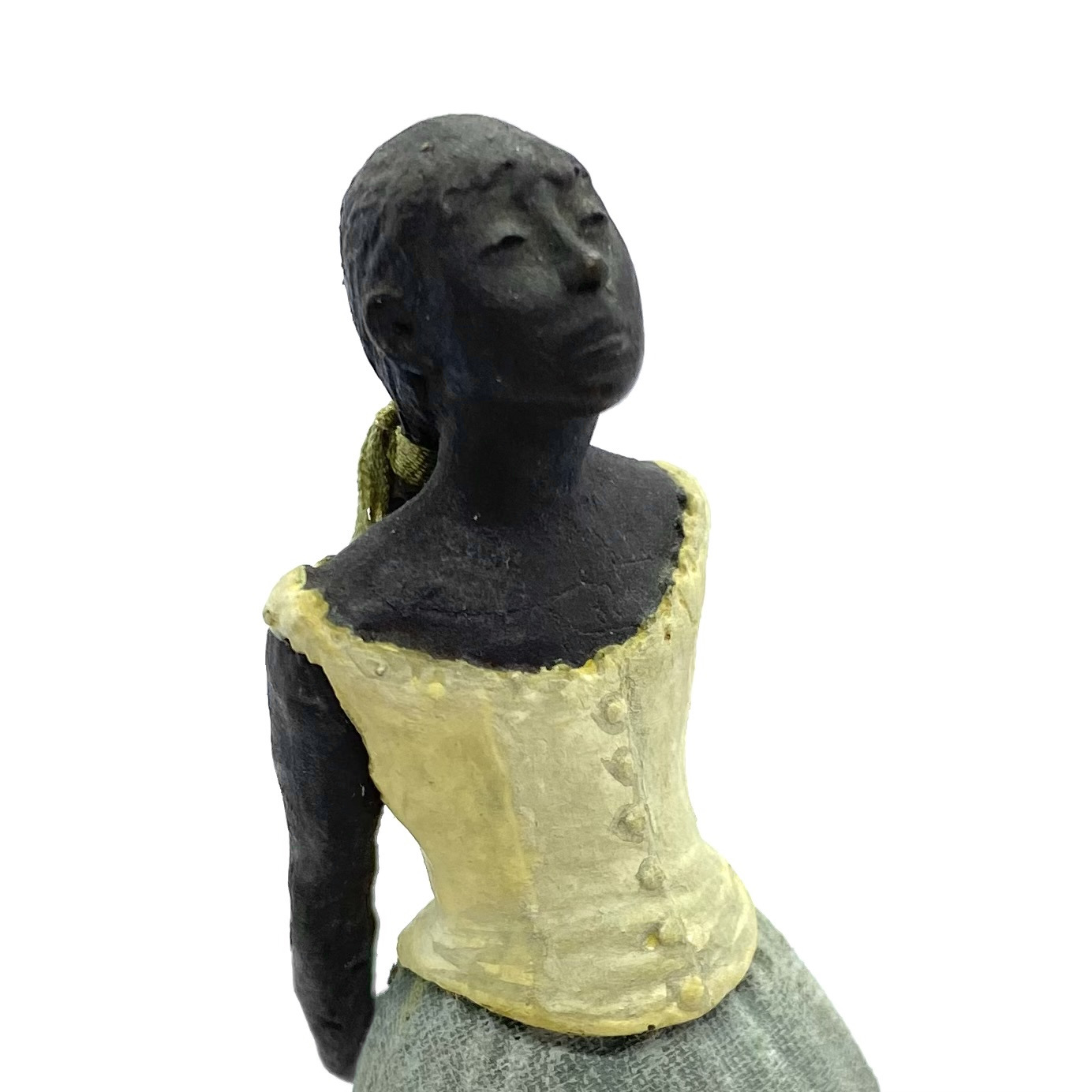 It was only in early 2022 that I learned Neil Carter had produced replicas of Degas’s Little Dancer, the iconic statue showing a fourteen-year-old ballerina poised and waiting for her cue. It is no longer being made, as far as I know, and I was lucky enough to buy this second-hand example from the collection of Barbara and Stan Dickinson, via Barbara’s son Chris. When she arrived, she wasn’t pristine: her then-blue skirt had discoloured through contact with the bronze, and the hem was fragile and had broken in some places, but she was still beautiful. Every detail echoed the Degas originals, down to the fabric ribbon and the creases of her stockings below her knees.