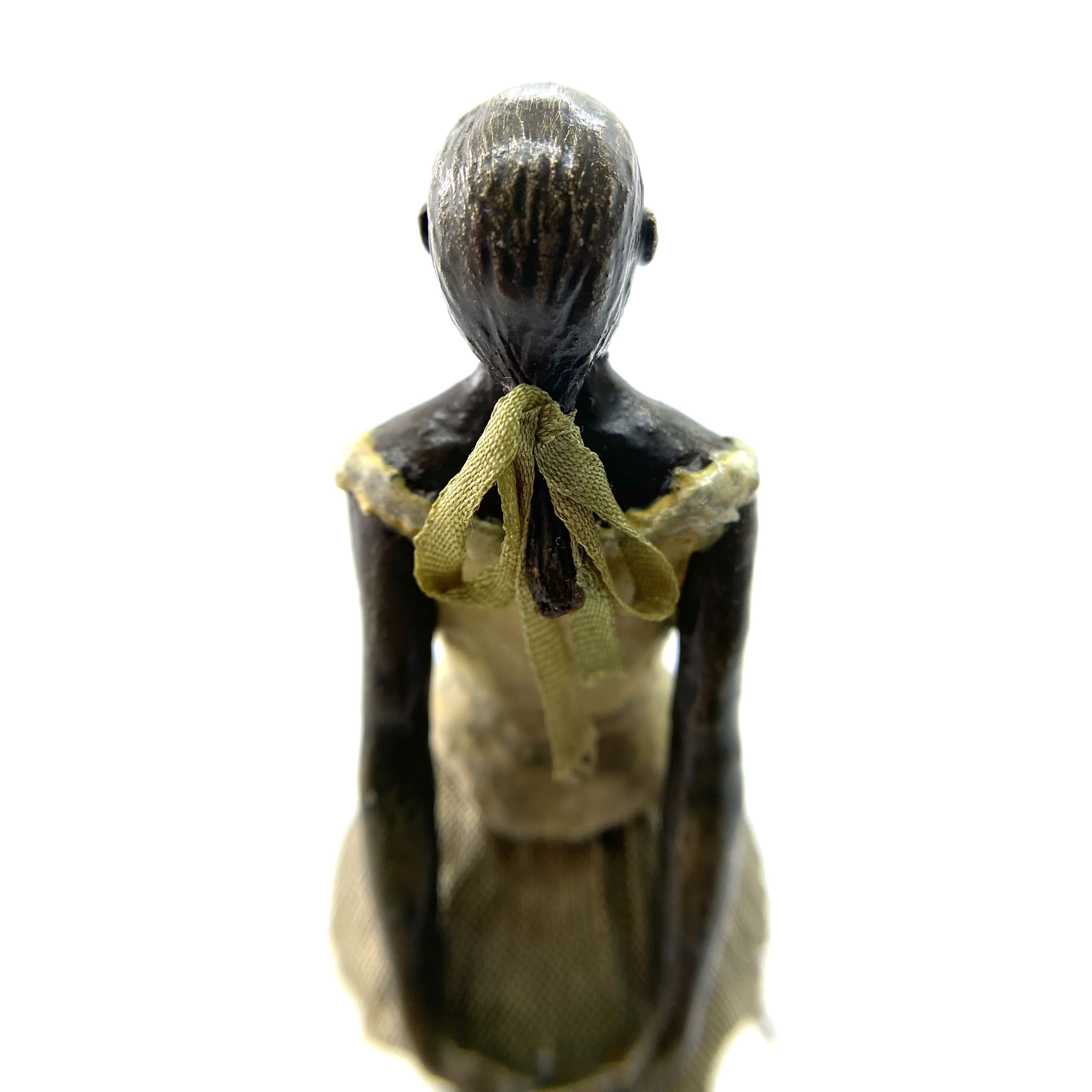I sent Neil a photo for his interest, and he very generously offered to restore her. He has repainted the bodice, replaced the skirt, burnished some areas of the bronze with steel work to bring out glints of gold, and finished the whole sculpture in beeswax to give it a soft sheen. If she was lovely before, she’s now gorgeous: a glorious piece of miniature art.