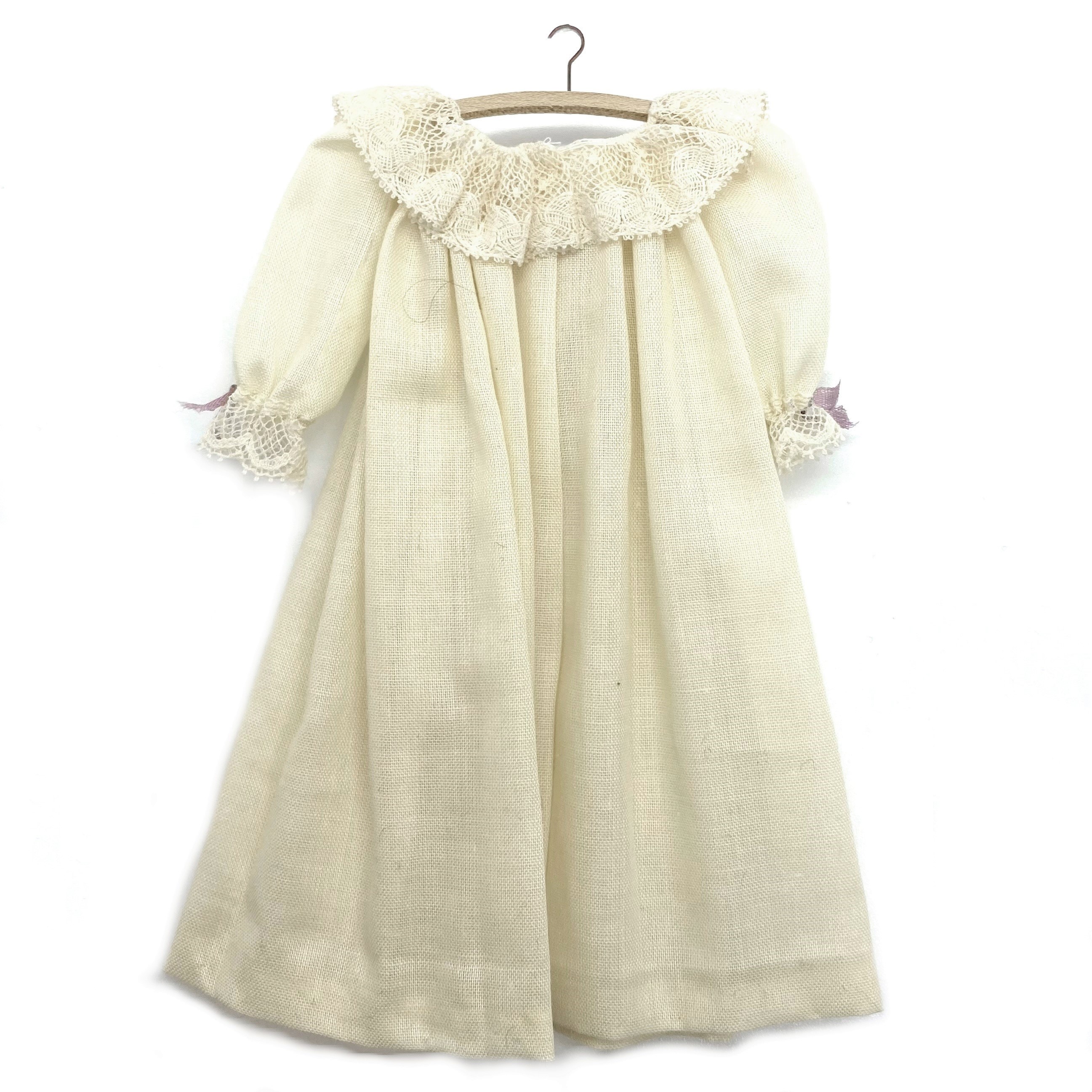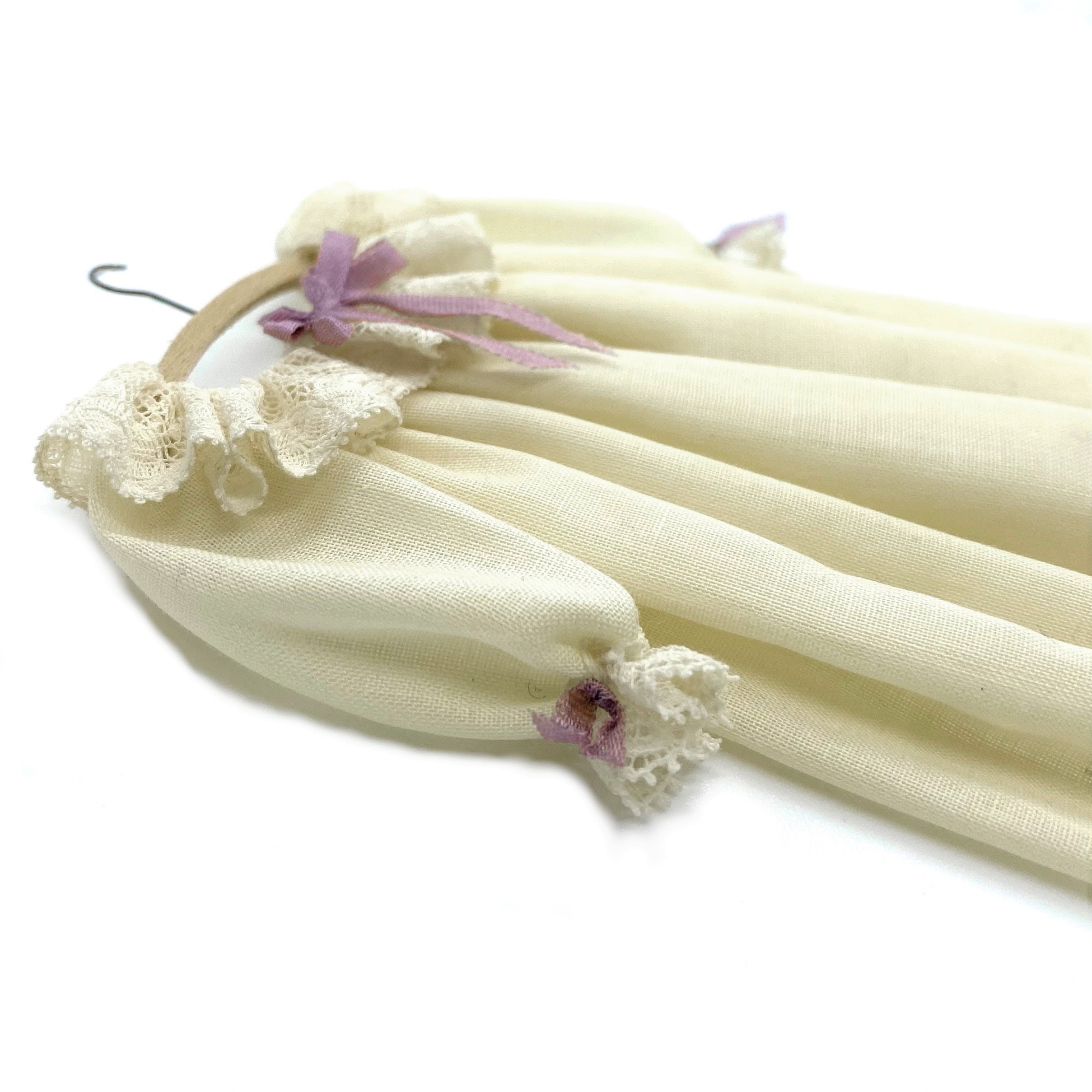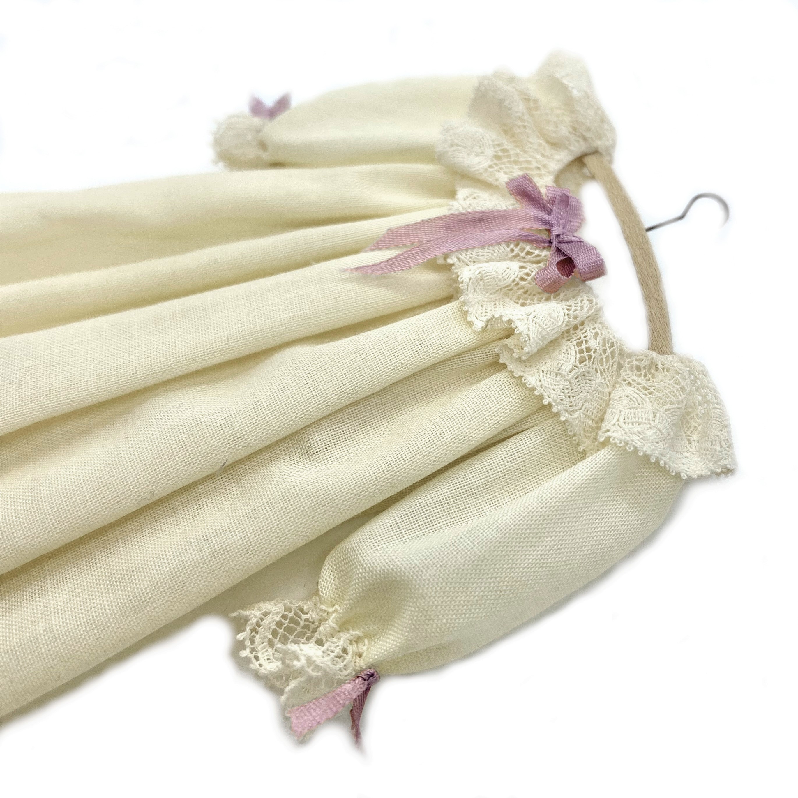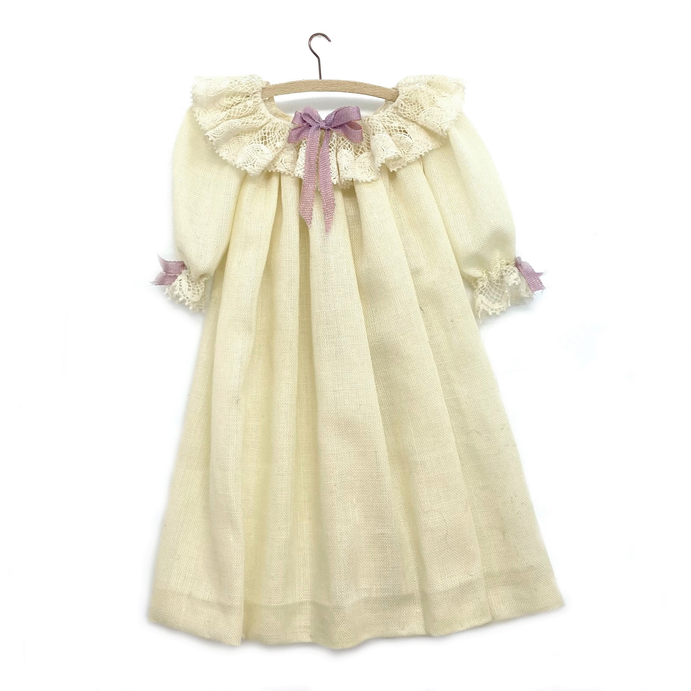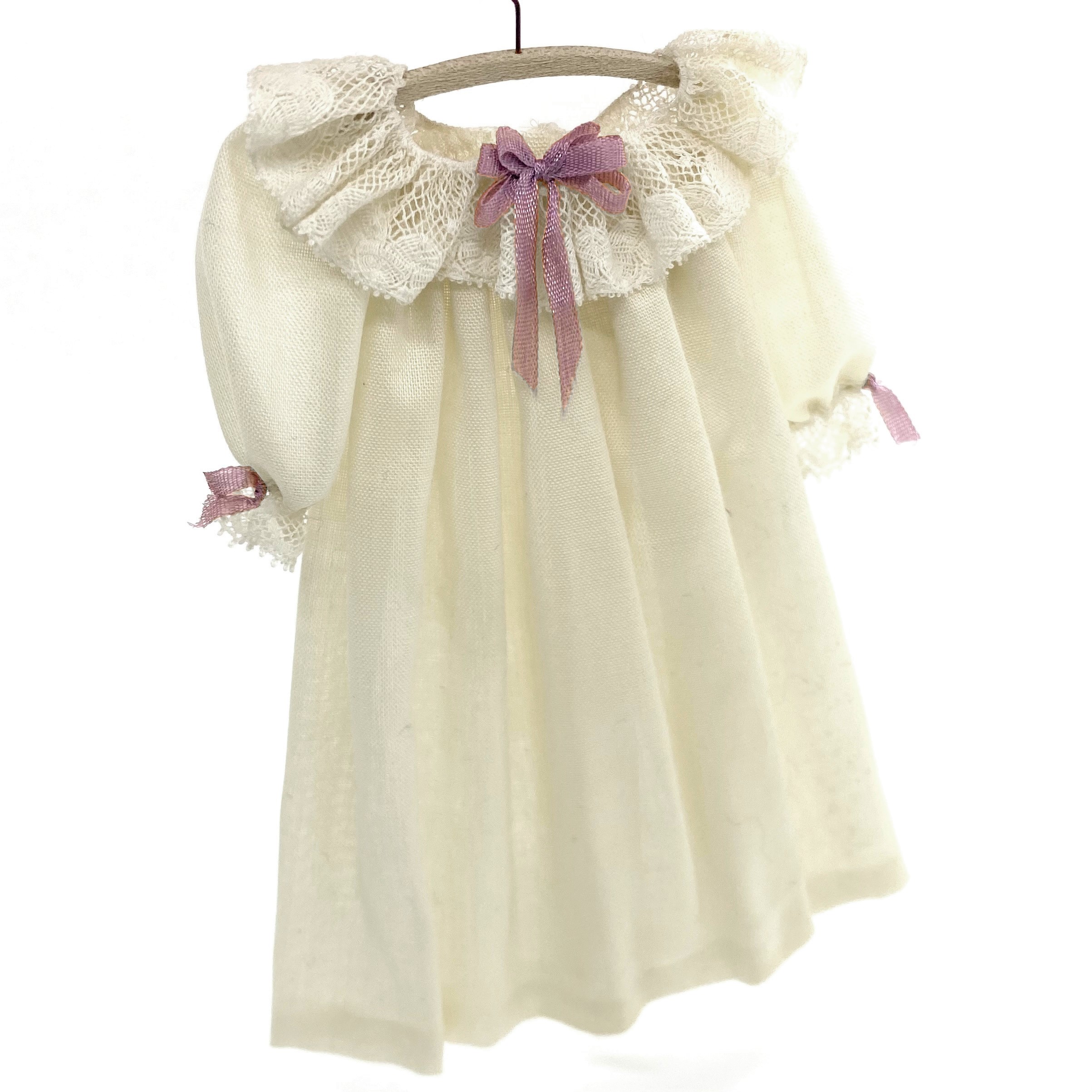 This pretty cotton nightgown, with lace ruffles at the neck and cuffs, and lilac ribbons, is by an unknown artist. I don’t even know where to begin trying to identify it, although I’ve seen some similar gowns by mini couturier Janet Middlebrook. For the time being, it doesn’t matter who made it. It’s charming enough that I enjoy it just as it is. It’ll look lovely in a wardrobe, or perhaps hanging on the back of a door. I haven’t quite decided whether it’s Elizabeth’s or Isabella’s, but for now let’s put it in the Master Bedroom.