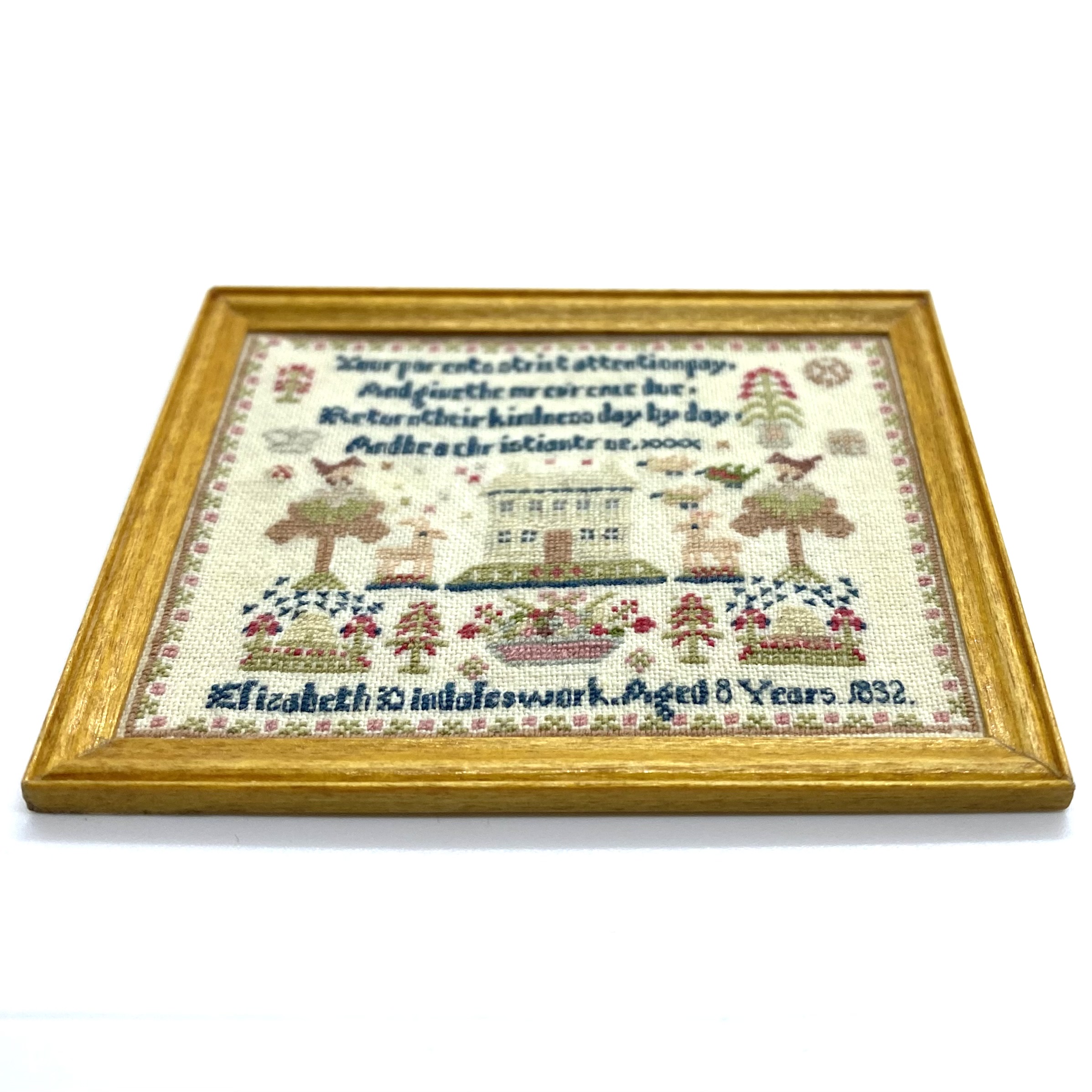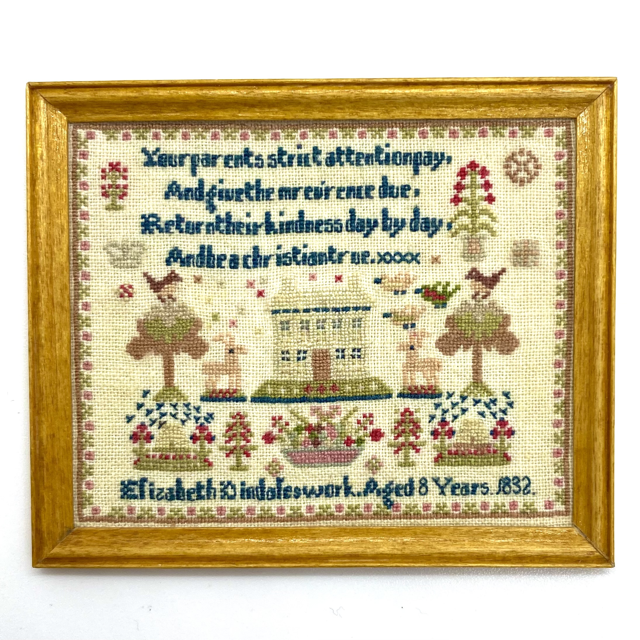 This wonderful little sampler is worked on an especially fine weave, and caught my eye both for its design – which I had never seen before – and the verse included at the top, which I thought would be absolutely perfect for the Schoolroom. It isn’t the easiest to read, so I’ll transcribe it here: ‘Your parents strict attention pay, / And give them rev’rence due, / Return their kindness day by day, / And be a Christian true‘. At the bottom we read ‘Elizabeth Indales work. Aged 8 Years 1832.’ The main design shows a house flanked by deer, trees and birds, with baskets of flowers along the bottom; there’s even a delicate abstract border which suggests a row of pink roses.