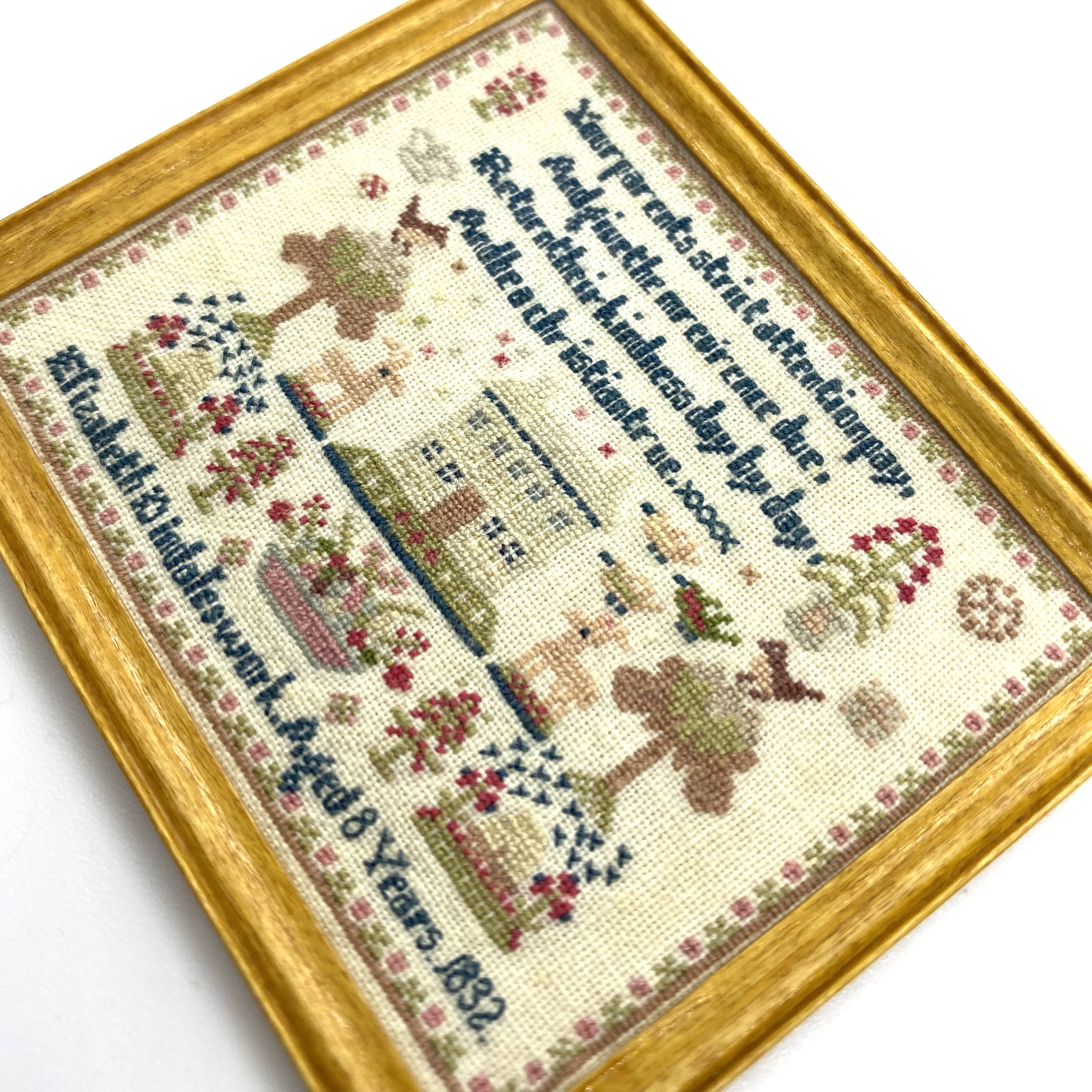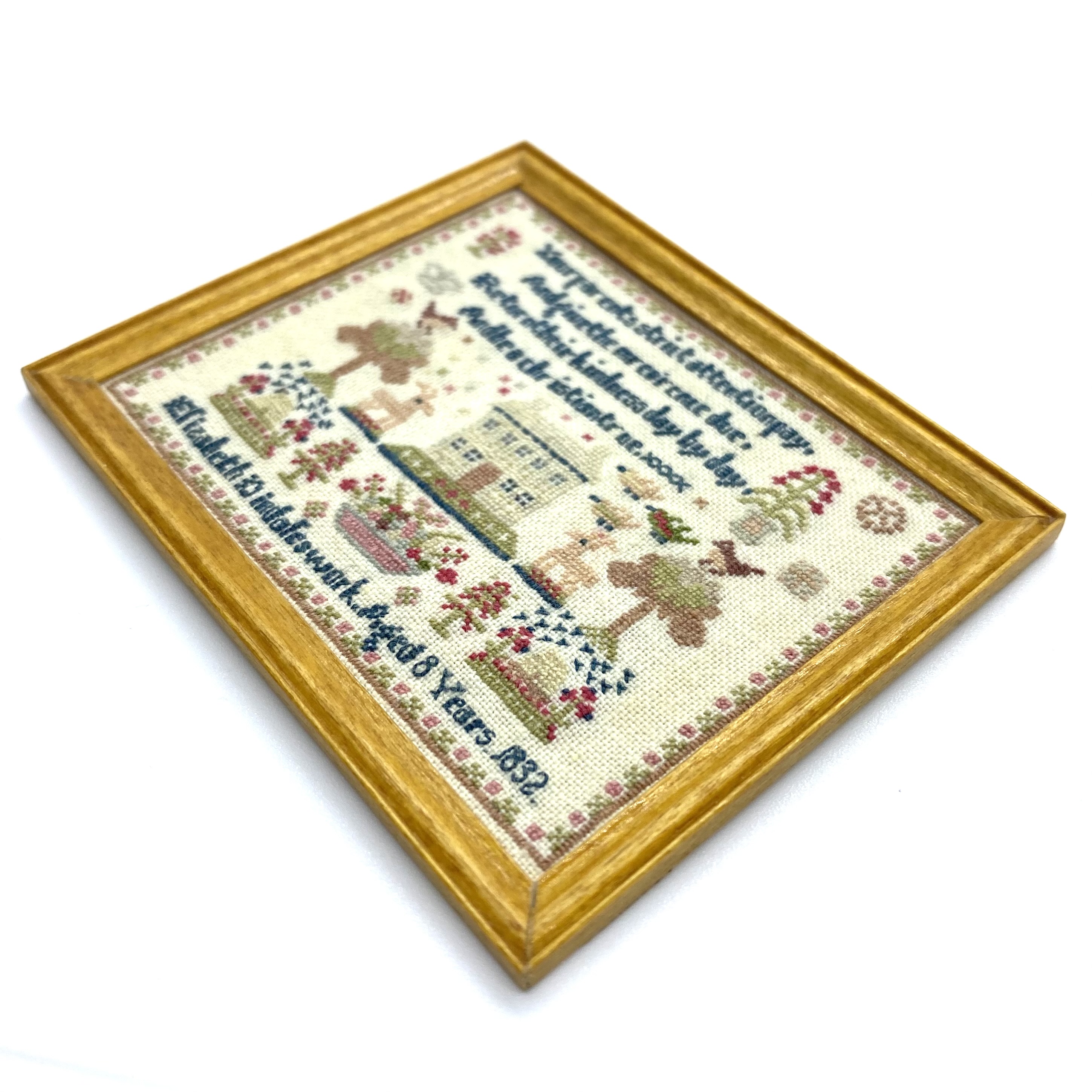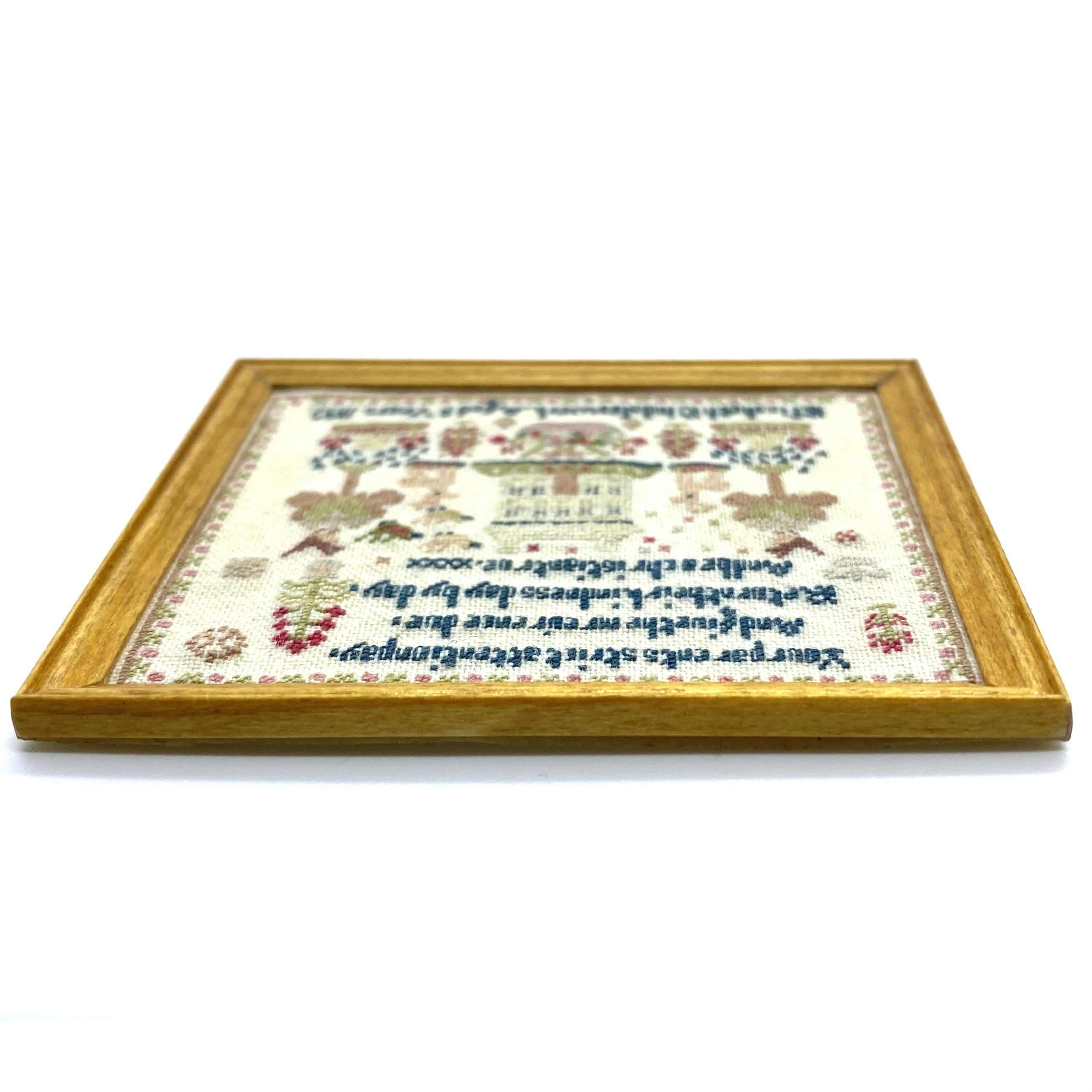 It’s absolutely delightful and the embroiderer has kindly attached a label to the back of the frame to identify herself. ‘Worked by Janice Mansfield in 1998. This miniature is closely based on a full size original.‘ I can’t find out anything about Janice Mansfield, so I don’t know if she is a familiar name to miniature collectors or simply a very talented lady who decided to shrink a favourite sampler to 1:12 size. But the result is exquisite.