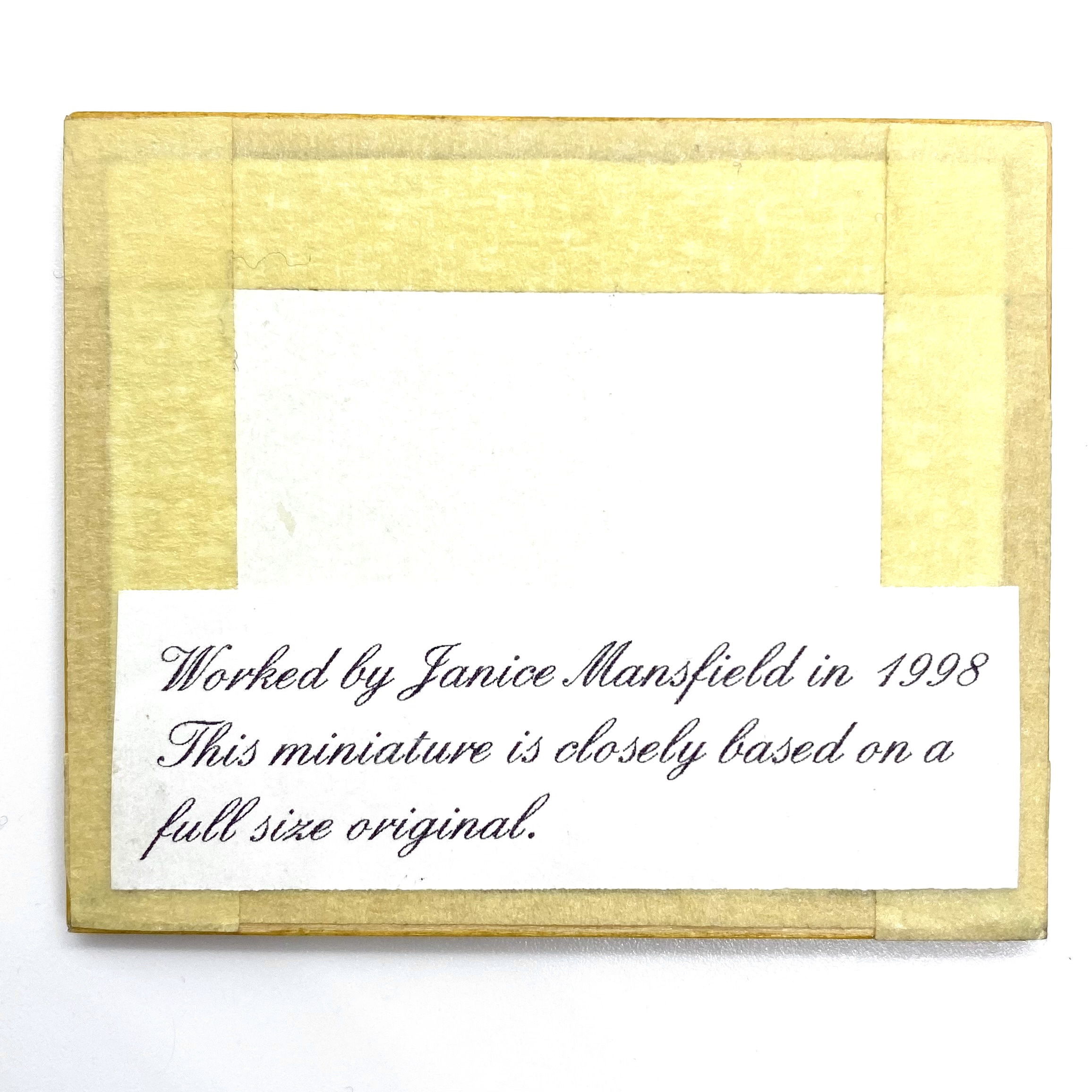 Inscriptions: with printed label on the back of the frame: ‘Worked by Janice Mansfield in 1998. This miniature is closely based on a full size original.’