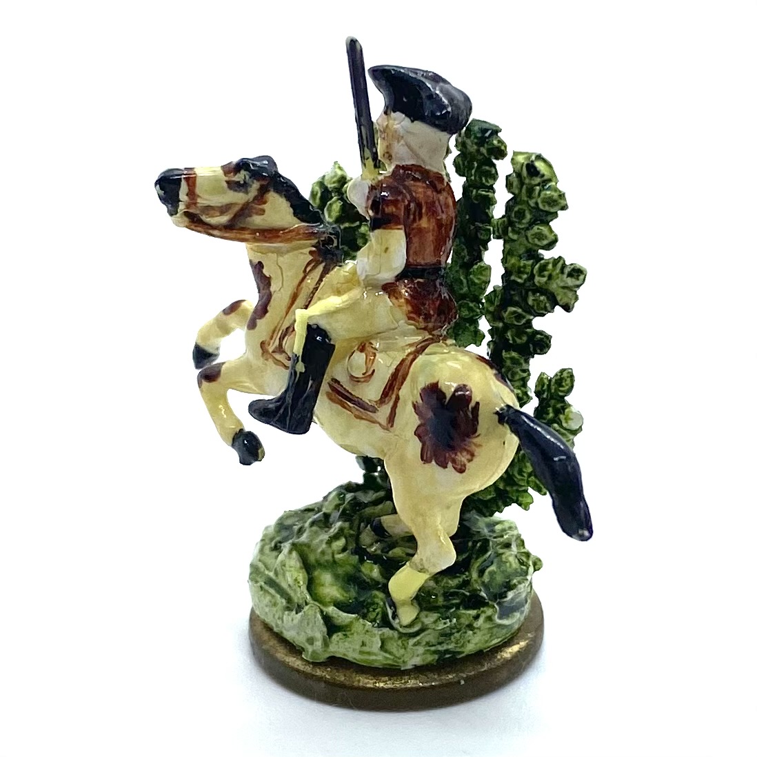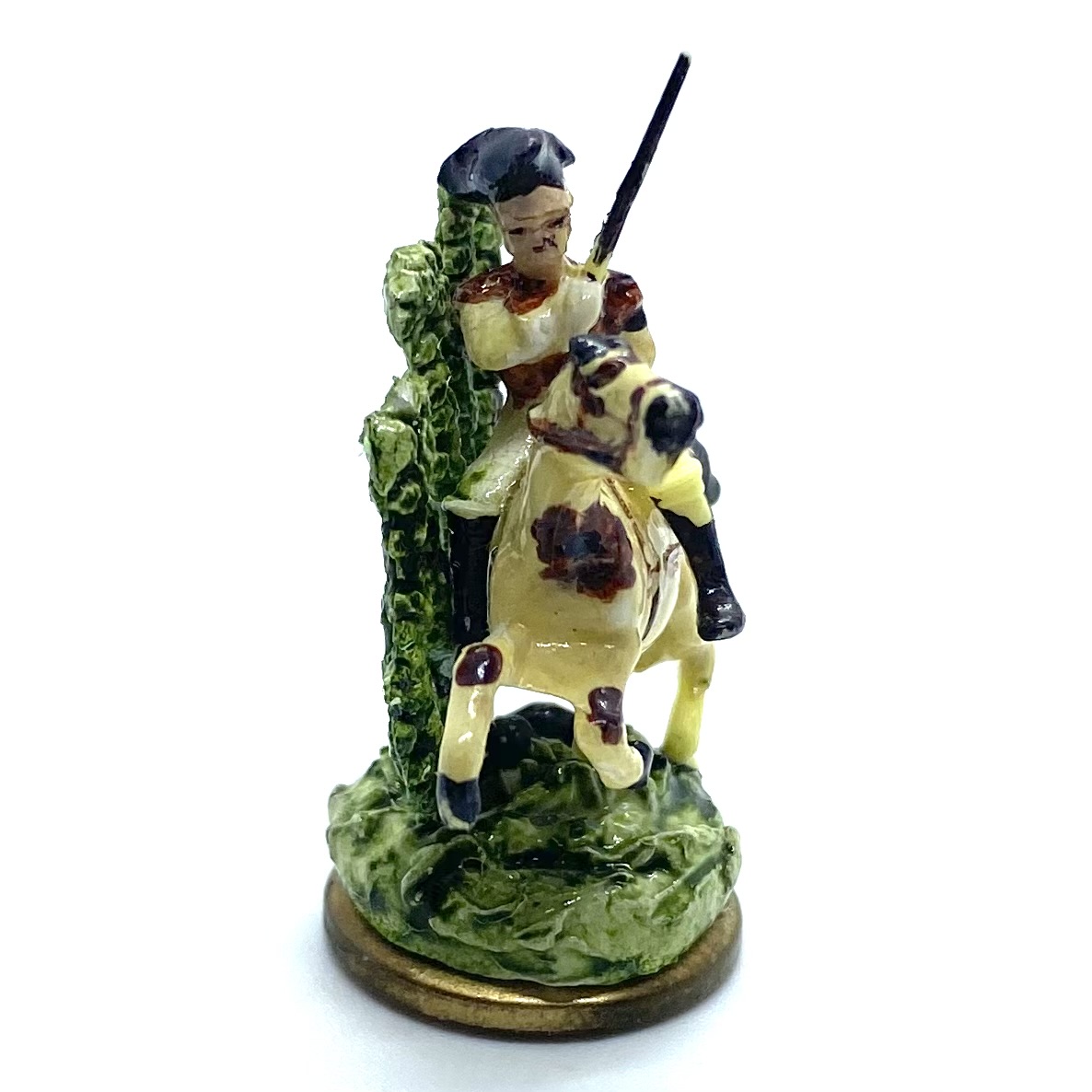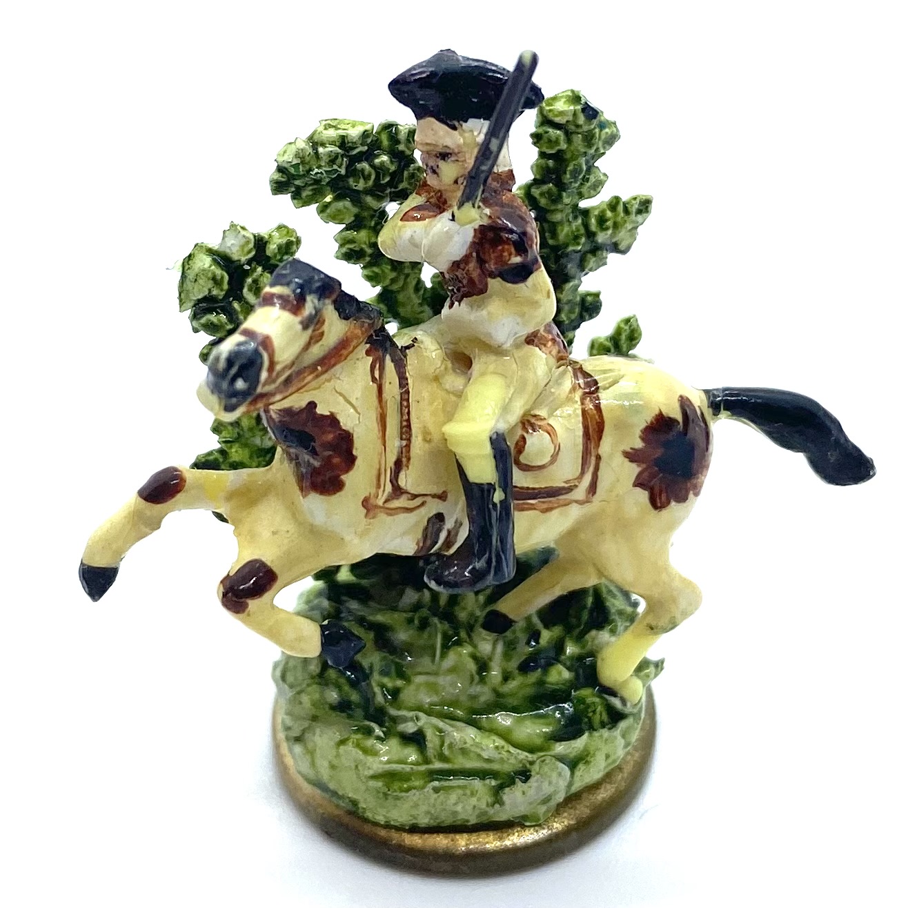 This is another work by the enigmatic Kay Lewis. I couldn’t resist its jaunty subject, with the soldier proudly holding his musket high as his horse prances under him. It’s presented against the Staffordshire-style fan of drapery that appears at the back of most of Kay’s works. Like the other sculpture I have from her, it seems to be made from a rubbery kind of resin: the fronds of greenery are particularly fragile. Equine subjects usually go to the Smoking Room, but in this case the patriotic or historical subject makes it more suited for the Library.