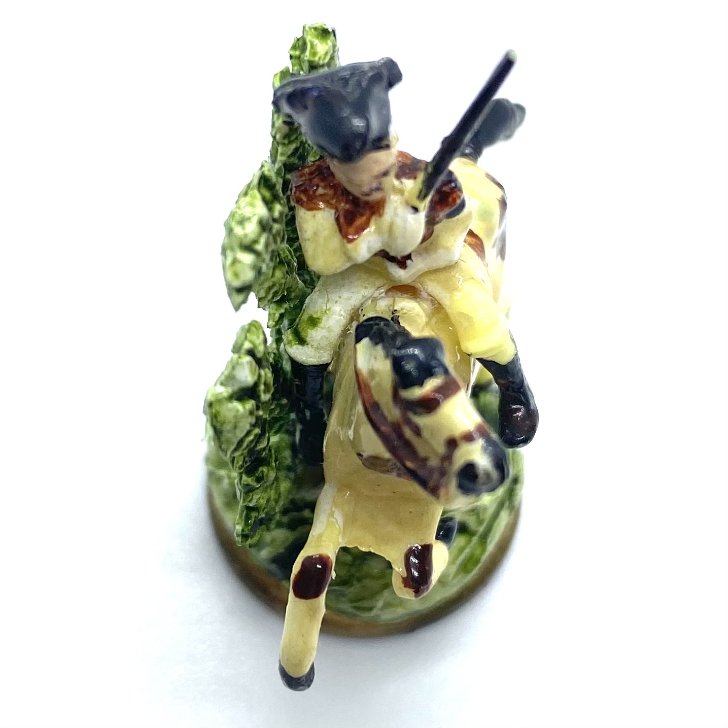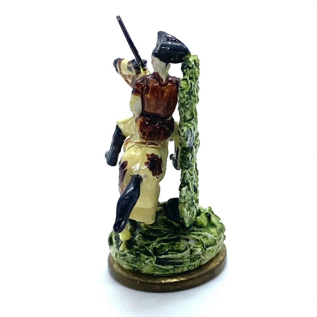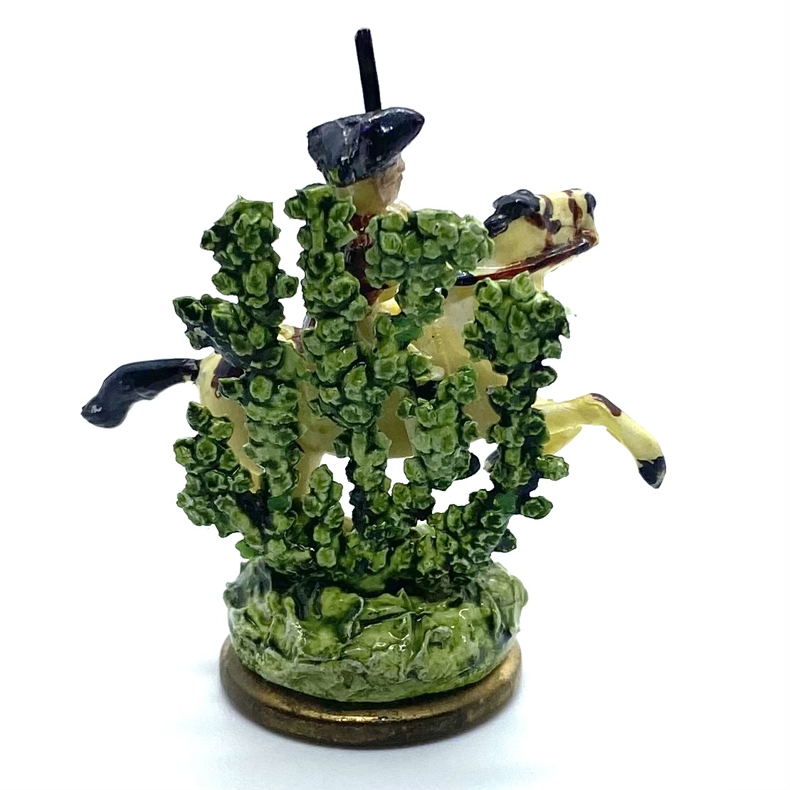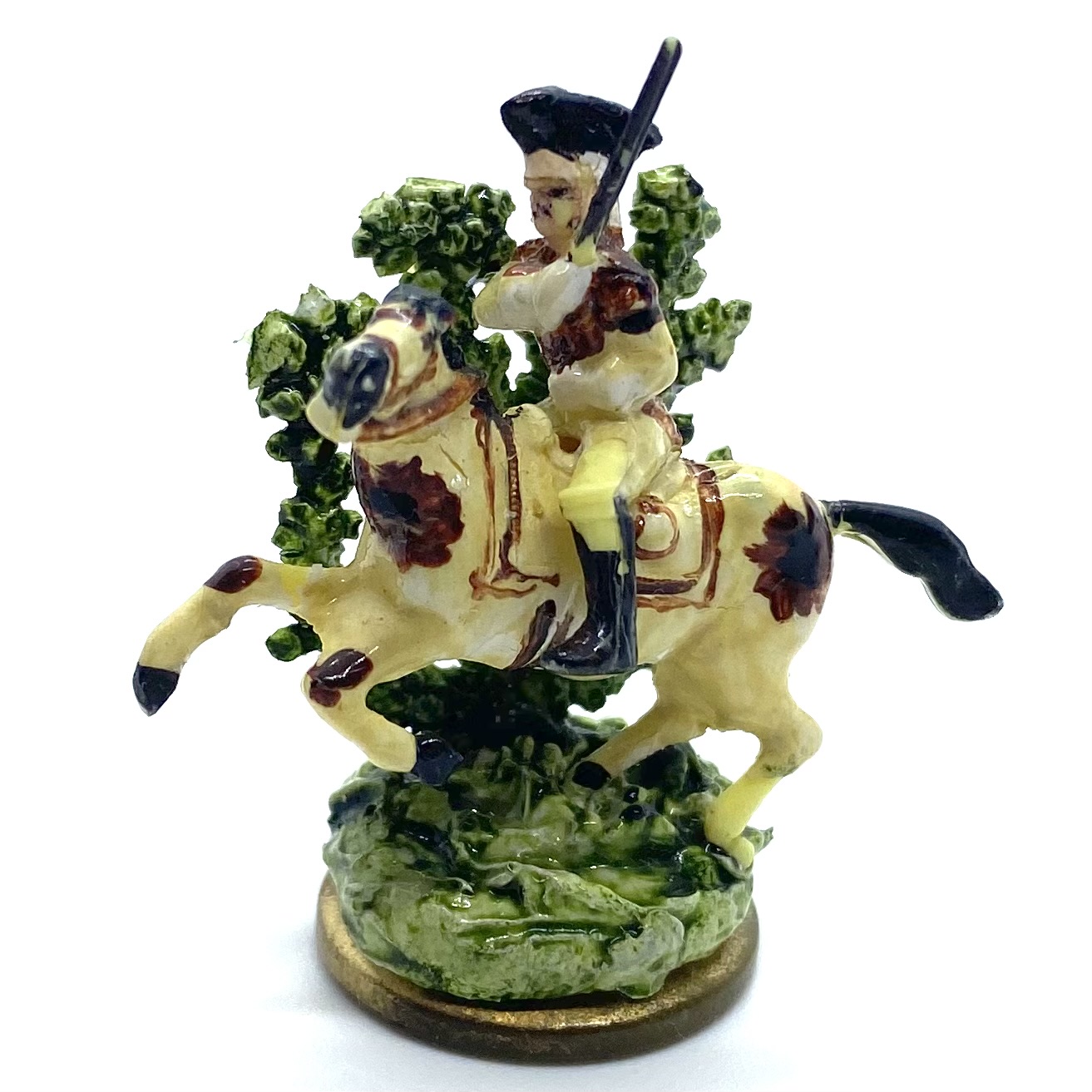 This is another work by the enigmatic Kay Lewis. I couldn’t resist its jaunty subject, with the soldier proudly holding his musket high as his horse prances under him. It’s presented against the Staffordshire-style fan of drapery that appears at the back of most of Kay’s works. Like the other sculpture I have from her, it seems to be made from a rubbery kind of resin: the fronds of greenery are particularly fragile. Equine subjects usually go to the Smoking Room, but in this case the patriotic or historical subject makes it more suited for the Library.