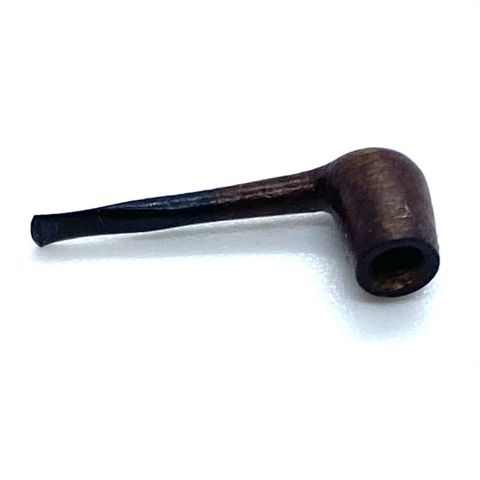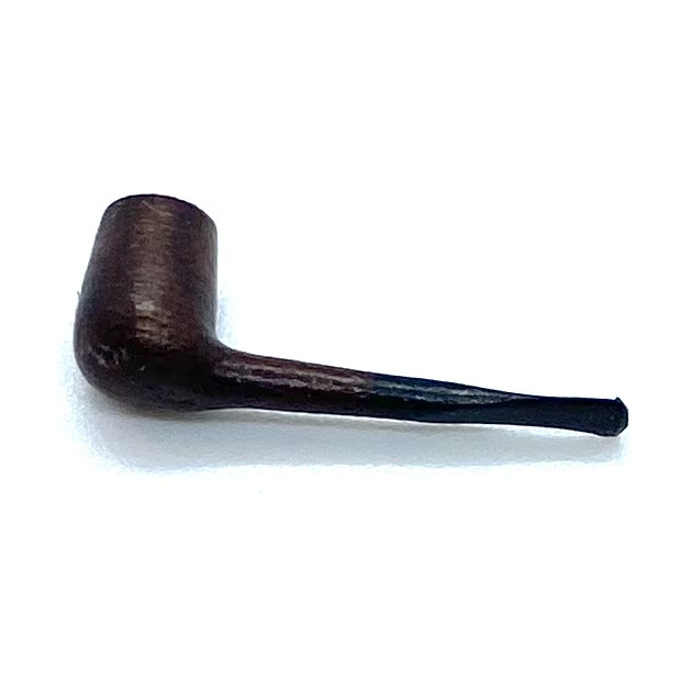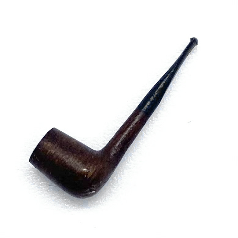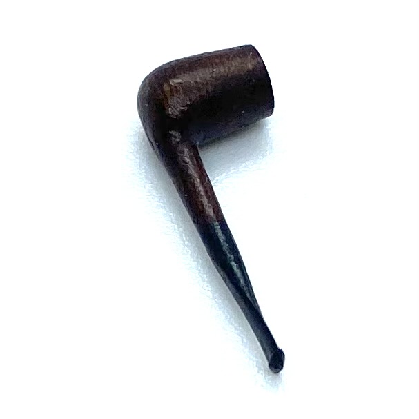 There are numerous miniature pipes available on the market, but I haven’t yet seen one as perfectly shaped as this, down to the slight flare at the tip where the smoker grasps it between his teeth. A wonderful piece of work, and so small that it was hard to photograph properly.