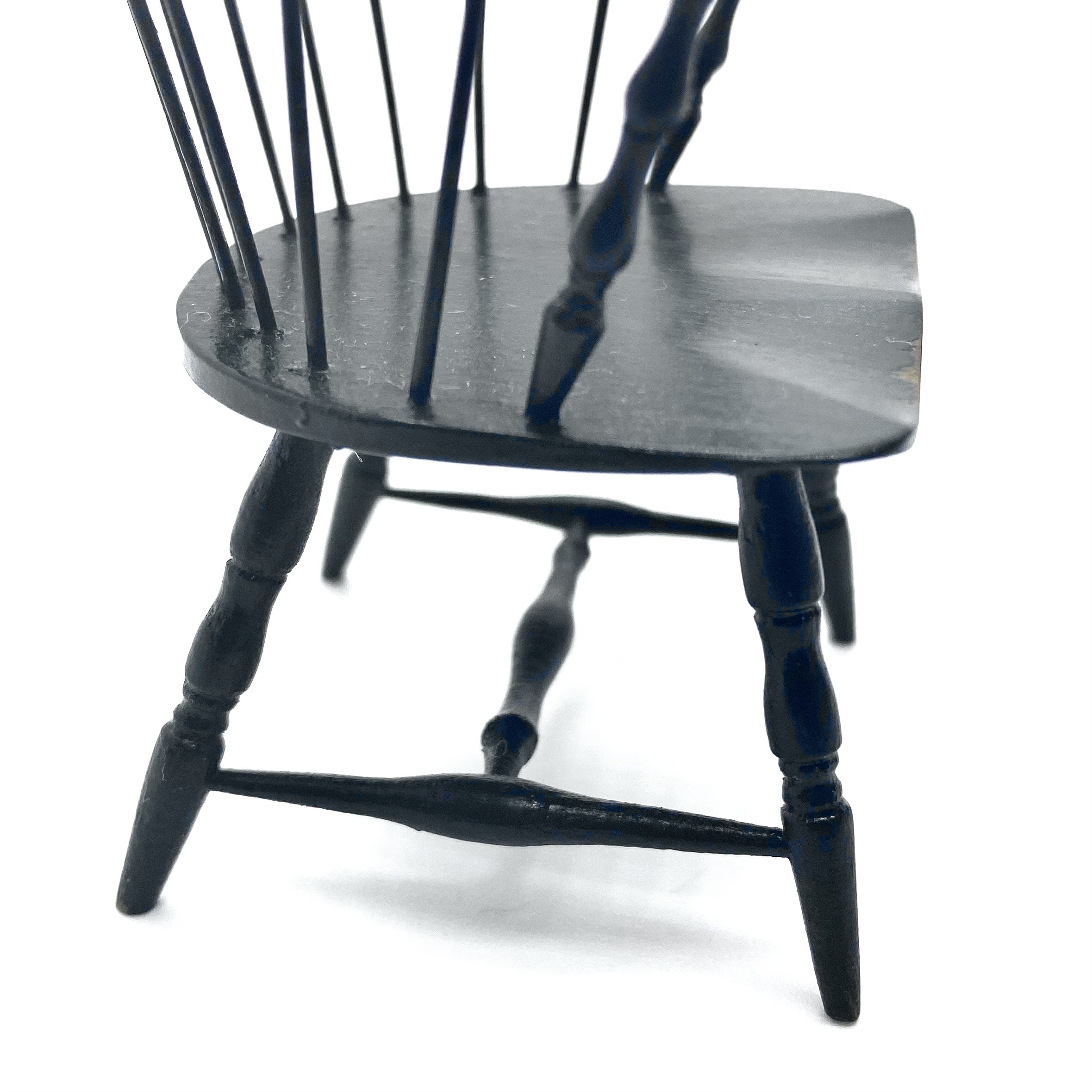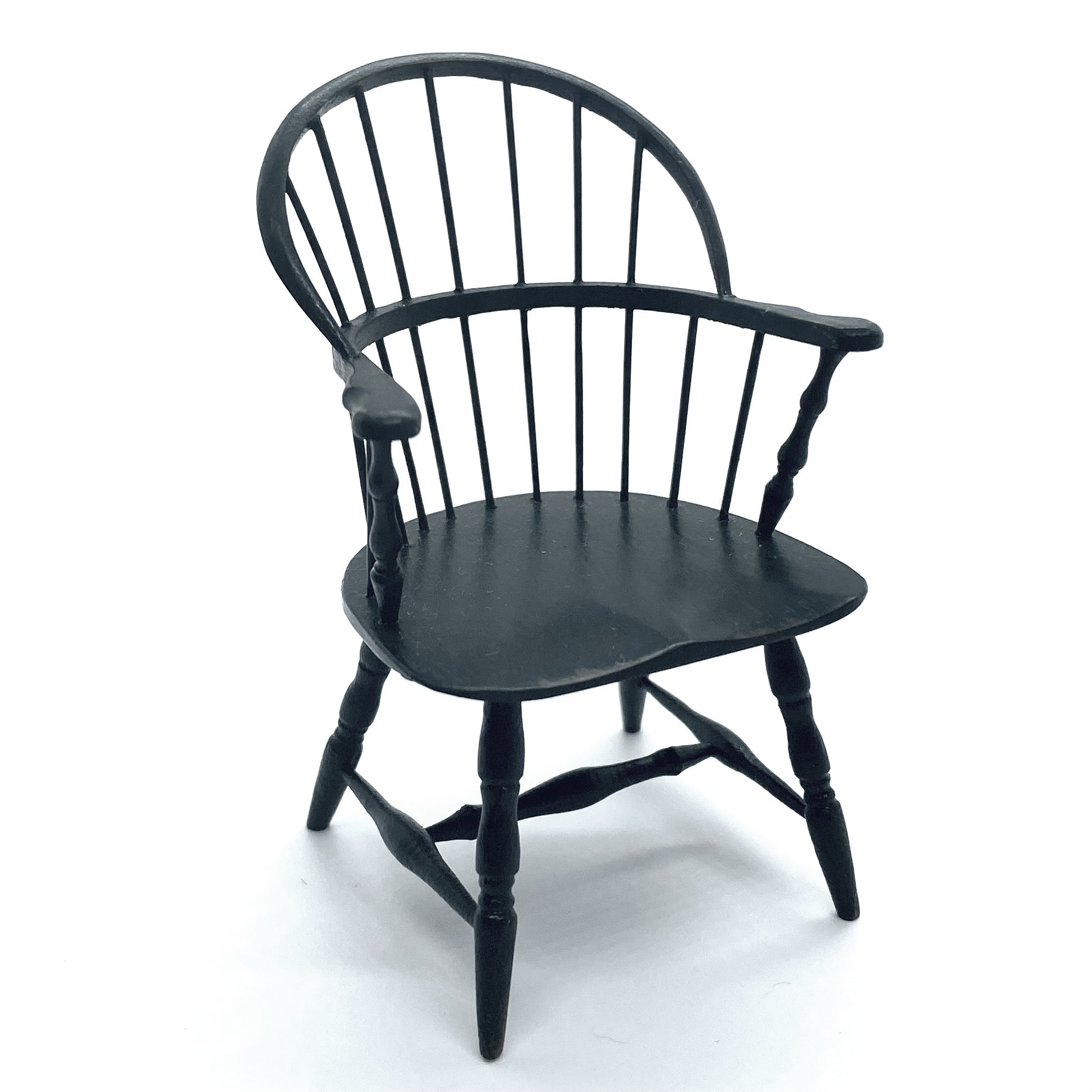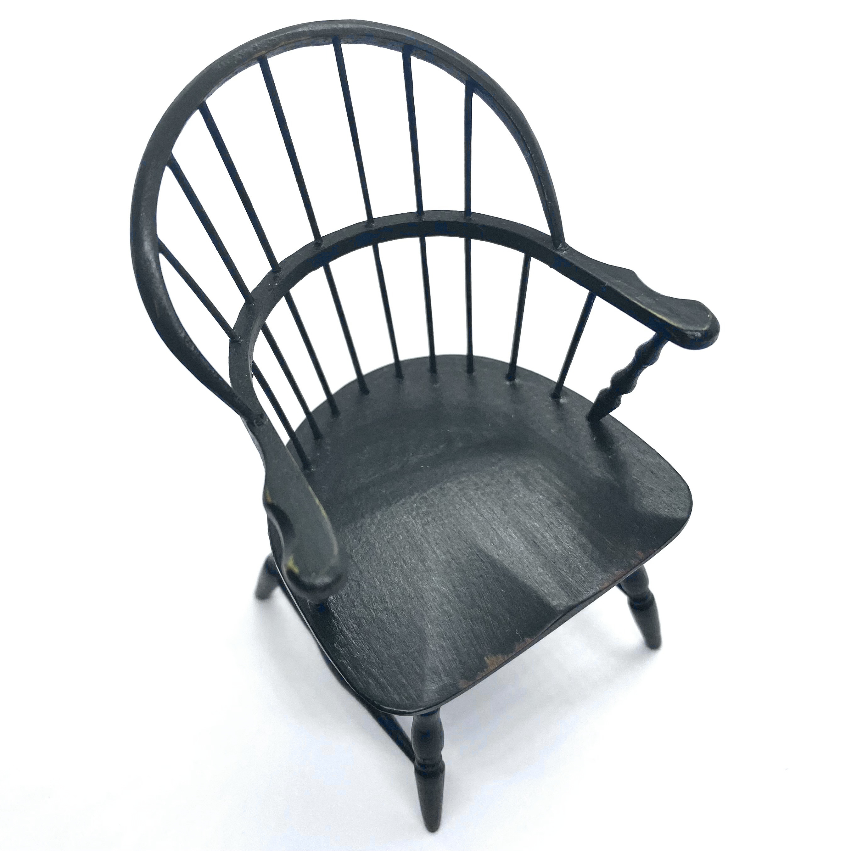 Afterwards it was painted in this dark, dark green colour – verging on black – by Susan Rountree, who signed and dated it on the bottom: ‘Painted & finished by Susan H. Rountree, AARFAC 1992’. I’ve tried looking up ‘AARFAC’ and it seems to refer to the ‘Abby Aldrich Rockefeller Folk Art Center’ in Williamsburg. This would make sense, as I’ve also found a note that Susan gave a lecture during Williamsburg’s Christmas season in 1987. And of course, a gorgeous chair like this is very much in the folk art tradition.