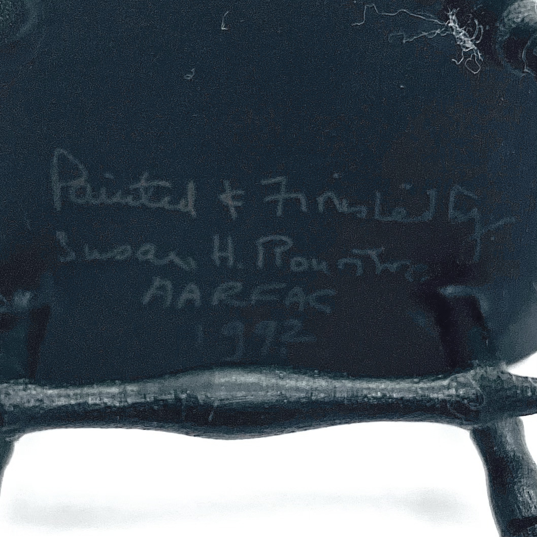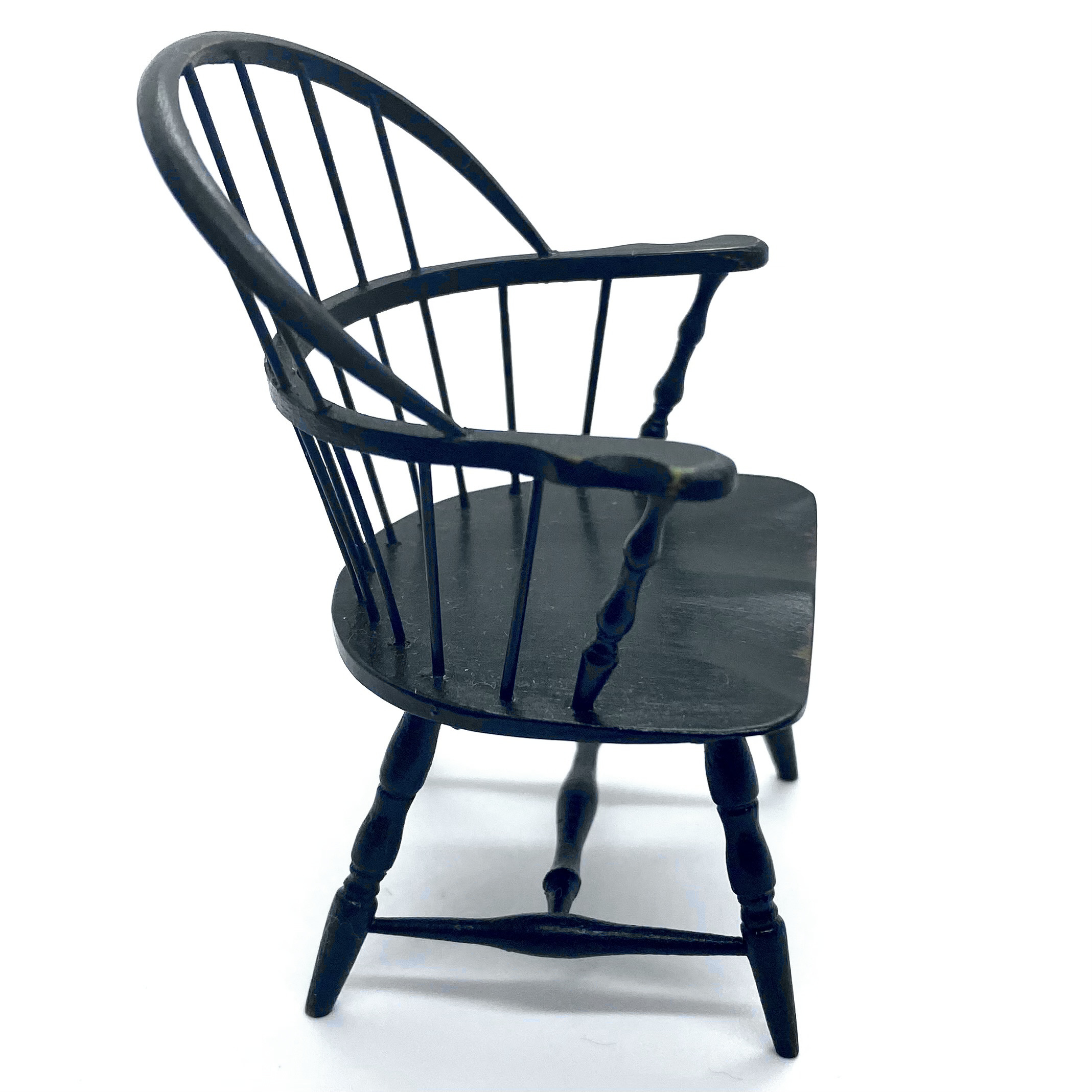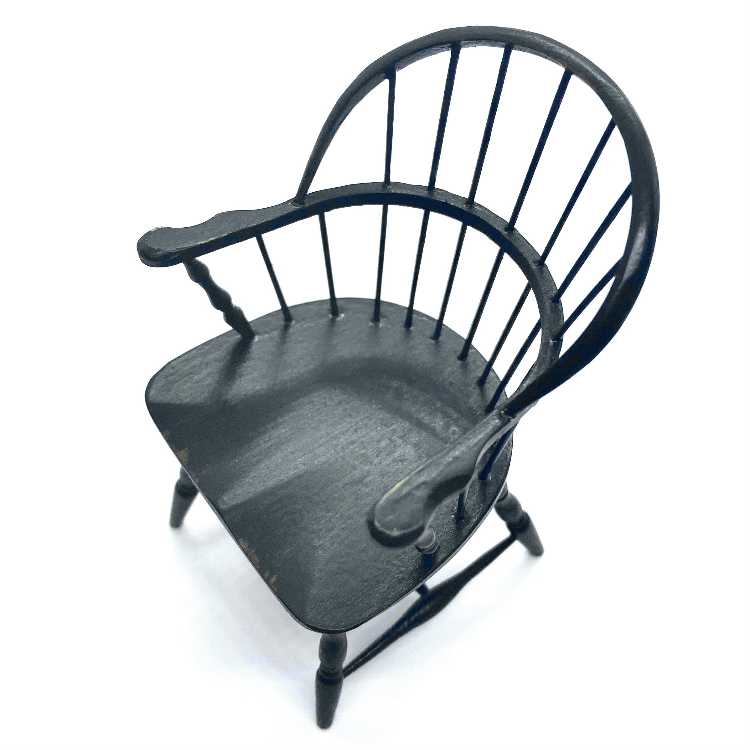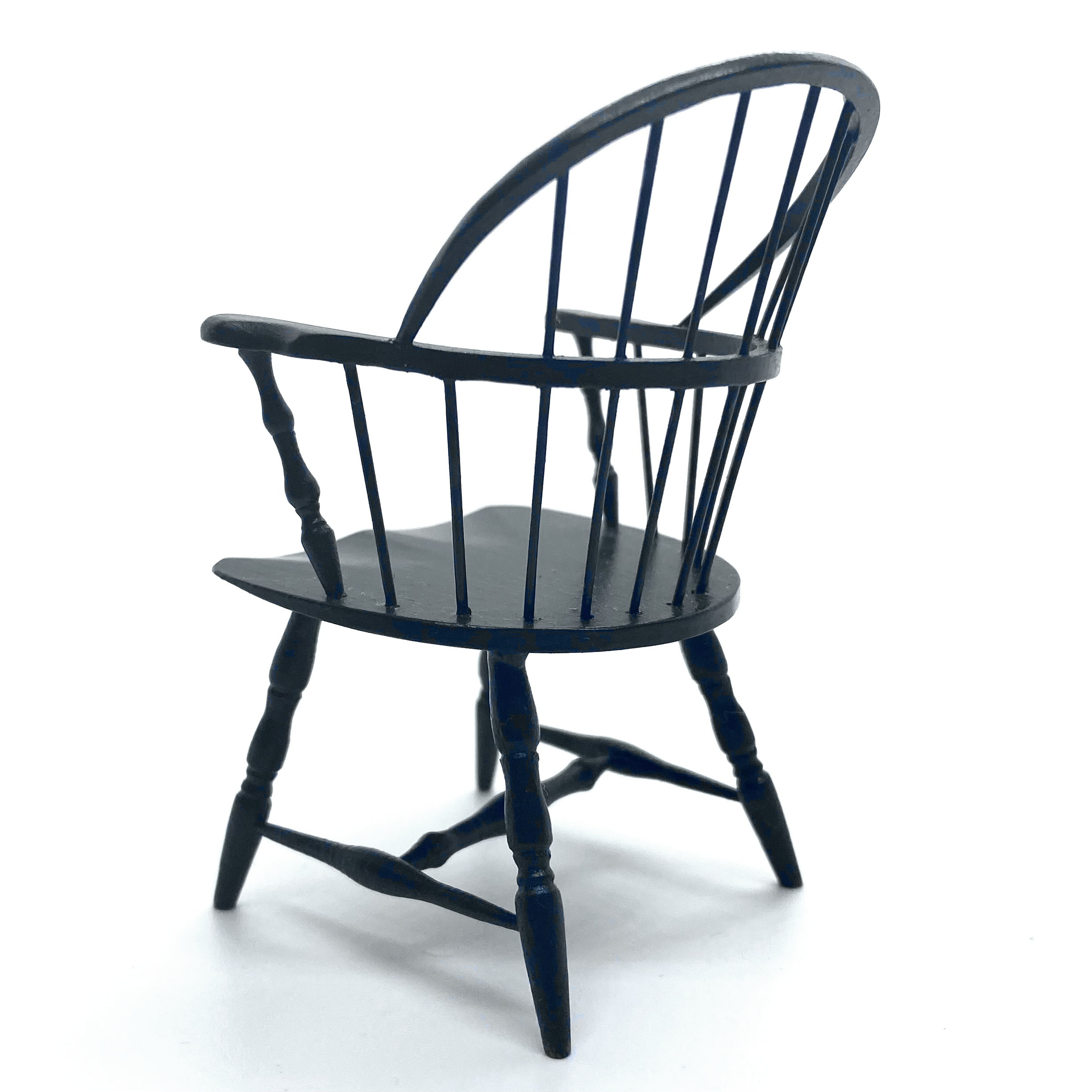 Afterwards it was painted in this dark, dark green colour – verging on black – by Susan Rountree, who signed and dated it on the bottom: ‘Painted & finished by Susan H. Rountree, AARFAC 1992’. I’ve tried looking up ‘AARFAC’ and it seems to refer to the ‘Abby Aldrich Rockefeller Folk Art Center’ in Williamsburg. This would make sense, as I’ve also found a note that Susan gave a lecture during Williamsburg’s Christmas season in 1987. And of course, a gorgeous chair like this is very much in the folk art tradition.