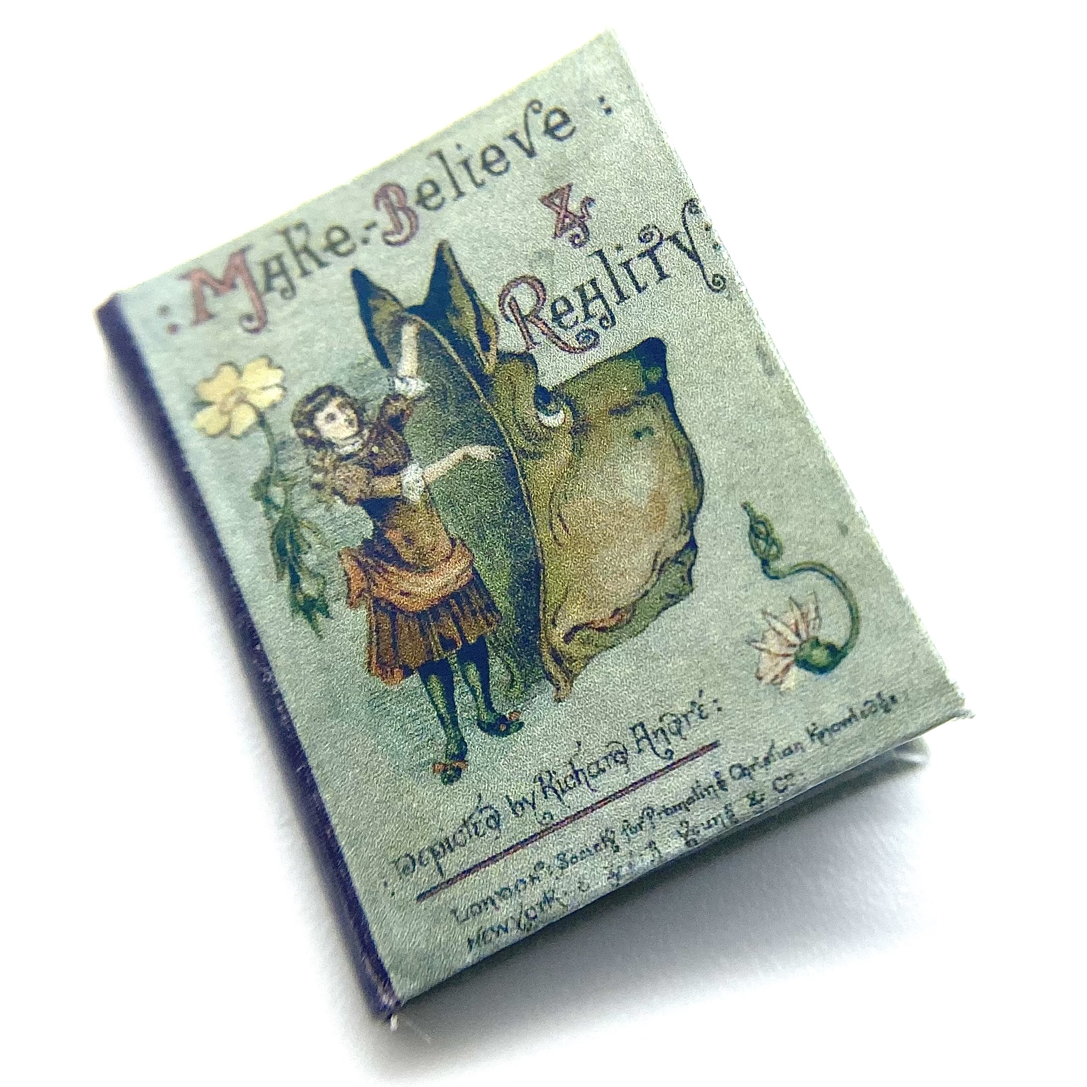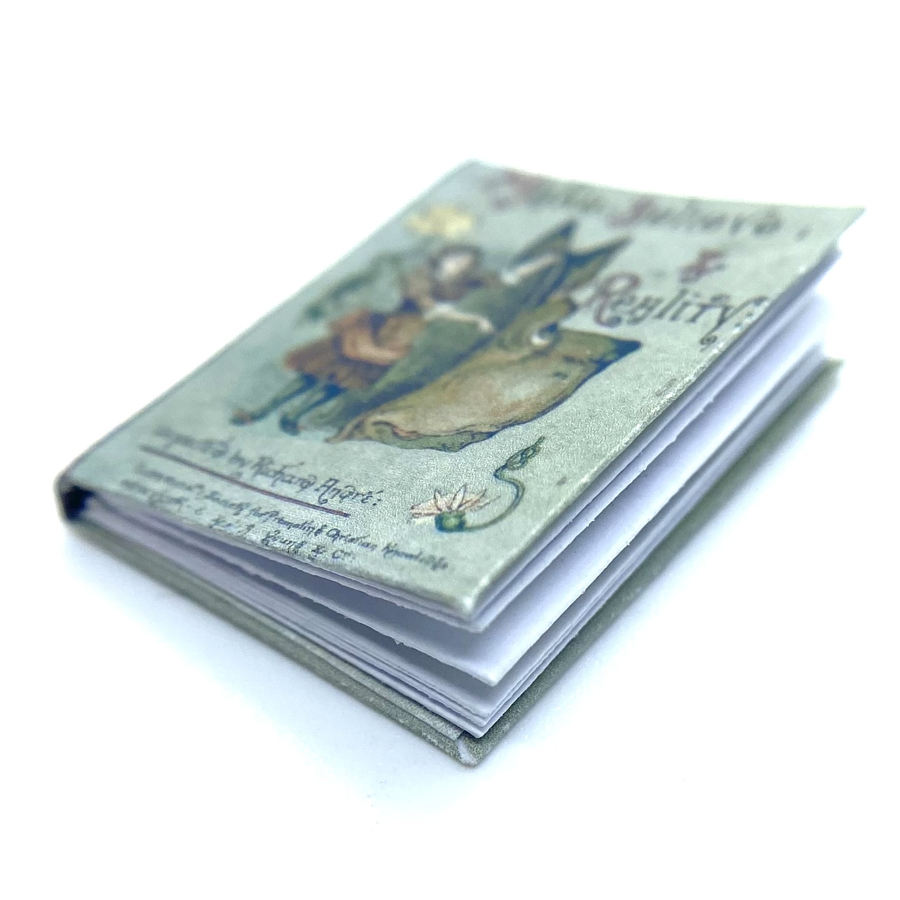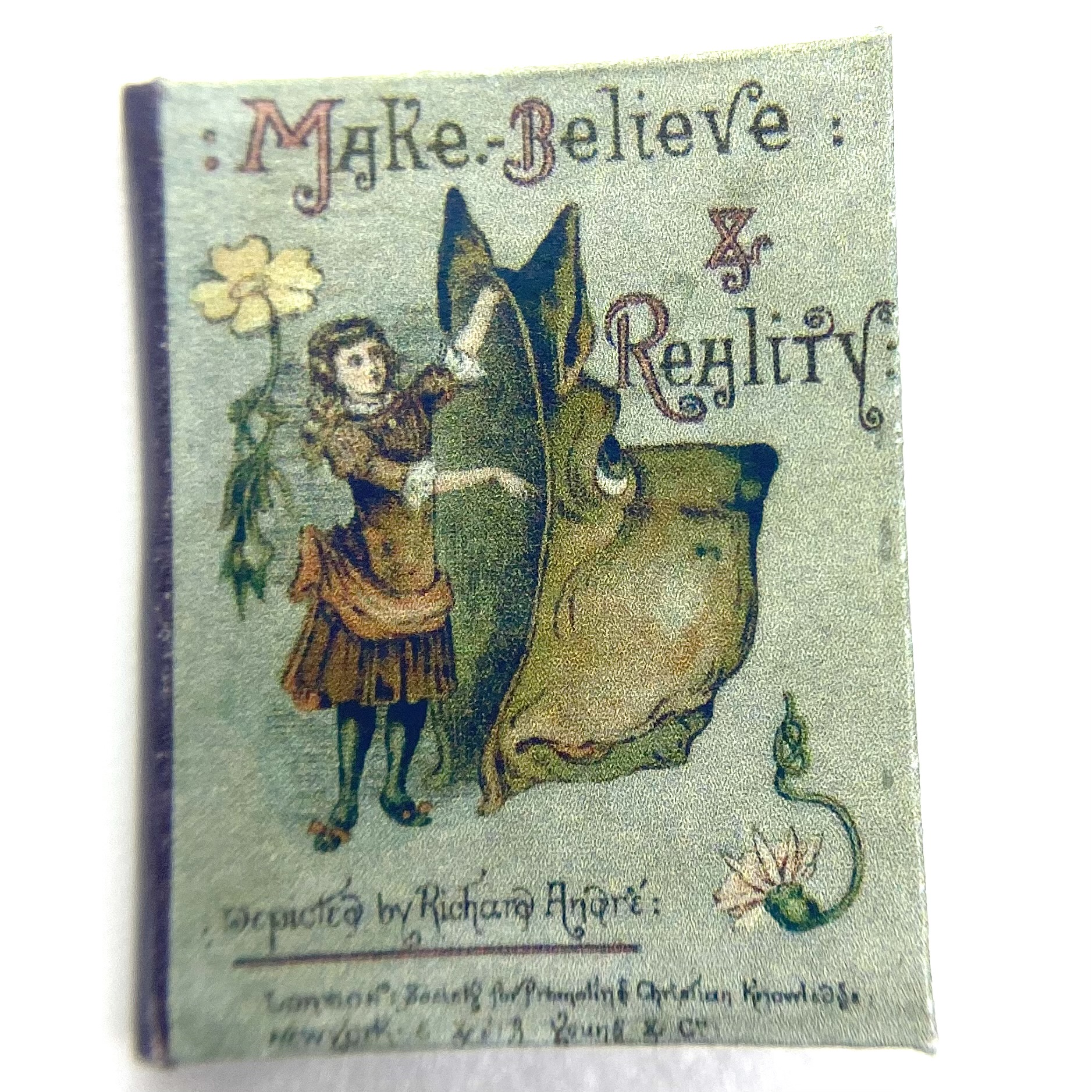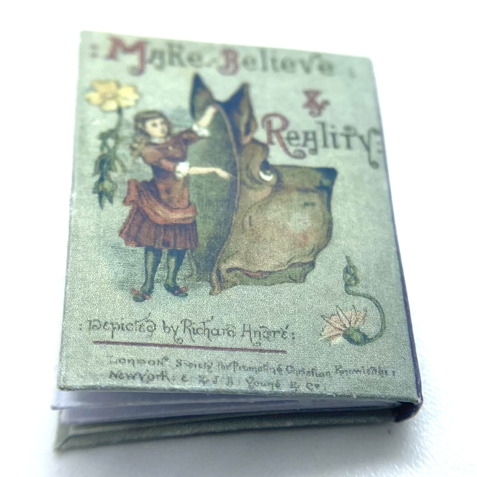 The original book was published in 1884, in London by the Society for Promoting Christian Knowledge, and in New York by E. & J.B. Young & Co. The author and illustrator was ‘Richard André’, the pseudonym adopted by London-born William Roger Snow (1834-1907). Having had a somewhat colourful life, which involved frittering away a sizeable inheritance, infidelity, and abandoning his wife, Snow ended up changing his name twice to avoid scandal. It was as André that he developed a successful career as a children’s illustrator, often in collaboration with Juliana Horatia Ewing (1841-1885) – although the verses in the present book don’t seem to be hers. This miniature replica includes a facsimile of the charming dedication inside the front flyleaf: ‘Katie. March 25th 1887. With much love from Gertie and Minnie.’