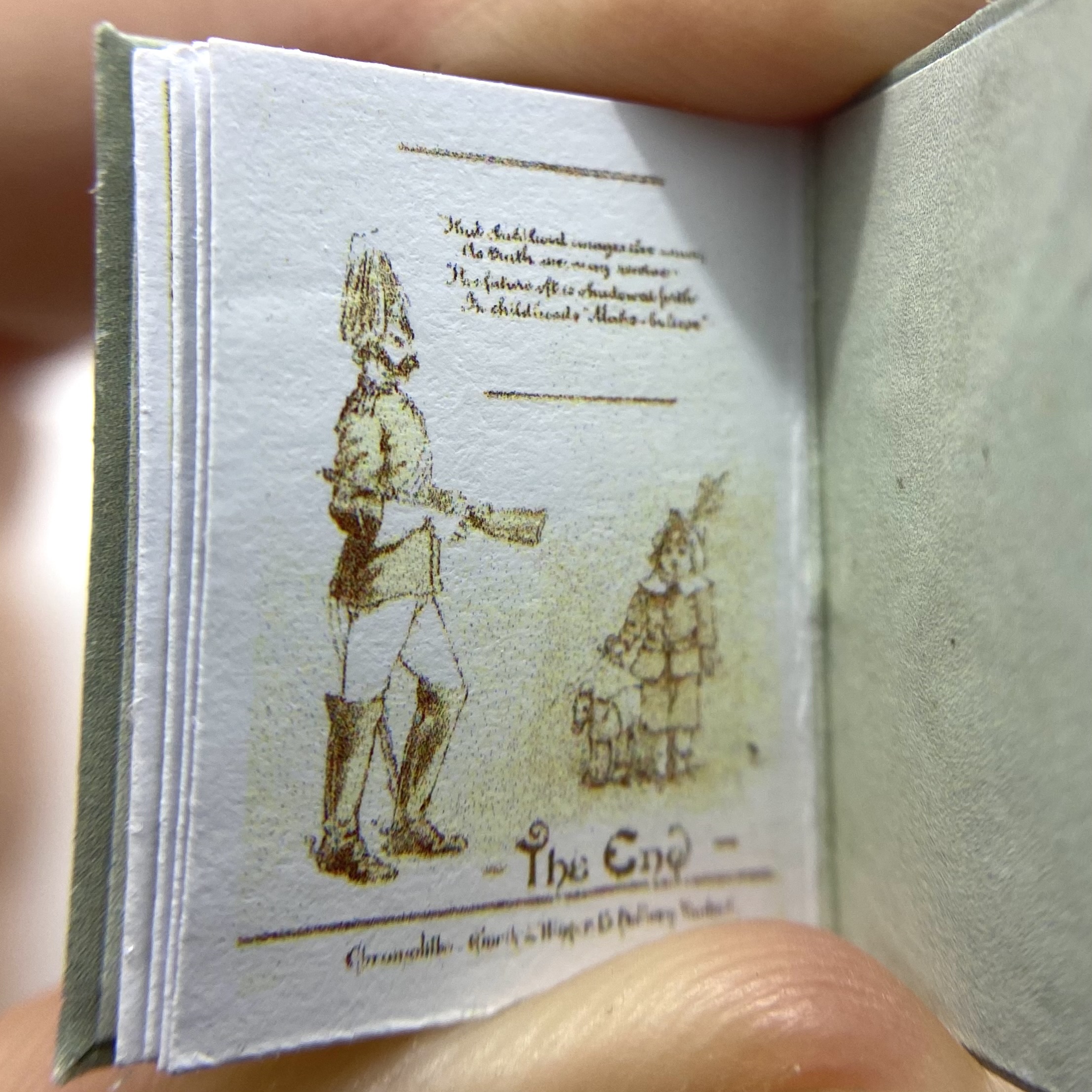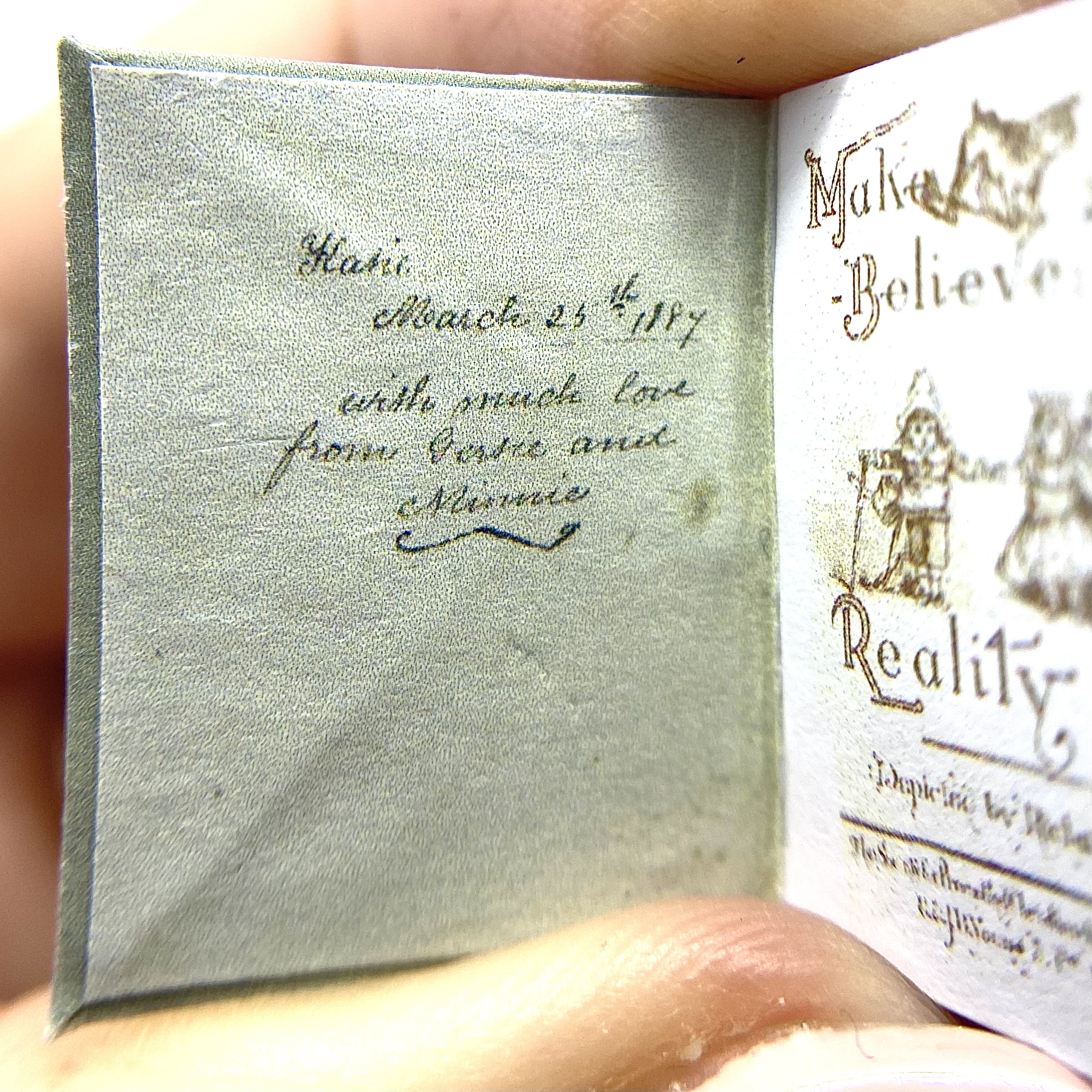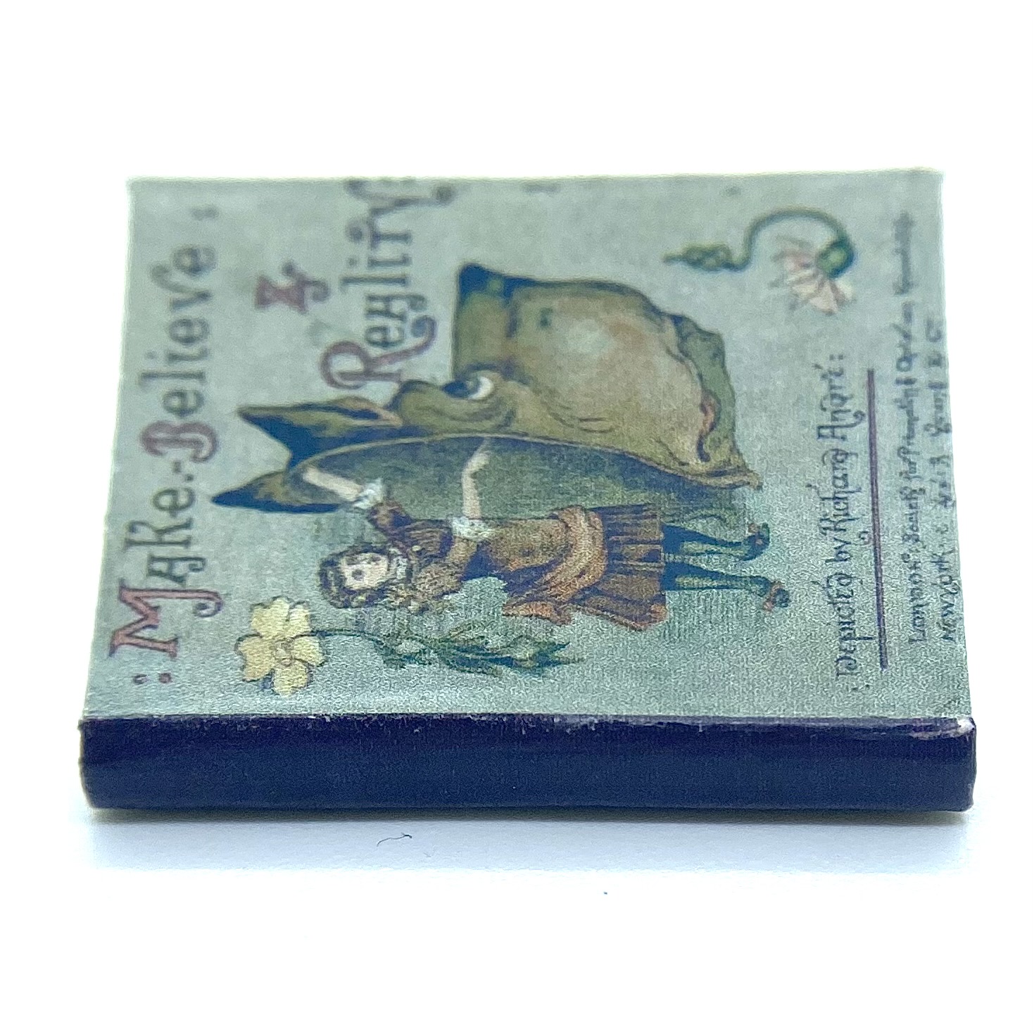The original book was published in 1884, in London by the Society for Promoting Christian Knowledge, and in New York by E. & J.B. Young & Co. The author and illustrator was ‘Richard André’, the pseudonym adopted by London-born William Roger Snow (1834-1907). Having had a somewhat colourful life, which involved frittering away a sizeable inheritance, infidelity, and abandoning his wife, Snow ended up changing his name twice to avoid scandal. It was as André that he developed a successful career as a children’s illustrator, often in collaboration with Juliana Horatia Ewing (1841-1885) – although the verses in the present book don’t seem to be hers. This miniature replica includes a facsimile of the charming dedication inside the front flyleaf: ‘Katie. March 25th 1887. With much love from Gertie and Minnie.’