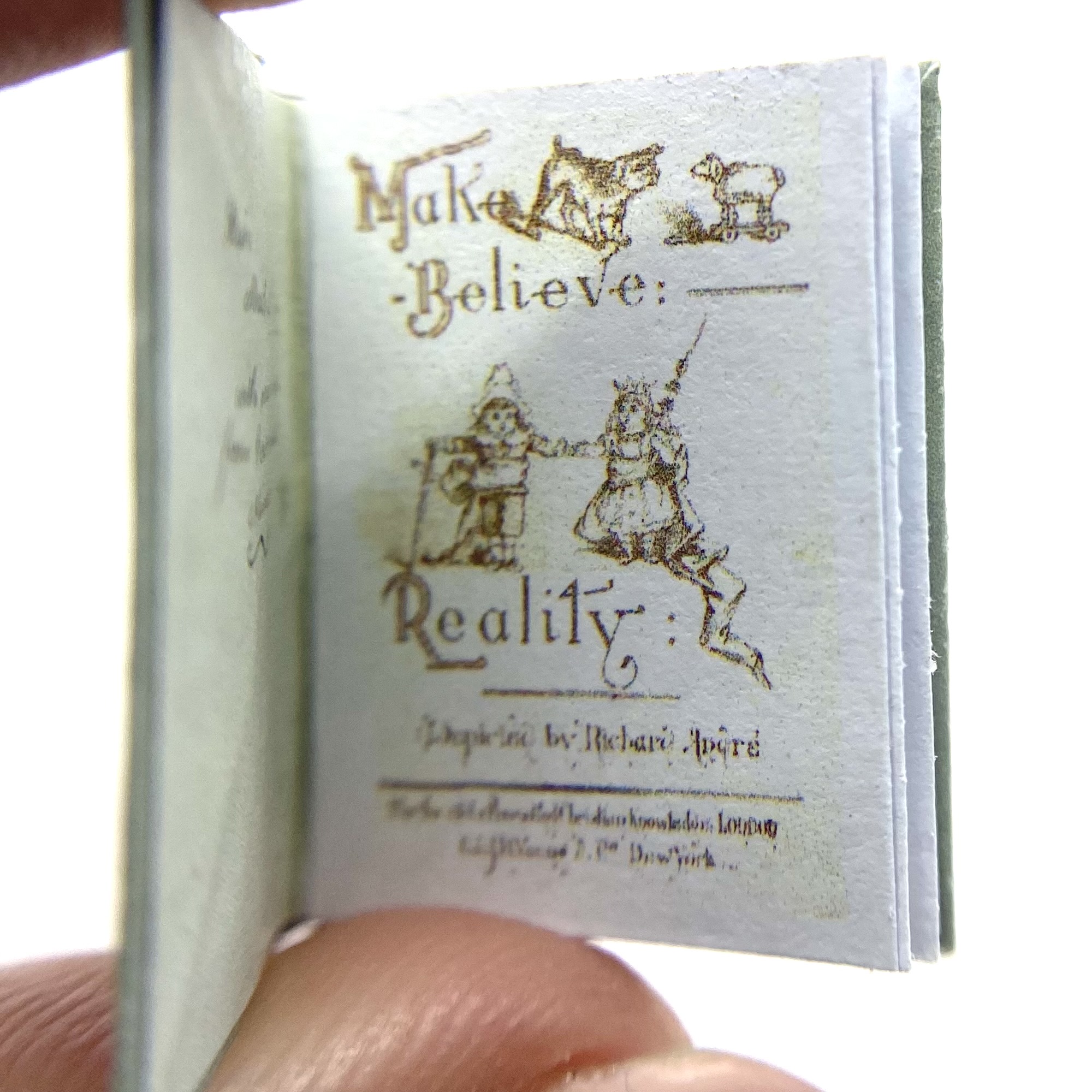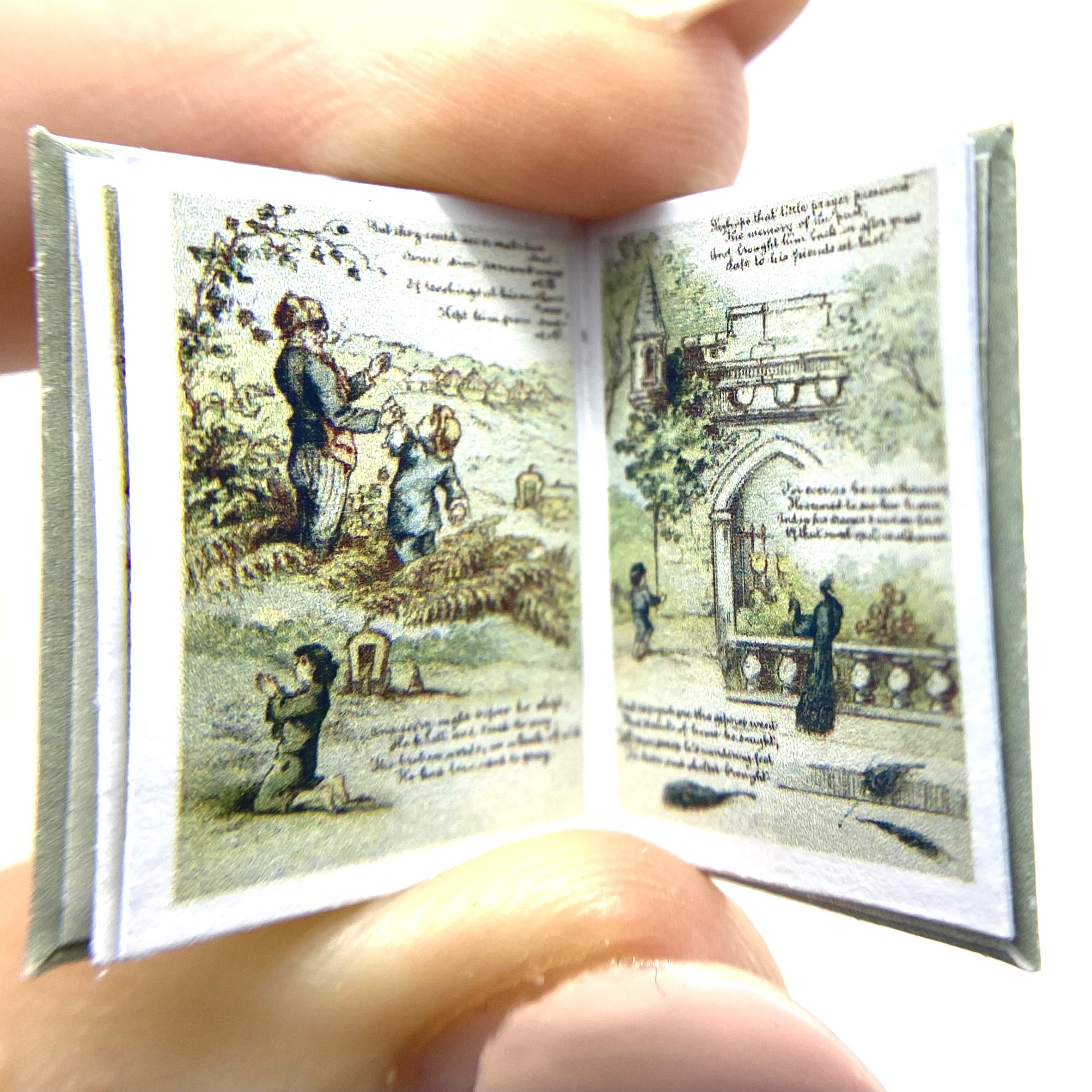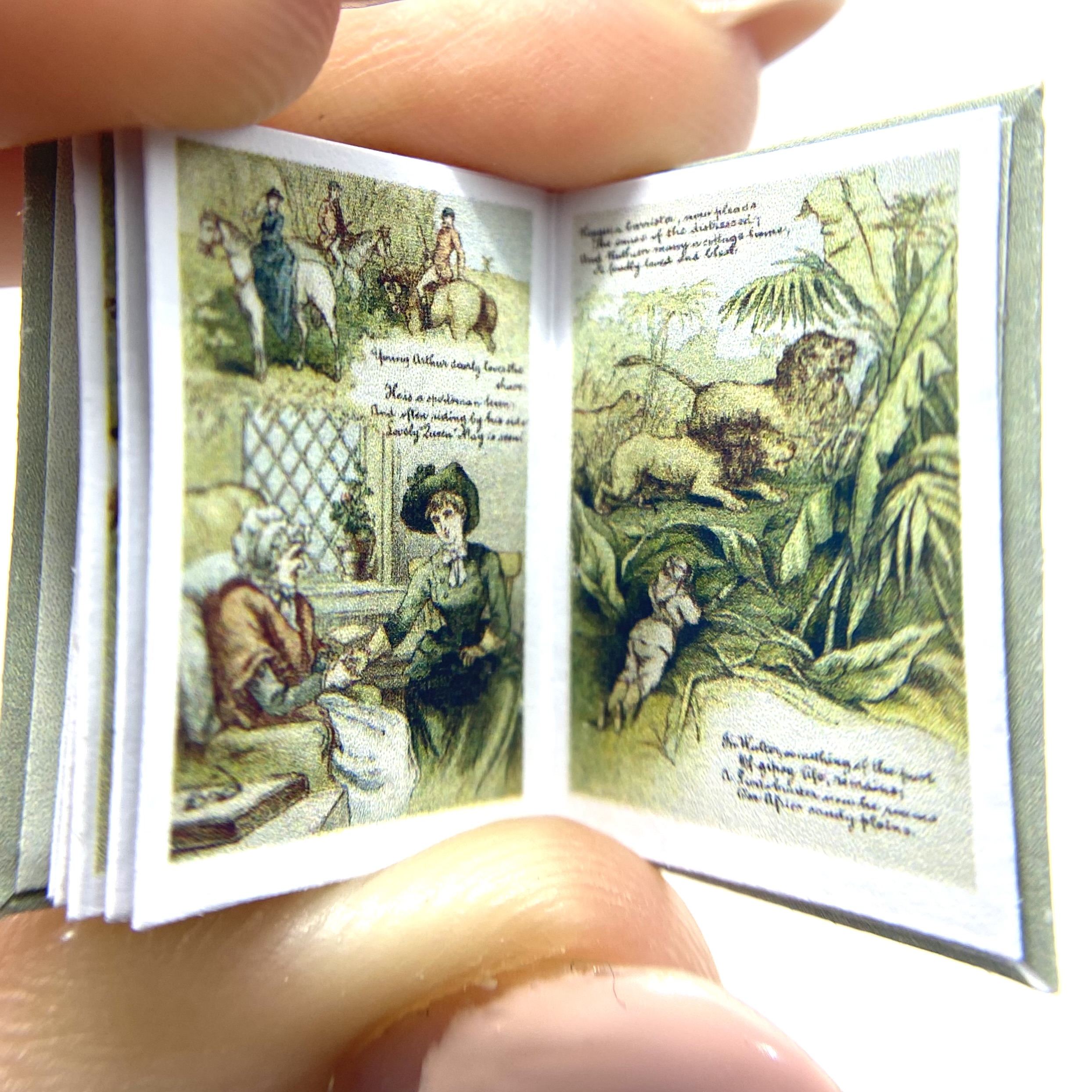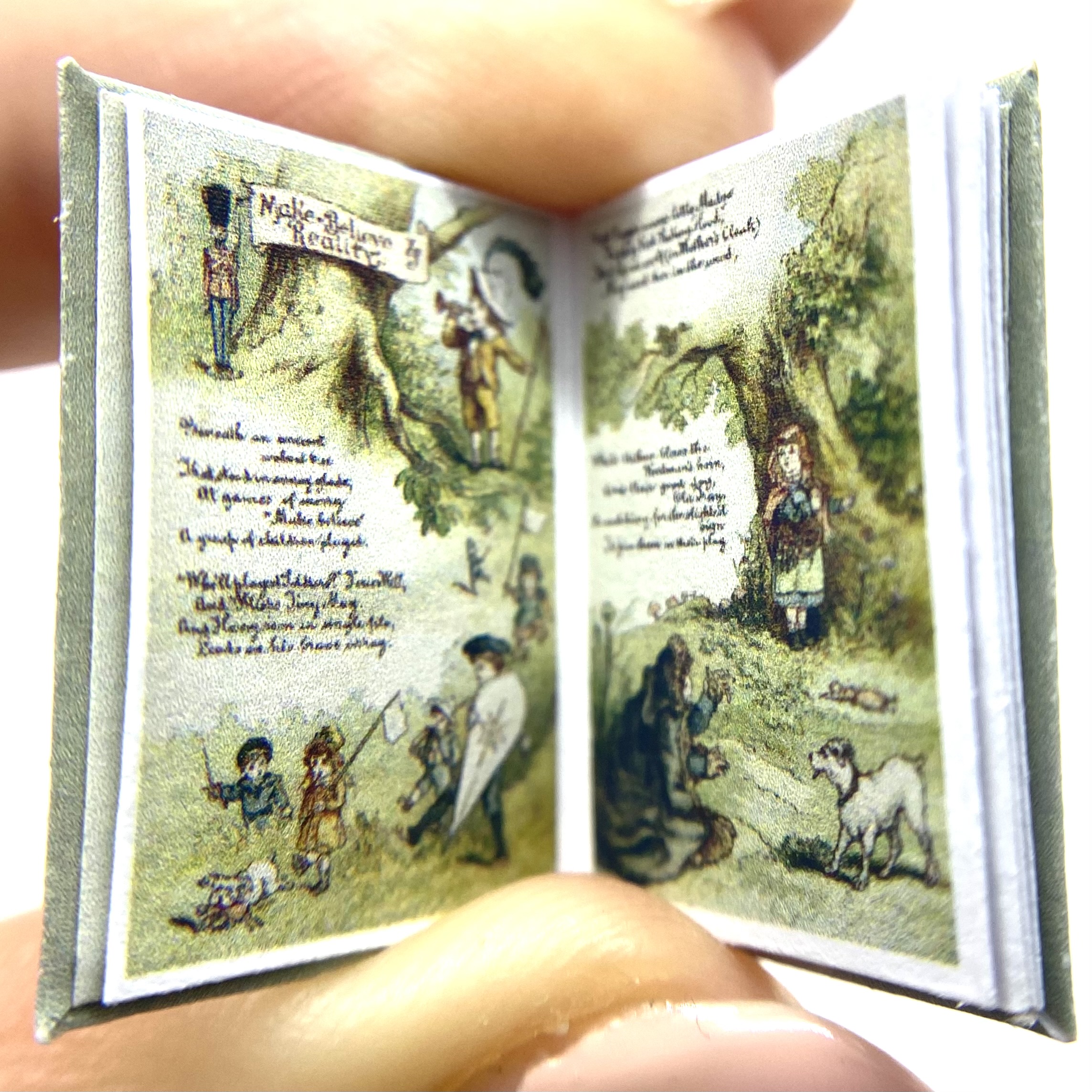 The original book was published in 1884, in London by the Society for Promoting Christian Knowledge, and in New York by E. & J.B. Young & Co. The author and illustrator was ‘Richard André’, the pseudonym adopted by London-born William Roger Snow (1834-1907). Having had a somewhat colourful life, which involved frittering away a sizeable inheritance, infidelity, and abandoning his wife, Snow ended up changing his name twice to avoid scandal. It was as André that he developed a successful career as a children’s illustrator, often in collaboration with Juliana Horatia Ewing (1841-1885) – although the verses in the present book don’t seem to be hers. This miniature replica includes a facsimile of the charming dedication inside the front flyleaf: ‘Katie. March 25th 1887. With much love from Gertie and Minnie.’
