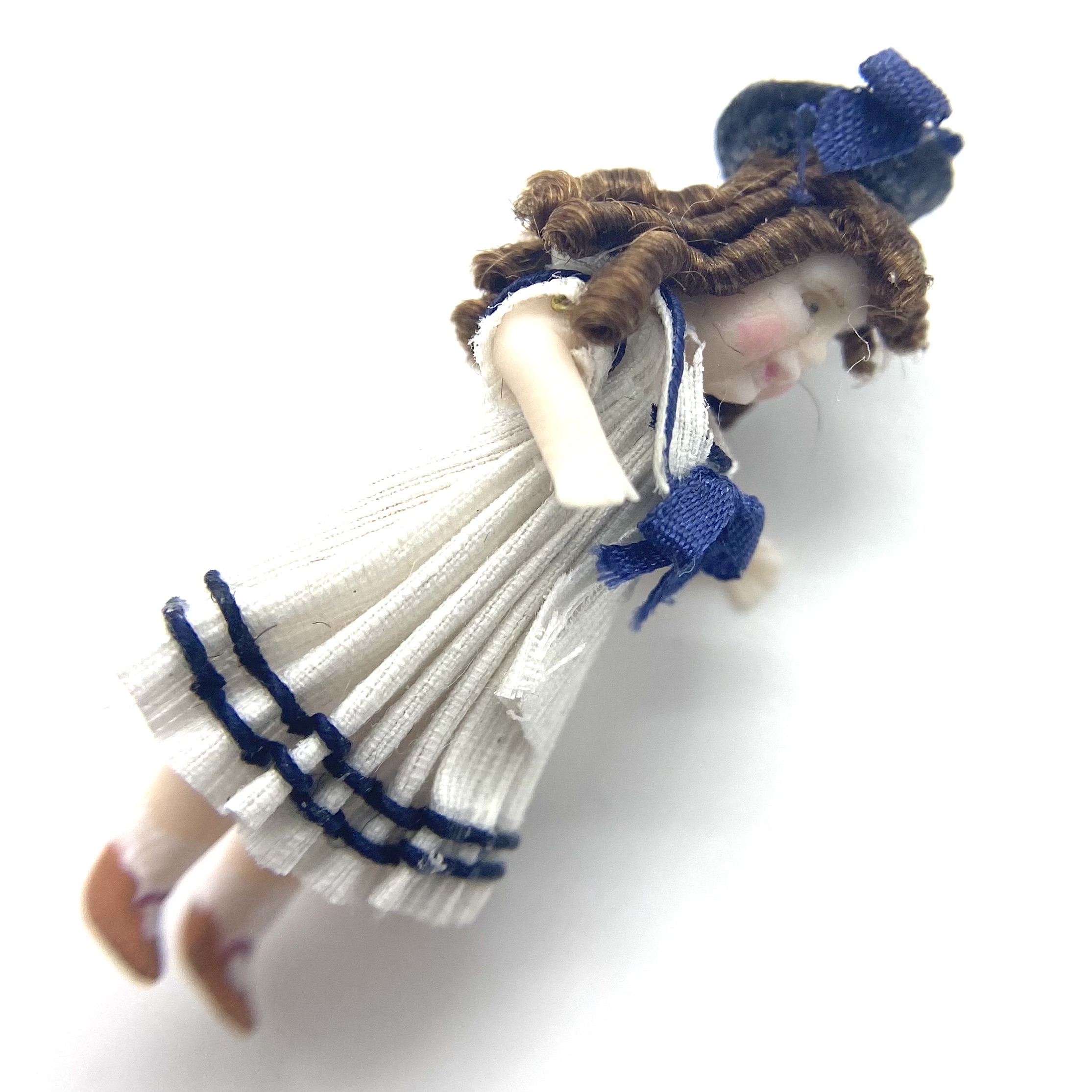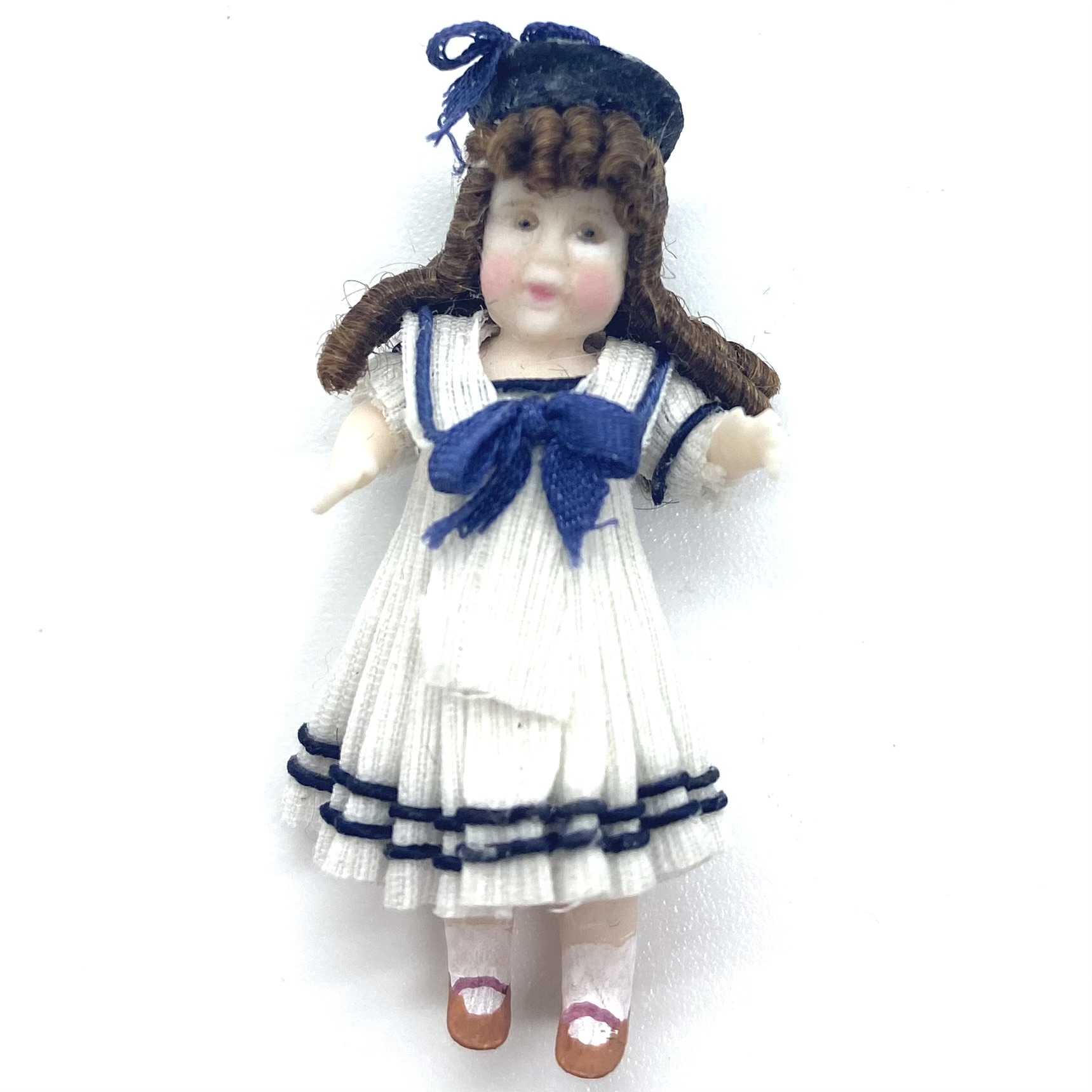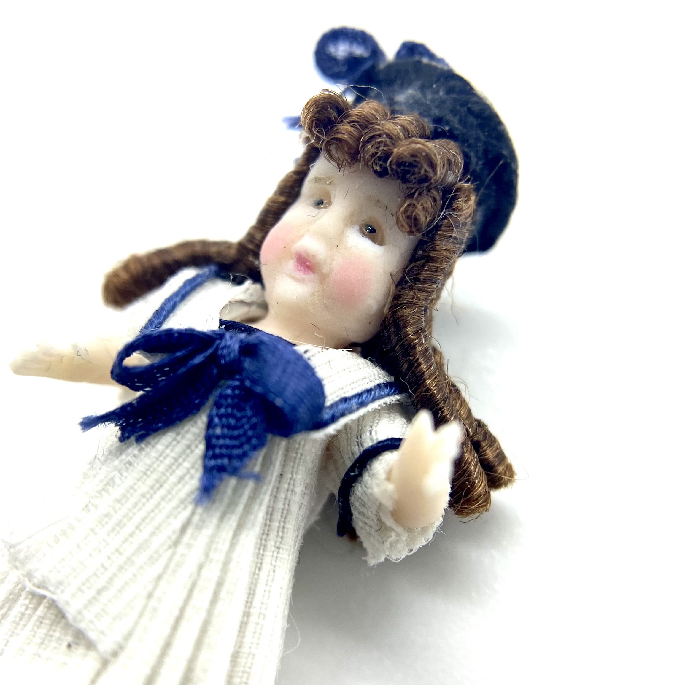 On her stand at Kensington Dolls House Festival in May 2022, Victoria Heredia Guerbós had a splendid collection of her characteristic miniature dolls’ dolls. Featuring in several different sizes, they also encompassed a delightful range of costumes, from the classic late Victorian sailor suit to costumes from the Pacific, Asia and Africa. I knew exactly what I was after, though: a sailor-suit doll to add to our Nursery. Naturally, I ended up buying two: Aliette, seen here, and her little brother Pierre.