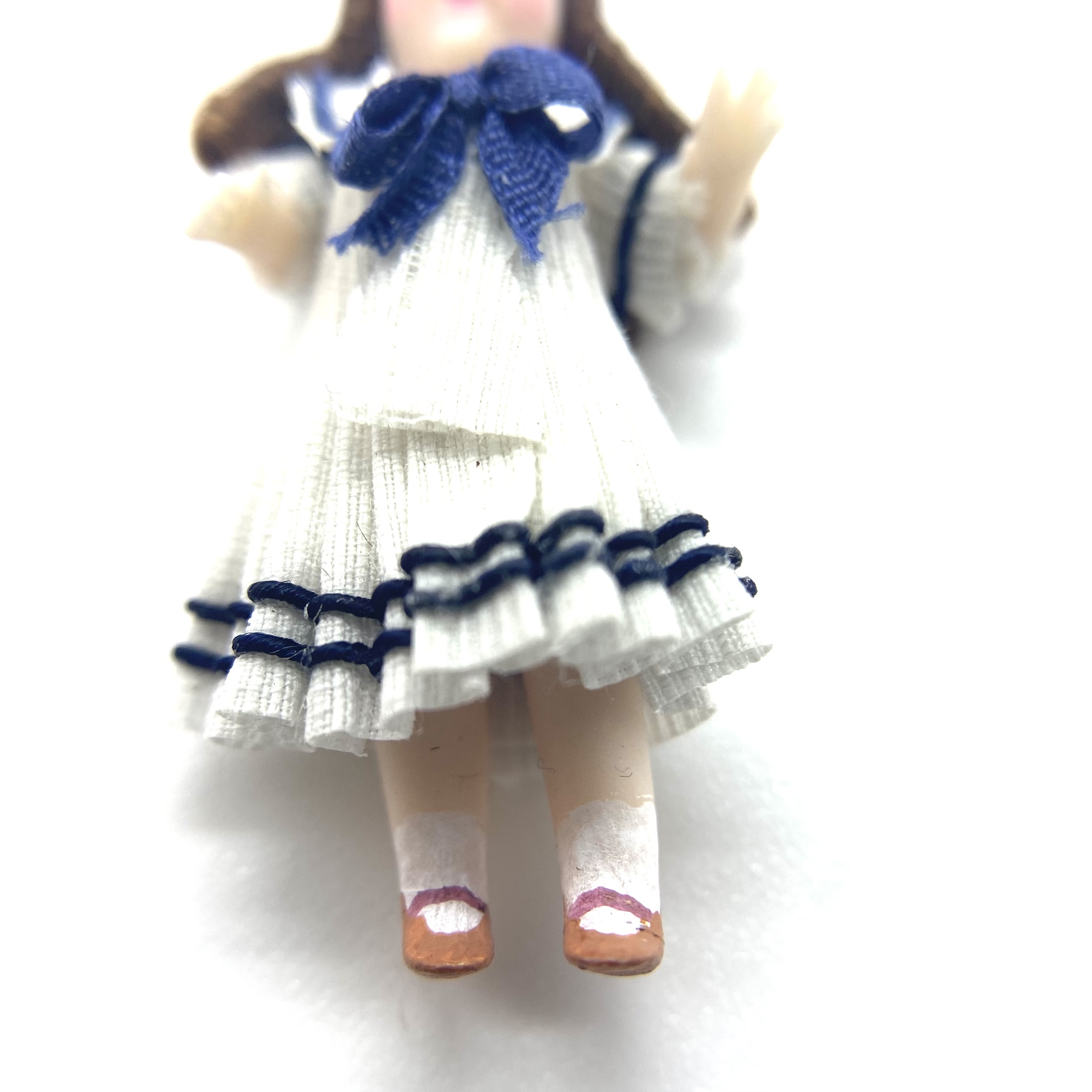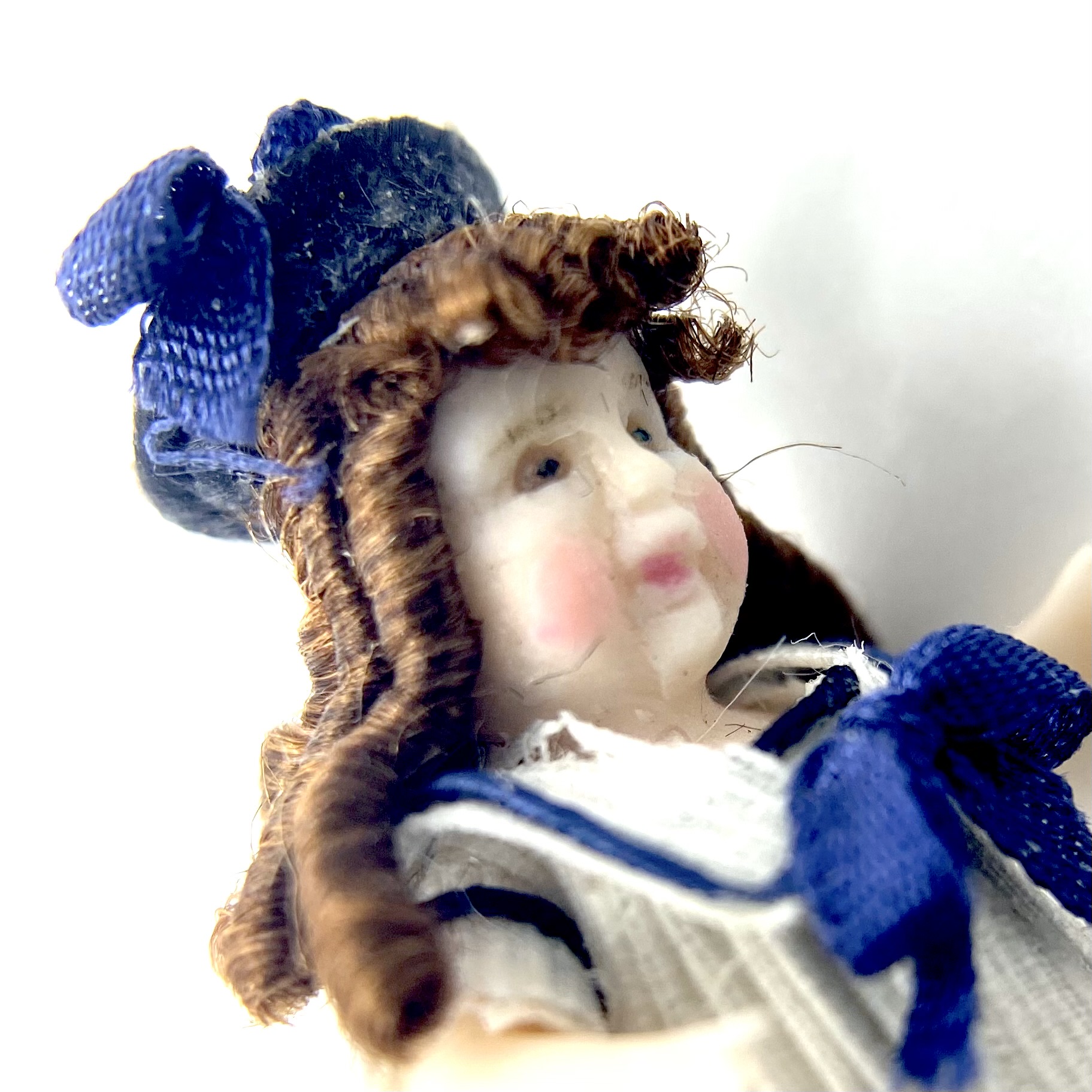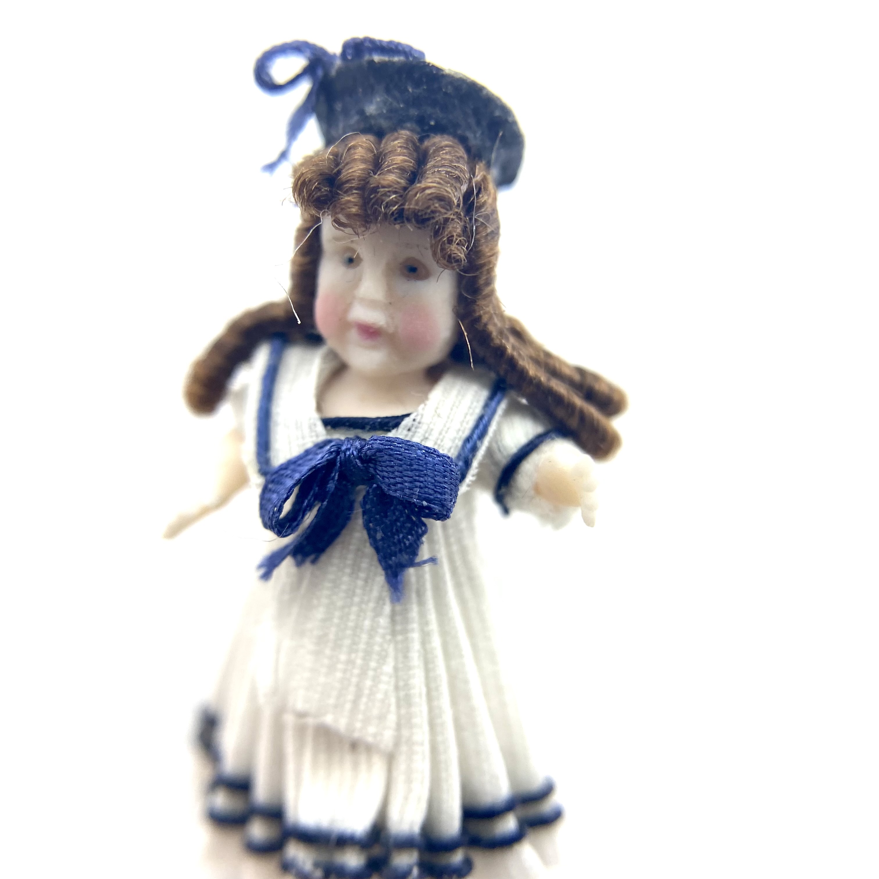 On her stand at Kensington Dolls House Festival in May 2022, Victoria Heredia Guerbós had a splendid collection of her characteristic miniature dolls’ dolls. Featuring in several different sizes, they also encompassed a delightful range of costumes, from the classic late Victorian sailor suit to costumes from the Pacific, Asia and Africa. I knew exactly what I was after, though: a sailor-suit doll to add to our Nursery. Naturally, I ended up buying two: Aliette, seen here, and her little brother Pierre.