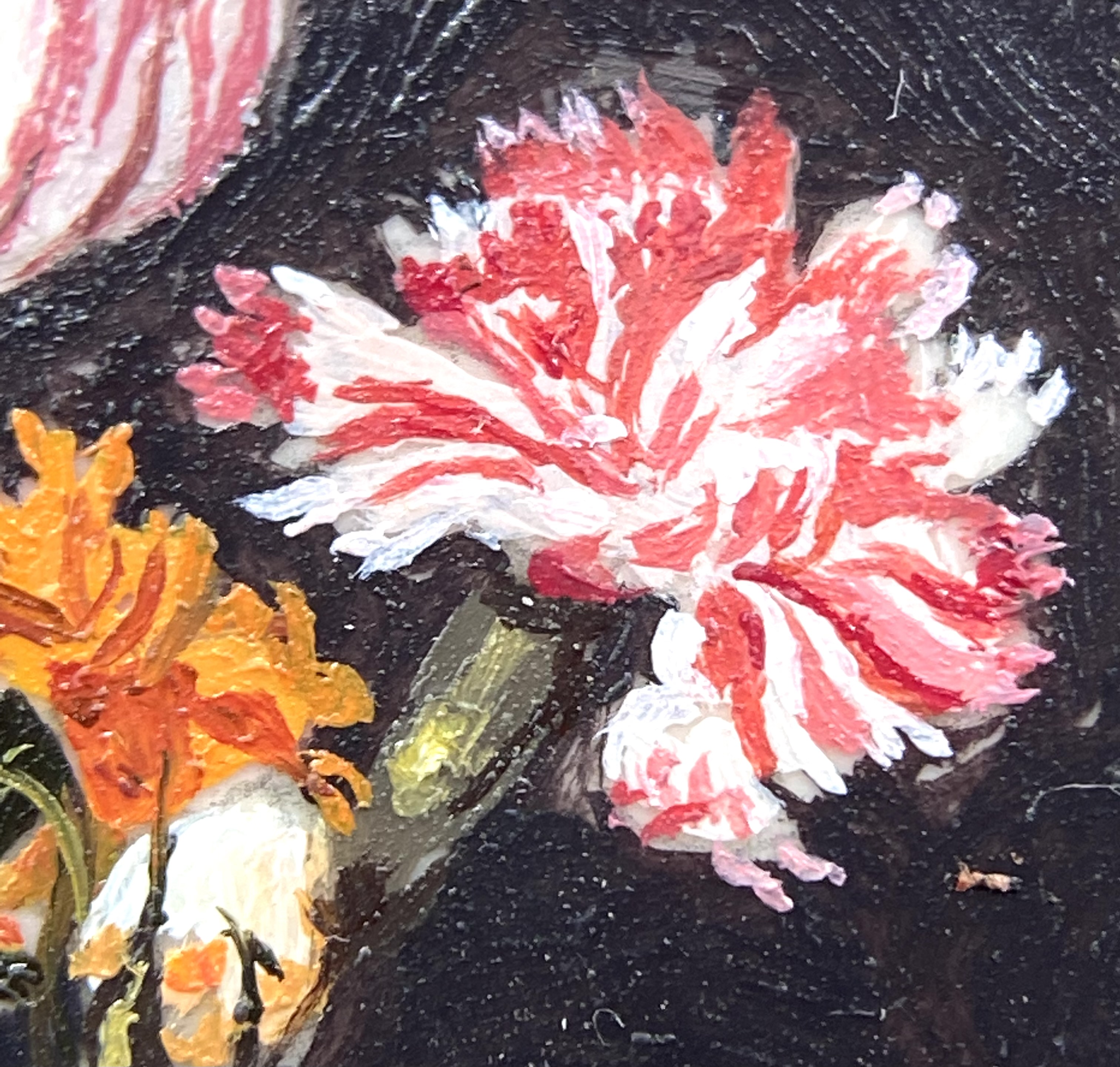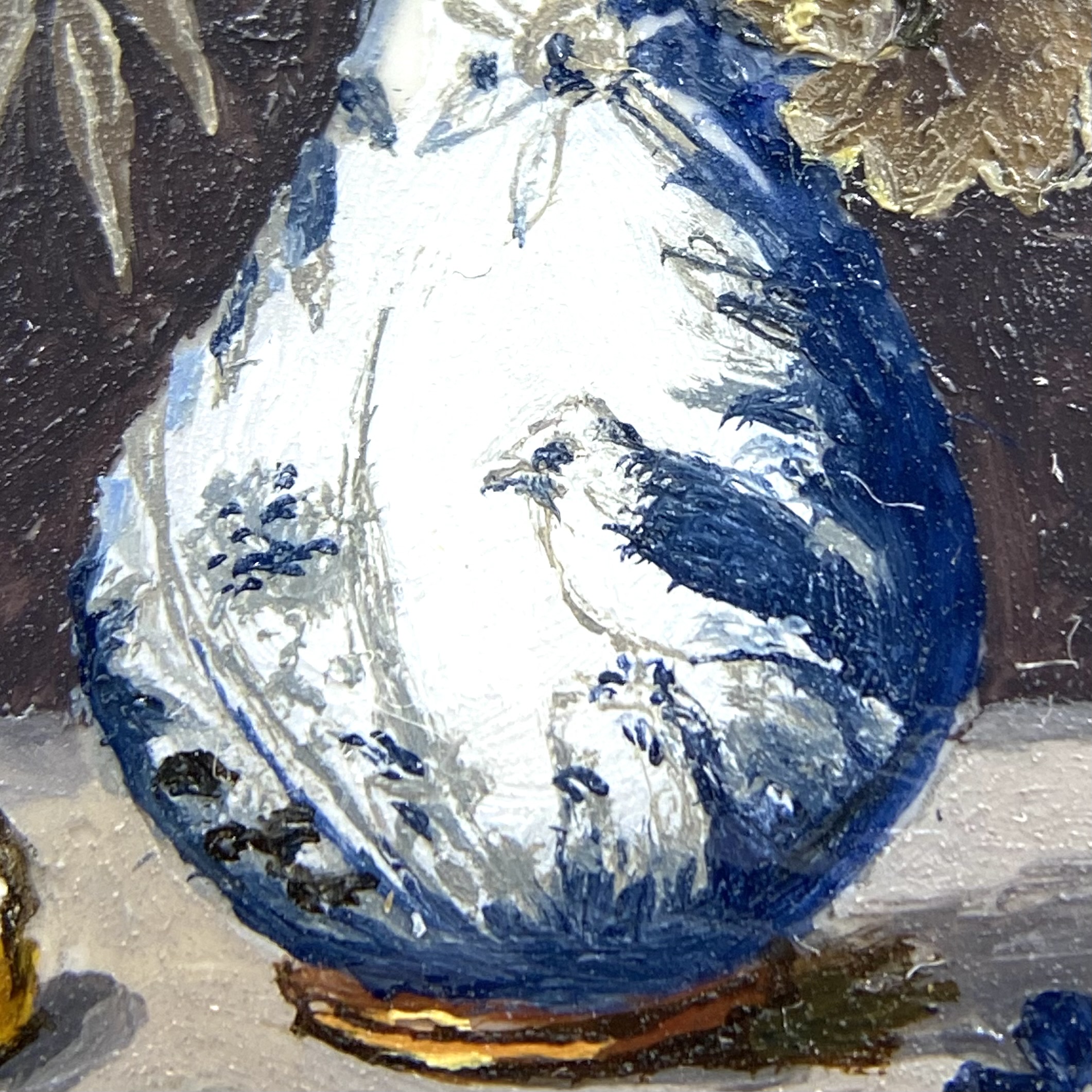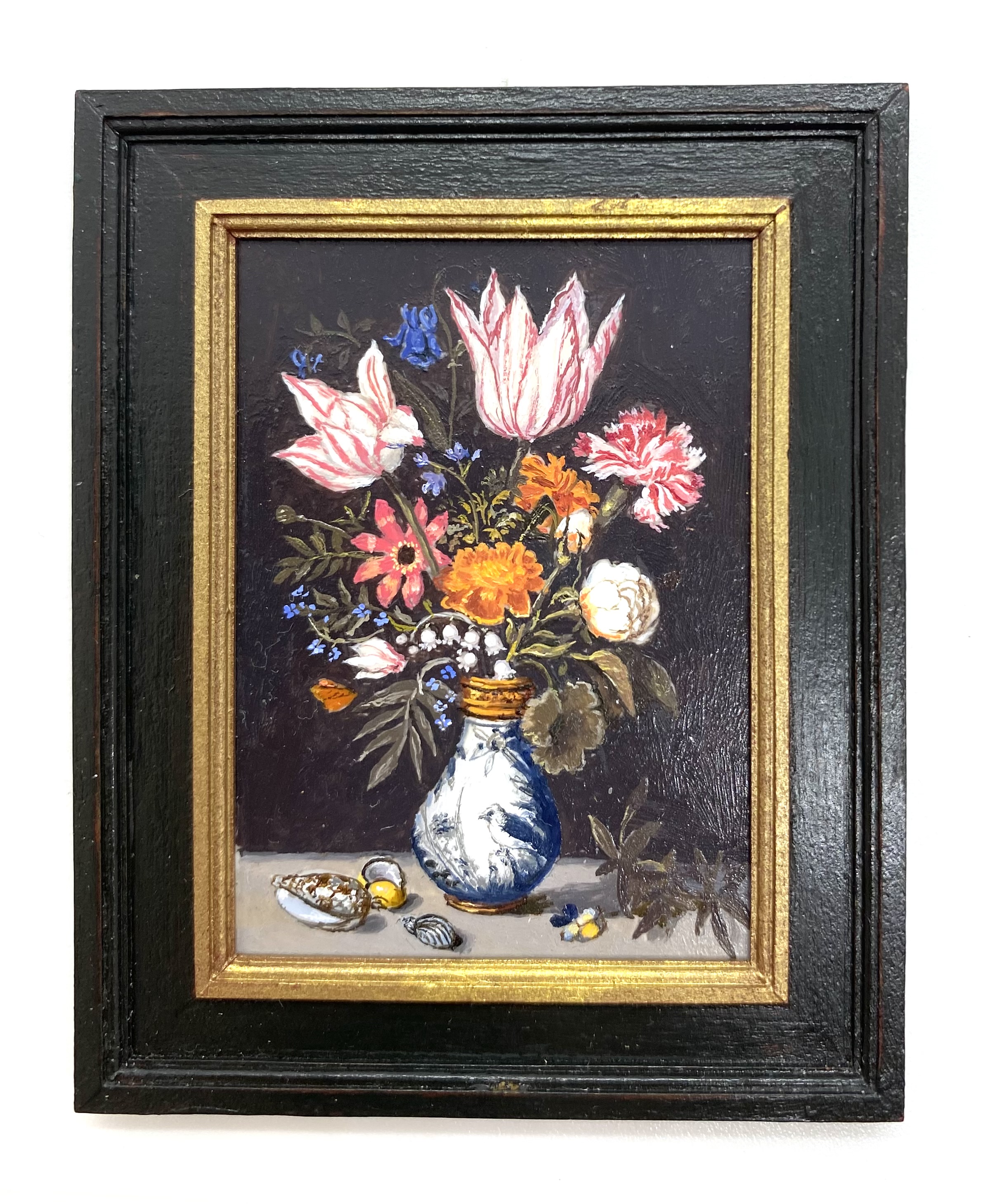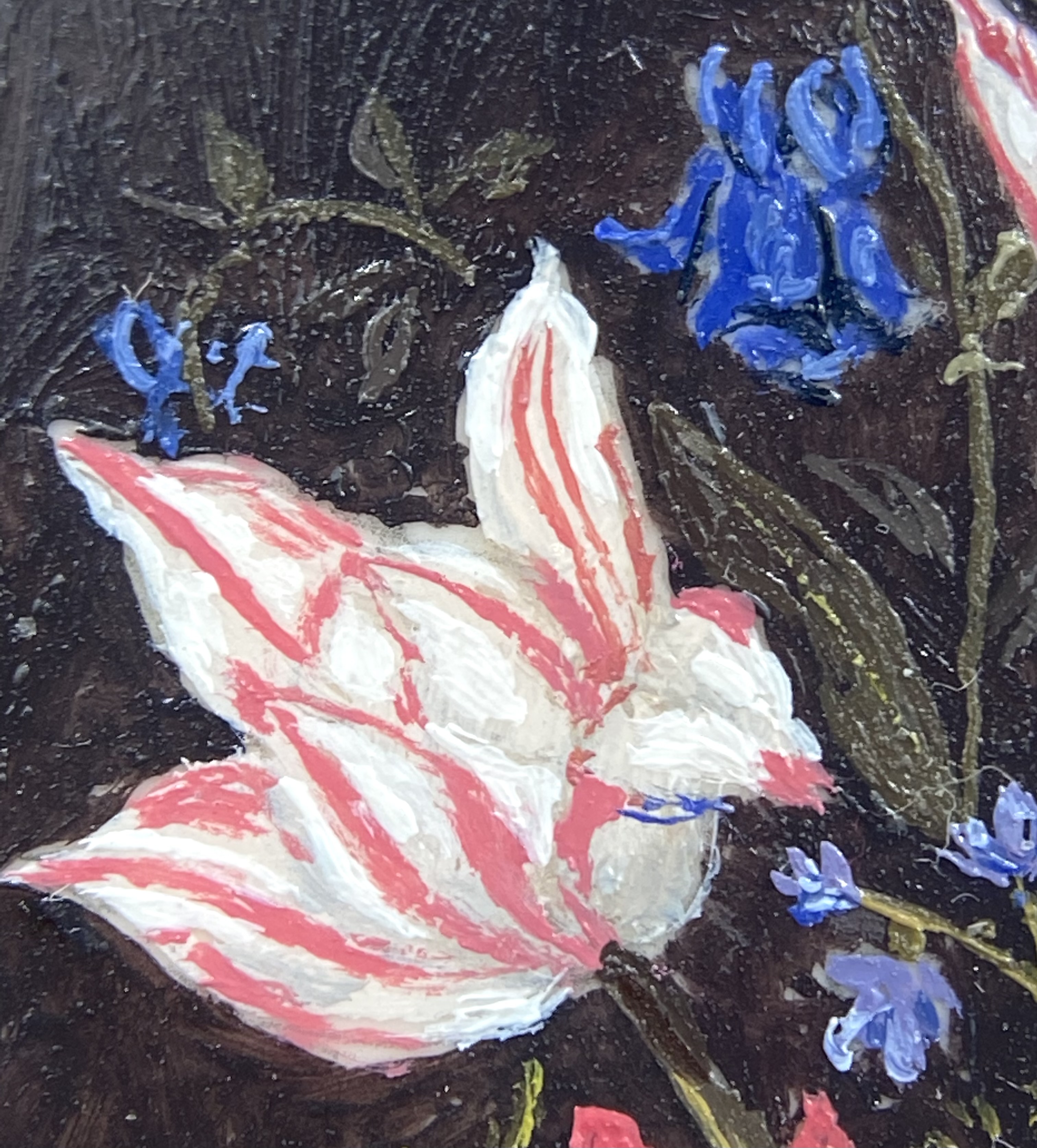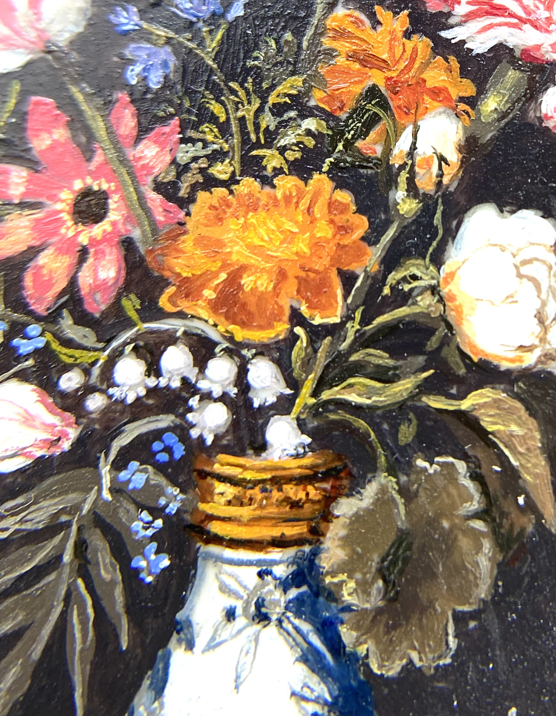 There I stood, poring over the variety on offer, which ranged from small flower pictures to a superb grand full-length portrait after William Larkin. Eventually, I chose this gorgeous little copy after Ambrosius Bosschaert. Our Drawing Room, which is going to be blue-and-white themed, will have the Dutch and Chinese porcelain set off with some still lives. We already have some prints, crafted by Mariangela Gagliardi to look like paintings, but how much more wonderful to have an original picture! As I was photographing the painting for this catalogue, my macro lens enabled me to examine it at a degree of magnification that revealed the spontaneous tiny brushstrokes which somehow, miraculously, come together to create this lovely polished painting.