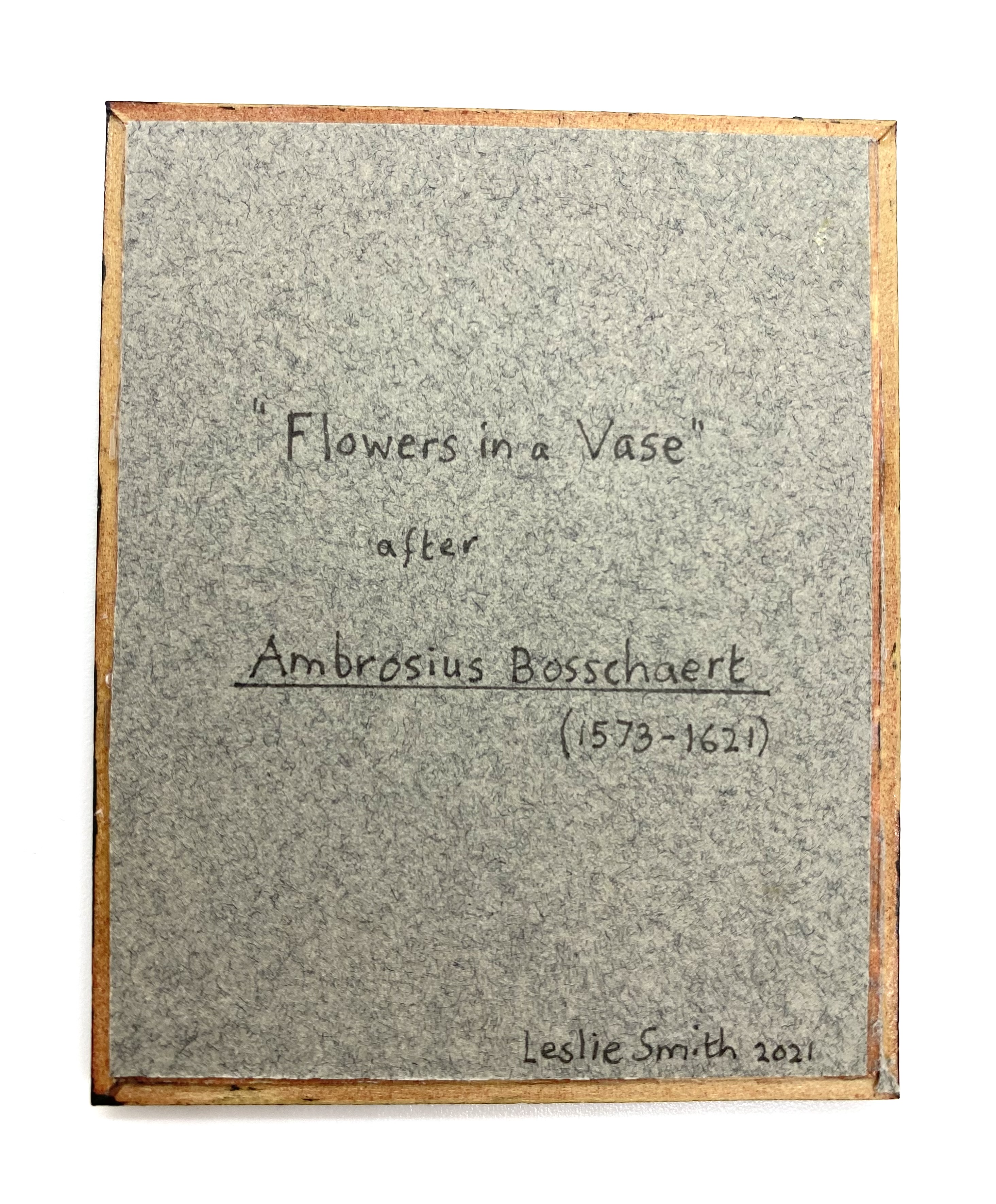 Inscriptions: signed and dated ‘Leslie Smith 2021’ and inscribed ‘ “Flowers in a Vase” after Ambrosius Bosschaert (1573-1621)’ (on the back)