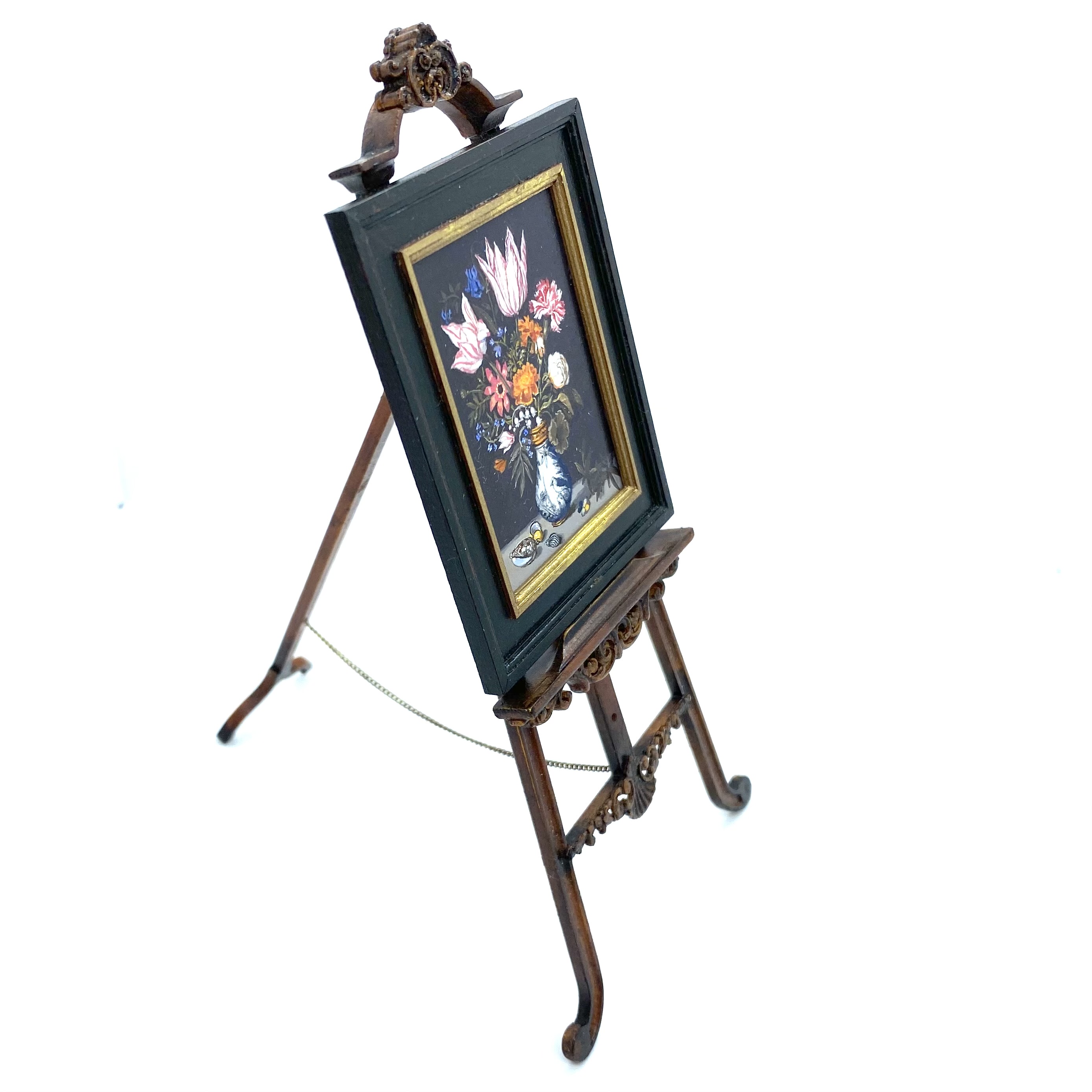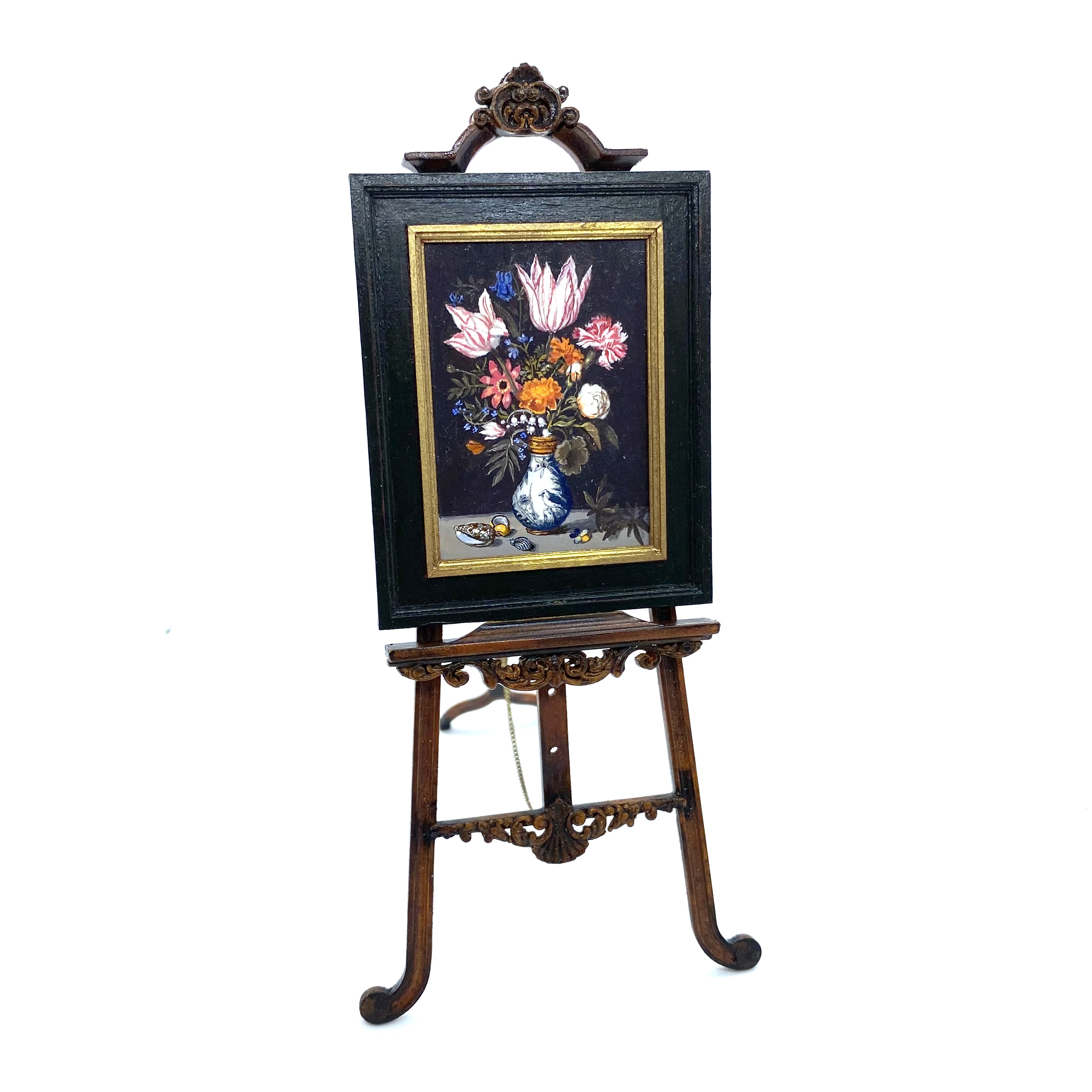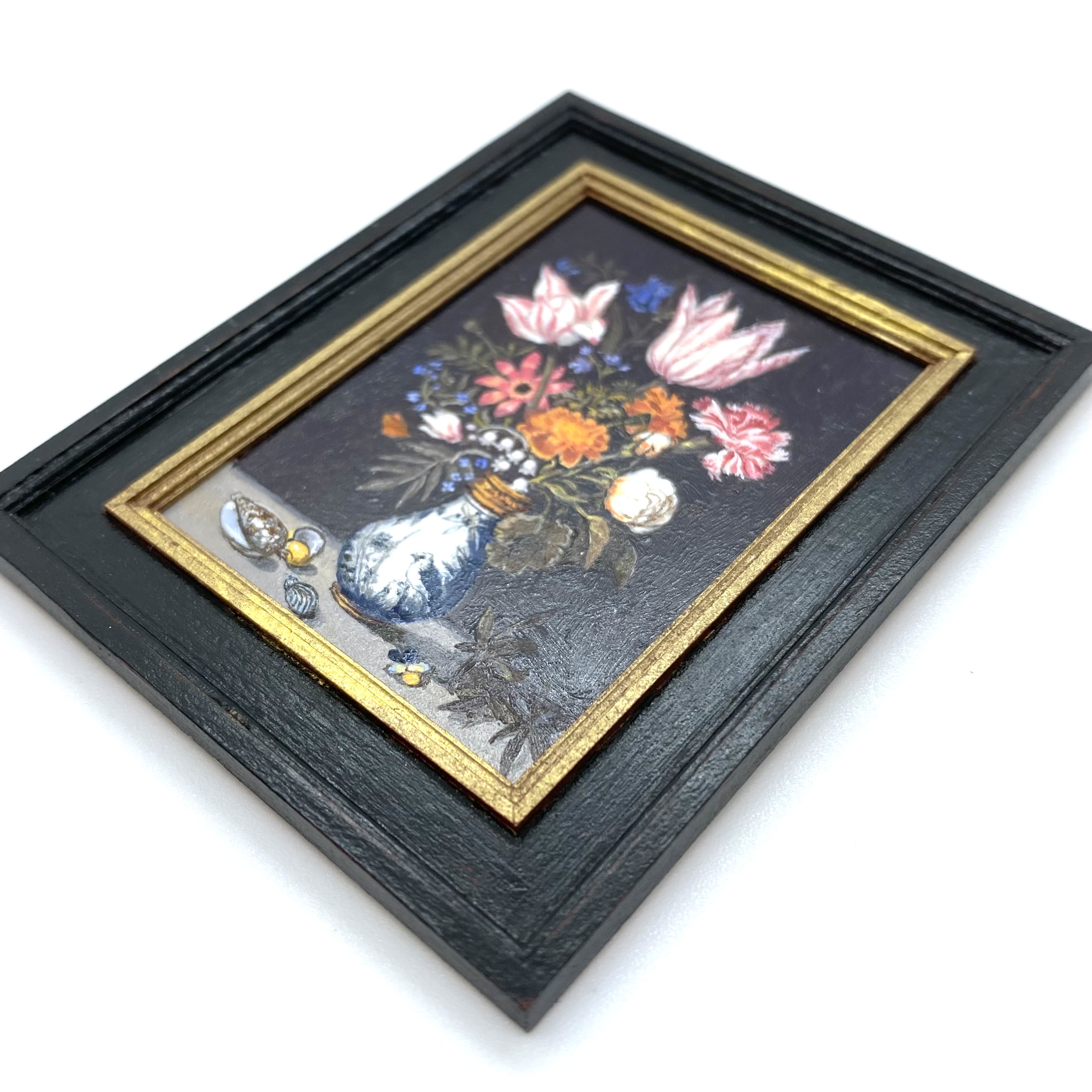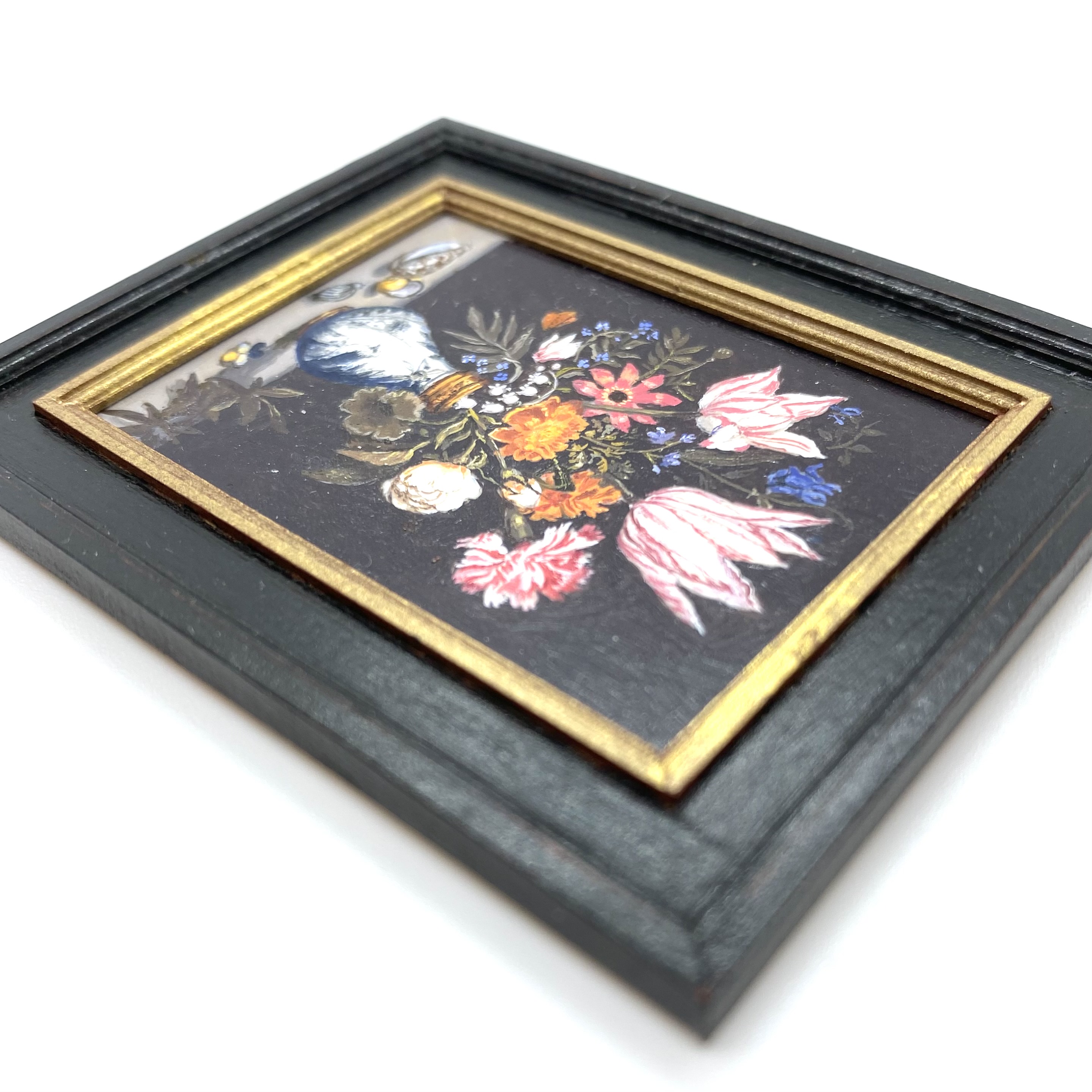 One annoying thing about being an art historian is that you end up with very expensive taste. Since we can’t buy full size pictures for our home – having neither the income nor the space – I was thrilled to learn that some talented miniaturists paint dolls’-house-sized copies of artworks. Having done some research, I decided that Leslie Smith was one of the top artists in the field, and to my delight he turned out to have a stand at the Kensington Dolls House Festival in May 2022. I made a beeline and, reader, his paintings were just as marvellous in reality as they’d looked on his website. He gets all the detail just right, and he has extraordinary command over his miniscule brush strokes.