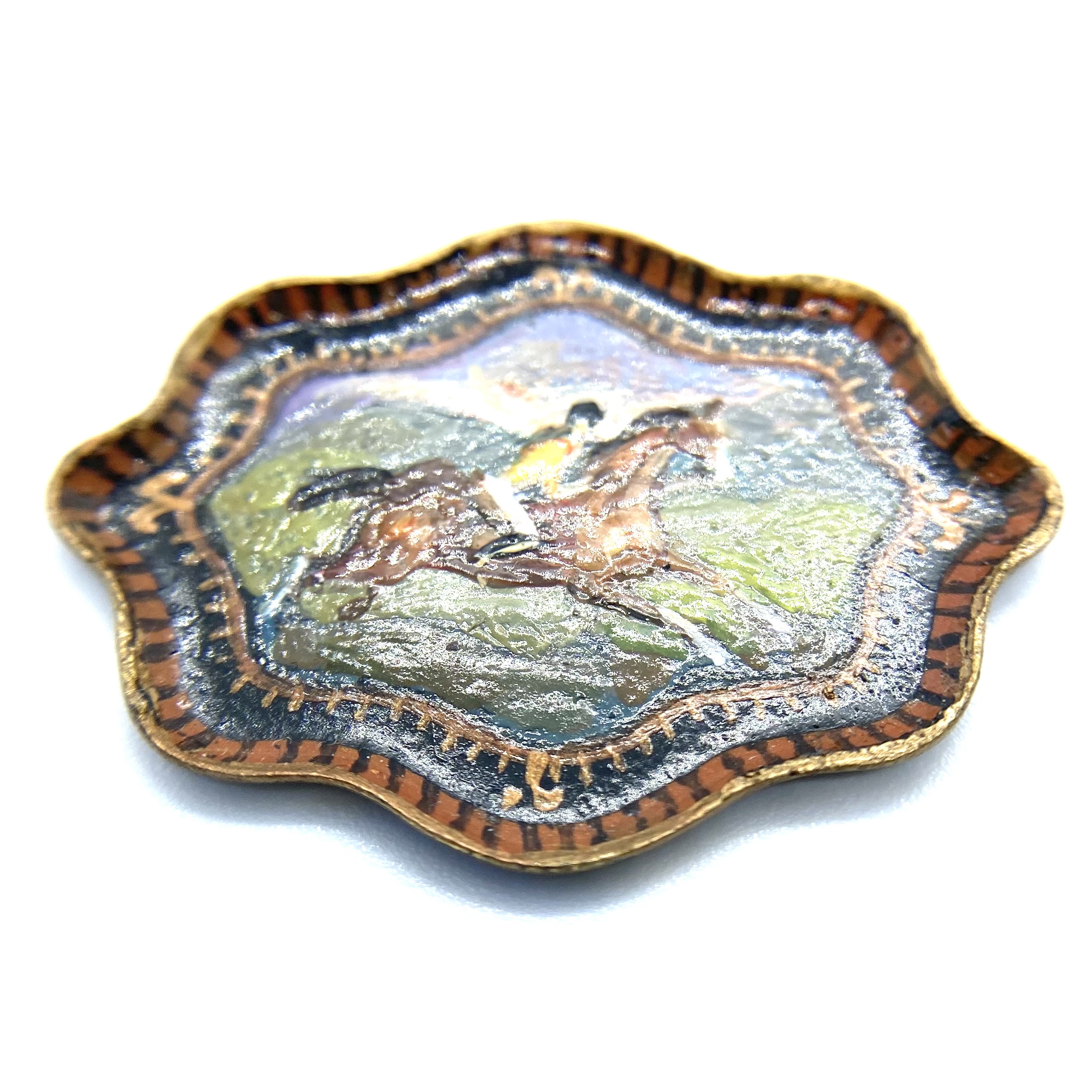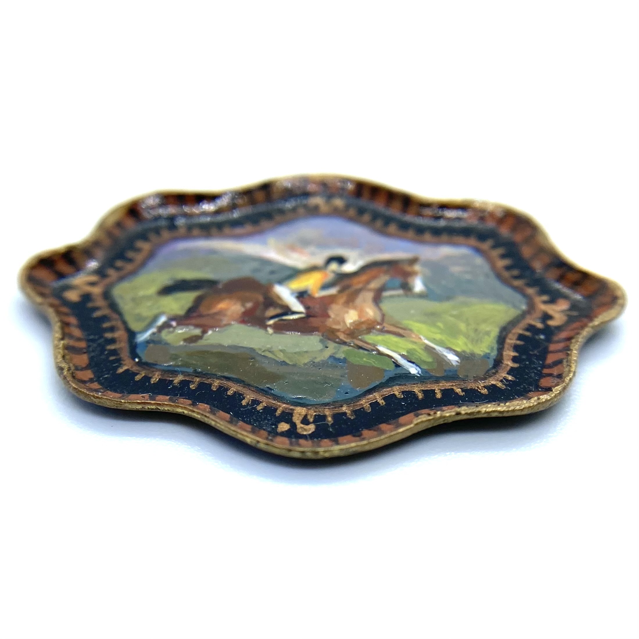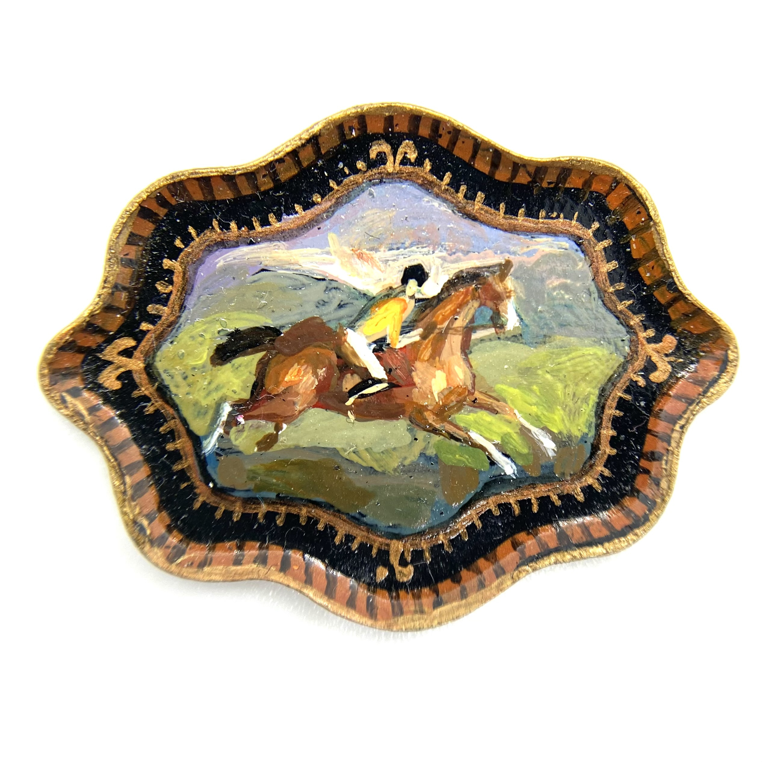 This is one of three painted trays with equine or hunting motifs, by Natasha, that we bought at Kensington in 2022. I was delighted with these, as I had decided to theme the Smoking Room around hunting, dogs and horses, and thought it would be marvellous to have some of Natasha’s related pieces. I couldn’t believe my eyes when I had the opportunity to buy three! Signed and dated ‘Natasha 2010’ on the reverse.