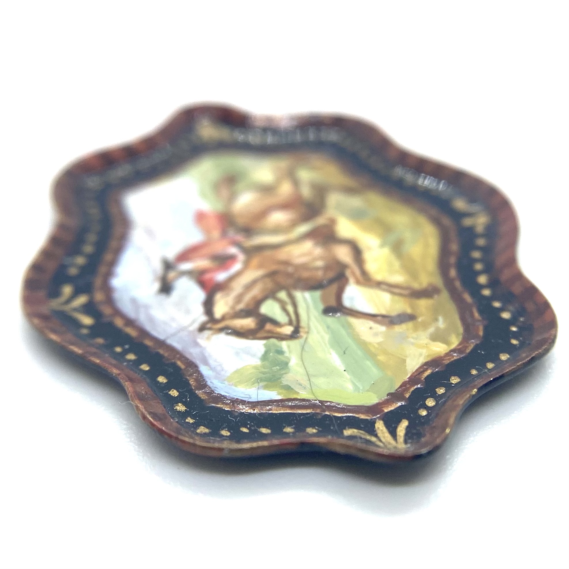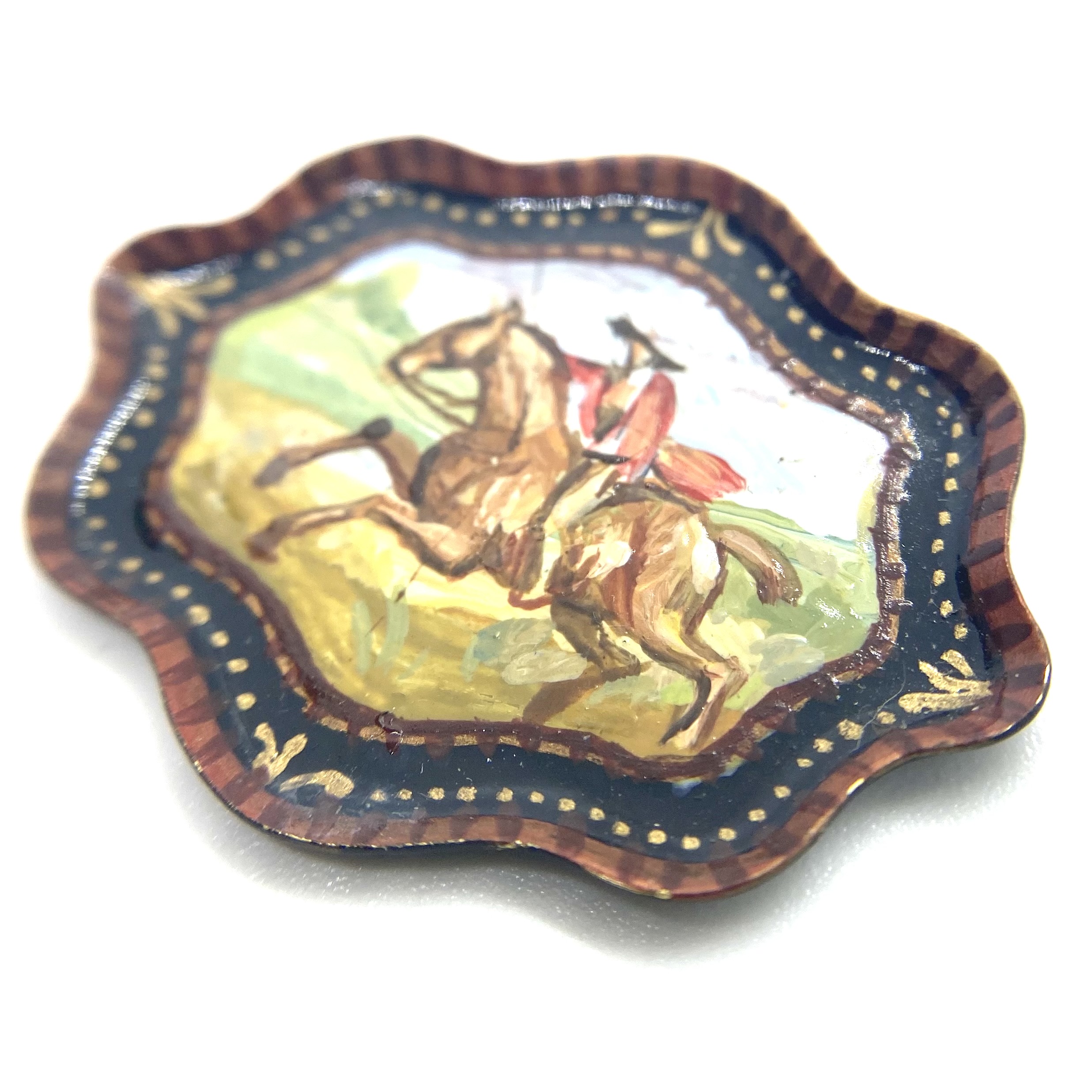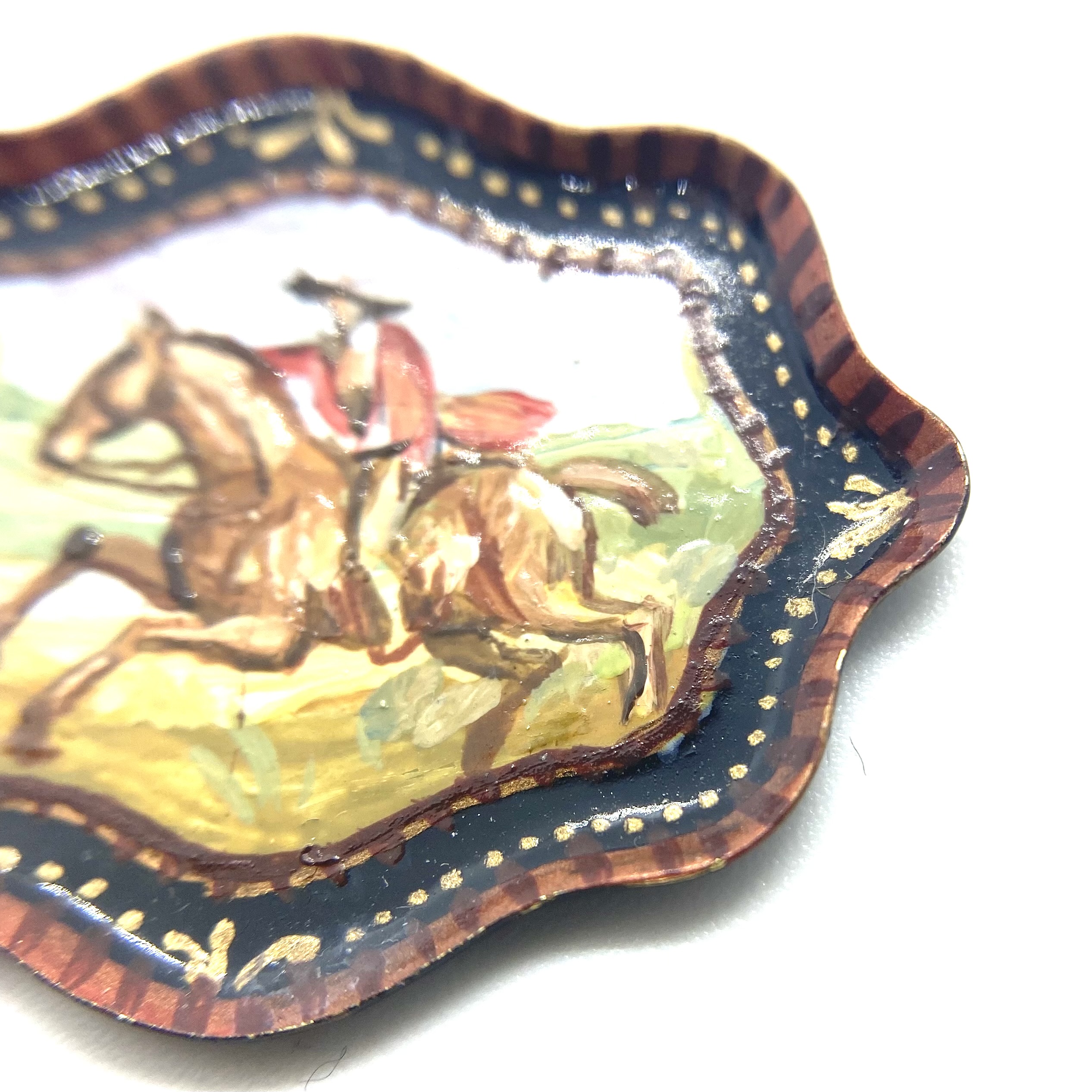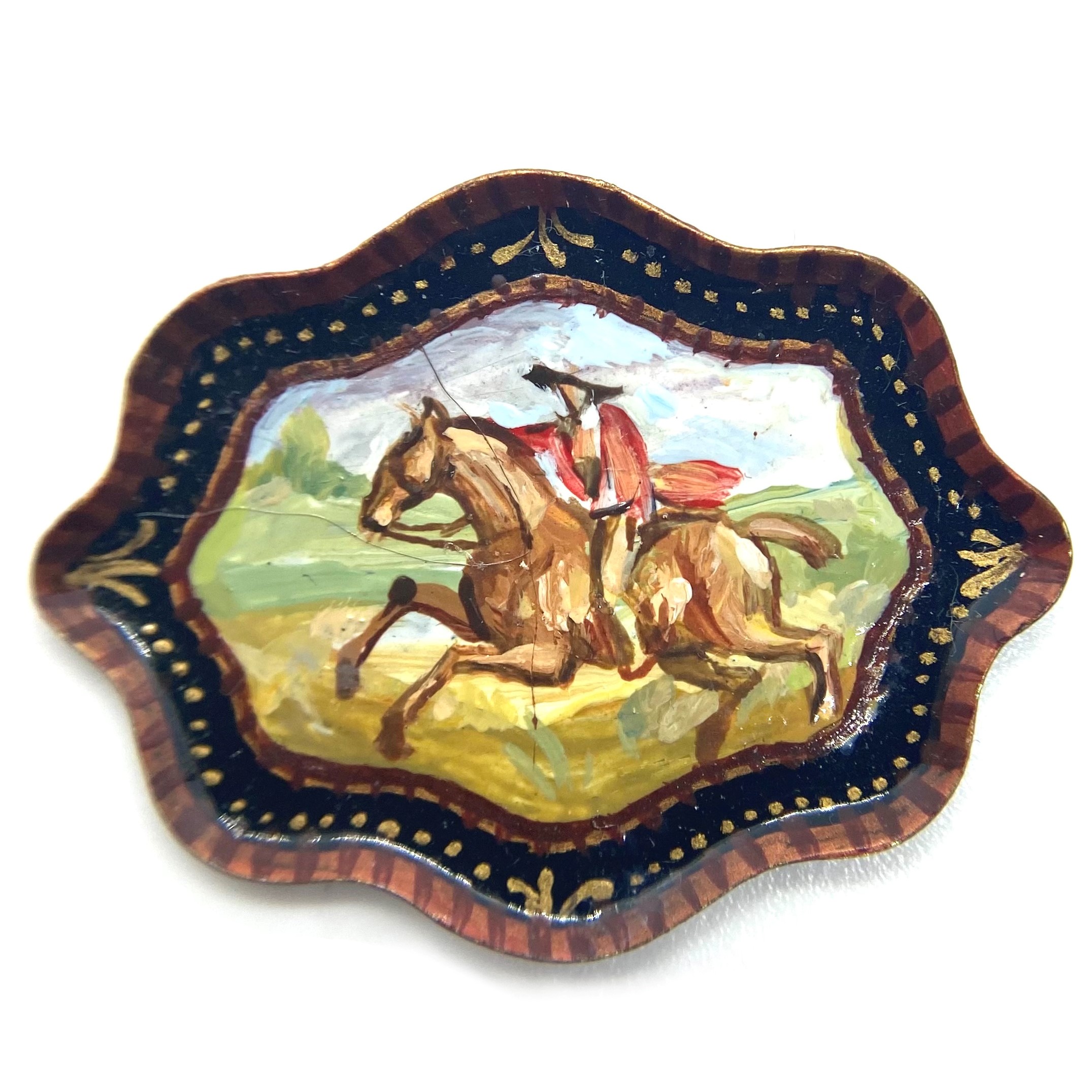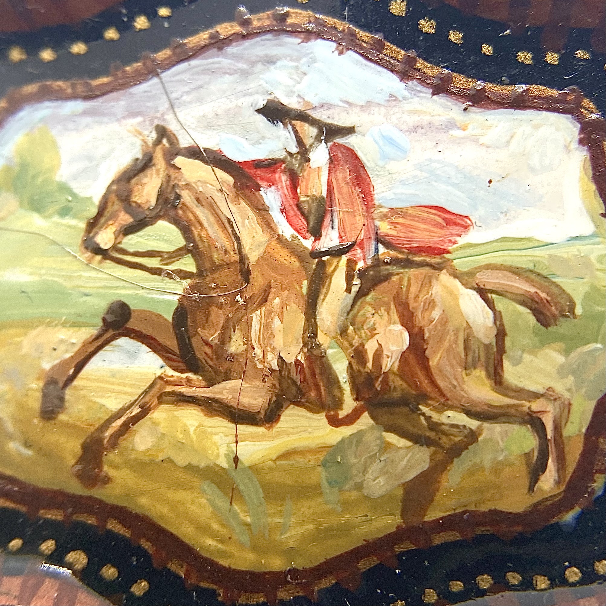 This is one of three painted trays with equine or hunting motifs, by Natasha, that we bought at Kensington in 2022. I was delighted with these, as I had decided to theme the Smoking Room around hunting, dogs and horses, and thought it would be marvellous to have some of Natasha’s related pieces. I couldn’t believe my eyes when I had the opportunity to buy three! Signed and dated ‘Natasha 2010’ on the reverse.