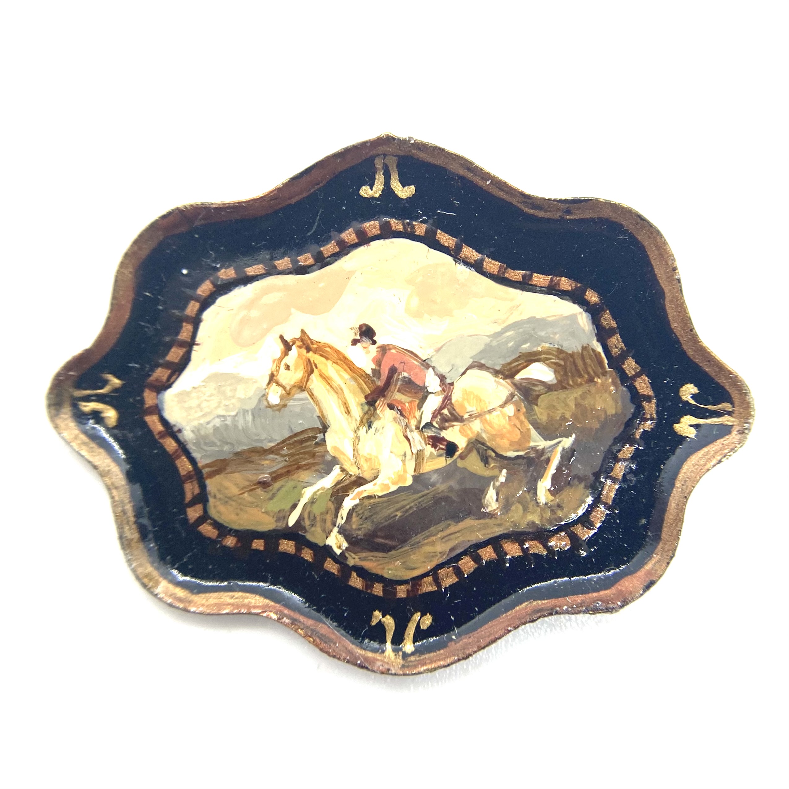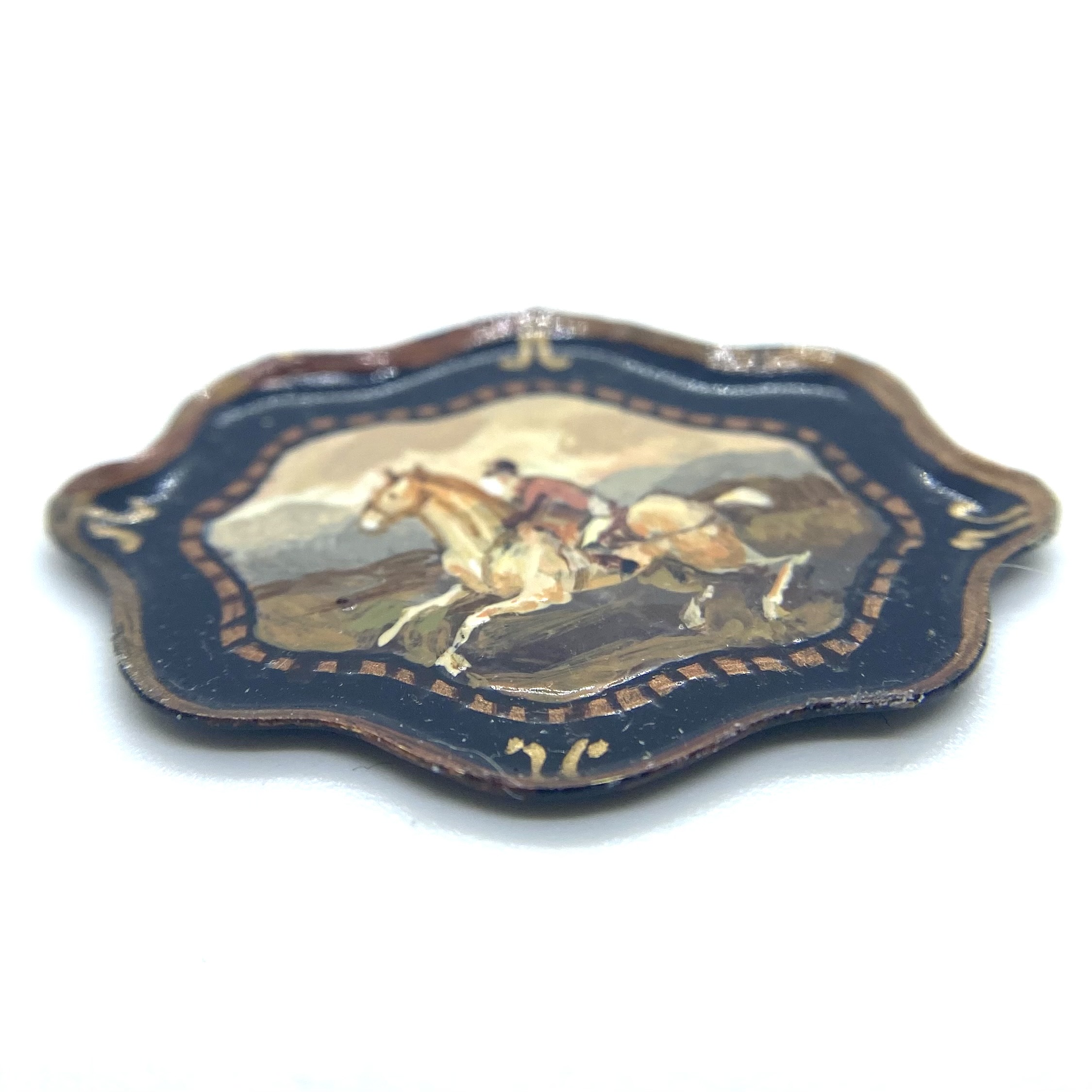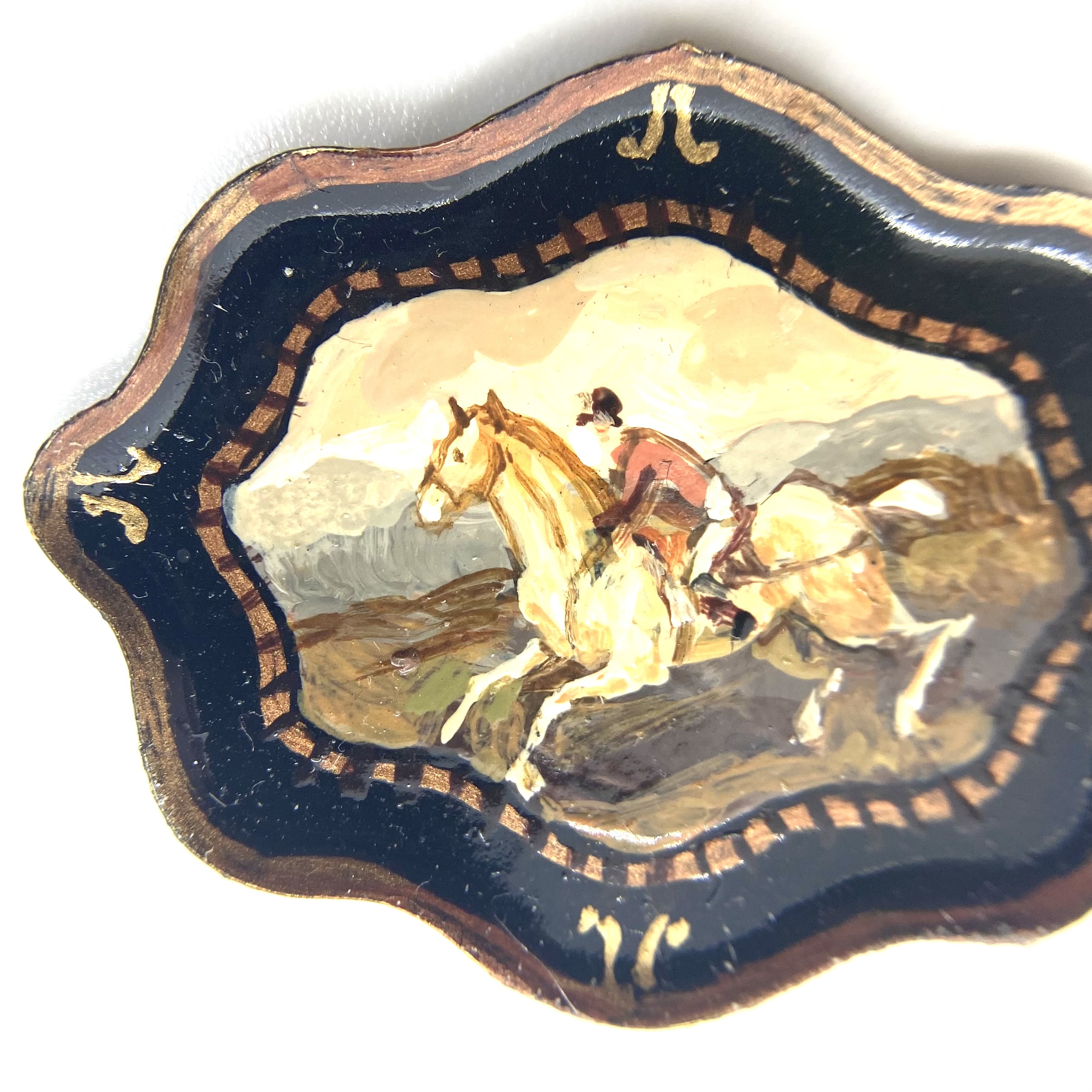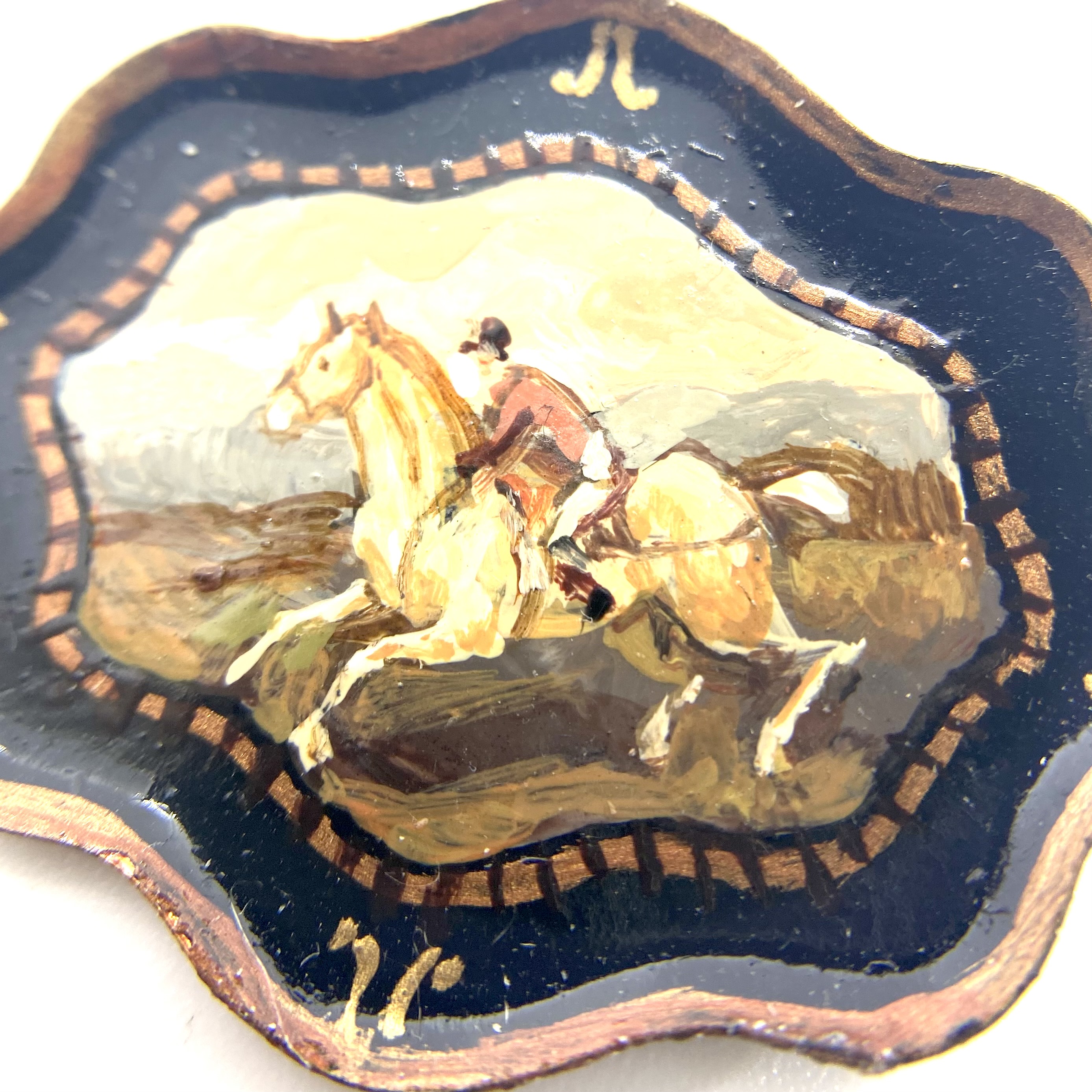 This is one of three painted trays with equine or hunting motifs, by Natasha, that we bought at Kensington in 2022. I was delighted with these, as I had decided to theme the Smoking Room around hunting, dogs and horses, and thought it would be marvellous to have some of Natasha’s related pieces. I couldn’t believe my eyes when I had the opportunity to buy three! Signed and dated ‘Natasha 2010’ on the reverse.