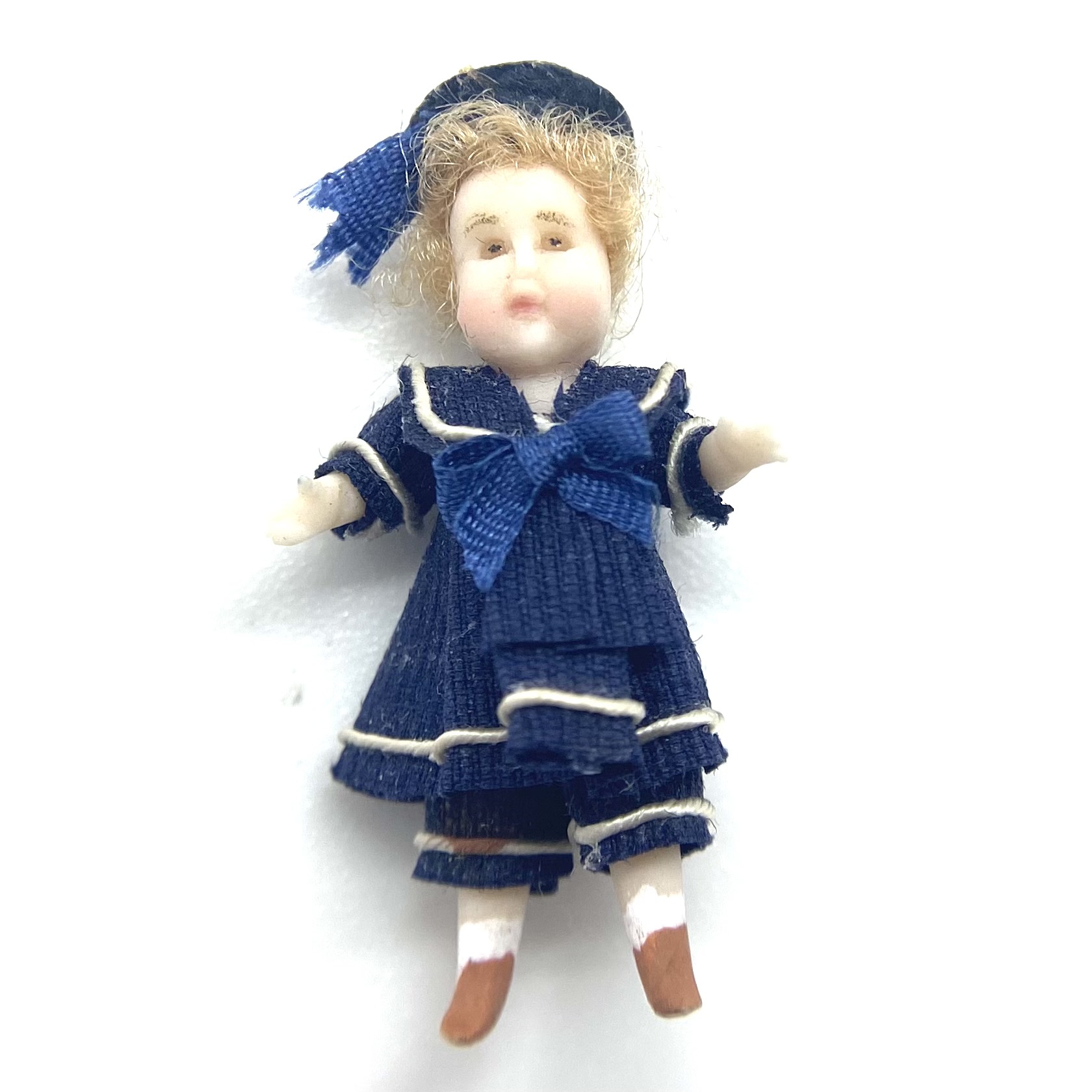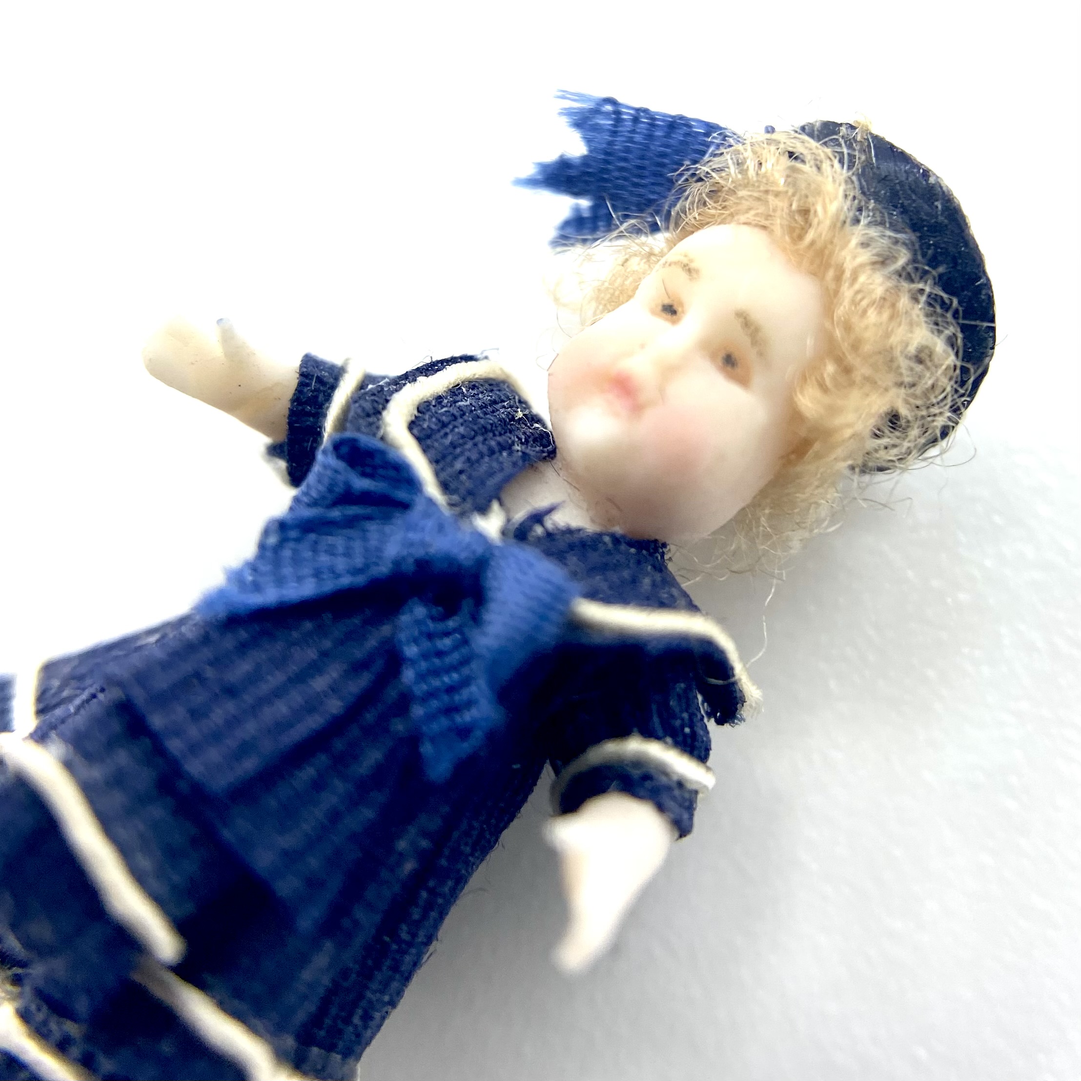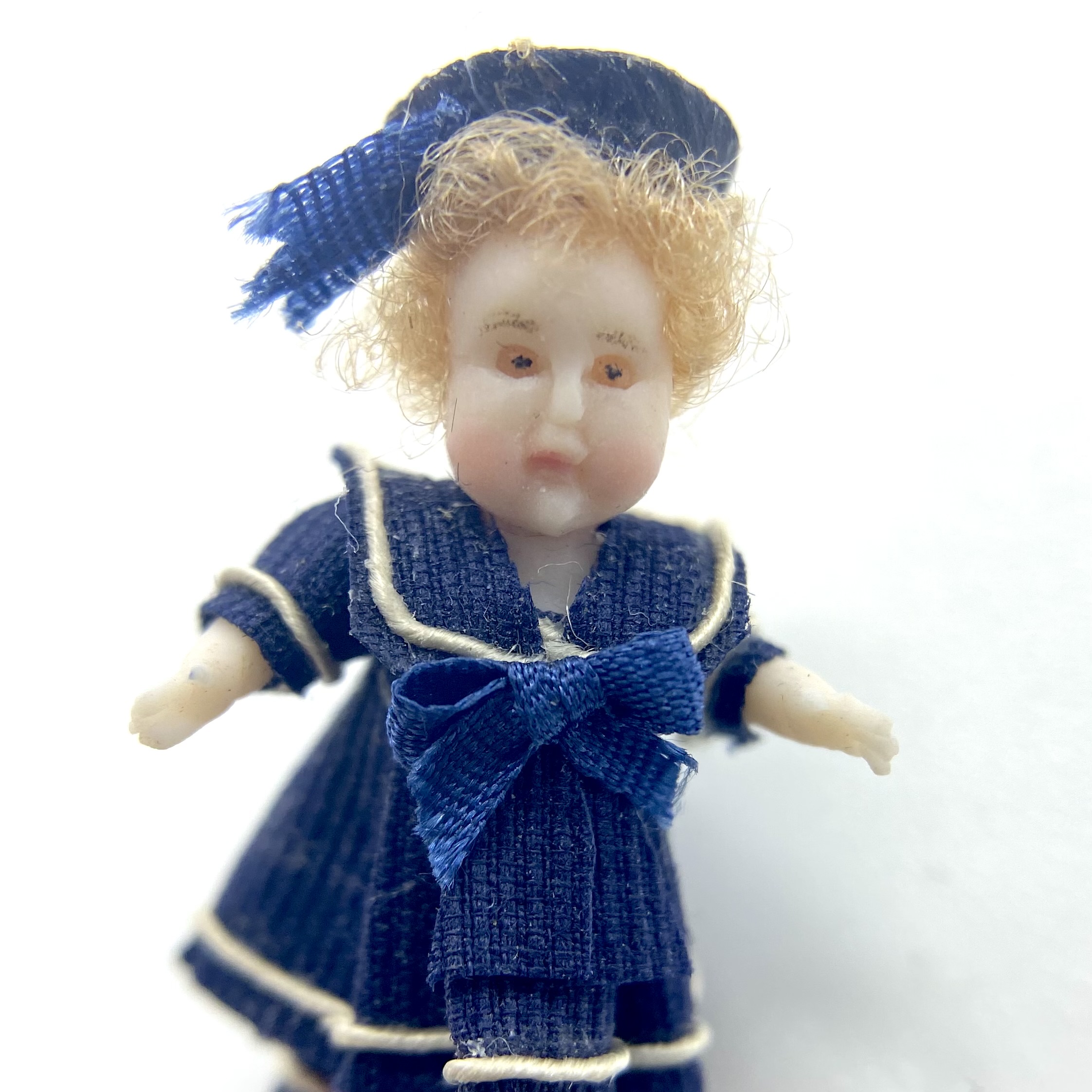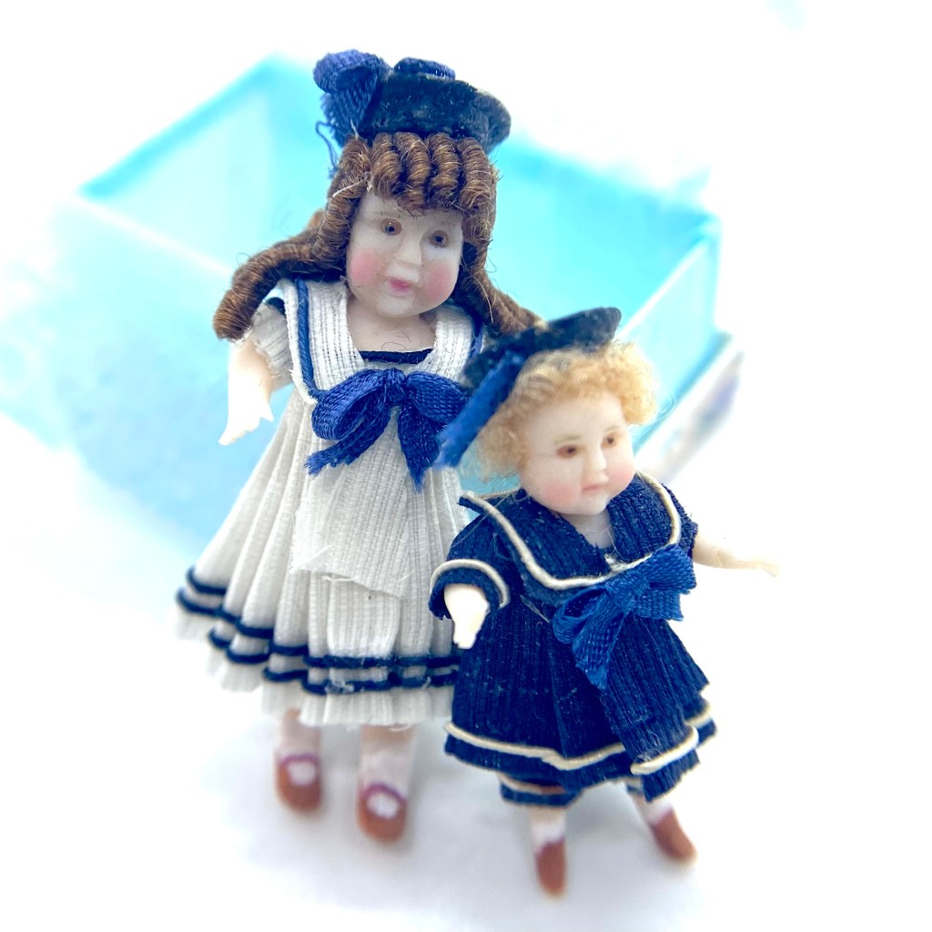 Pierre is one of two dolls’ dolls whom I bought at the stand of Victoria Heredia Guerbós at Kensington Dolls House Festival in May 2022. Like his ‘older sister’ Aliette, Pierre sports a sailor suit, the garment of choice for children in the late Victorian and Edwardian periods, and I couldn’t resist him. With his chubby face and tousled blonde hair, he was quite the charmer.