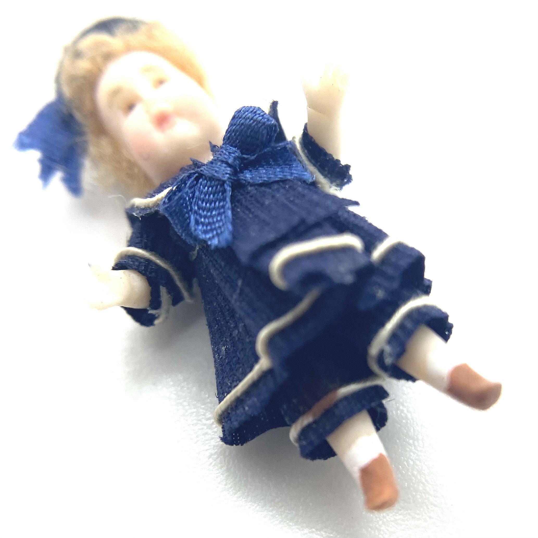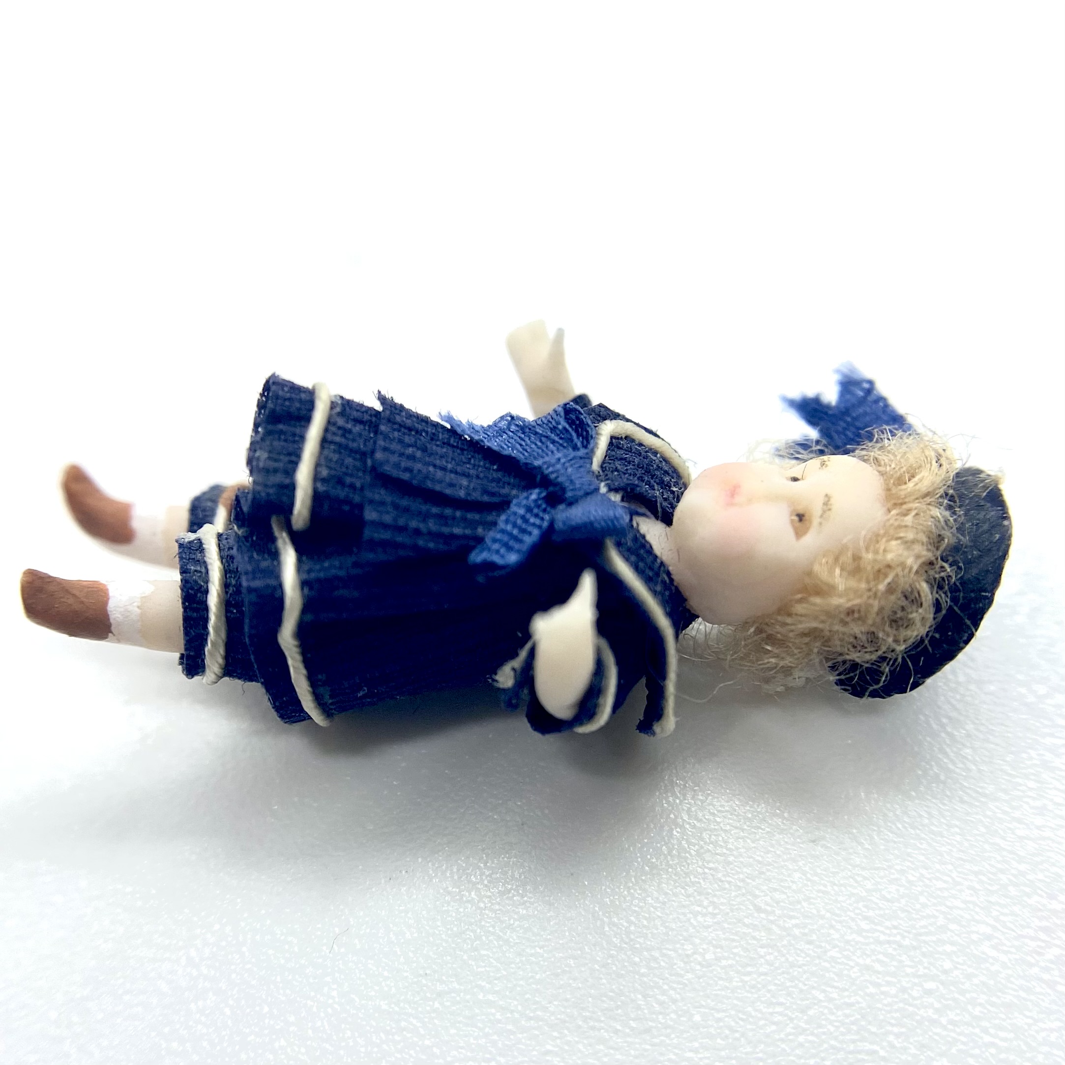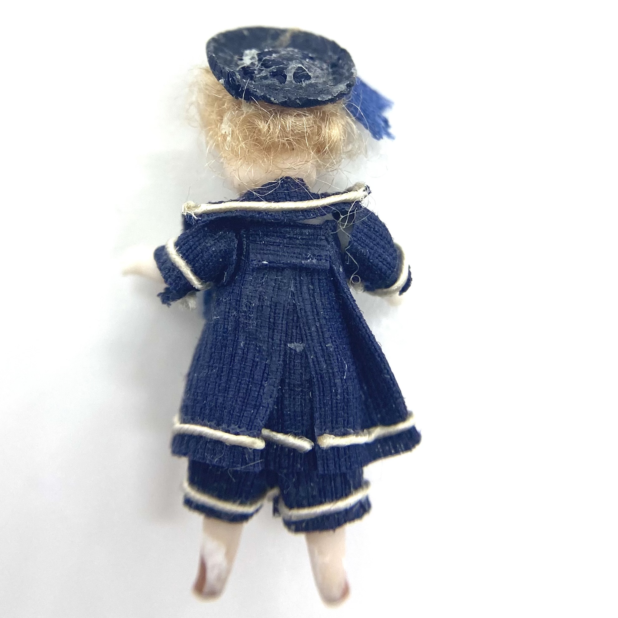 Pierre is one of two dolls’ dolls whom I bought at the stand of Victoria Heredia Guerbós at Kensington Dolls House Festival in May 2022. Like his ‘older sister’ Aliette, Pierre sports a sailor suit, the garment of choice for children in the late Victorian and Edwardian periods, and I couldn’t resist him. With his chubby face and tousled blonde hair, he was quite the charmer.