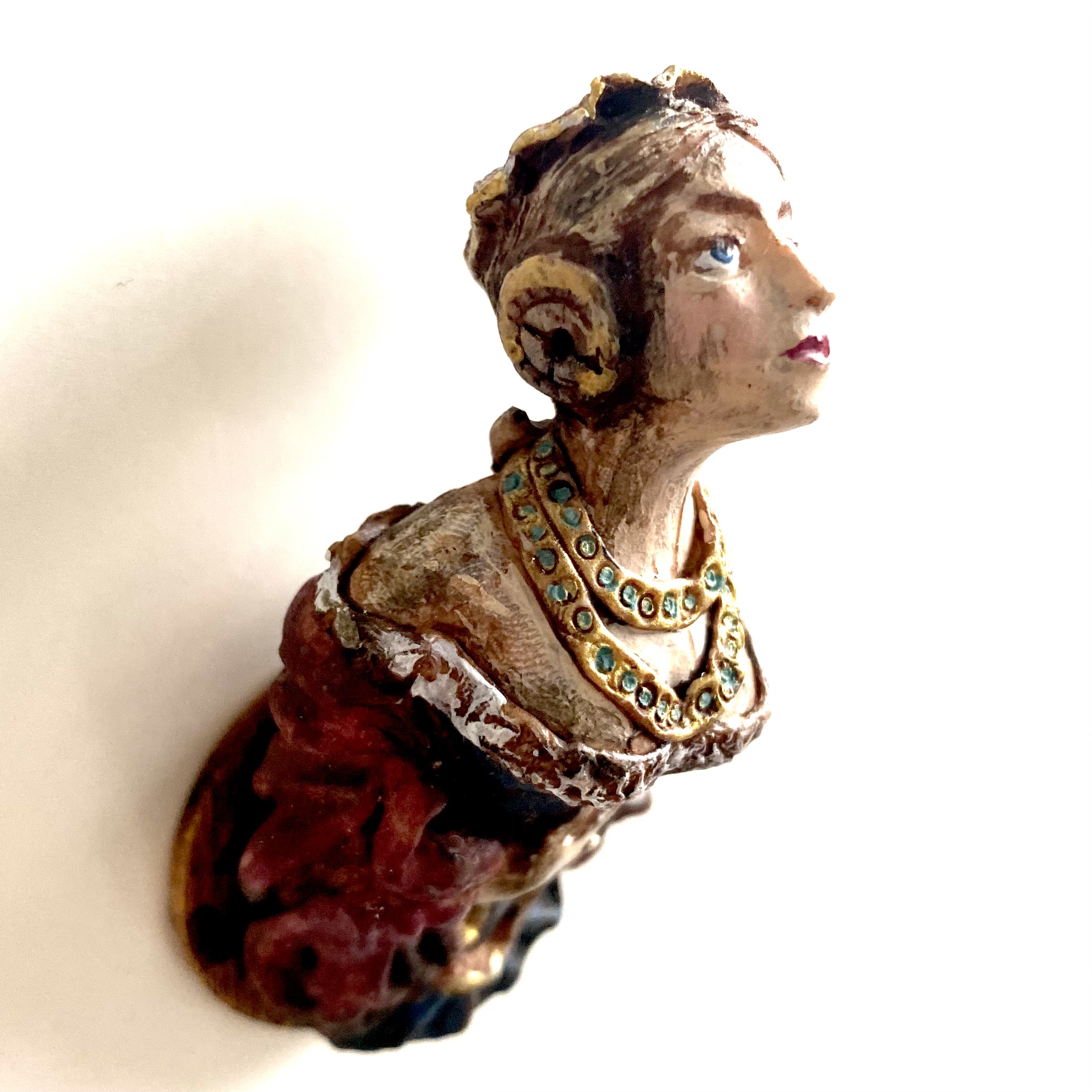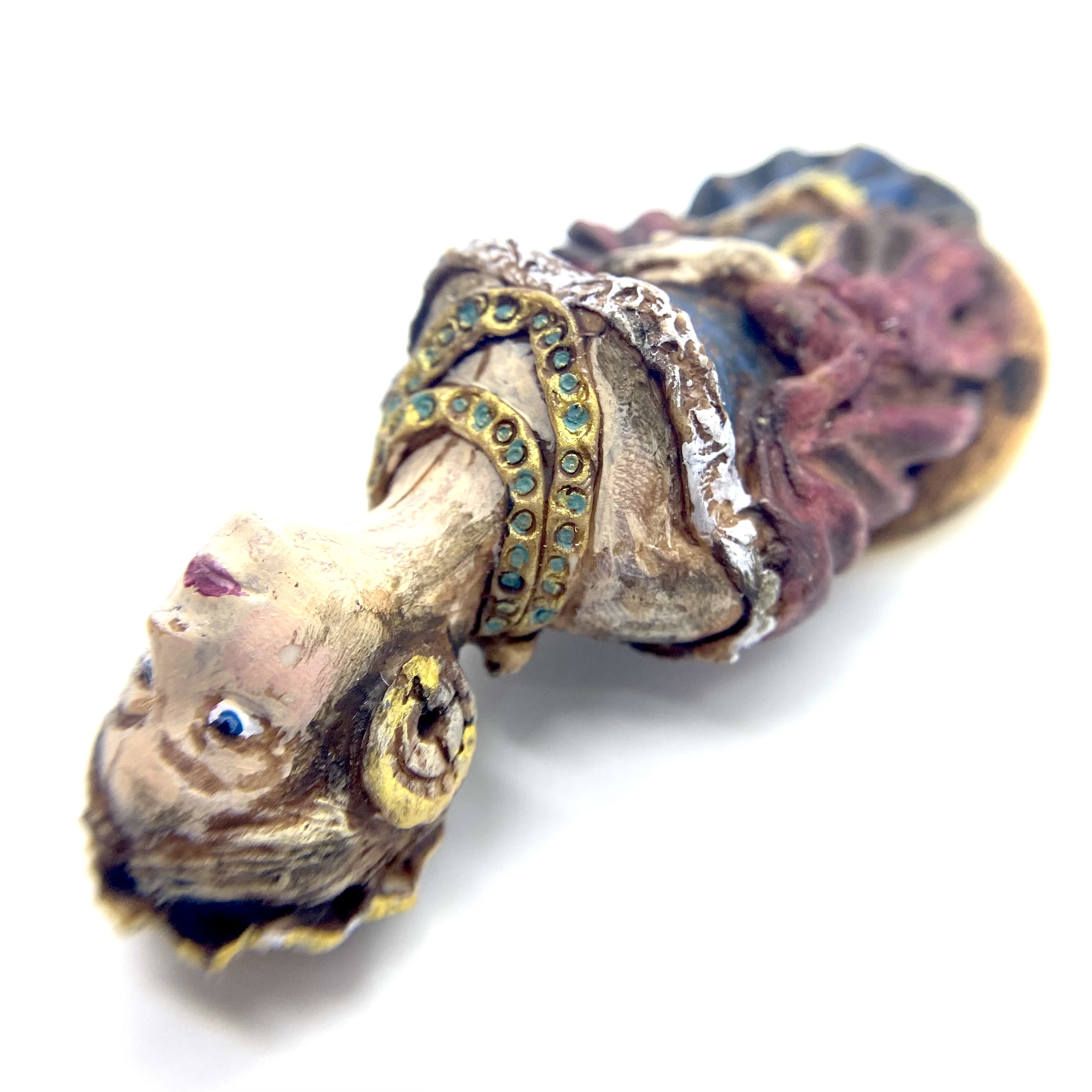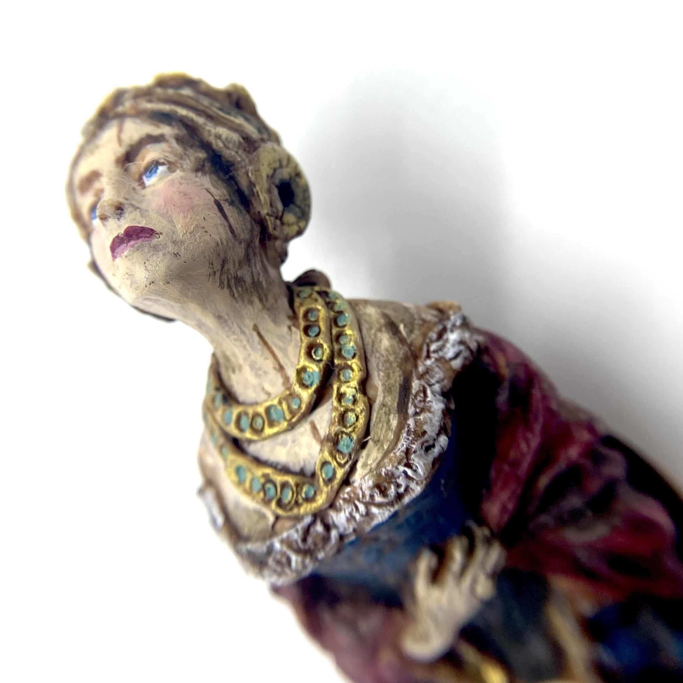 Whether it be whimsy or genius, the people behind Nantasy Fantasy have come up with some of the most original miniatures on the market. Who else has thought to make a ship’s figurehead, for example? I’d seen a couple of examples of these figureheads for sale online, and couldn’t believe my eyes when I spotted this one among Judy Taylor’s offerings at Kensington Dolls House Festival in May 2022. Reader, I pounced. She’s exquisite and, even better, she has a little hole in the back so you can hang her on a nail – I’d already decided that I wanted at least one figurehead to hang in the Museum, as part of our kunstkammer. I think she’ll look rather fine alongside our lusterweibchen chandelier and our santos cage doll.