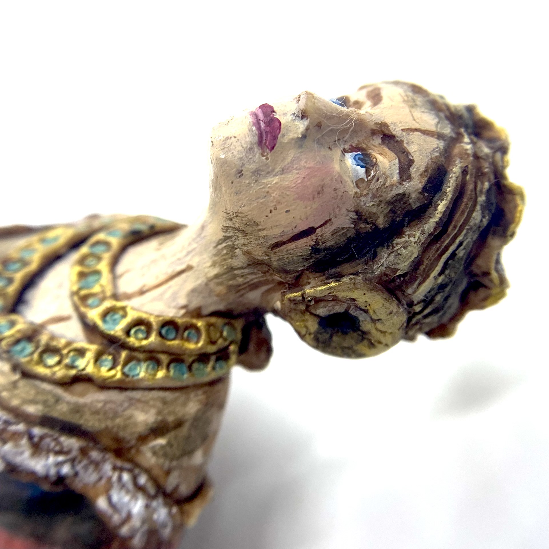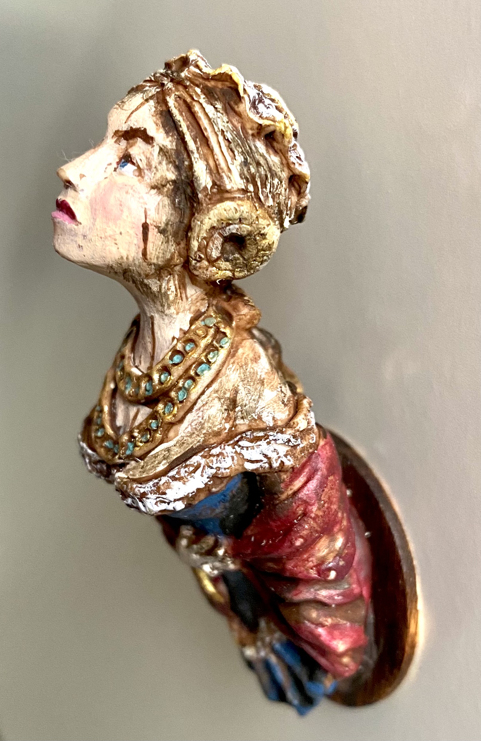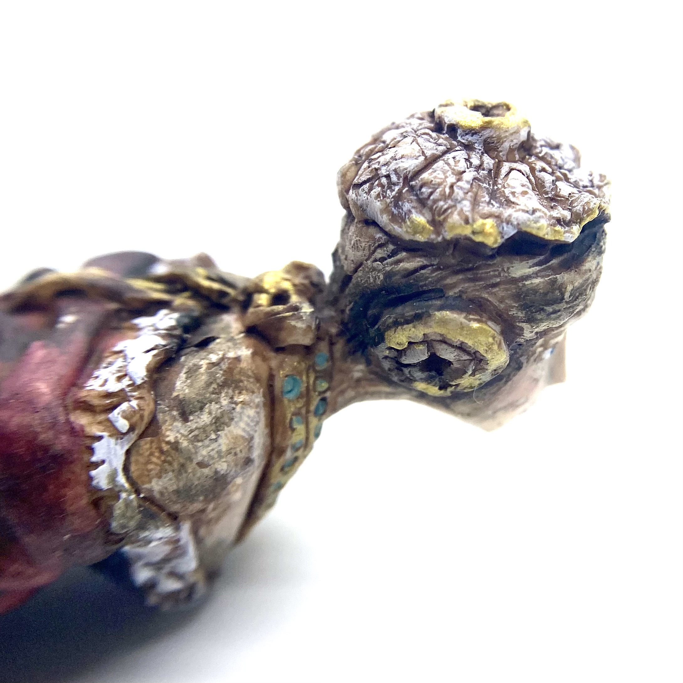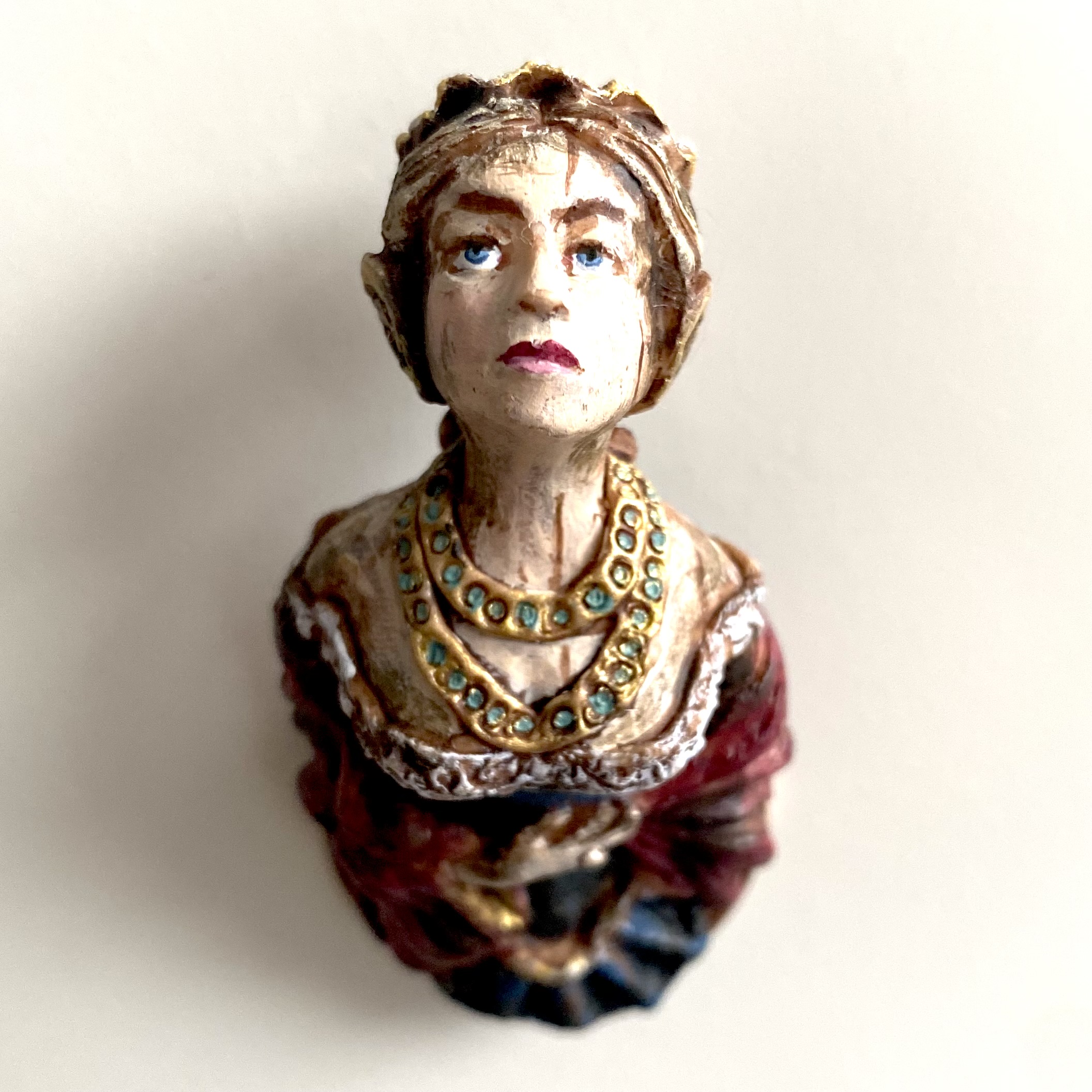 Whether it be whimsy or genius, the people behind Nantasy Fantasy have come up with some of the most original miniatures on the market. Who else has thought to make a ship’s figurehead, for example? I’d seen a couple of examples of these figureheads for sale online, and couldn’t believe my eyes when I spotted this one among Judy Taylor’s offerings at Kensington Dolls House Festival in May 2022. Reader, I pounced. She’s exquisite and, even better, she has a little hole in the back so you can hang her on a nail – I’d already decided that I wanted at least one figurehead to hang in the Museum, as part of our kunstkammer. I think she’ll look rather fine alongside our lusterweibchen chandelier and our santos cage doll.