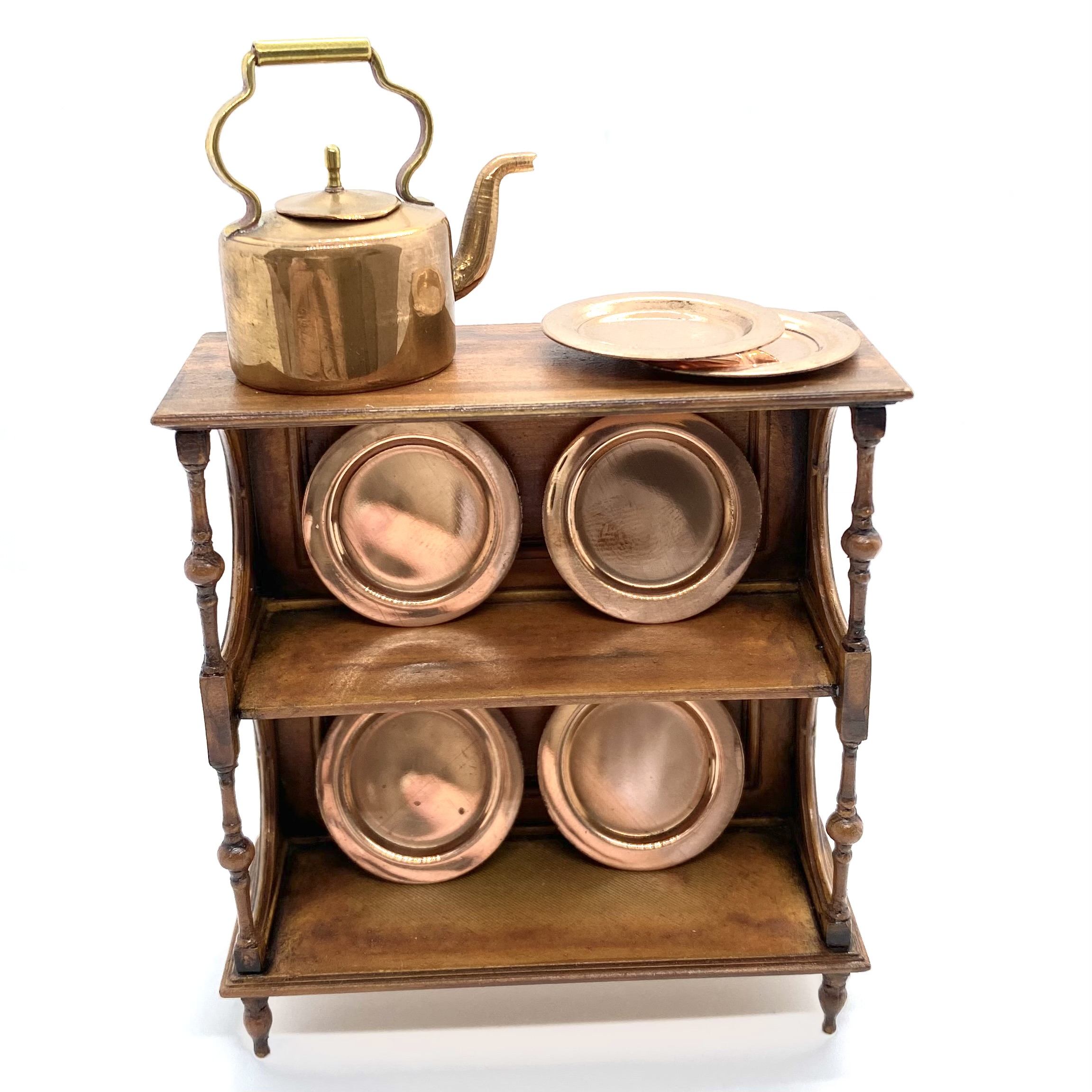 In this last picture, the plates are displayed alongside Basil Smetham’s copper kettle on a bookcase by Erzsébet Bodzas of Hungarian Miniatures