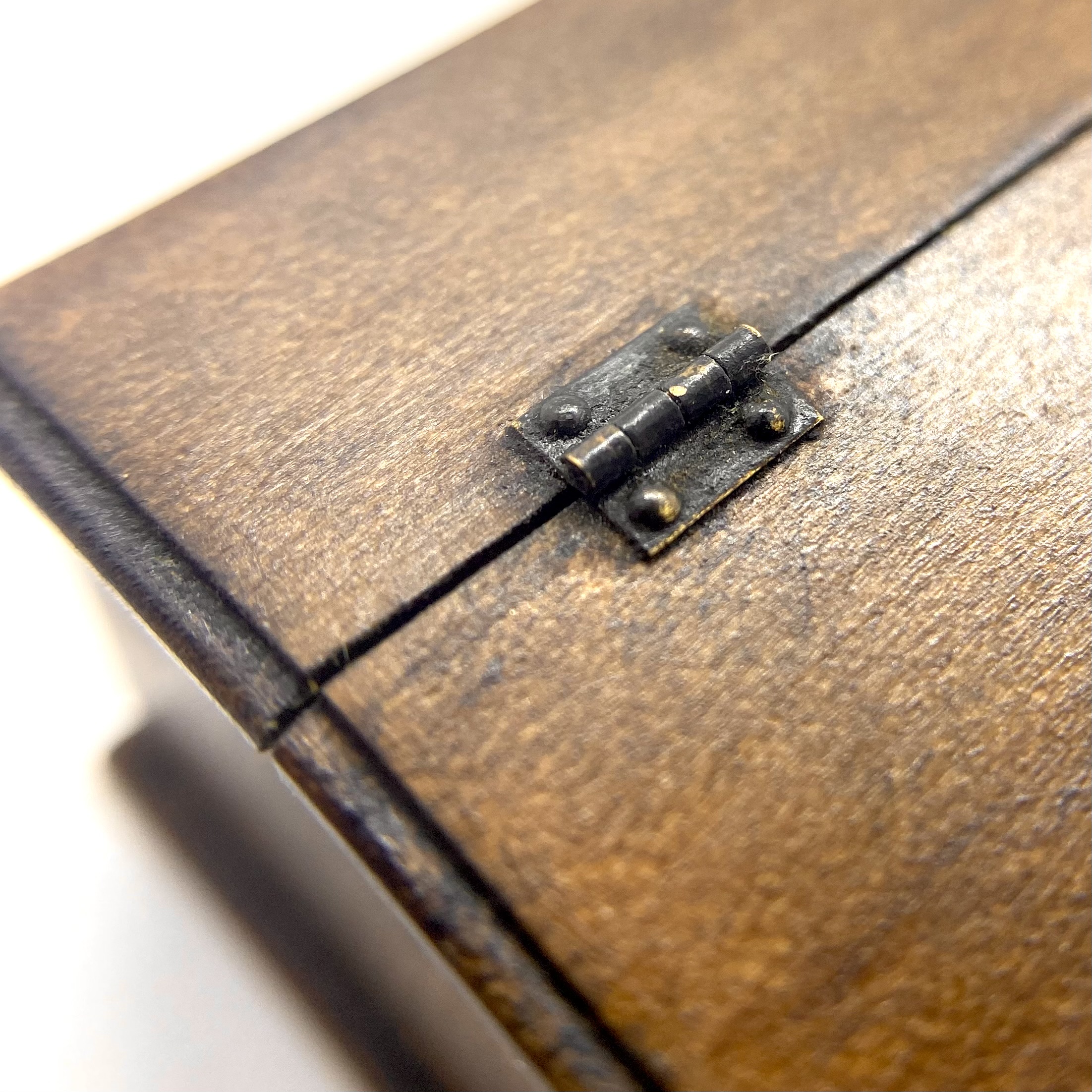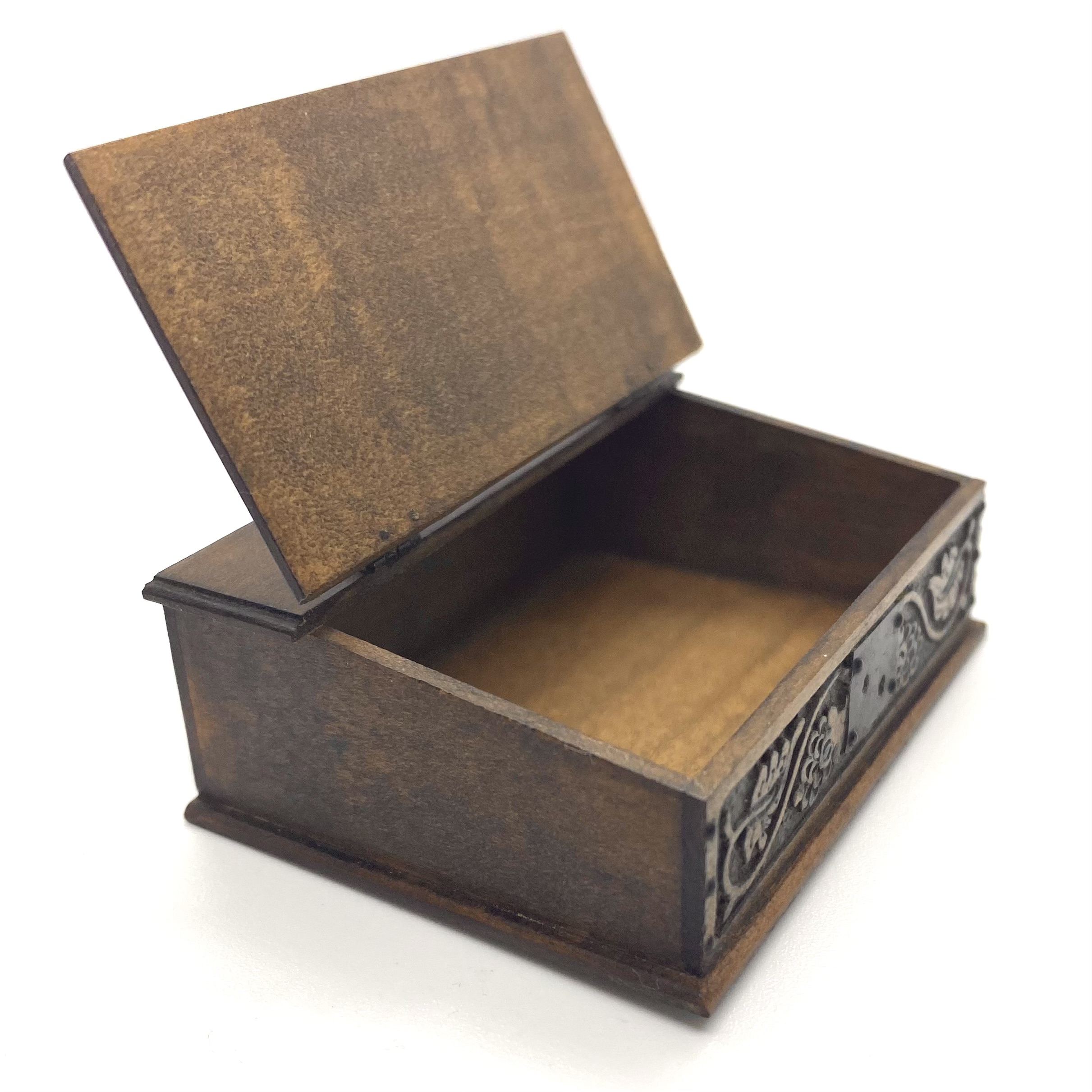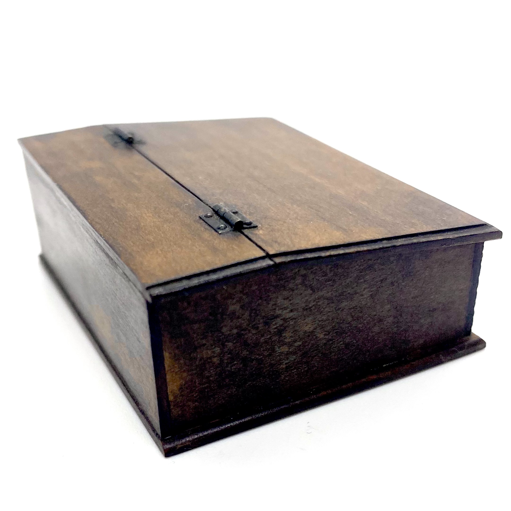 I stumbled across Ann High’s website fairly early on in my miniatures research, and fell in love with her beautiful furniture. While it’s supposed to be medieval or Tudor, I immediately thought that it would also fit splendidly in an Arts and Crafts context. I decided that Quartermaine Hall’s master bedroom would be a glorious medievalist haven of wood panelling, William Morris fabrics and Ann High furniture. I haven’t yet got the four-poster bed on which I’ve had my eye since the beginning, but I couldn’t resist buying something from her stand at Kensington in May 2022. The result was this gorgeous little document box, decorated with a raised pattern of vines. I’m not entirely sure whether it will end up in the Master Bedroom itself or the Library, but for now it’s going into the Bedroom.