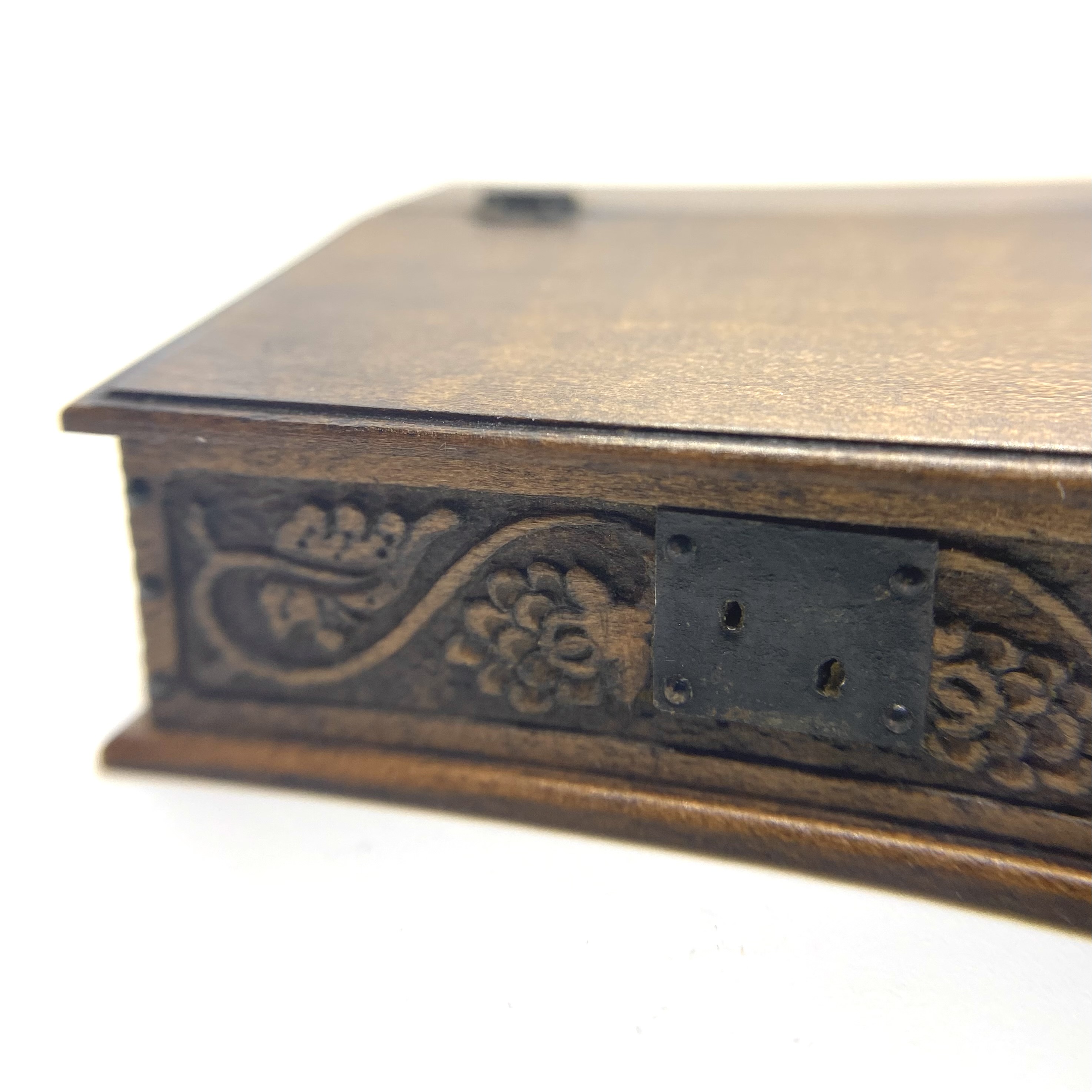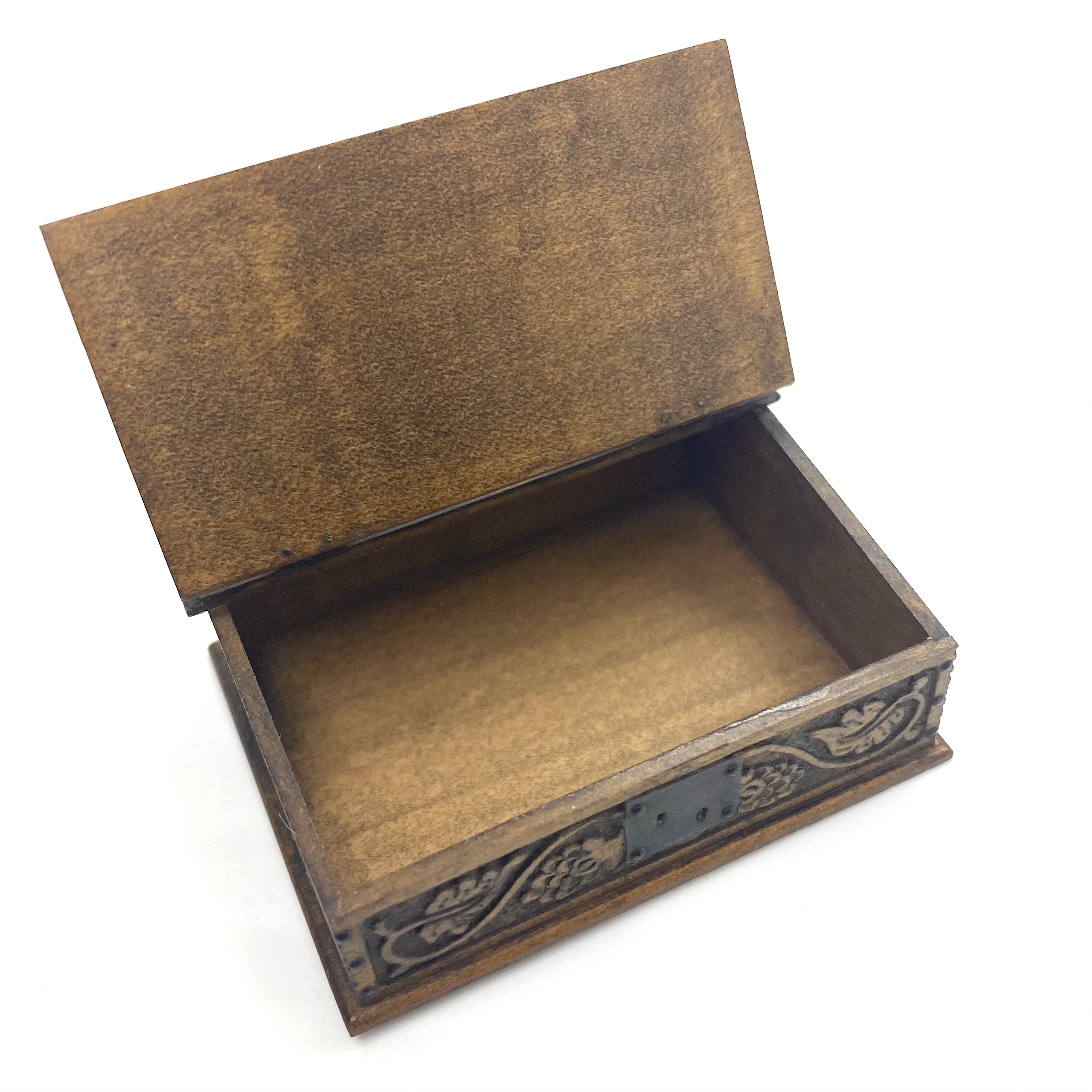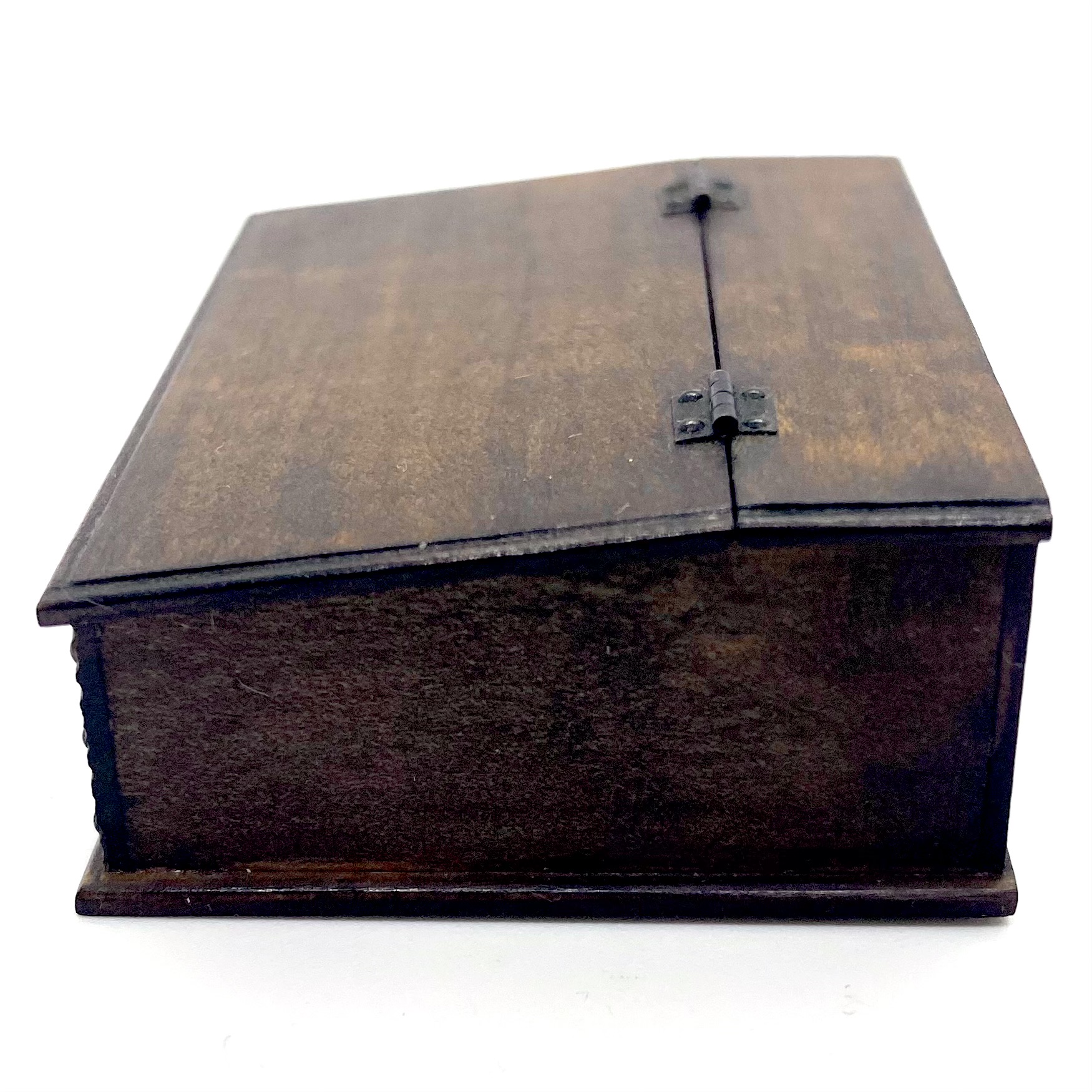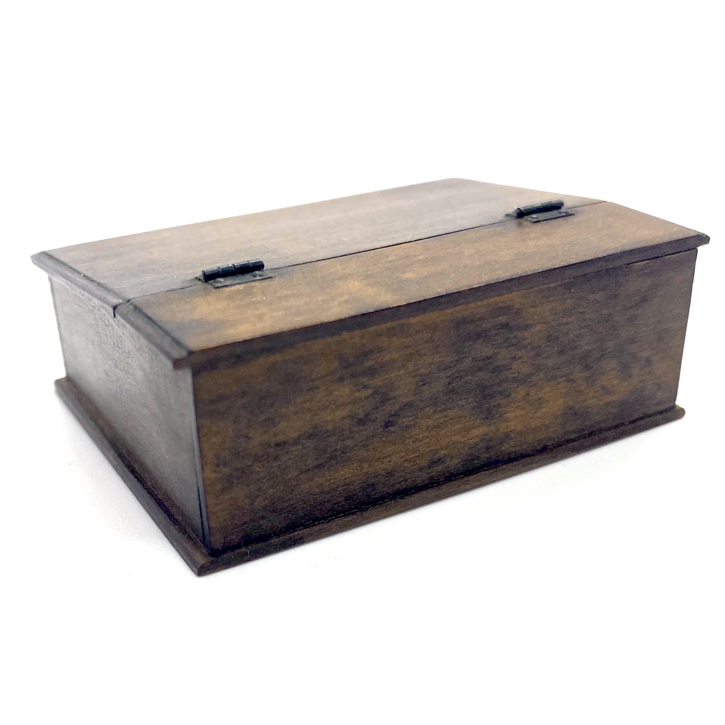 I stumbled across Ann High’s website fairly early on in my miniatures research, and fell in love with her beautiful furniture. While it’s supposed to be medieval or Tudor, I immediately thought that it would also fit splendidly in an Arts and Crafts context. I decided that Quartermaine Hall’s master bedroom would be a glorious medievalist haven of wood panelling, William Morris fabrics and Ann High furniture. I haven’t yet got the four-poster bed on which I’ve had my eye since the beginning, but I couldn’t resist buying something from her stand at Kensington in May 2022. The result was this gorgeous little document box, decorated with a raised pattern of vines. I’m not entirely sure whether it will end up in the Master Bedroom itself or the Library, but for now it’s going into the Bedroom.