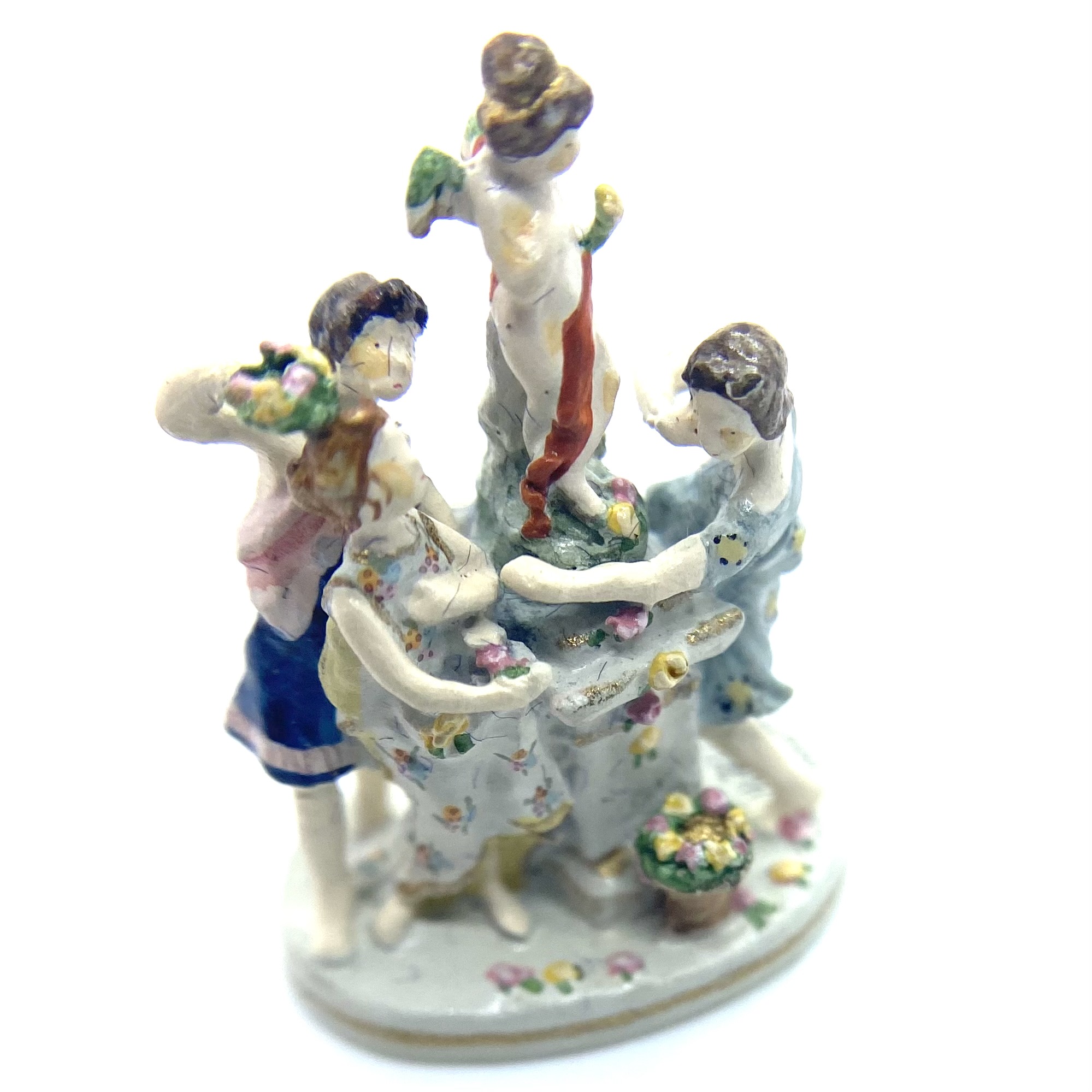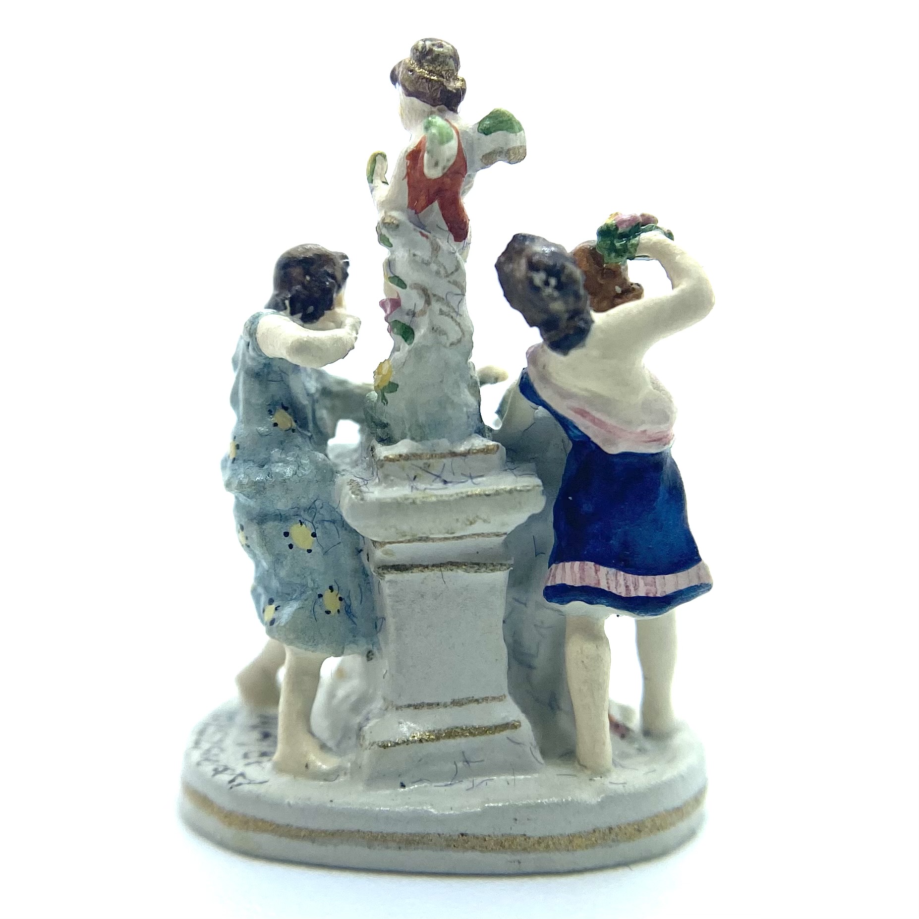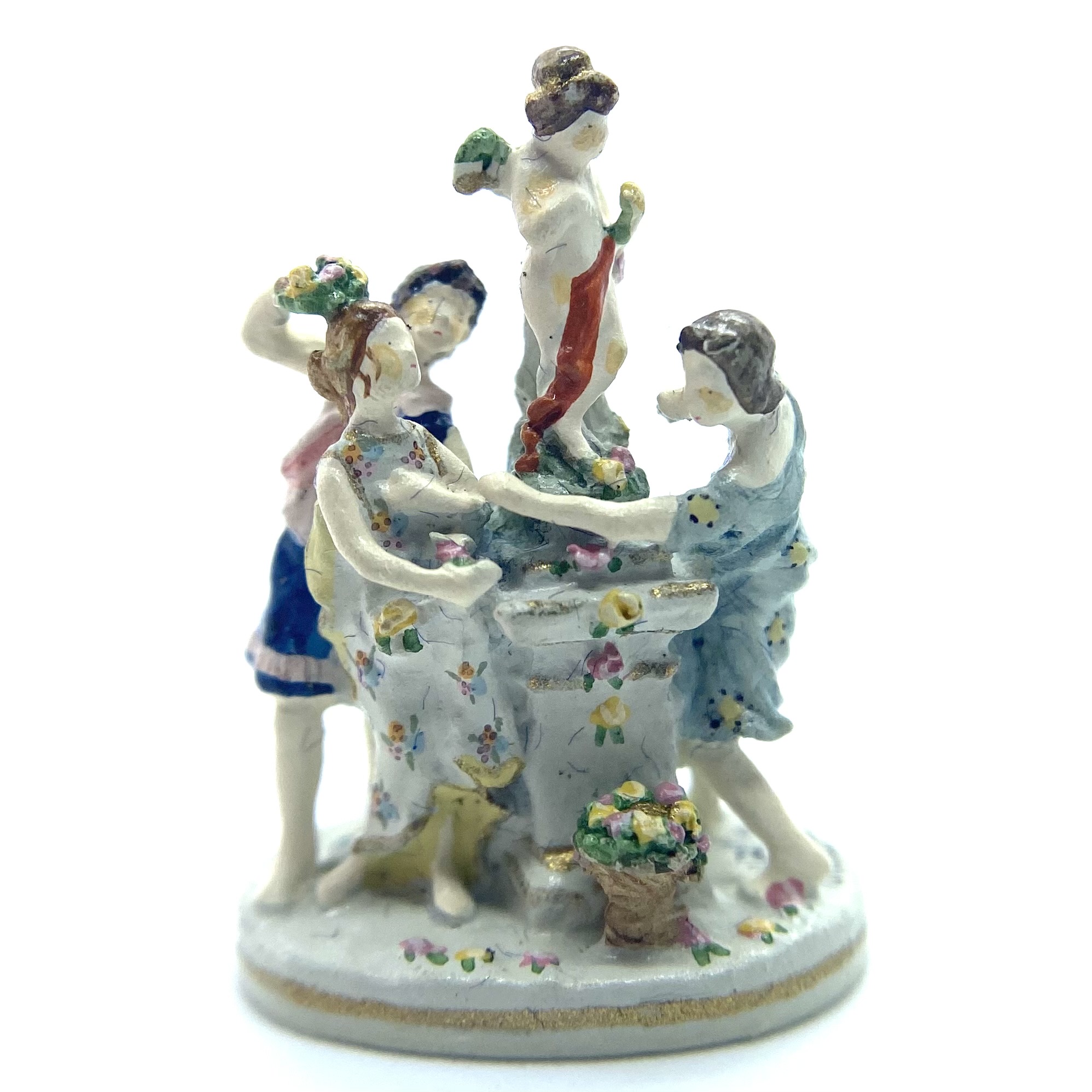 Cupid, perched on a pedestal, is watching two young men playfully crowning a young woman with flowers as a personification of Spring. In his catalogue of Robert’s work, Dick Hunt draws attention to the other flowers around the base of the figurine, which were sculpted separately and then fixed in place. He also flags the delicacy of the painting and the variety of colours: all four figures have different hair colours, and the costumes are also patterned with floral motifs and other details.