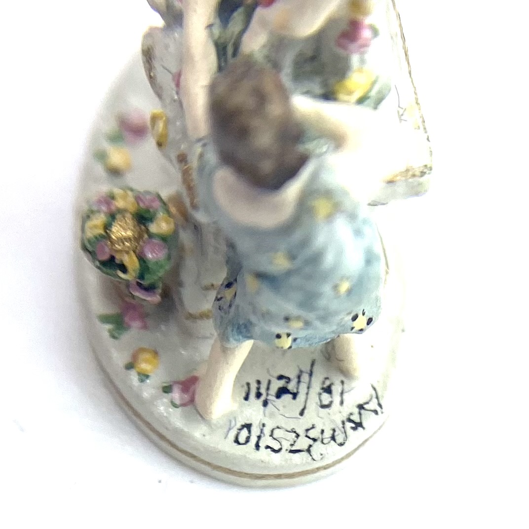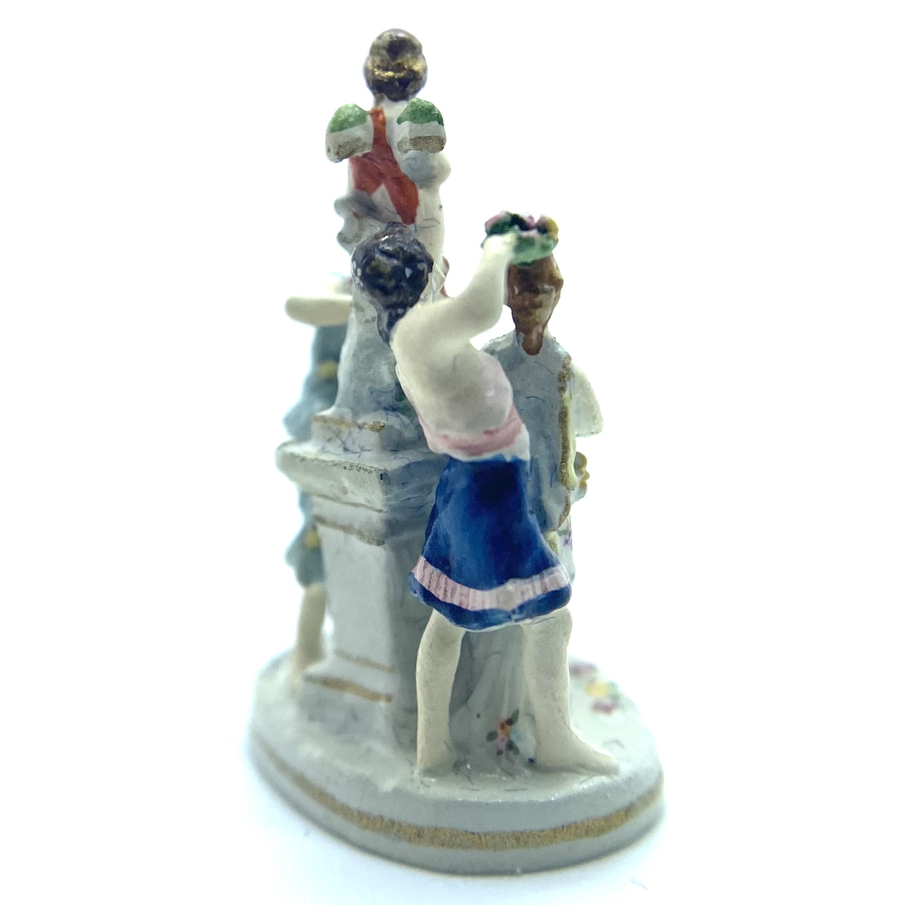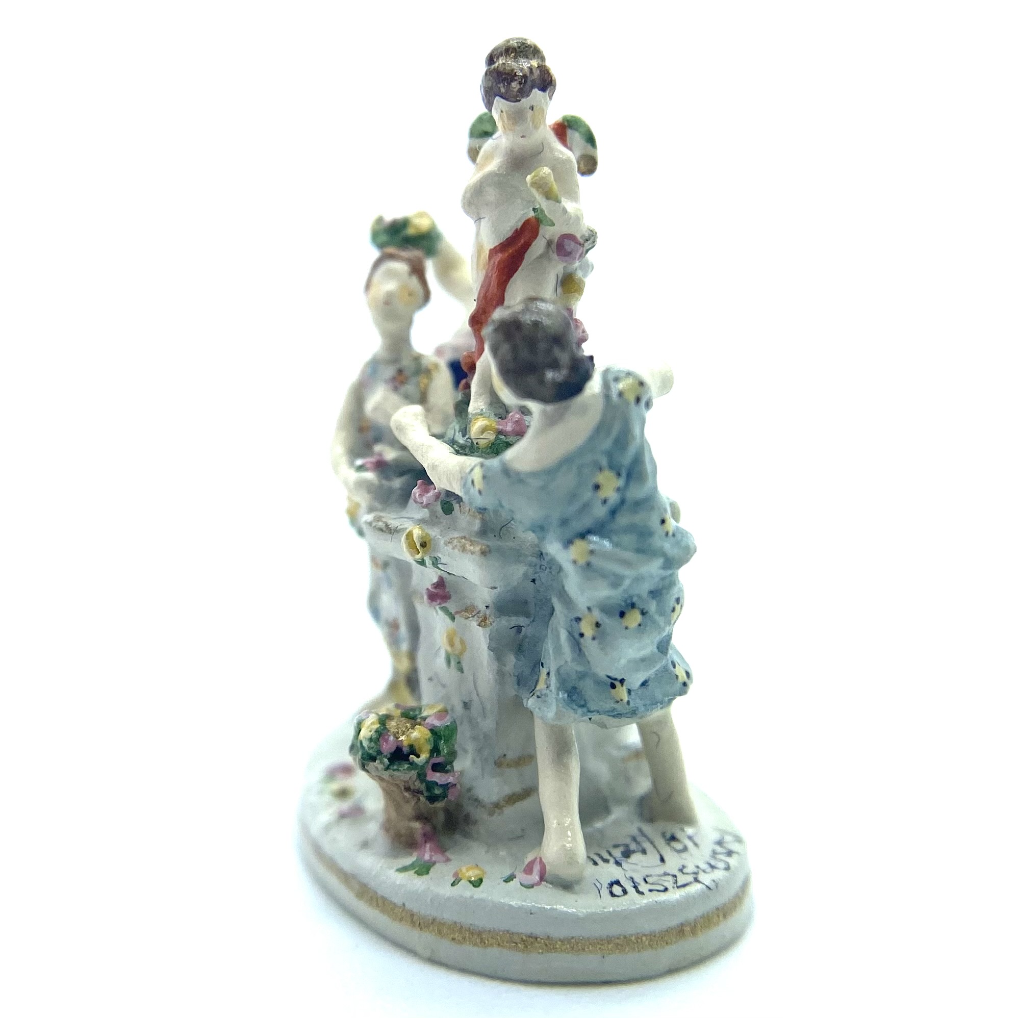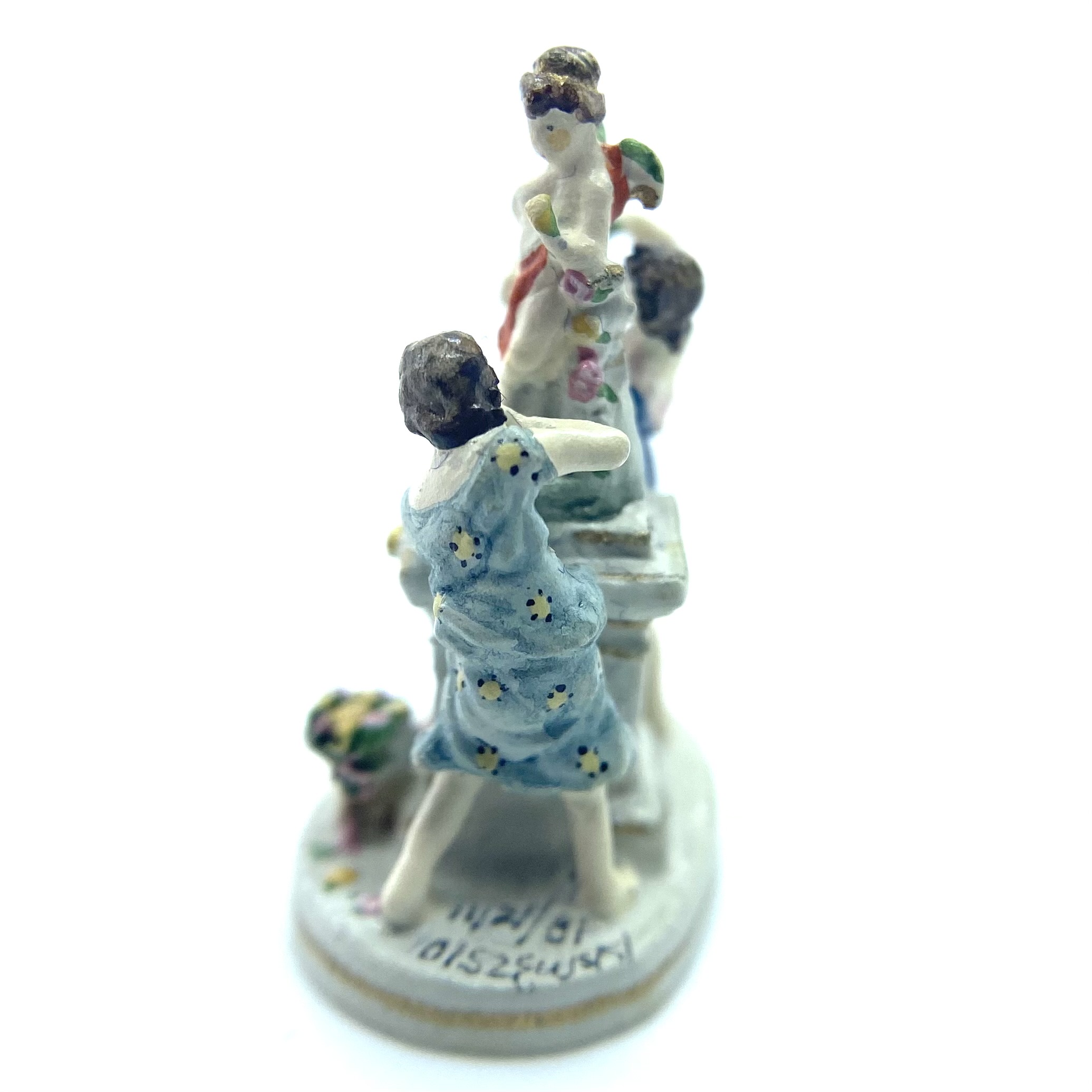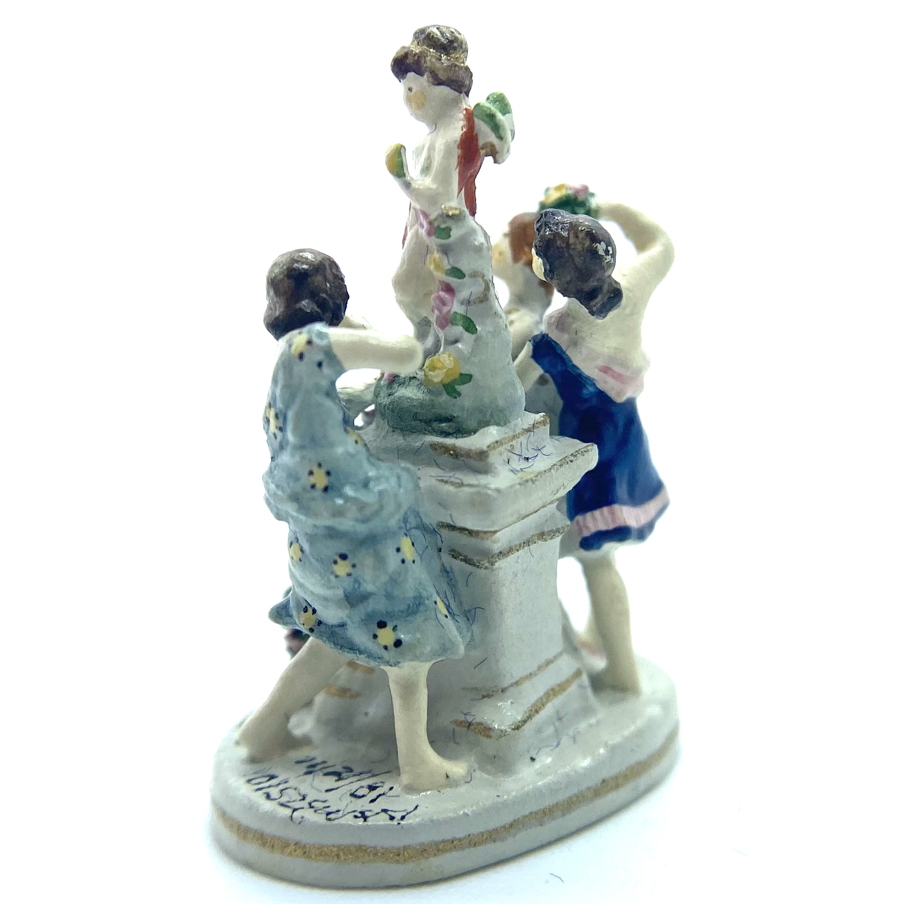 This showpiece miniature was one of the first created by Robert after he started working with Goebel Miniatures. It was one of four designs that he sculpted in his bedroom during the course of 1979; this particular one dates to July and early August of that year. It is based on a Capodimonte porcelain figure, Rites of Spring, made around 1840, and Robert chose it because the complexity of the figures and the decorative qualities would show off his skills to his new employers. The figurine was first issued in 1980 with the Goebel studio number 600-P, although editions continued to be produced in 1981, 1982, 1985 and 1986. I’m assuming, from the numbering on the base, that this one is a 1981 edition.
