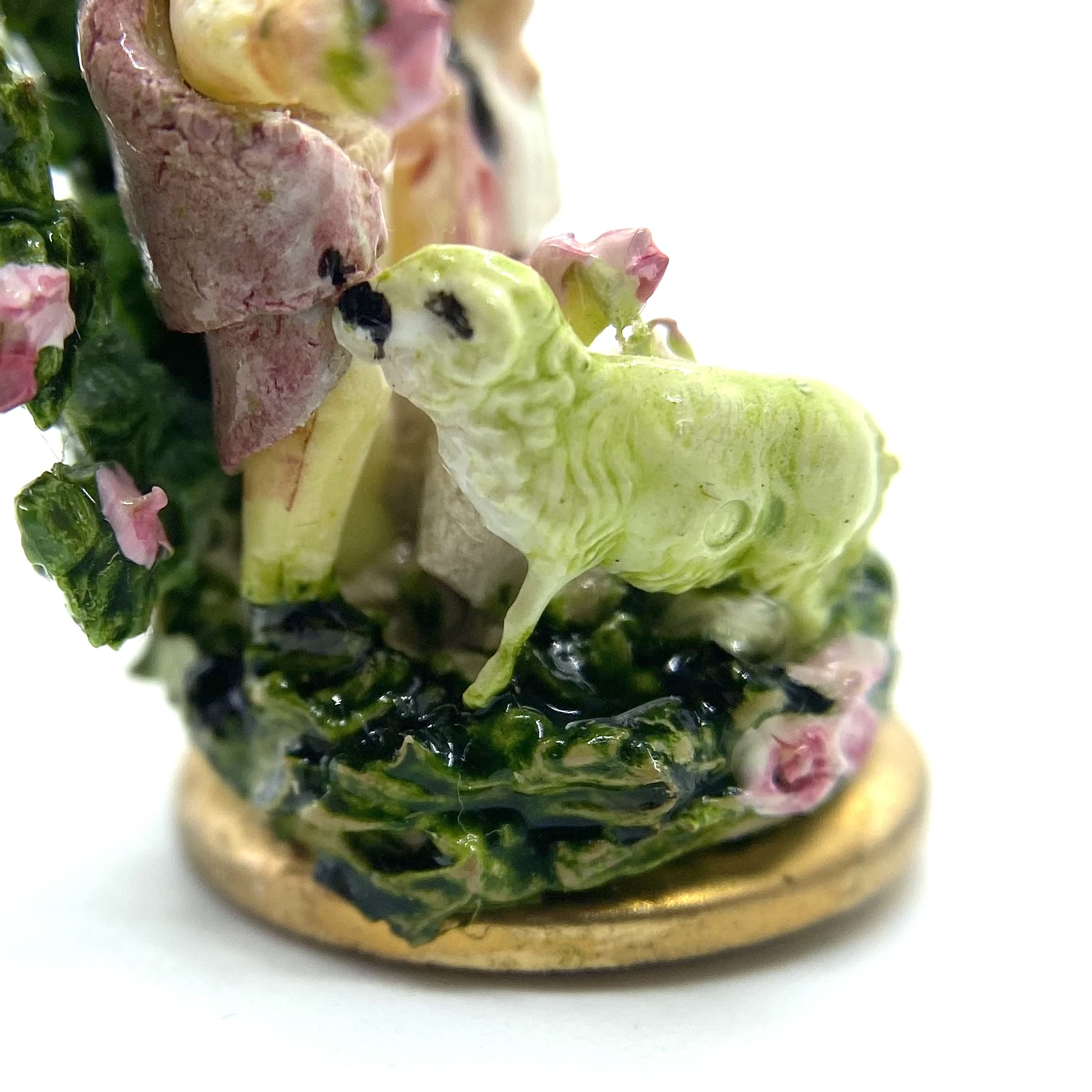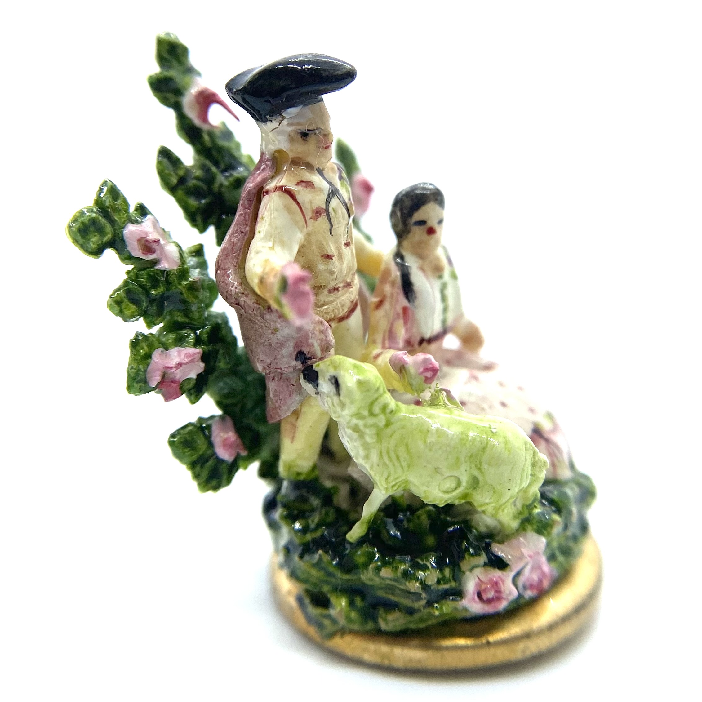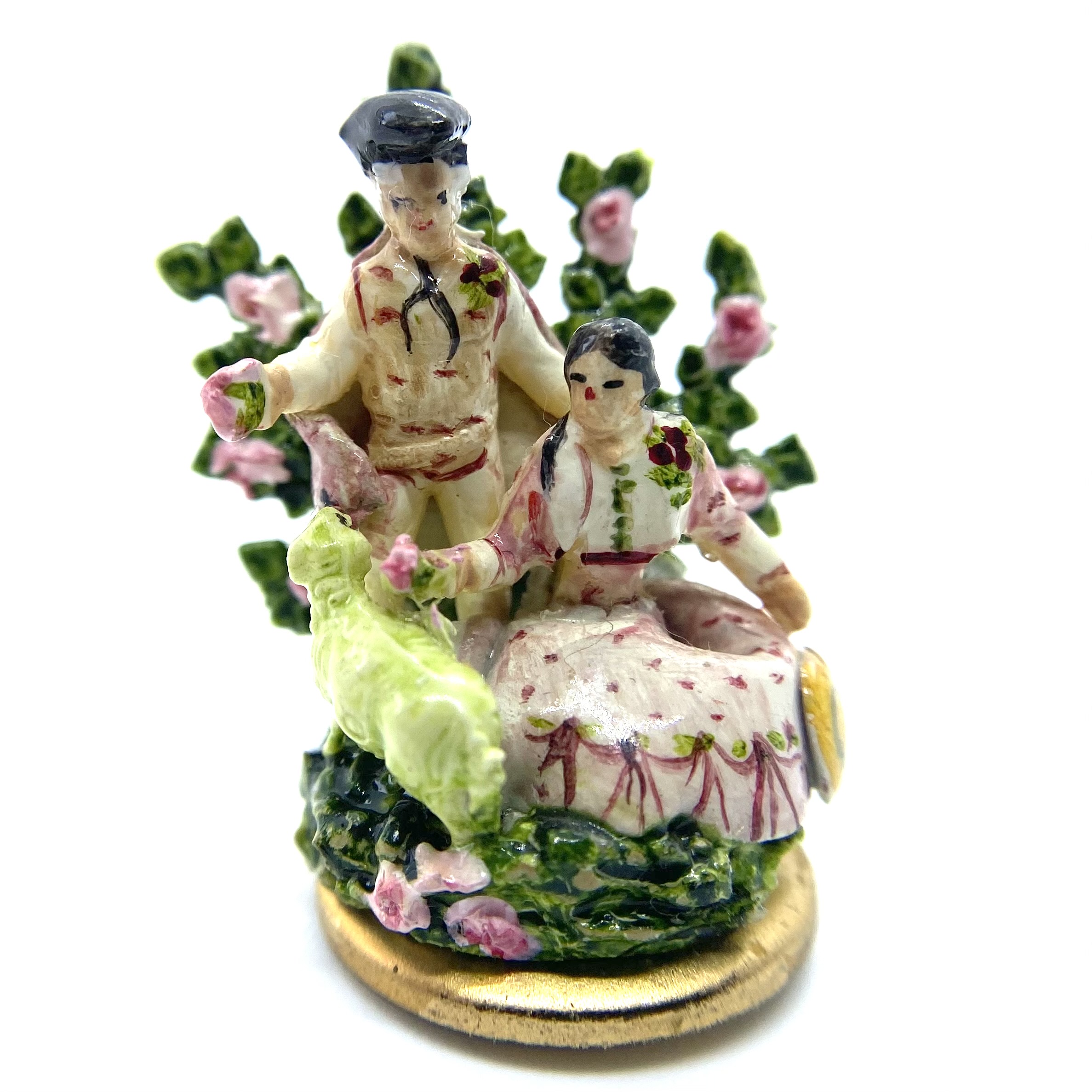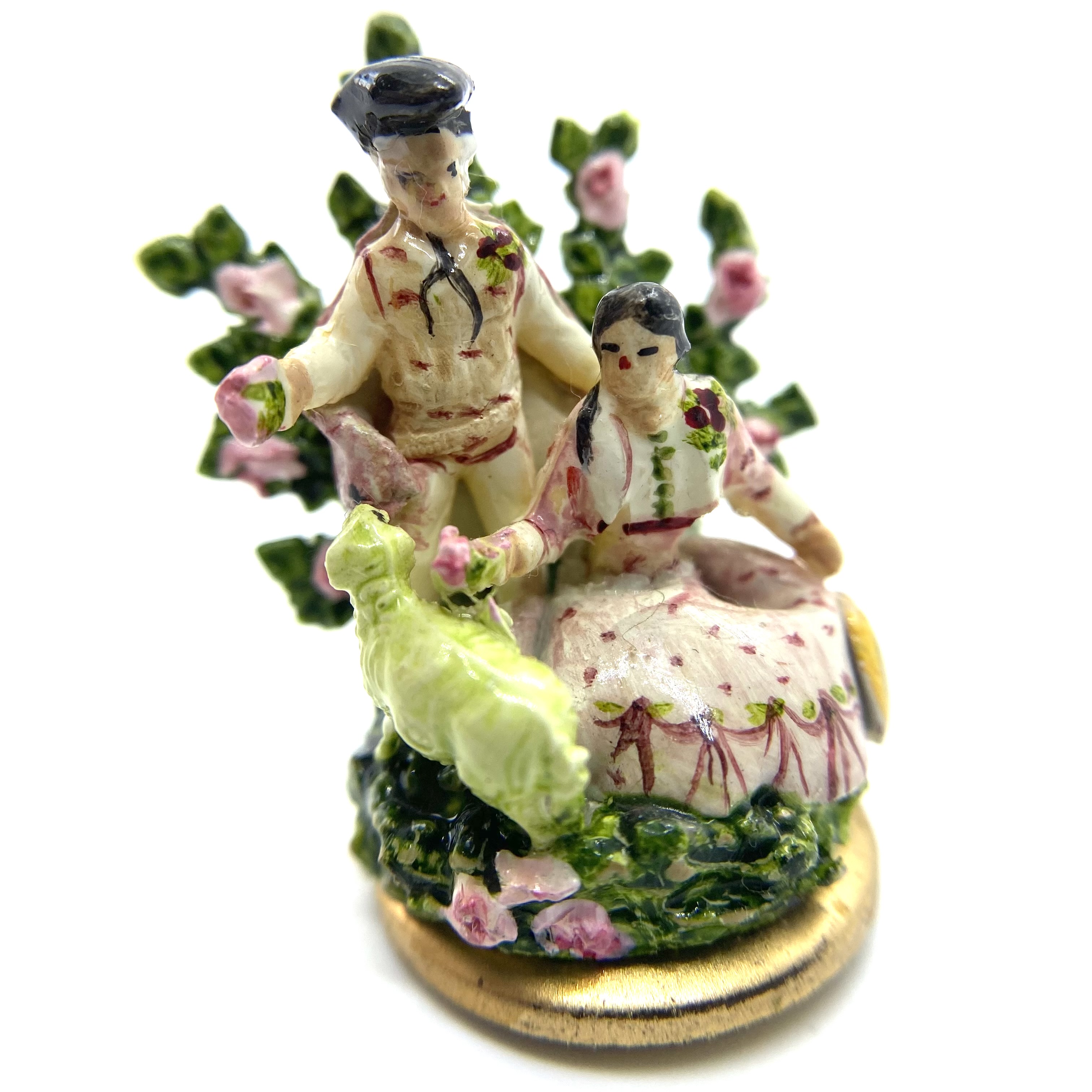 A lady sits on a grassy bank, accompanied by a standing gentleman. Both wear shades of pink and rose, with corsages pinned to their clothes, echoing the pinks of the roses in the spray of greenery behind them. They seem to be offering some of these roses to the sheep that has wandered up to them. A classic Staffordshire style, this figurine is by Kay Lewis. There are tantalising traces on the base label of what might once have been a signature, but unfortunately these are now illegible. A charming little piece, with lovely hand-painted details of swags on the lady’s skirt.