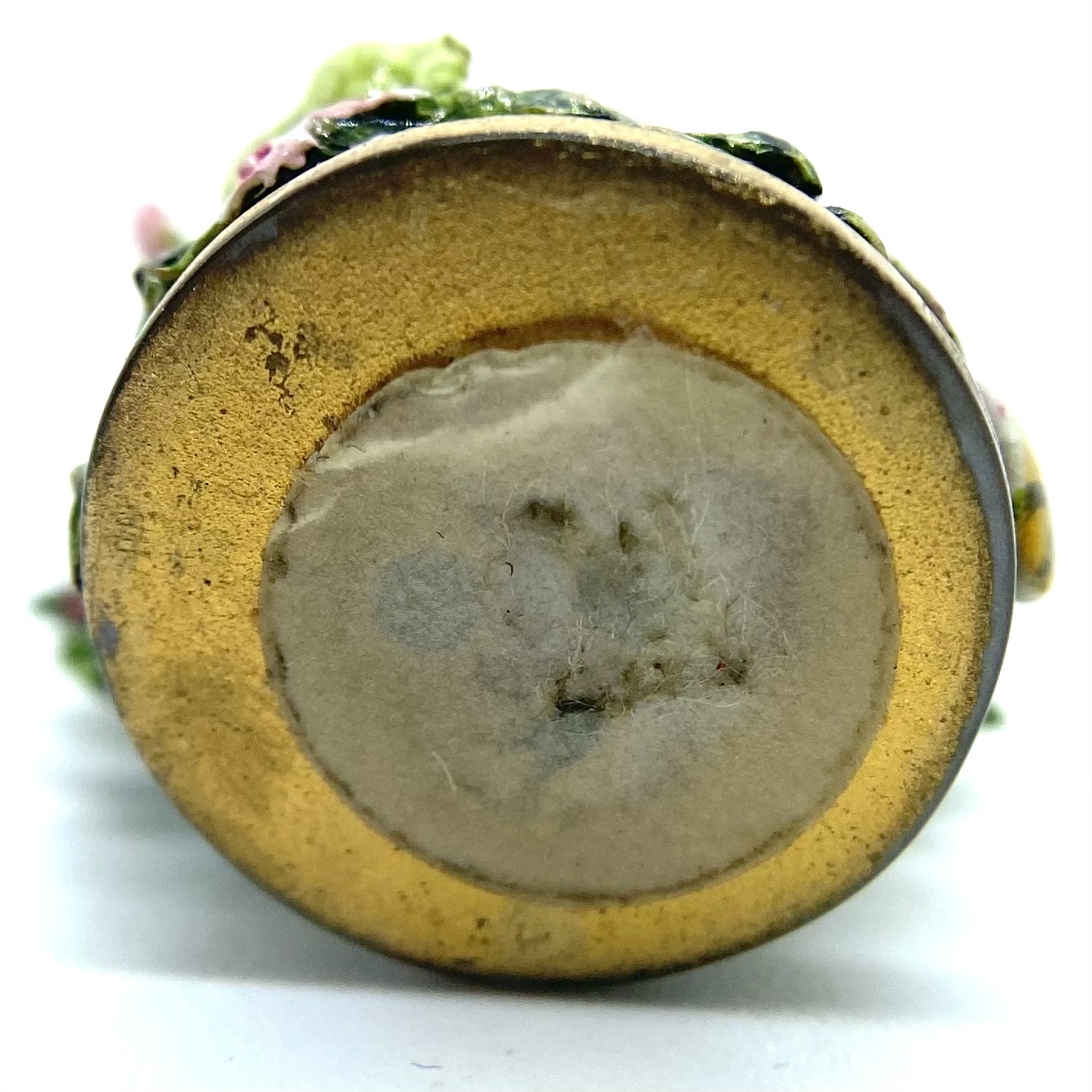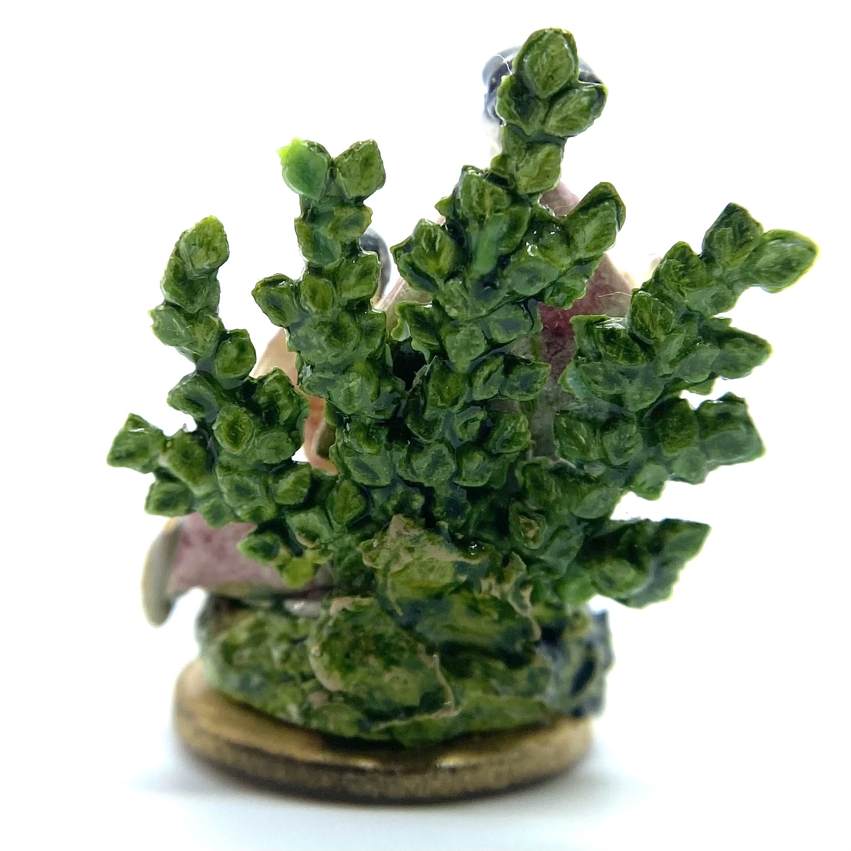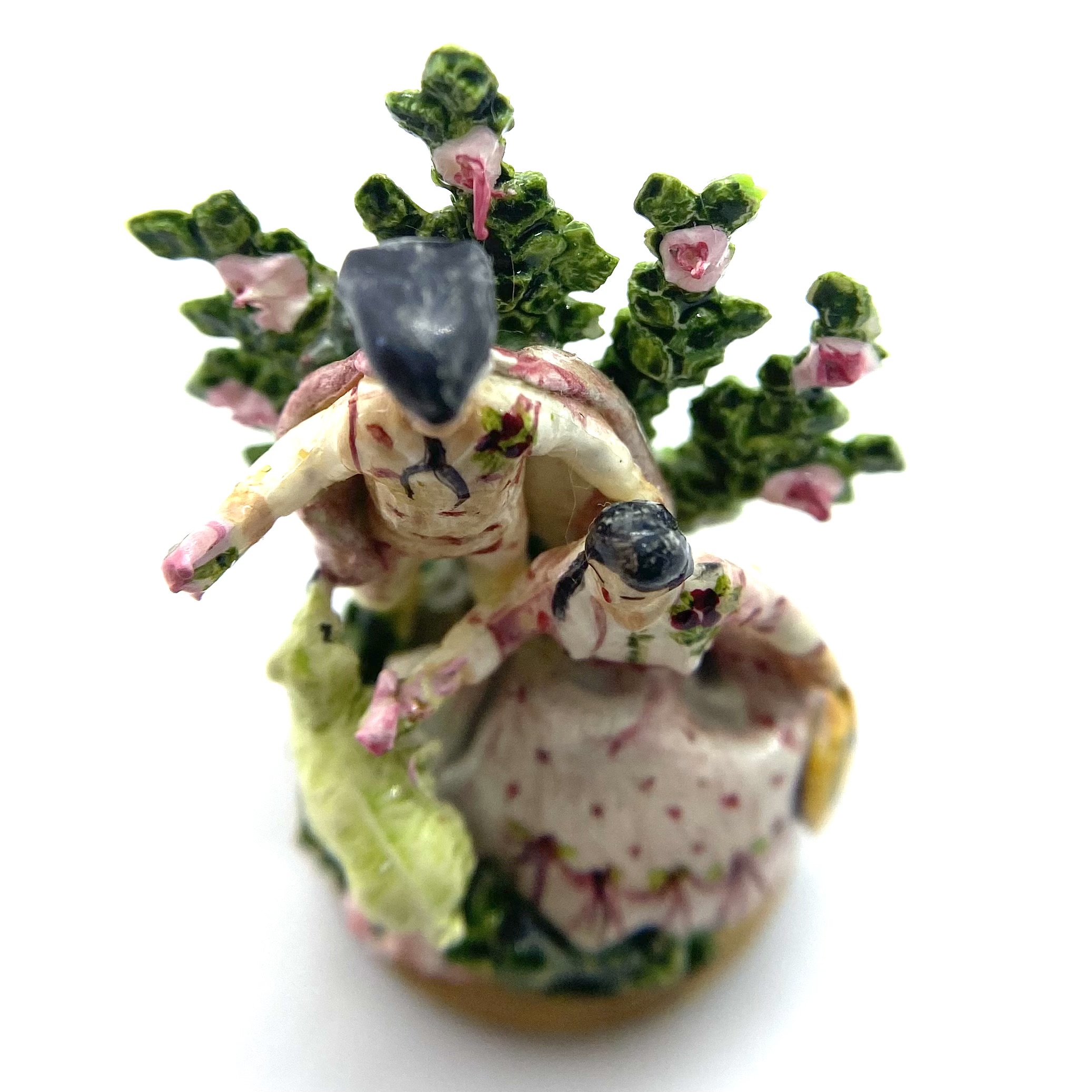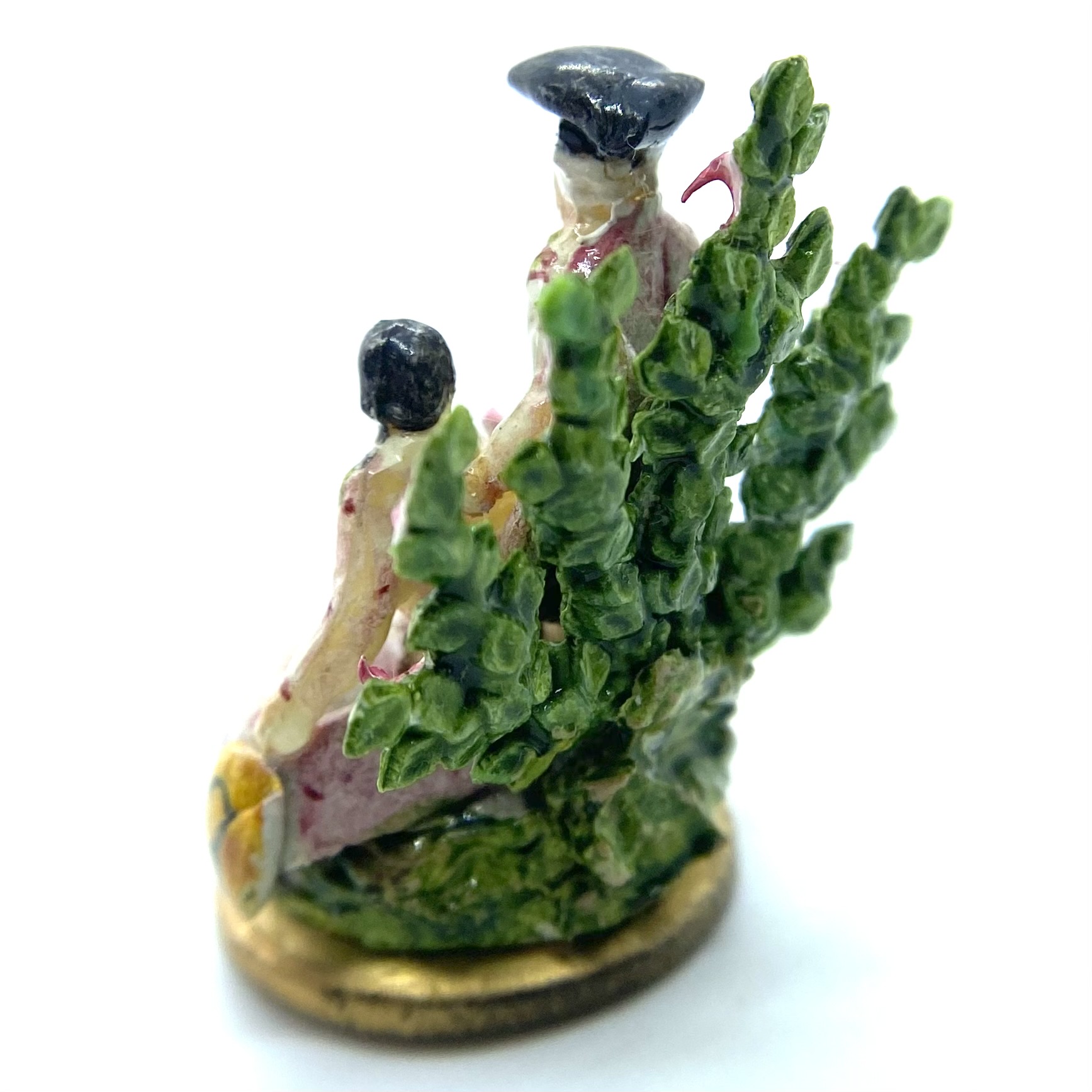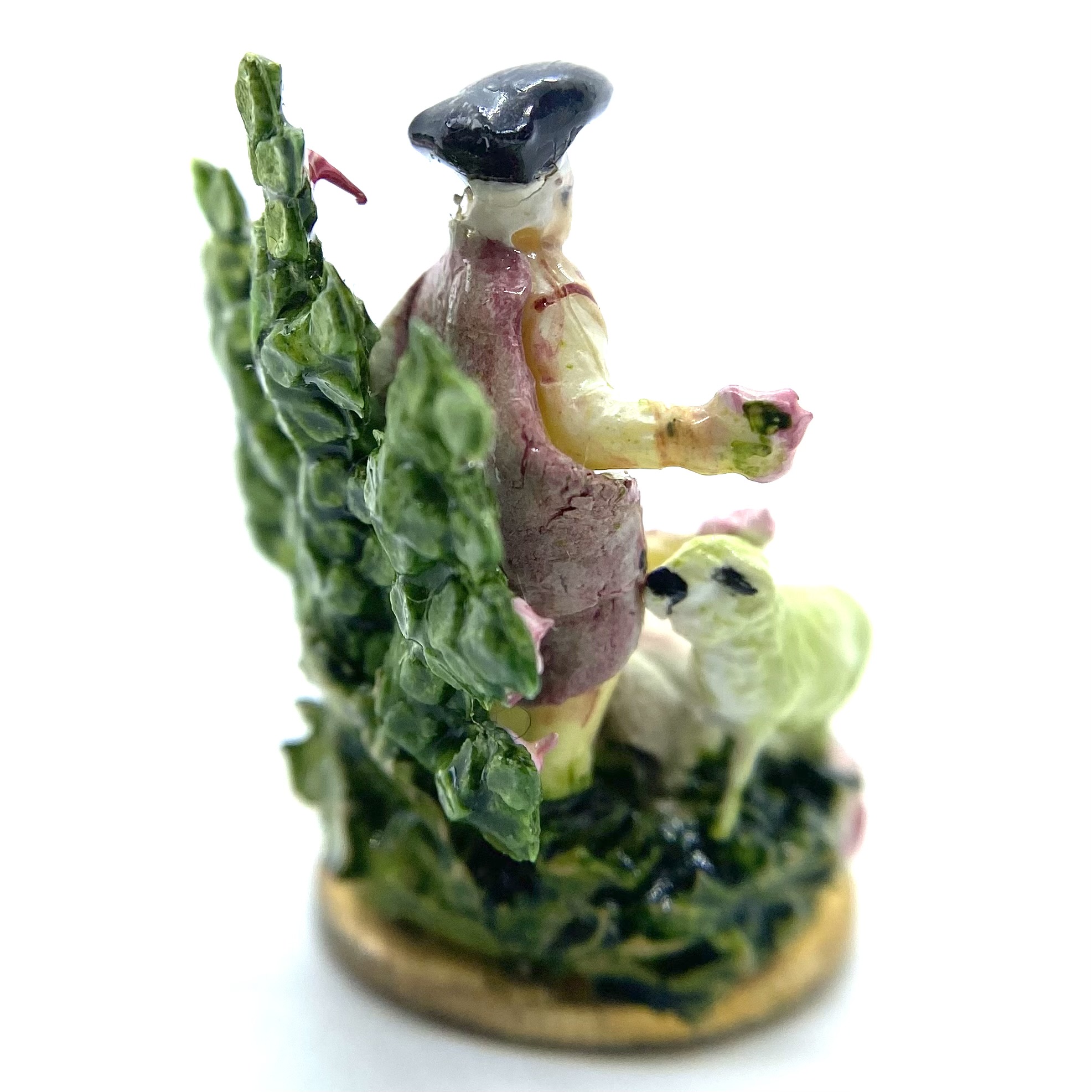 A lady sits on a grassy bank, accompanied by a standing gentleman. Both wear shades of pink and rose, with corsages pinned to their clothes, echoing the pinks of the roses in the spray of greenery behind them. They seem to be offering some of these roses to the sheep that has wandered up to them. A classic Staffordshire style, this figurine is by Kay Lewis. There are tantalising traces on the base label of what might once have been a signature, but unfortunately these are now illegible. A charming little piece, with lovely hand-painted details of swags on the lady’s skirt.