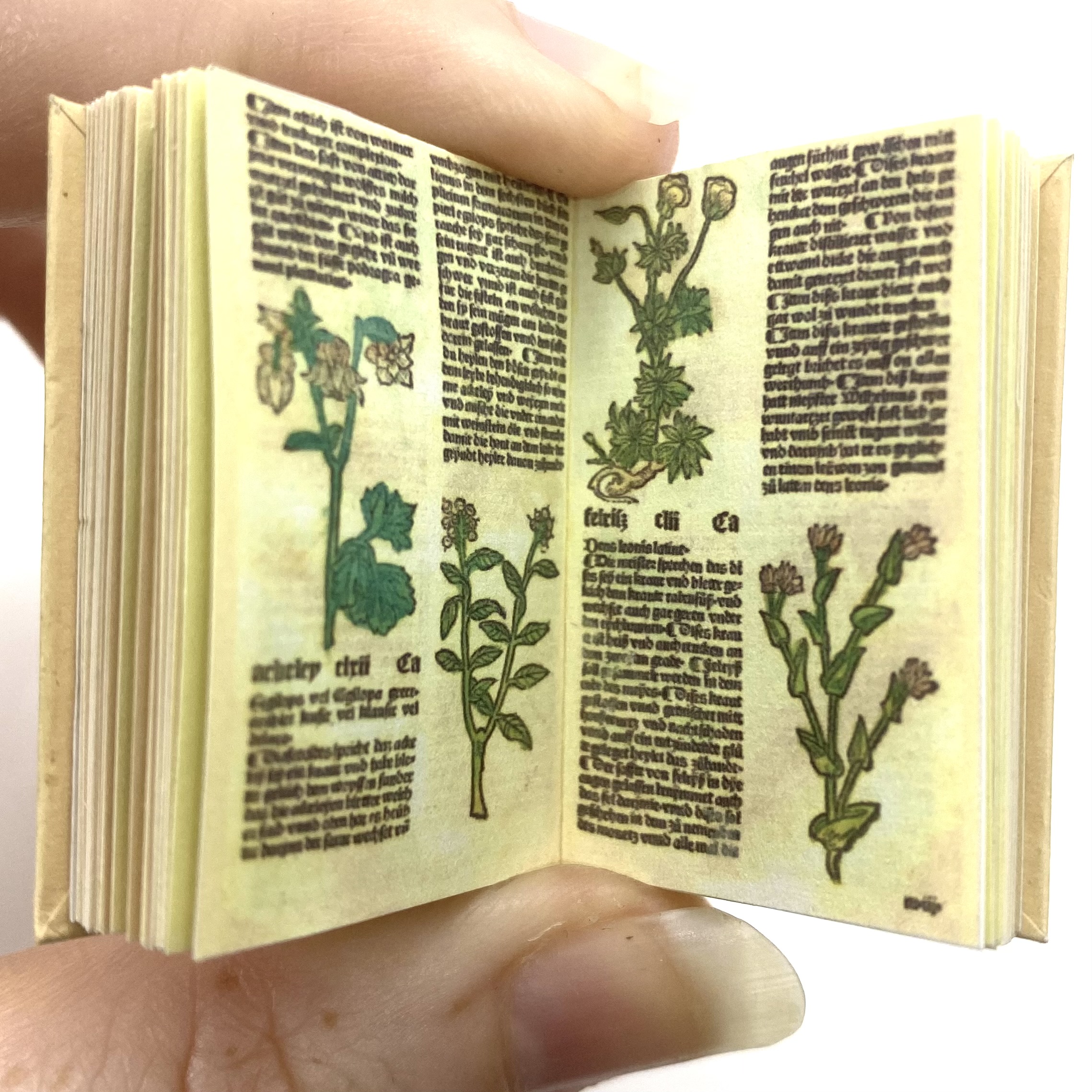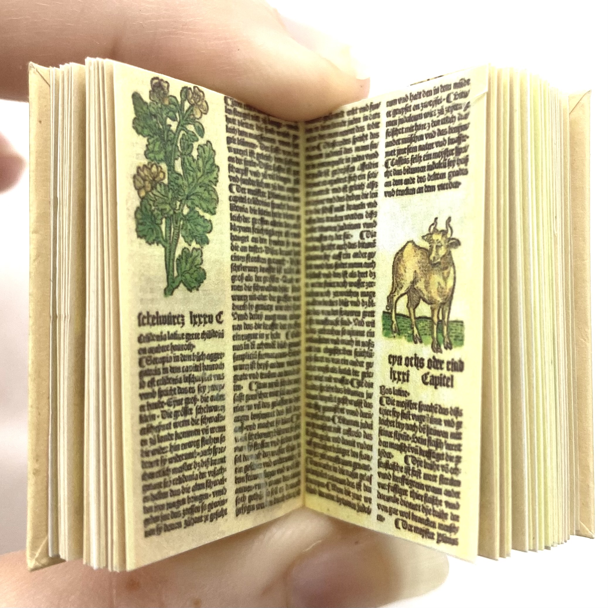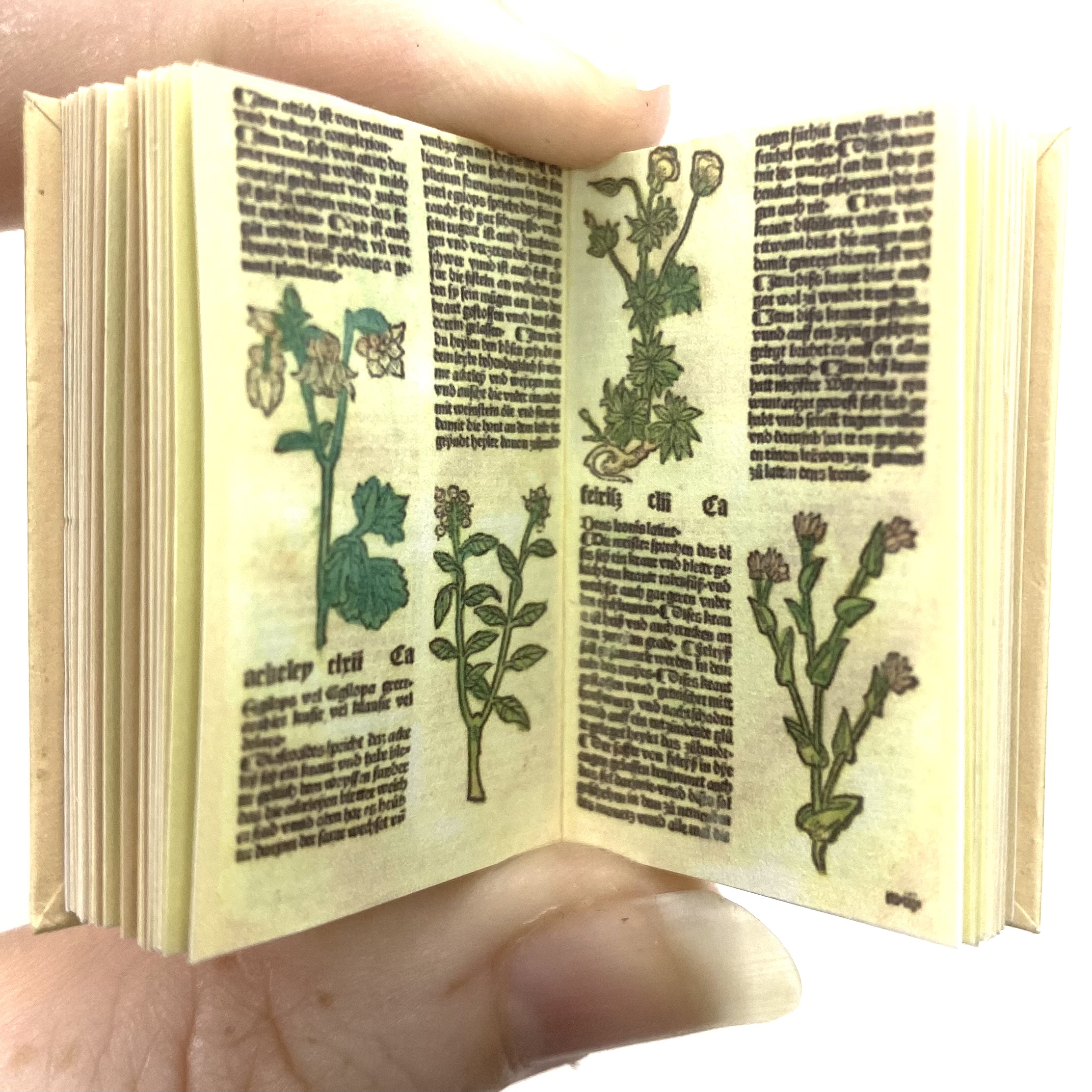 I haven’t yet tracked down the original version of this herbal but I presume it dates from either the very end of the 16th century or the beginning of the 17th century. Ken Blythe’s miniature reproduces the lovely heavy text and the coloured woodcut images that illustrate the work, although with its beautiful patterned vellum binding. By the 1890s this book would no longer have had any scientific function, having been long outdated by modern botany, but it would have gained new value as a precious incunabula.