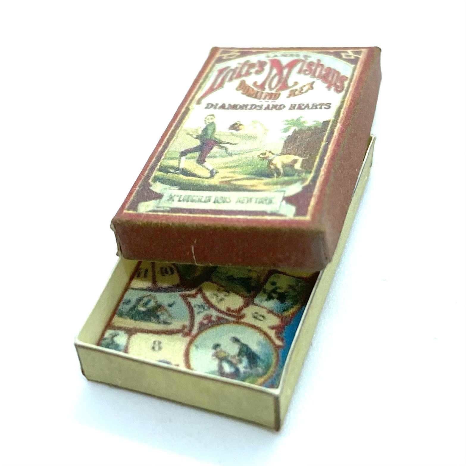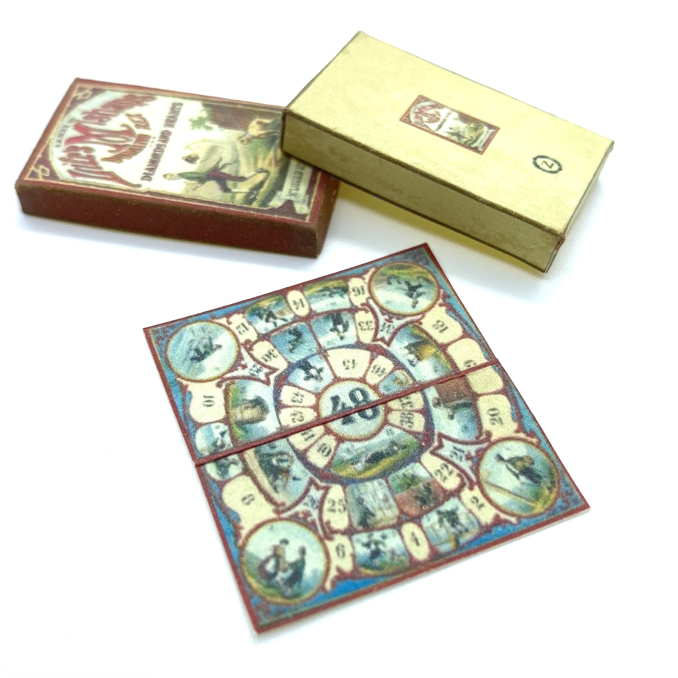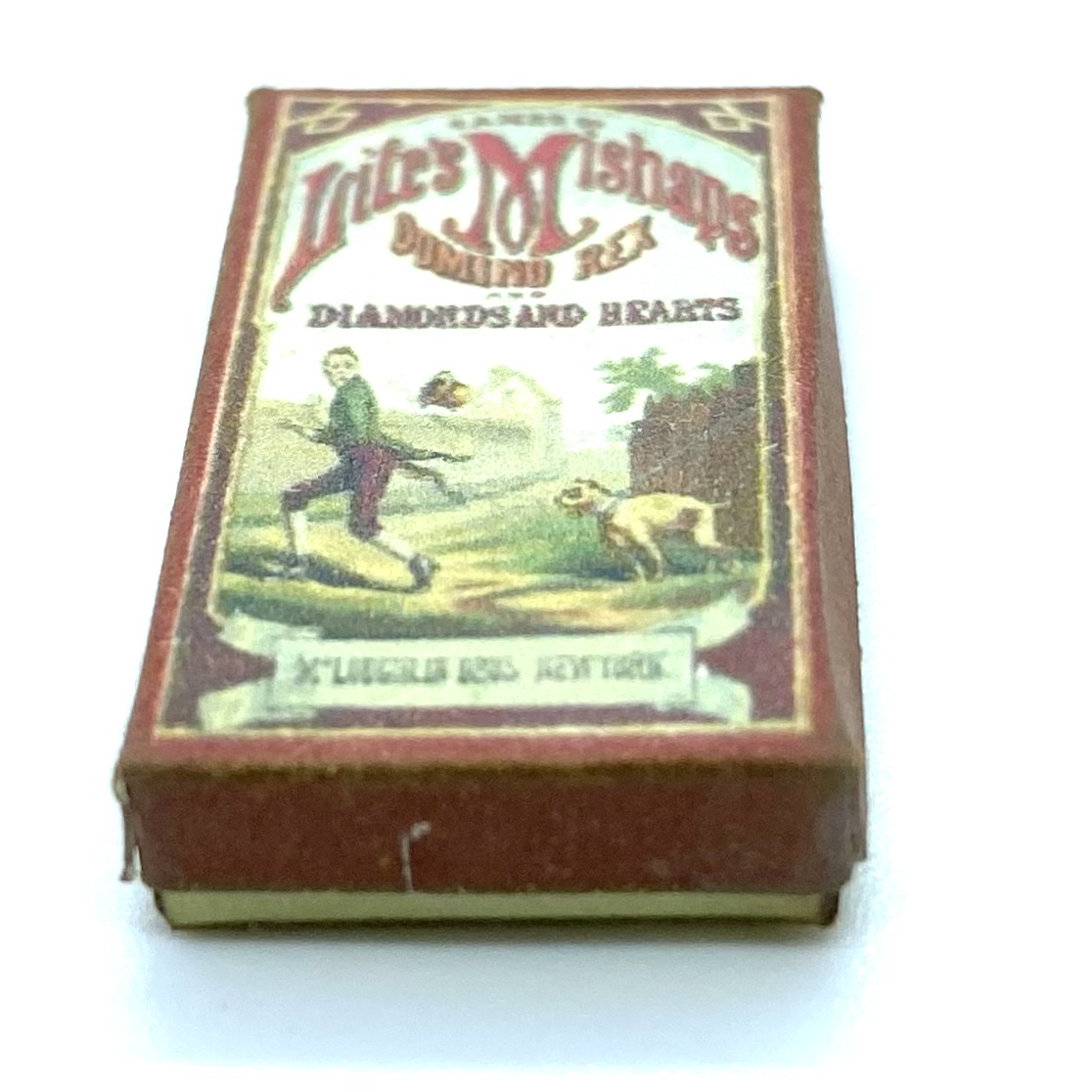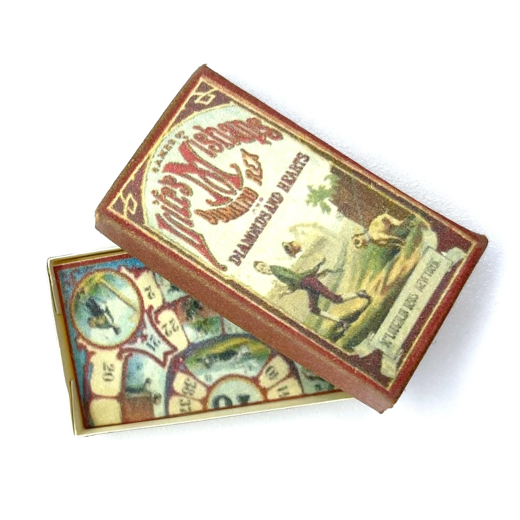 This board game, first published by the McLoughlin Brothers in 1875, actually offers three games in one (although the board, originally double-sided, is printed on only one side here). The main game was Life’s Mishaps, a game played with wooden counters and a ‘spinner’, in which players had to move around 48 spaces, overcoming mishaps and challenges on the way. The first to reach the end of the board was the winner. Also included in the pack was Domino Rex and Diamonds and Hearts, although sadly I don’t know how these were played. Published in New York, it must be yet another gift from the hastily-invented American aunt of the Quartermaine children.