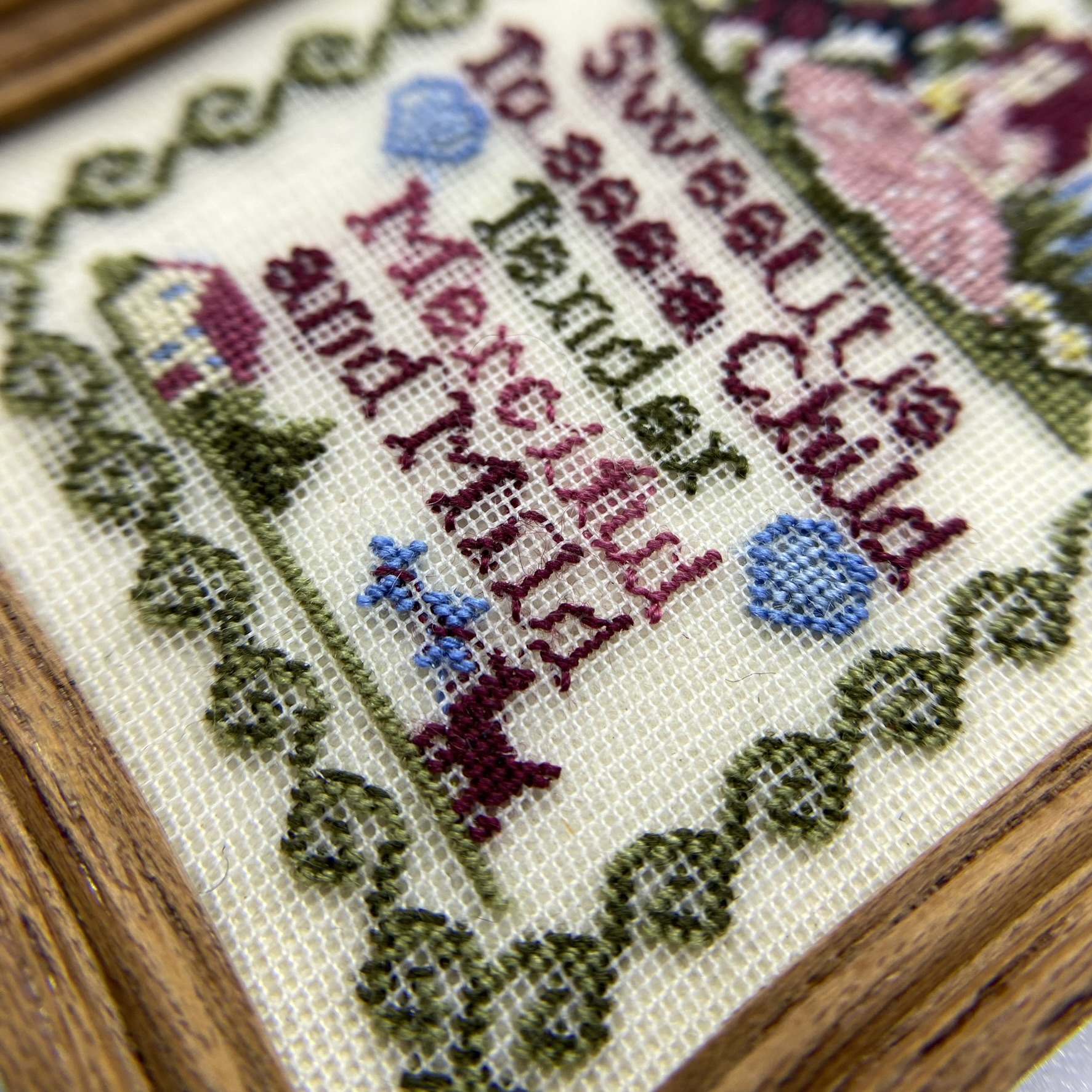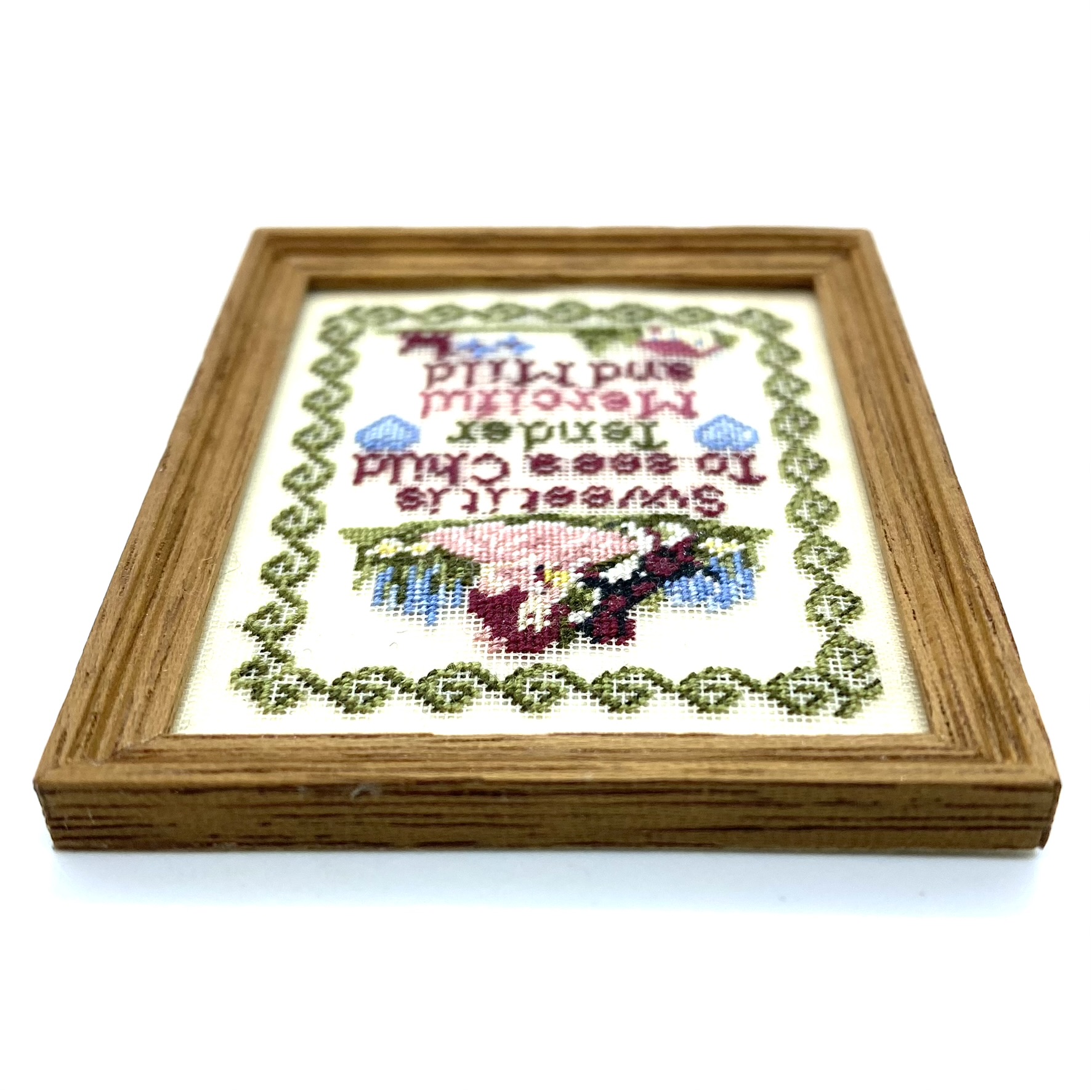 I was delighted when Nicola offered a sampler of this design in her Etsy shop: I’d seen one offered second-hand some time before, and hadn’t been able to buy it at the time. This intricately-worked sampler, with its border, a scene of a little girl playing with a dog, and its moralising text, is perfect for the Victorian schoolroom. ‘Sweet it is To see a Child Tender Merciful and Mild‘.