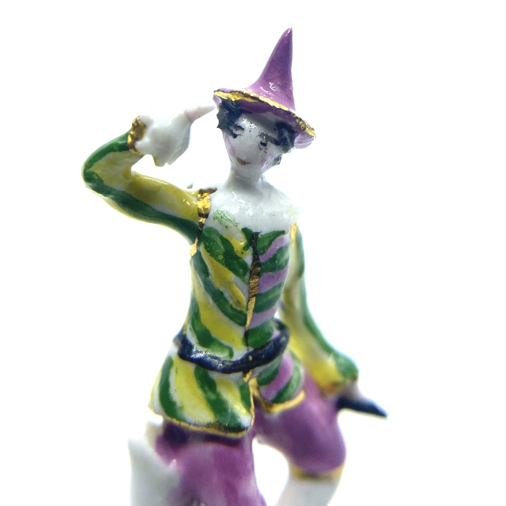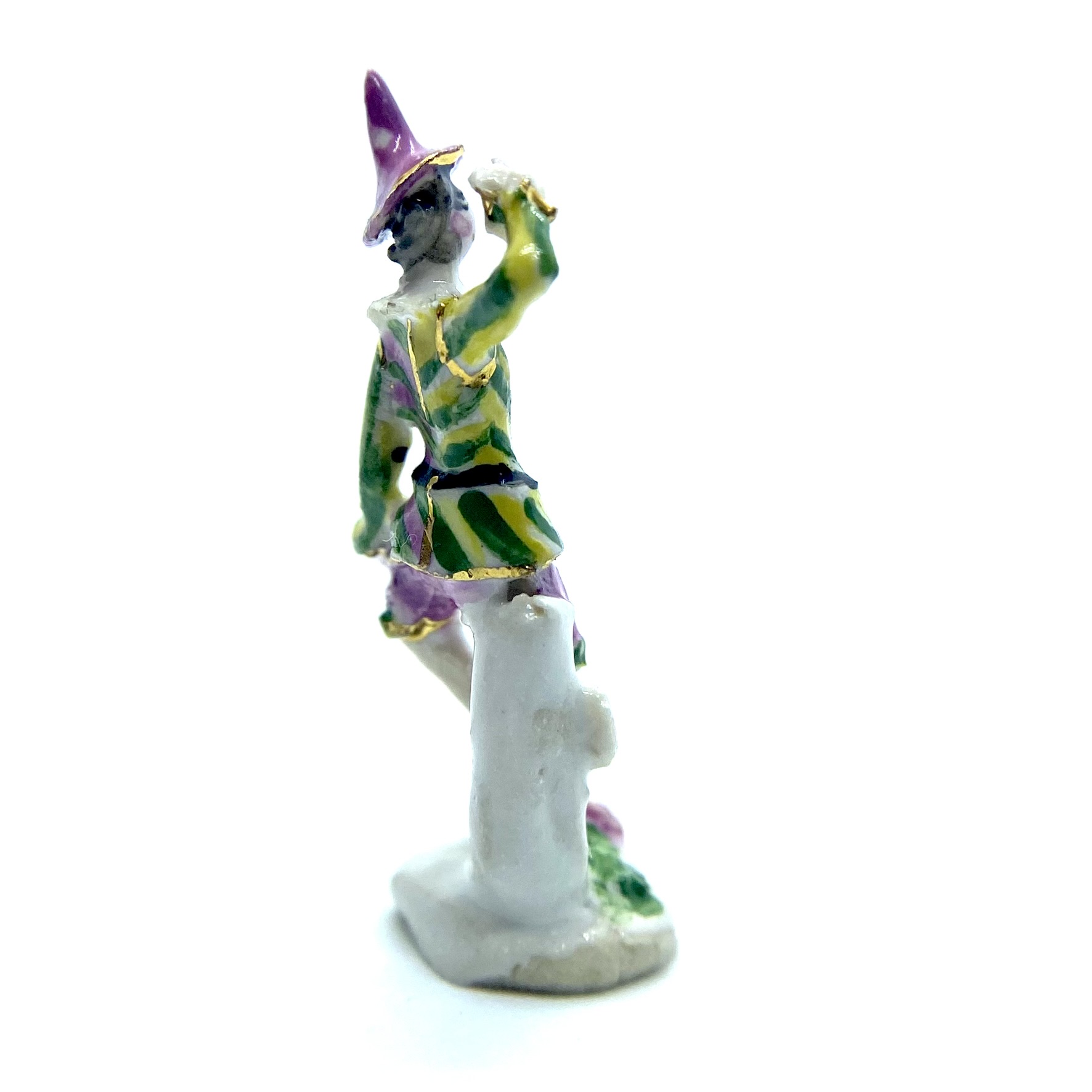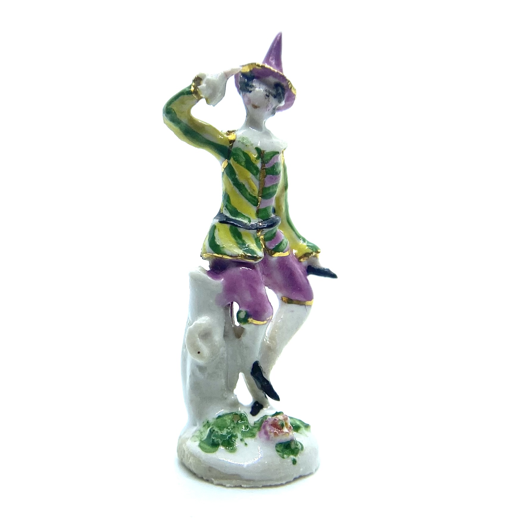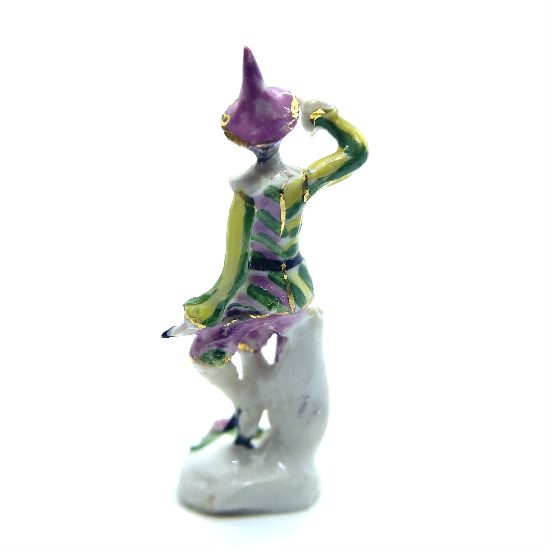 I’ve come to think of the figure as a ‘harlequin’, even though he isn’t, really: he doesn’t have the distinctive checked motley, but something about his hat suggests a theatrical costume of some kind. He’s perched on a tree stump, shading his eyes with his hands as he looks out for someone.