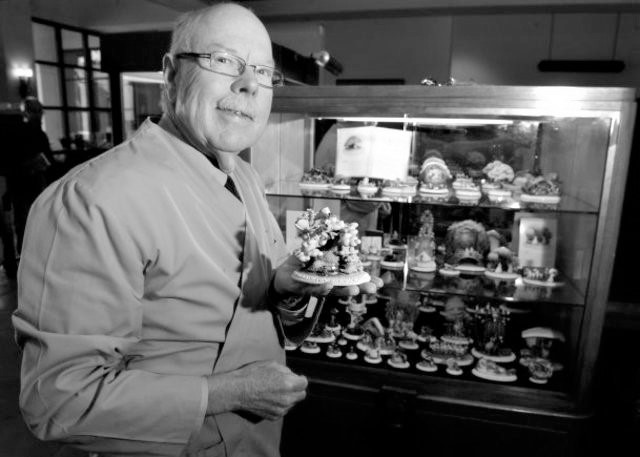 Robert Olszewski was born in Pennsylvania, although he has lived in Camarillo, California, for the last forty years. As a young man, he originally hoped to make a career as a painter, and spent several years showing his pictures in shows and galleries. When one of his paintings was stolen from an exhibition, Robert replicated it in miniature to help the police track it down, an event that’s often credited with awakening his interest in small-scale work. That interest was intensified when he built a dolls’ house for his daughter in the early 1970s, followed by several other dolls’ houses ordered by friends. Robert’s career definitively shifted towards sculpture in 1977, when a chat with a dentist friend alerted him to the possibilities of the lost-wax method. He began to create tiny sculptures from metal which he then painted.