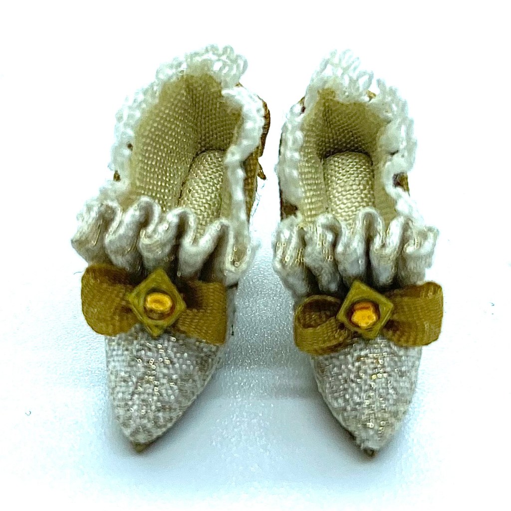 Antique gold trimmed with bronze ribbons and braid, this charming hat by Miniature Hat Boutique was irresistible (2021.052)